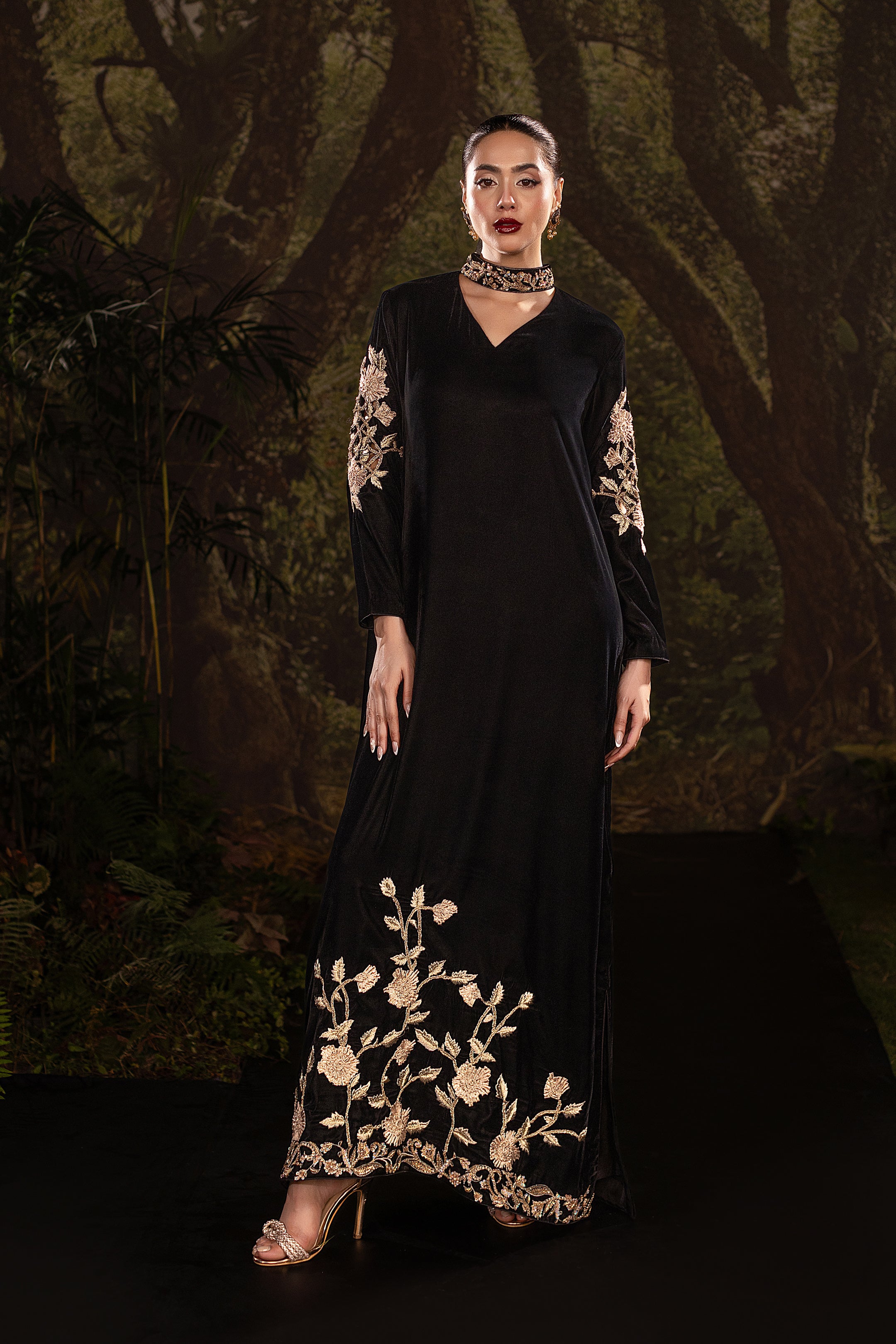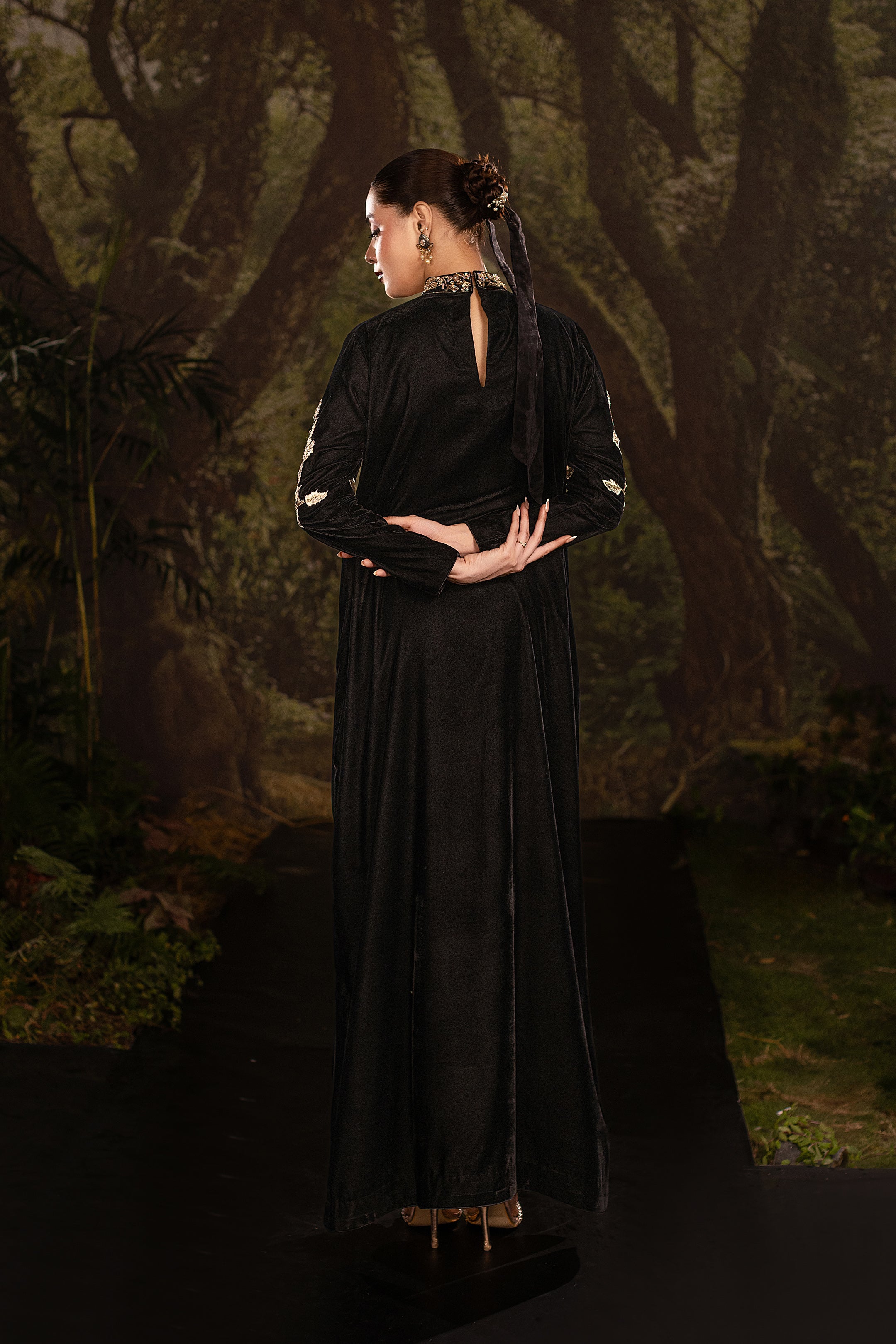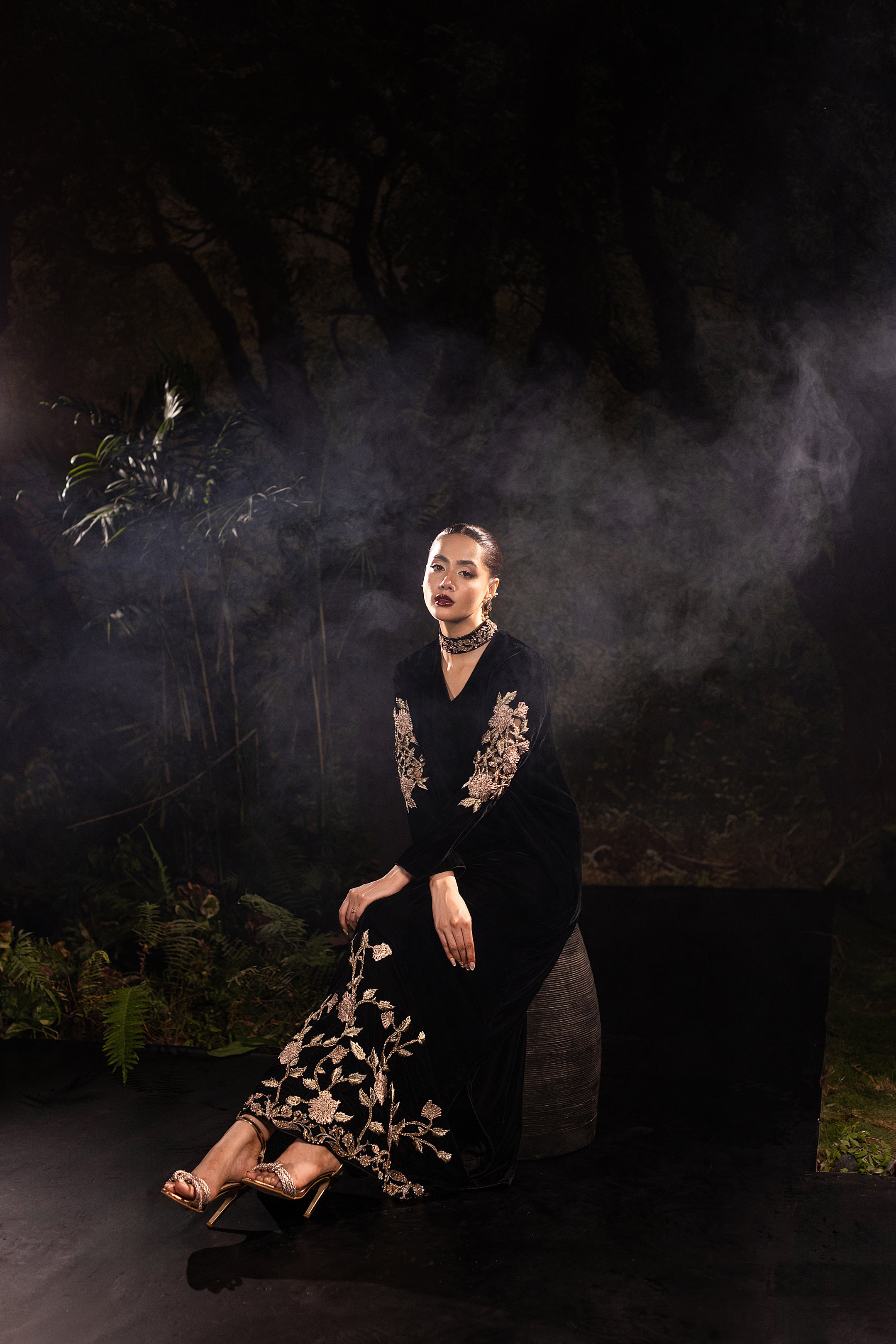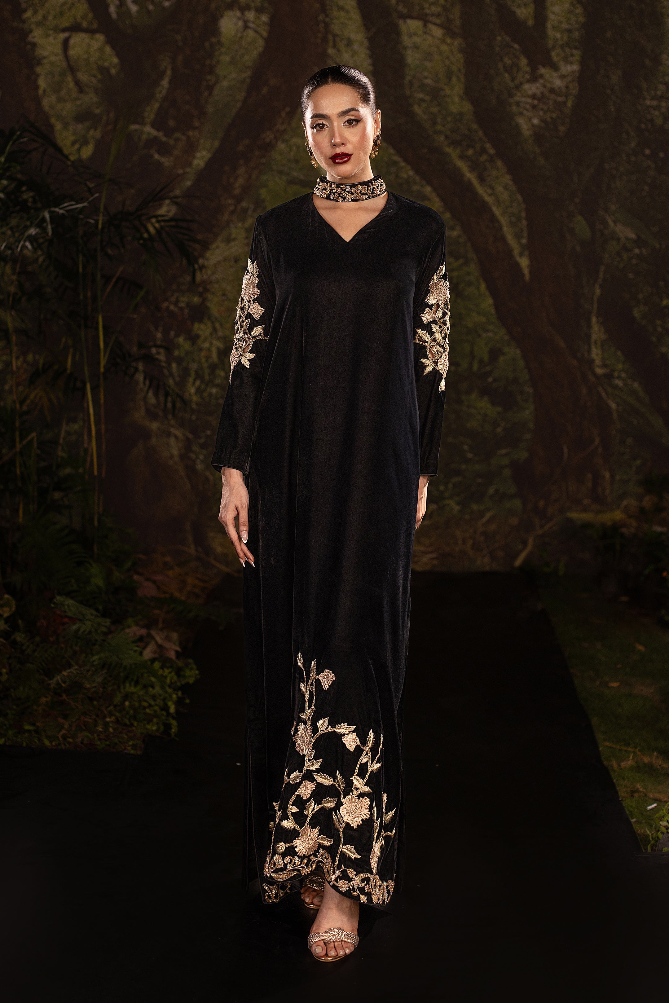 Dark elegance takes form in this black velvet silhouette, where simplicity meets grandeur. The long, fluid cut flows with quiet authority, its richness deepened by the inky sheen of velvet. Intricate golden embroidery climbs the sleeves and hemline like illuminated vines, striking a perfect balance between restraint and ornamentation. The V-neckline and embroidered choker frames the décolletage with subtle refinement, while the elongated shape elongates the figure, evoking timeless poise. A statement of understated power, this piece is designed for evenings where presence speaks louder than words.