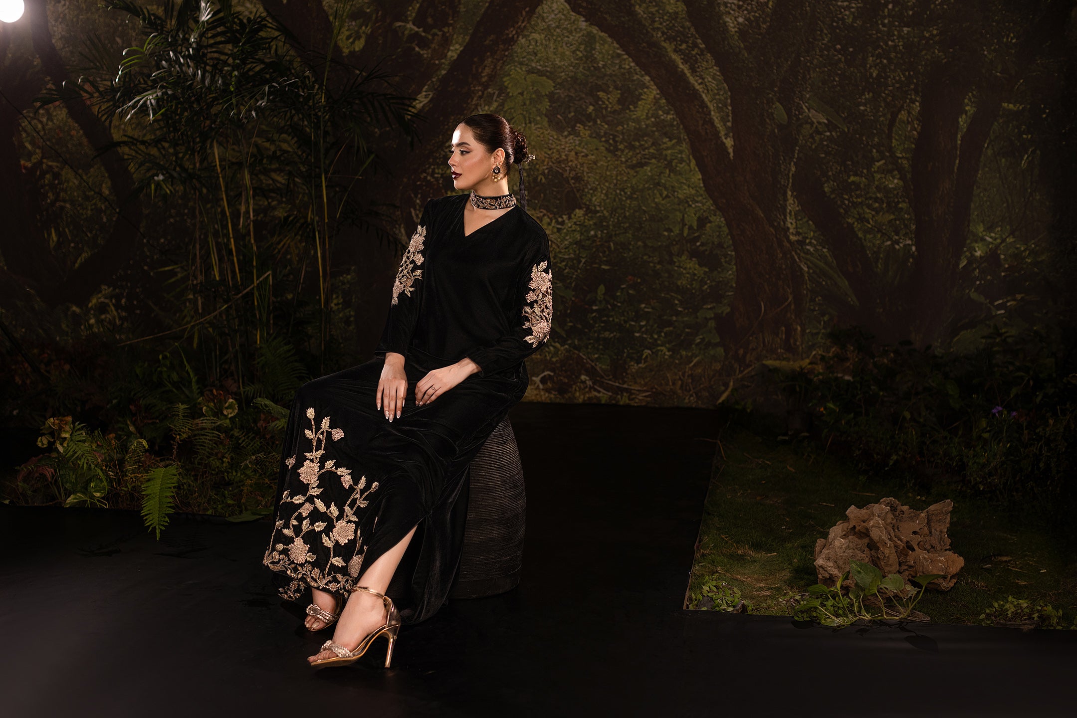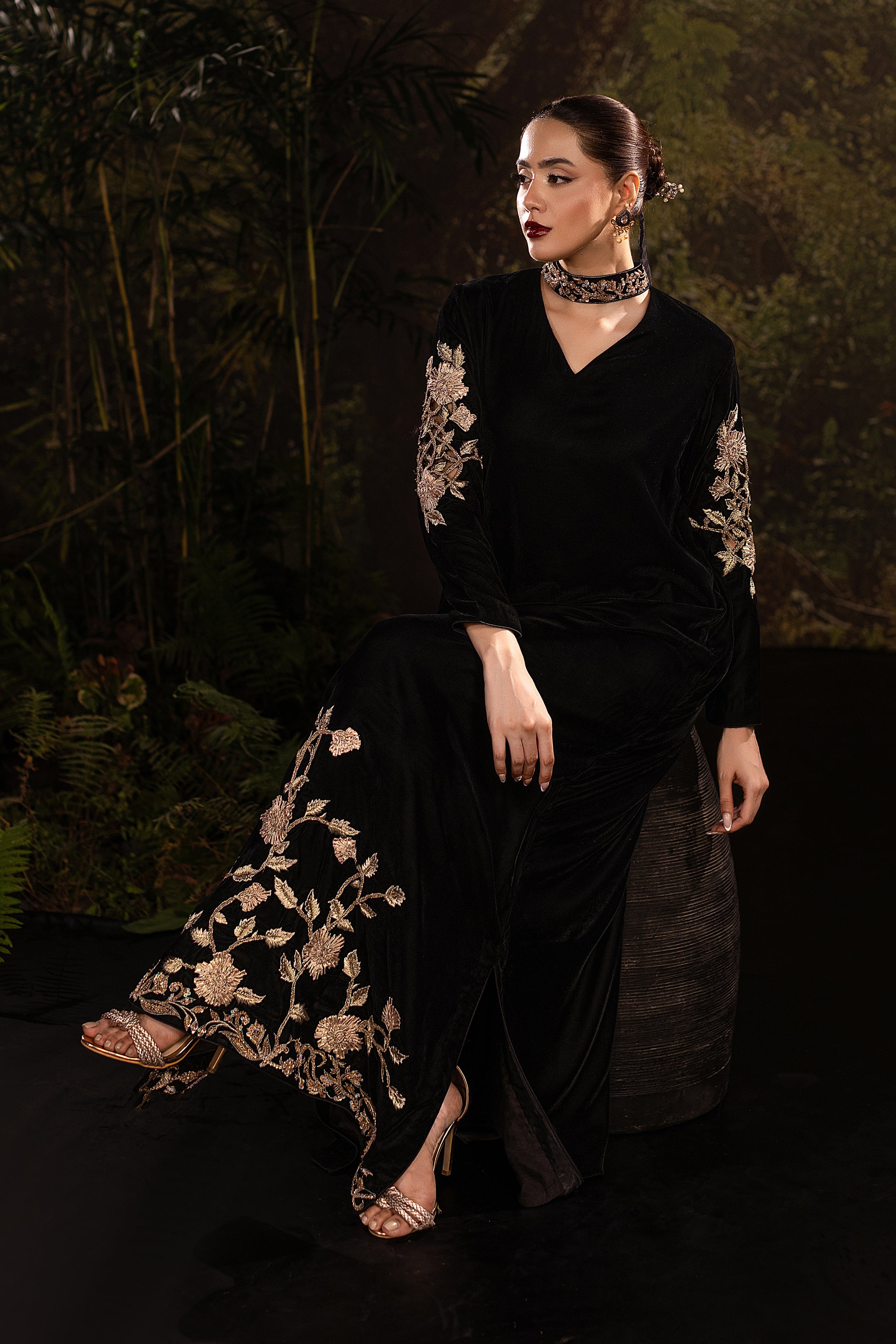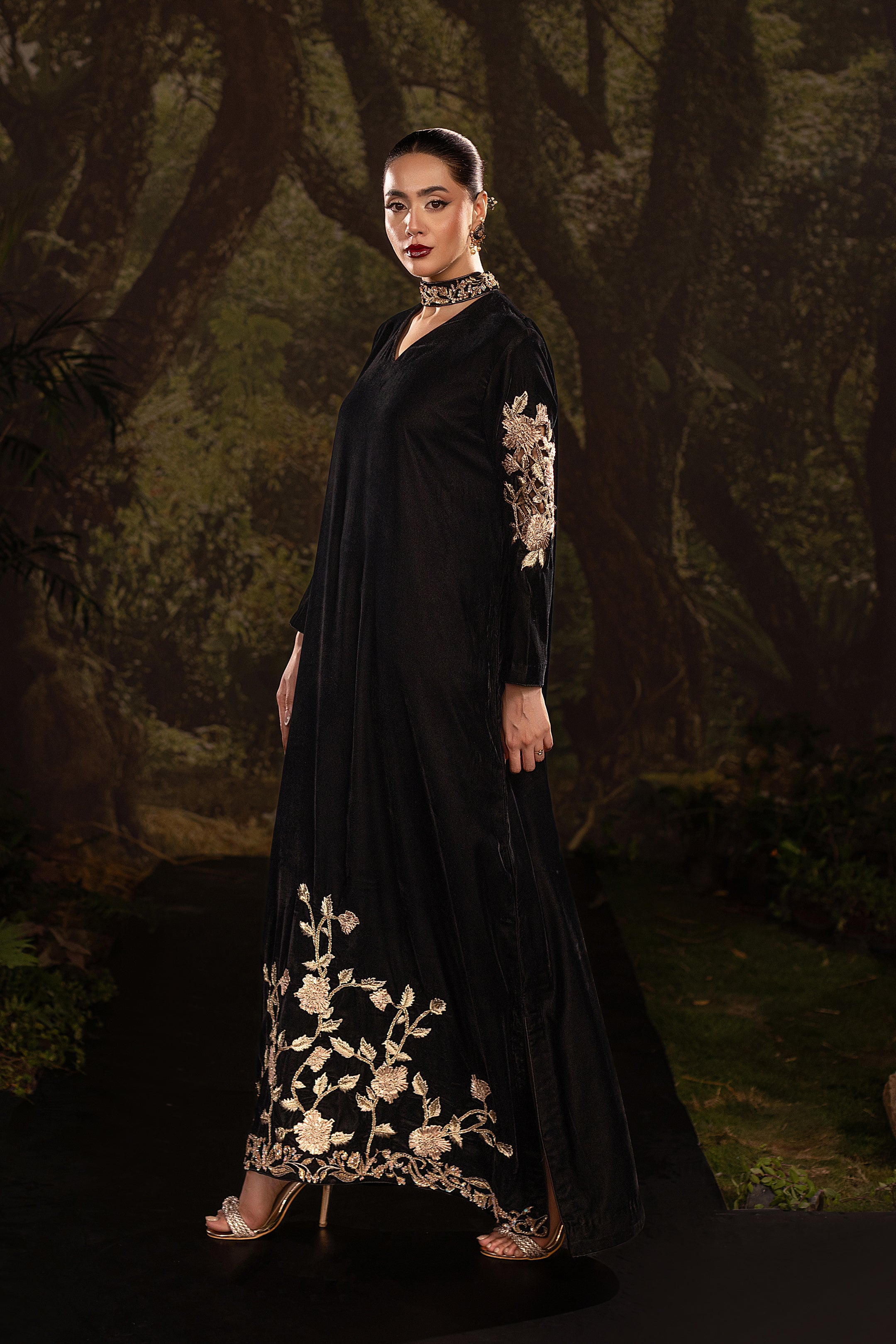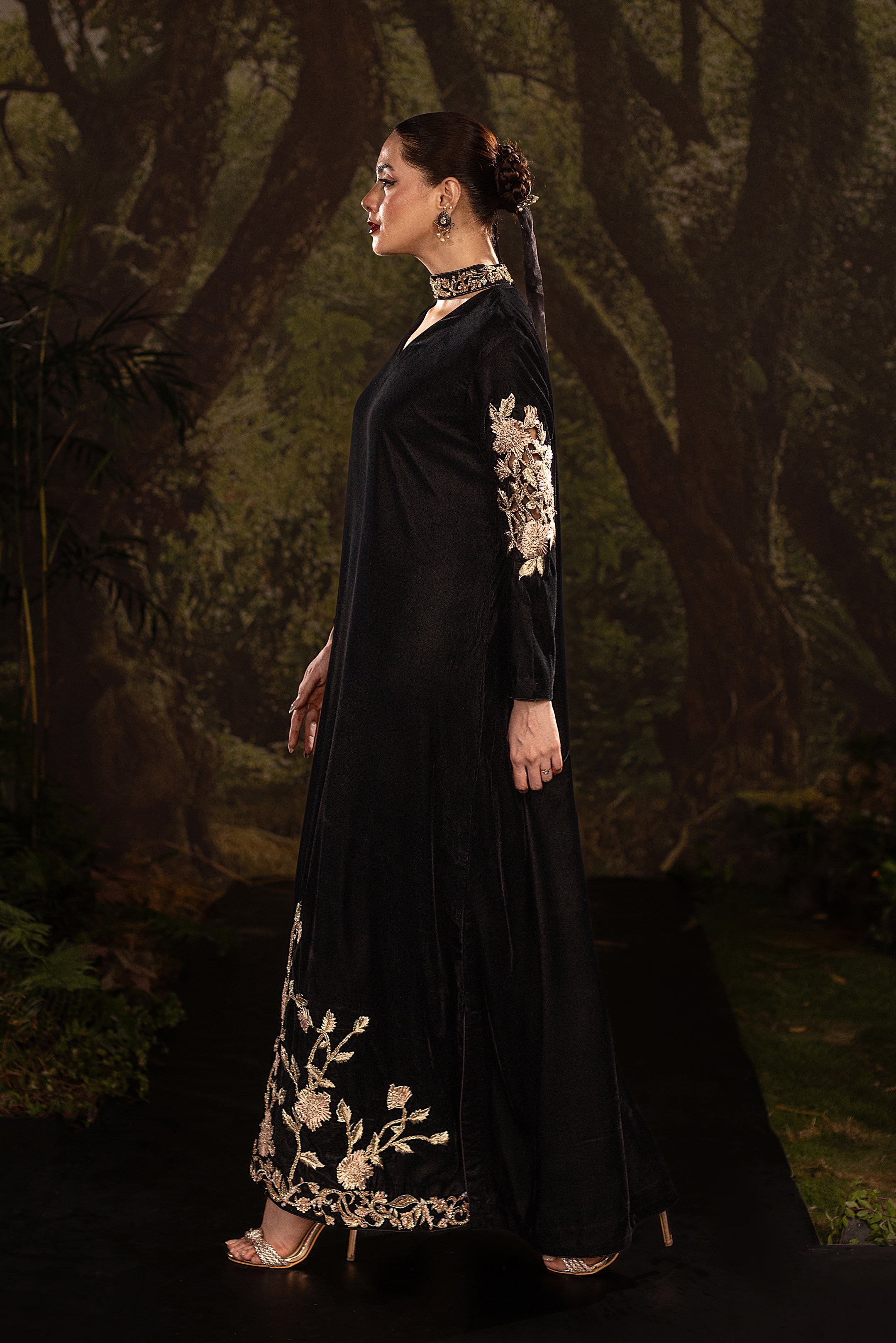 Dark elegance takes form in this black velvet silhouette, where simplicity meets grandeur. The long, fluid cut flows with quiet authority, its richness deepened by the inky sheen of velvet. Intricate golden embroidery climbs the sleeves and hemline like illuminated vines, striking a perfect balance between restraint and ornamentation. The V-neckline and embroidered choker frames the décolletage with subtle refinement, while the elongated shape elongates the figure, evoking timeless poise. A statement of understated power, this piece is designed for evenings where presence speaks louder than words.