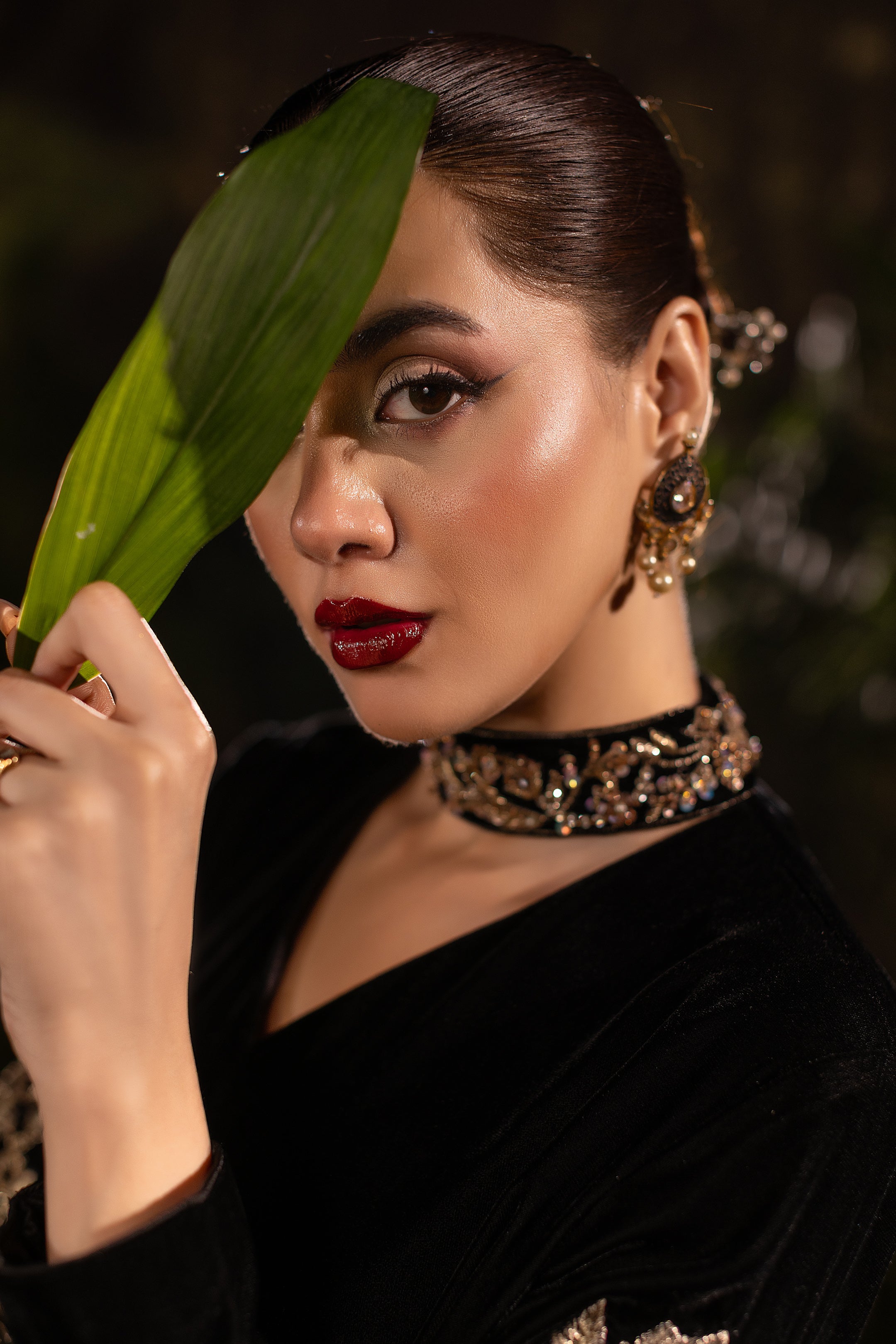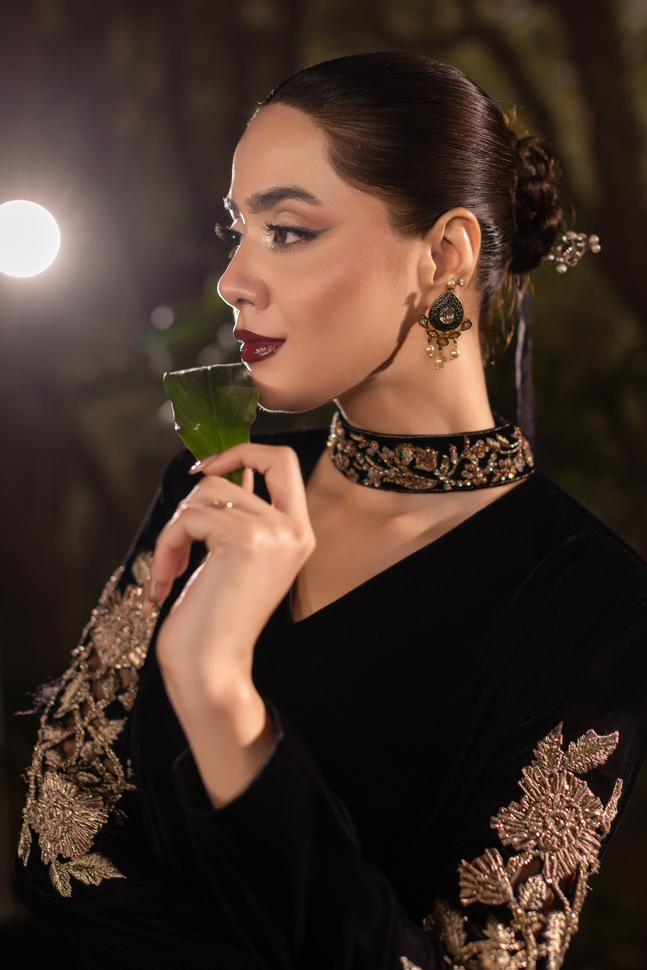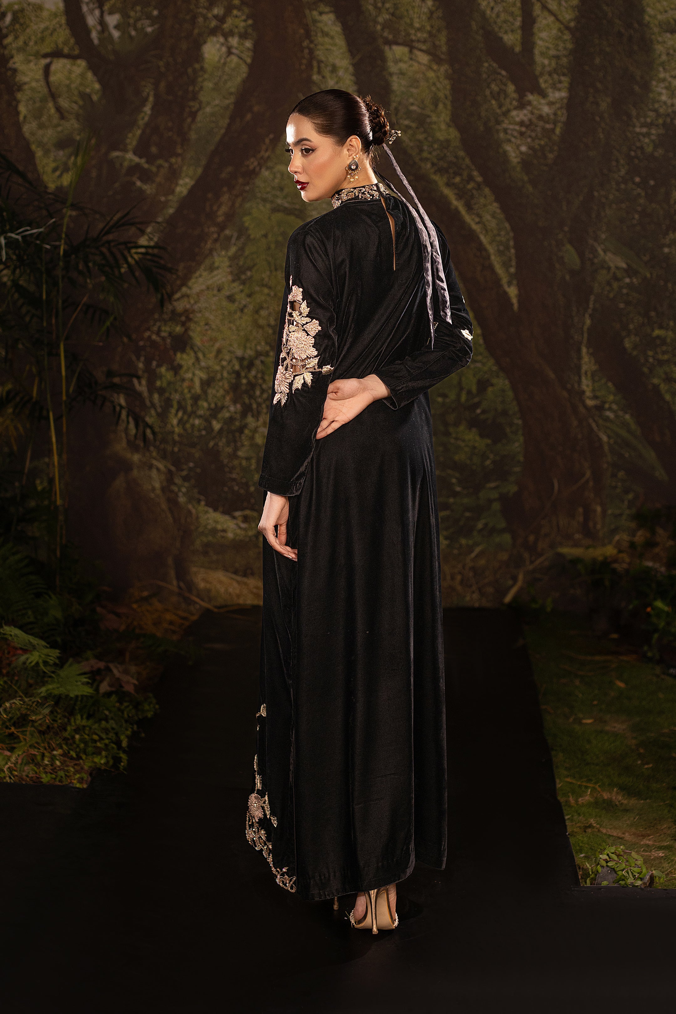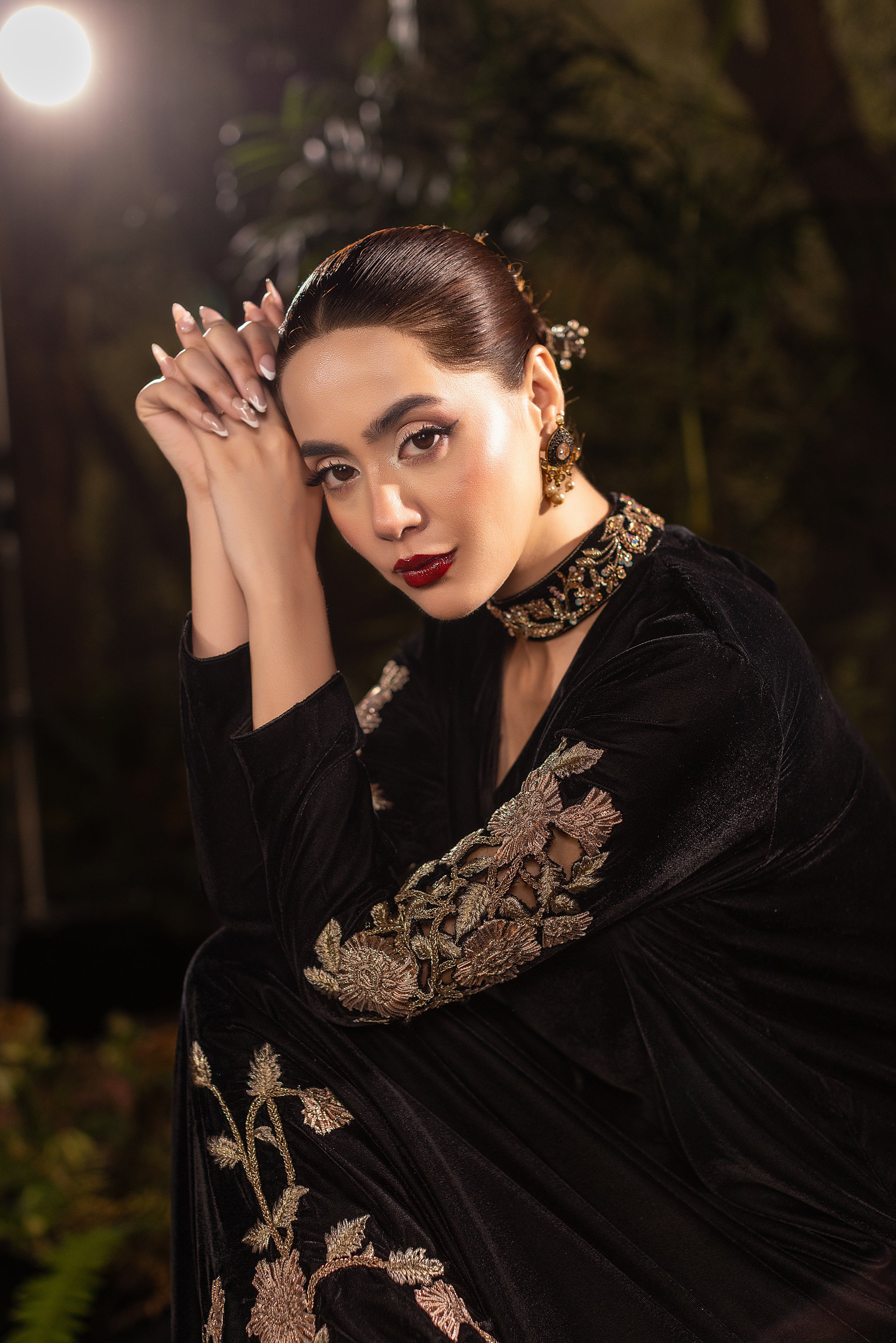 Dark elegance takes form in this black velvet silhouette, where simplicity meets grandeur. The long, fluid cut flows with quiet authority, its richness deepened by the inky sheen of velvet. Intricate golden embroidery climbs the sleeves and hemline like illuminated vines, striking a perfect balance between restraint and ornamentation. The V-neckline and embroidered choker frames the décolletage with subtle refinement, while the elongated shape elongates the figure, evoking timeless poise. A statement of understated power, this piece is designed for evenings where presence speaks louder than words.