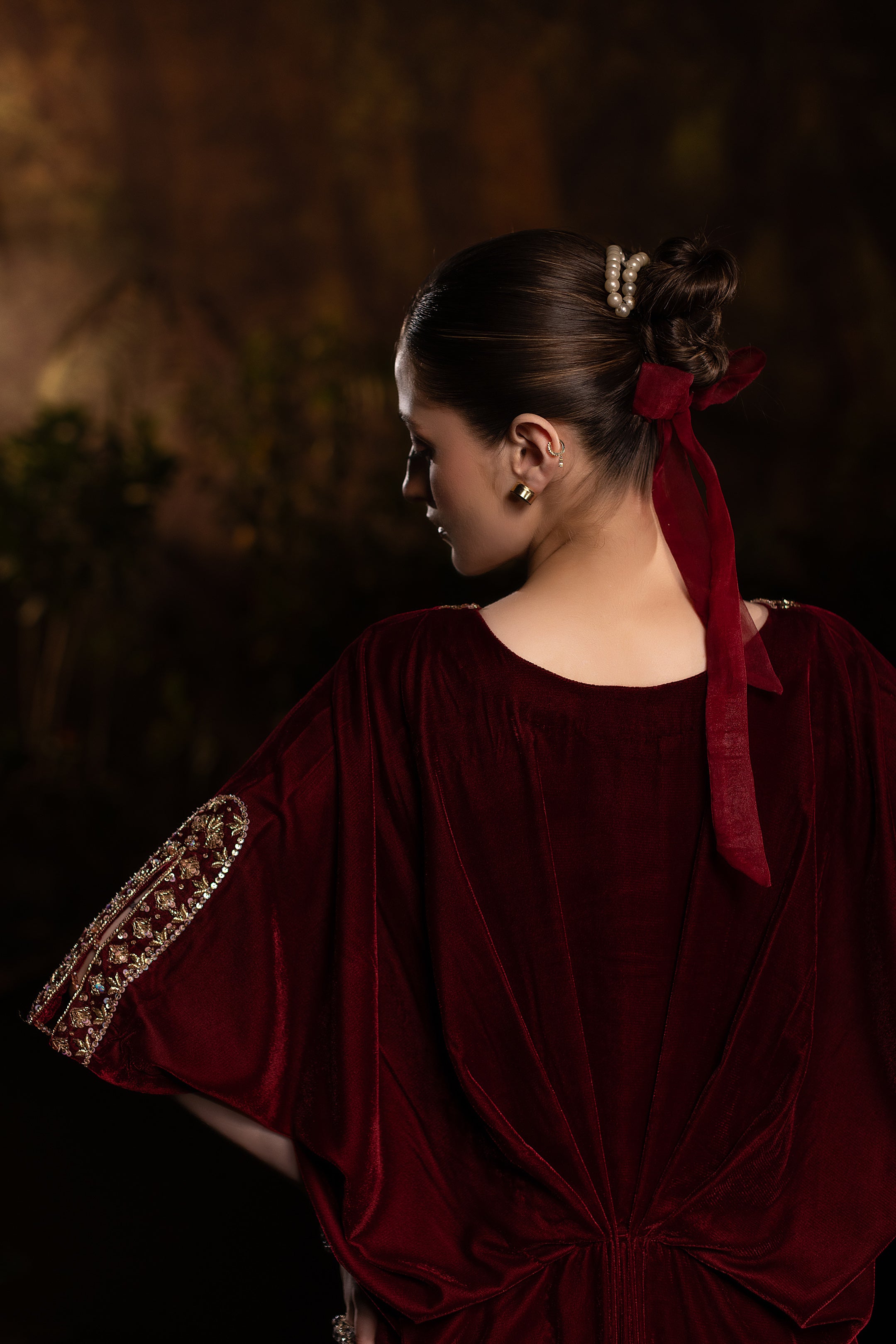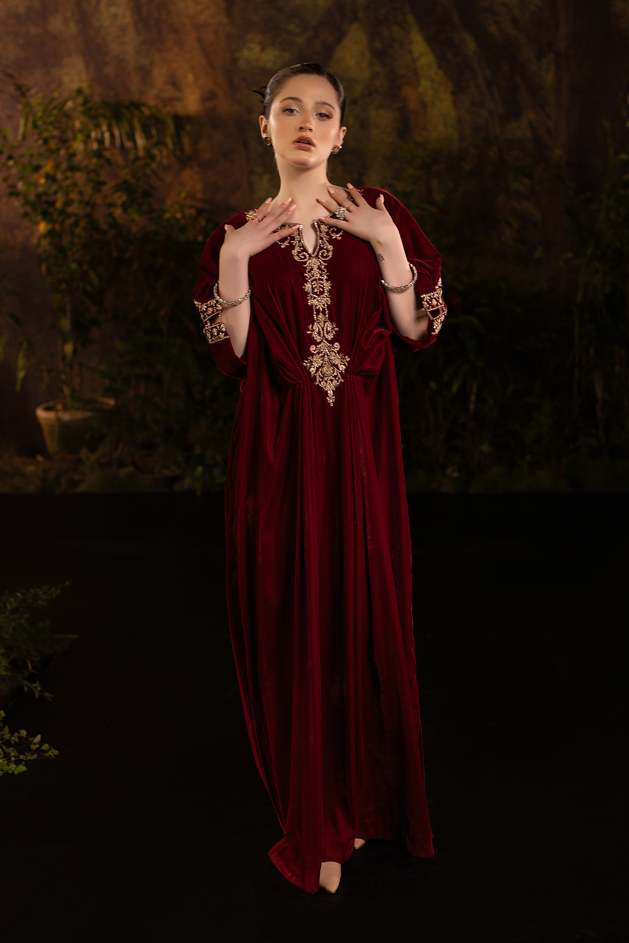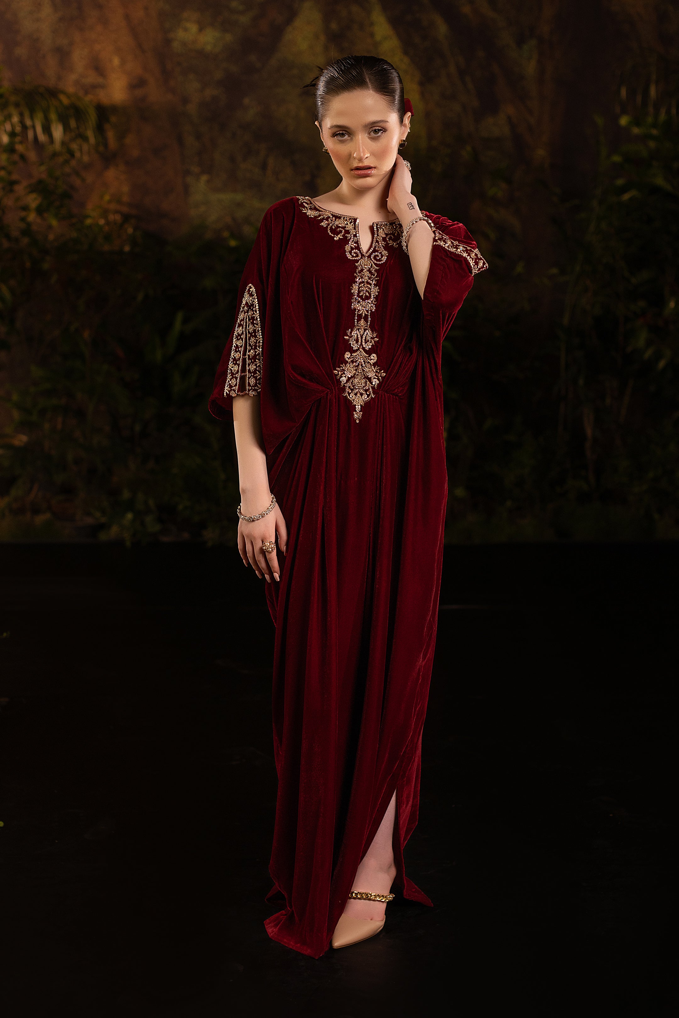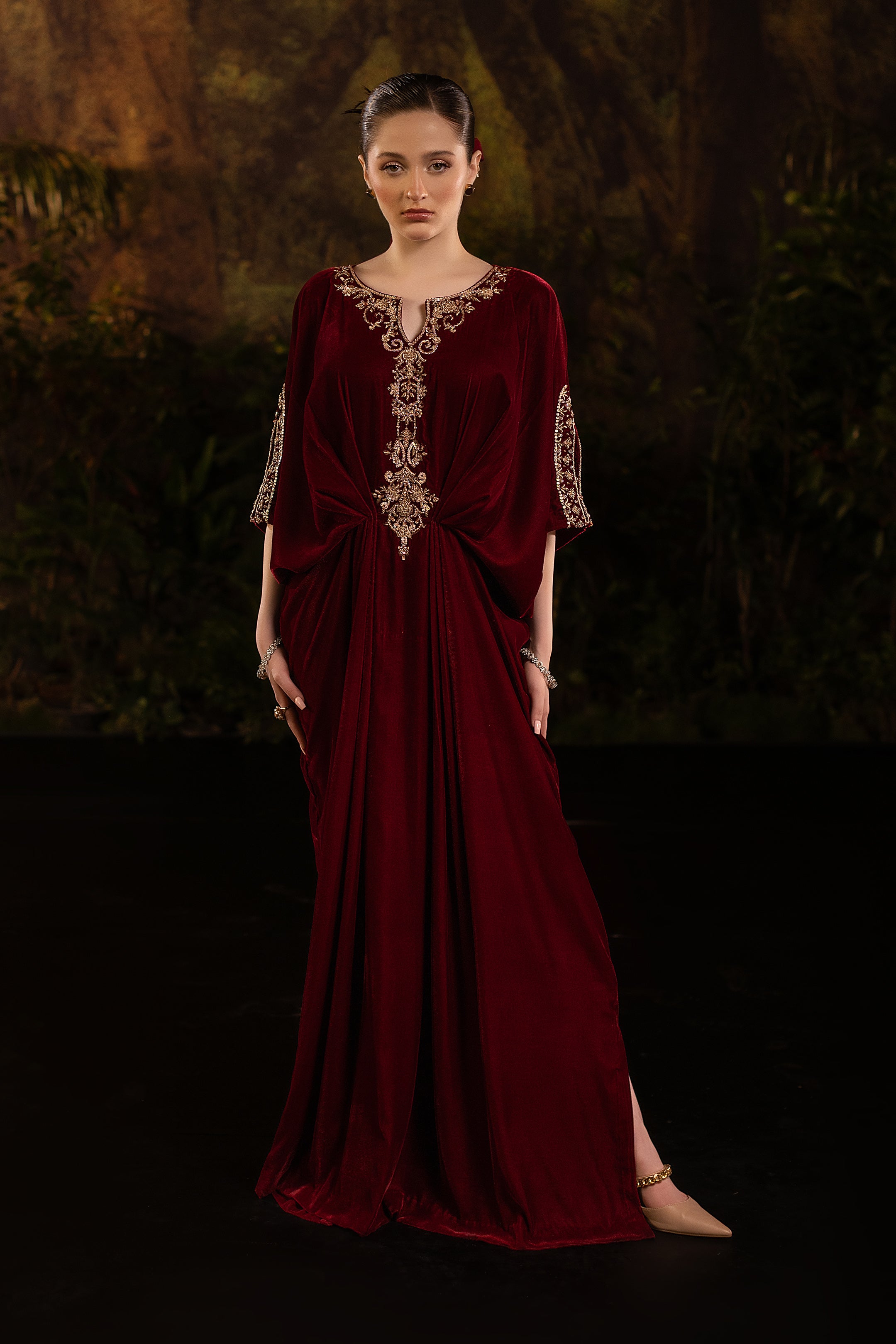 A vision of regal sophistication, this maroon velvet kaftan is the perfect blend of tradition and elegance. The rich velvet fabric drapes beautifully, enhanced by a central gathered design that flatters the silhouette. Intricate gold embroidery graces the neckline and front panel, while the sleeves are adorned with detailed embellishments for a touch of grandeur. The deep maroon hue, paired with opulent handwork, makes this kaftan an exquisite choice for weddings, festive evenings, and luxurious winter soirées.