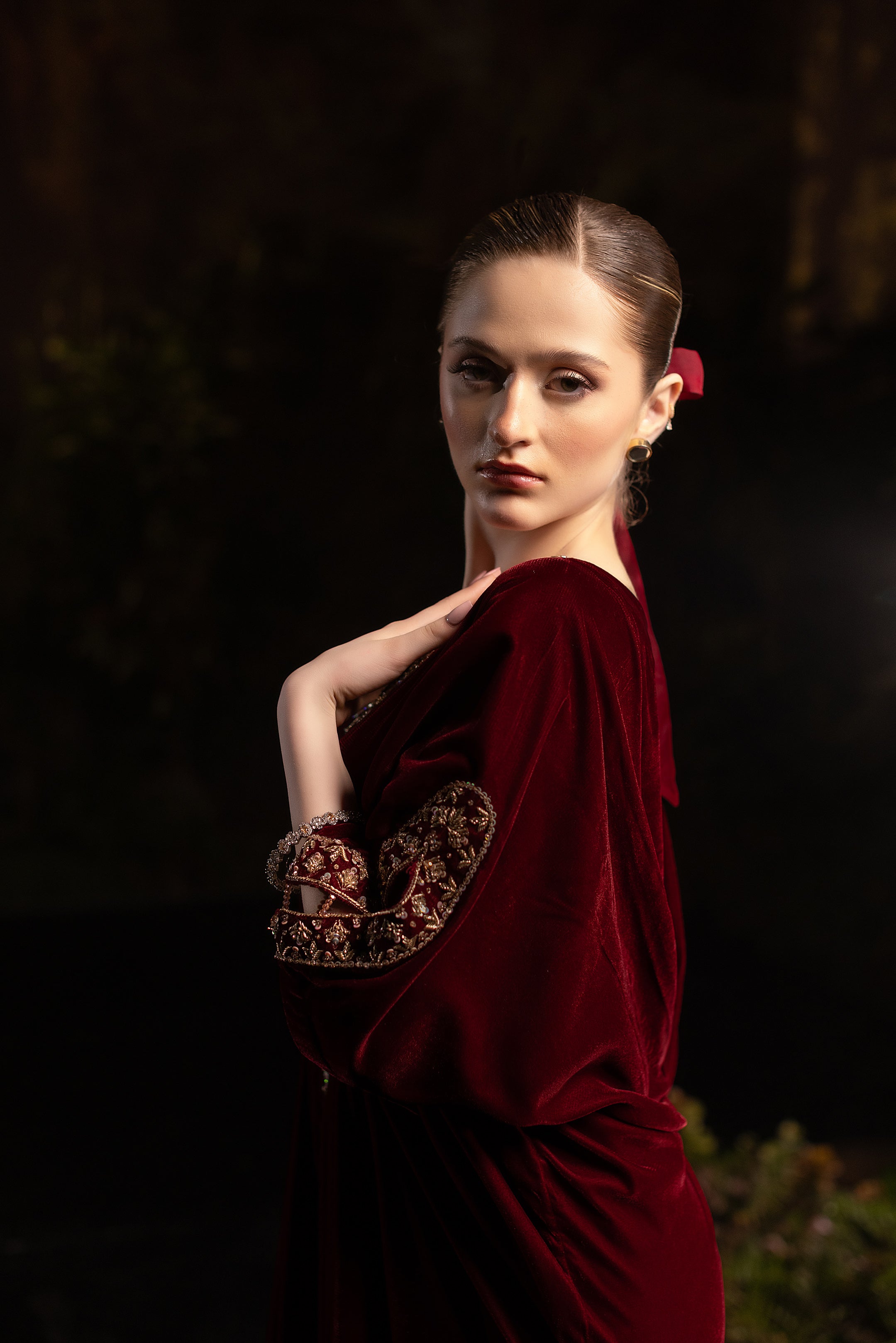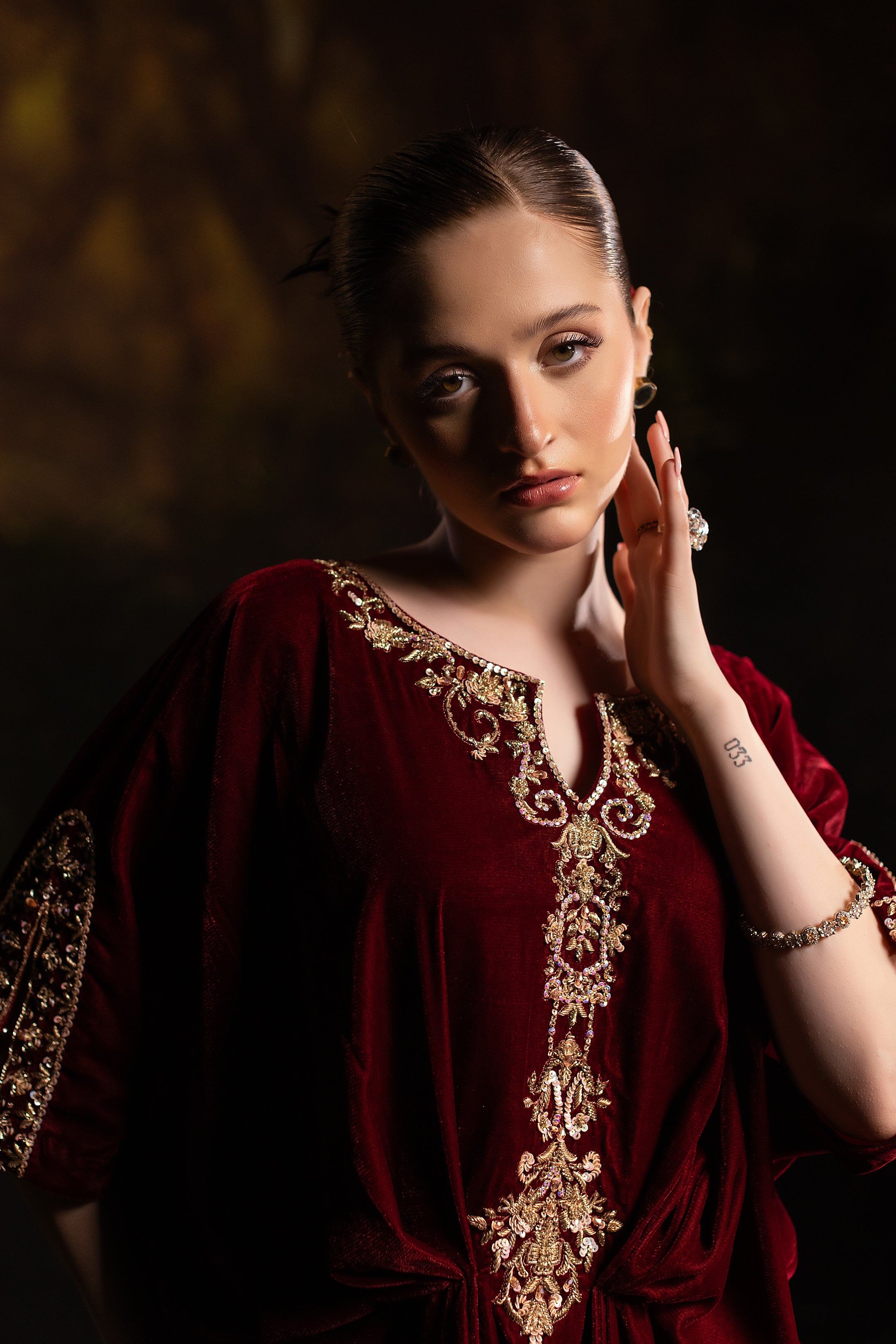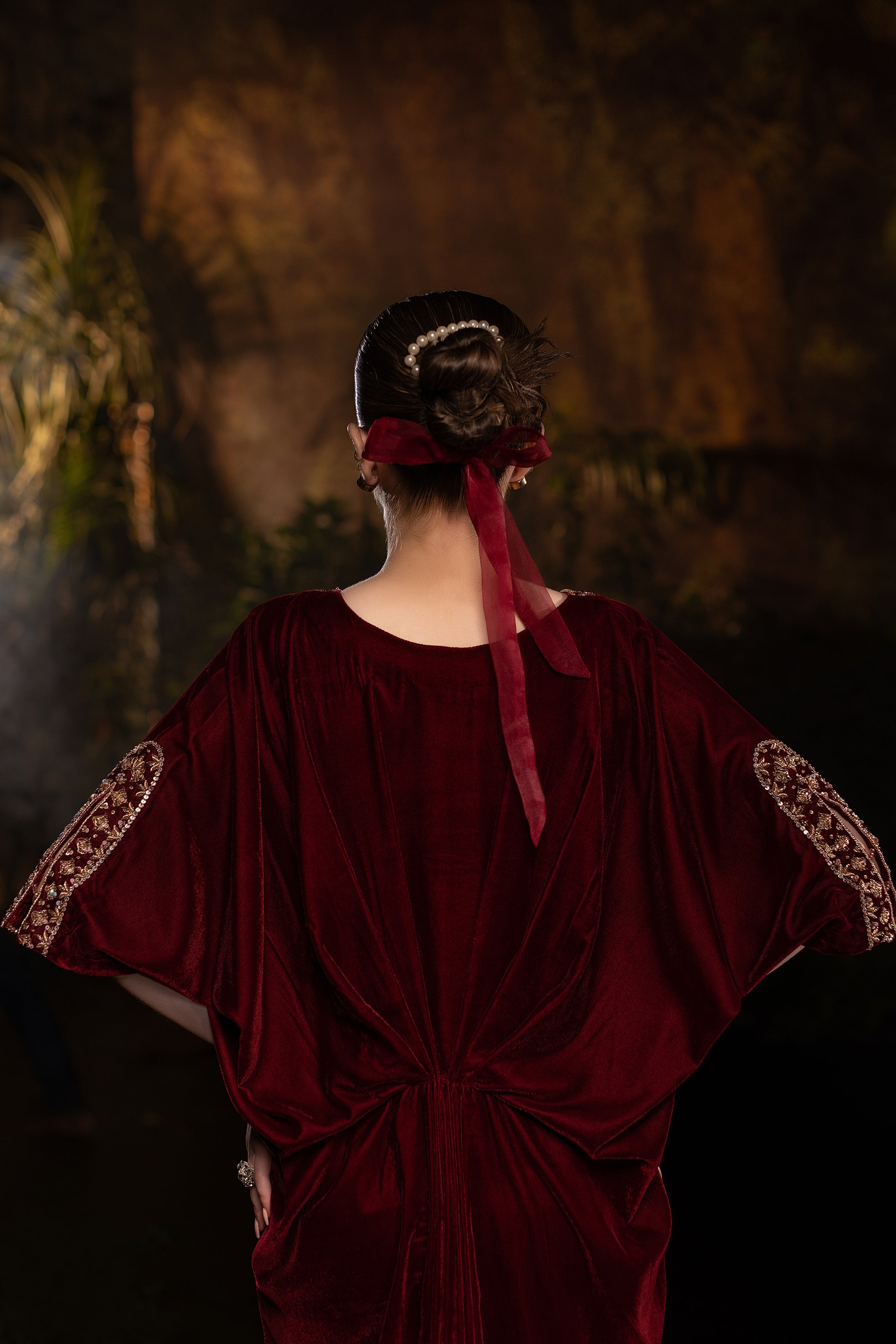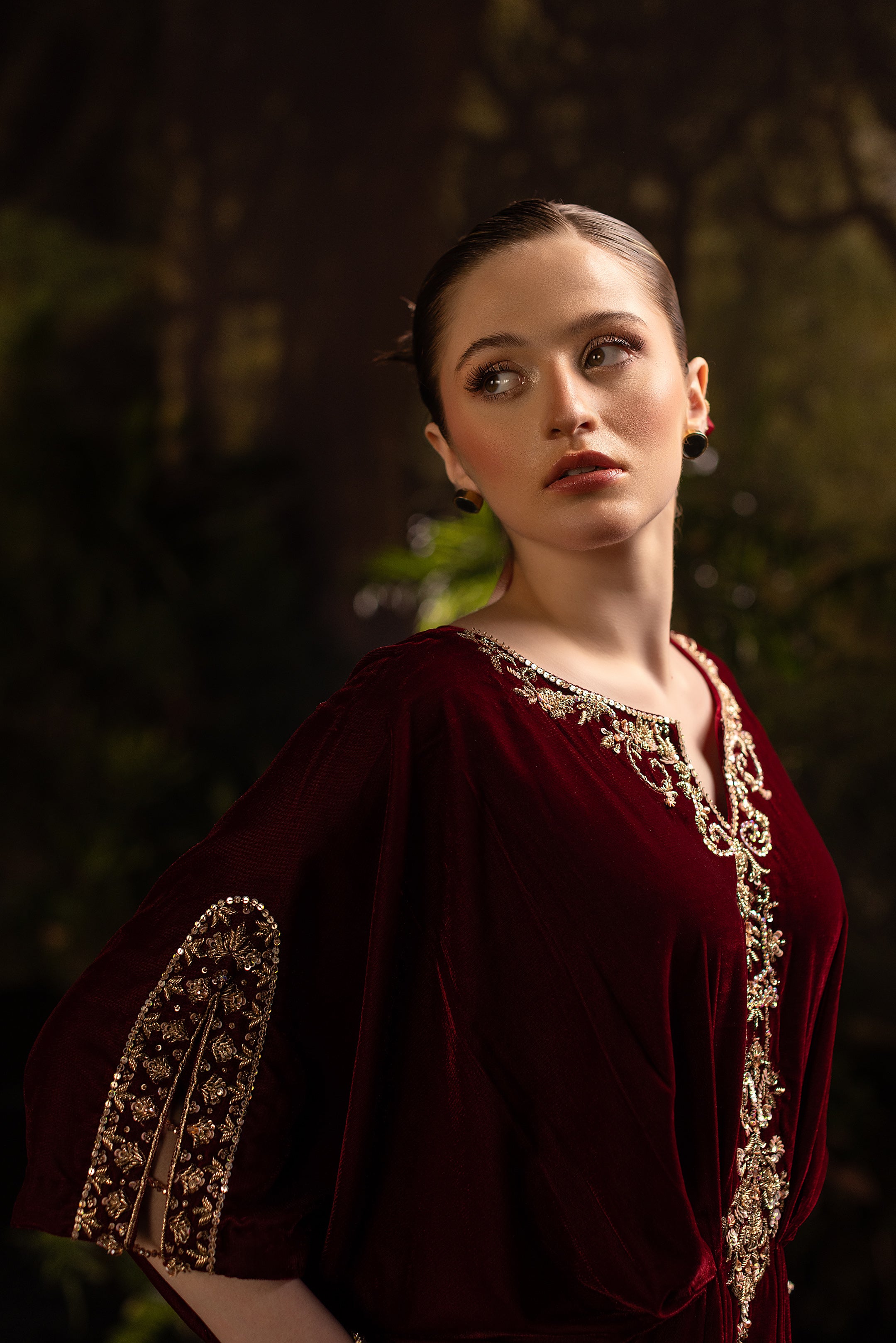 A vision of regal sophistication, this maroon velvet kaftan is the perfect blend of tradition and elegance. The rich velvet fabric drapes beautifully, enhanced by a central gathered design that flatters the silhouette. Intricate gold embroidery graces the neckline and front panel, while the sleeves are adorned with detailed embellishments for a touch of grandeur. The deep maroon hue, paired with opulent handwork, makes this kaftan an exquisite choice for weddings, festive evenings, and luxurious winter soirées.