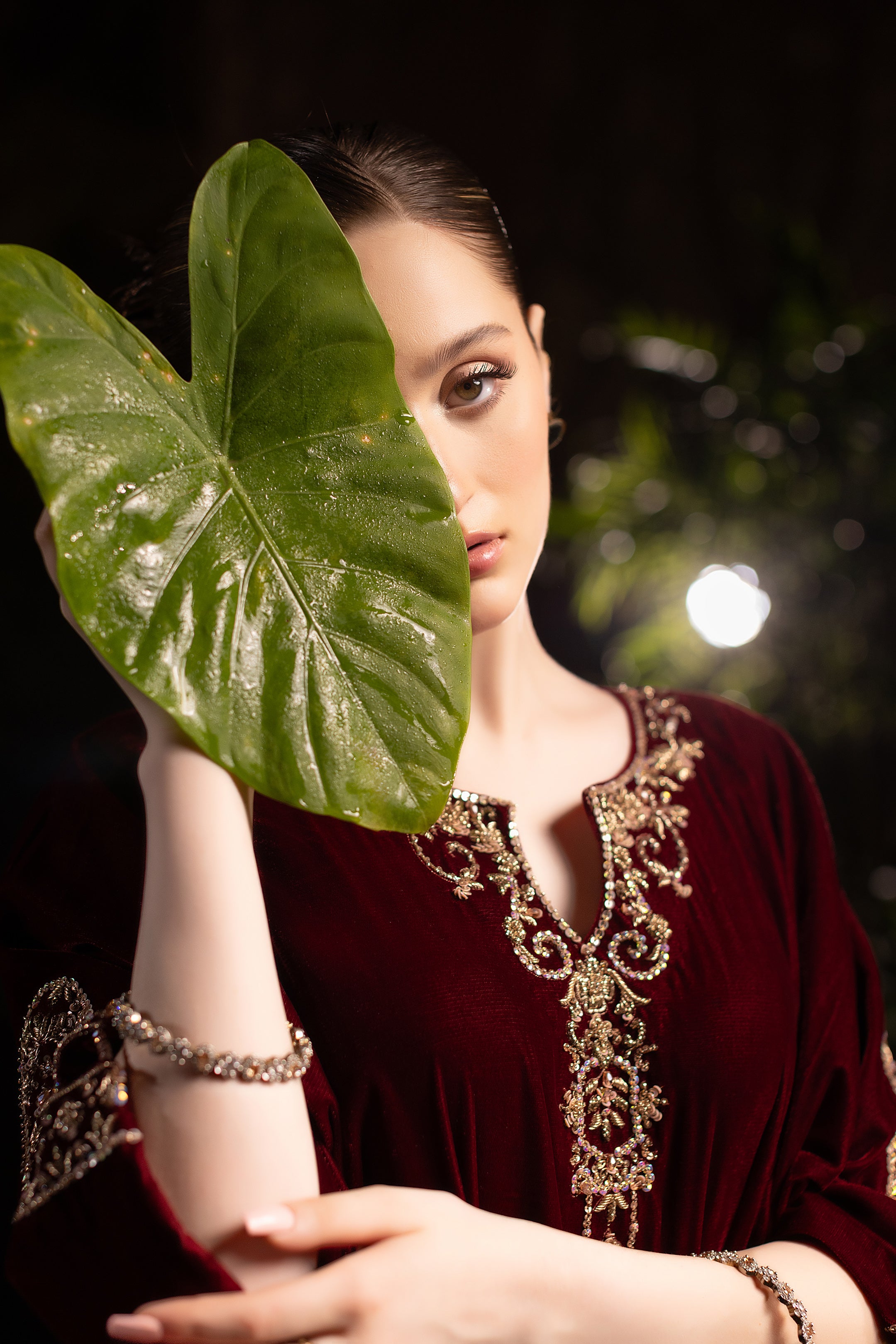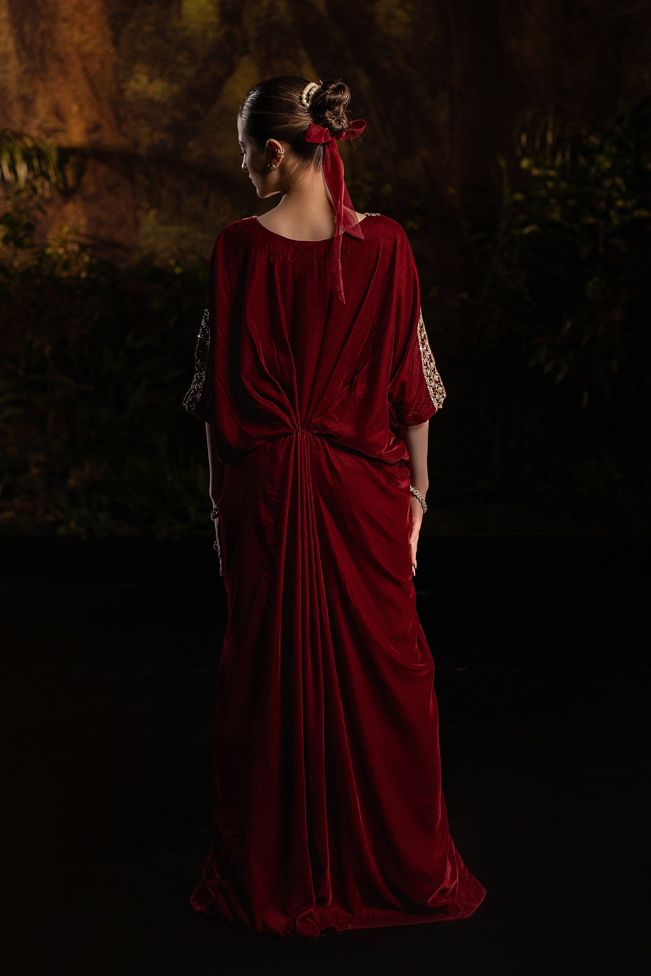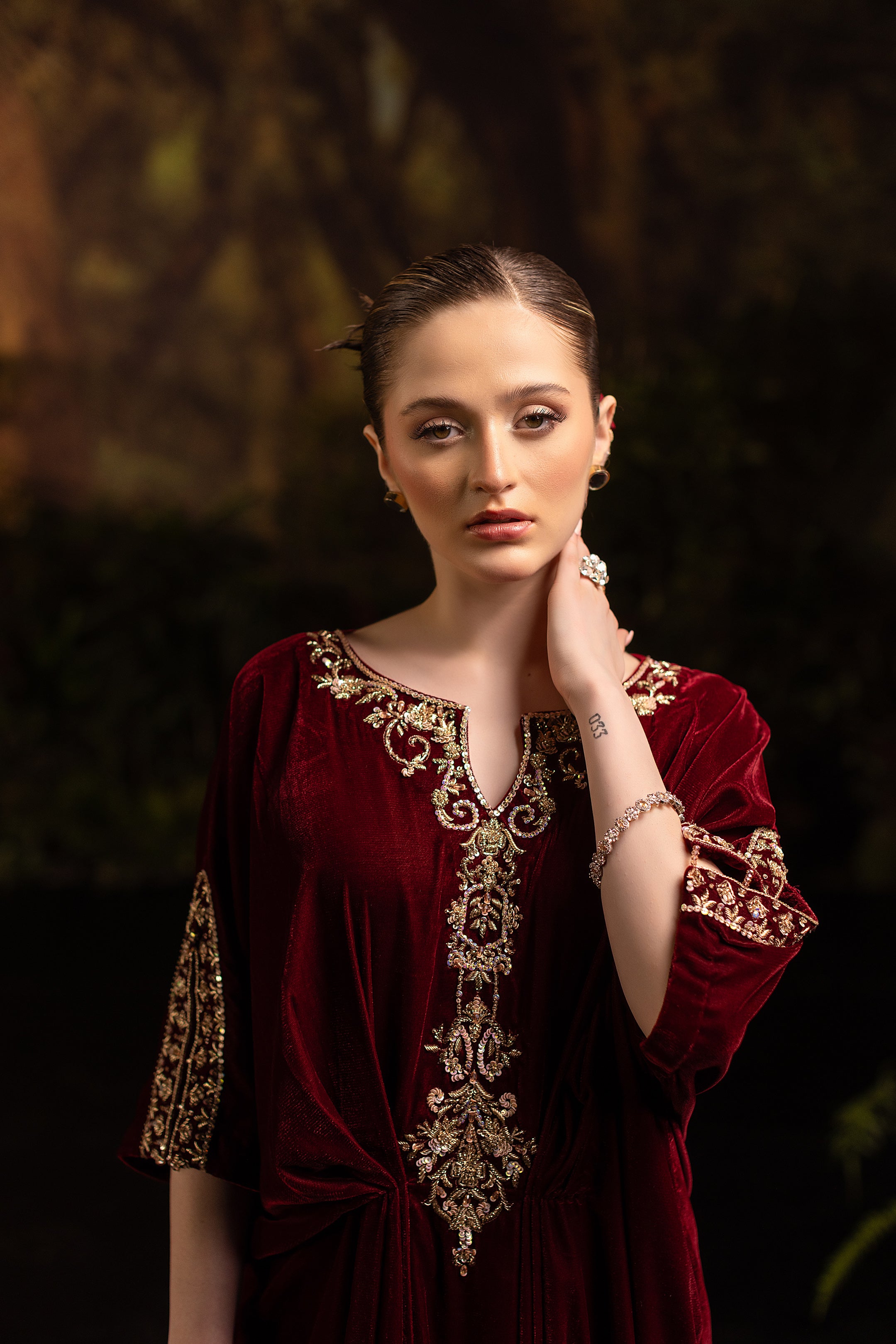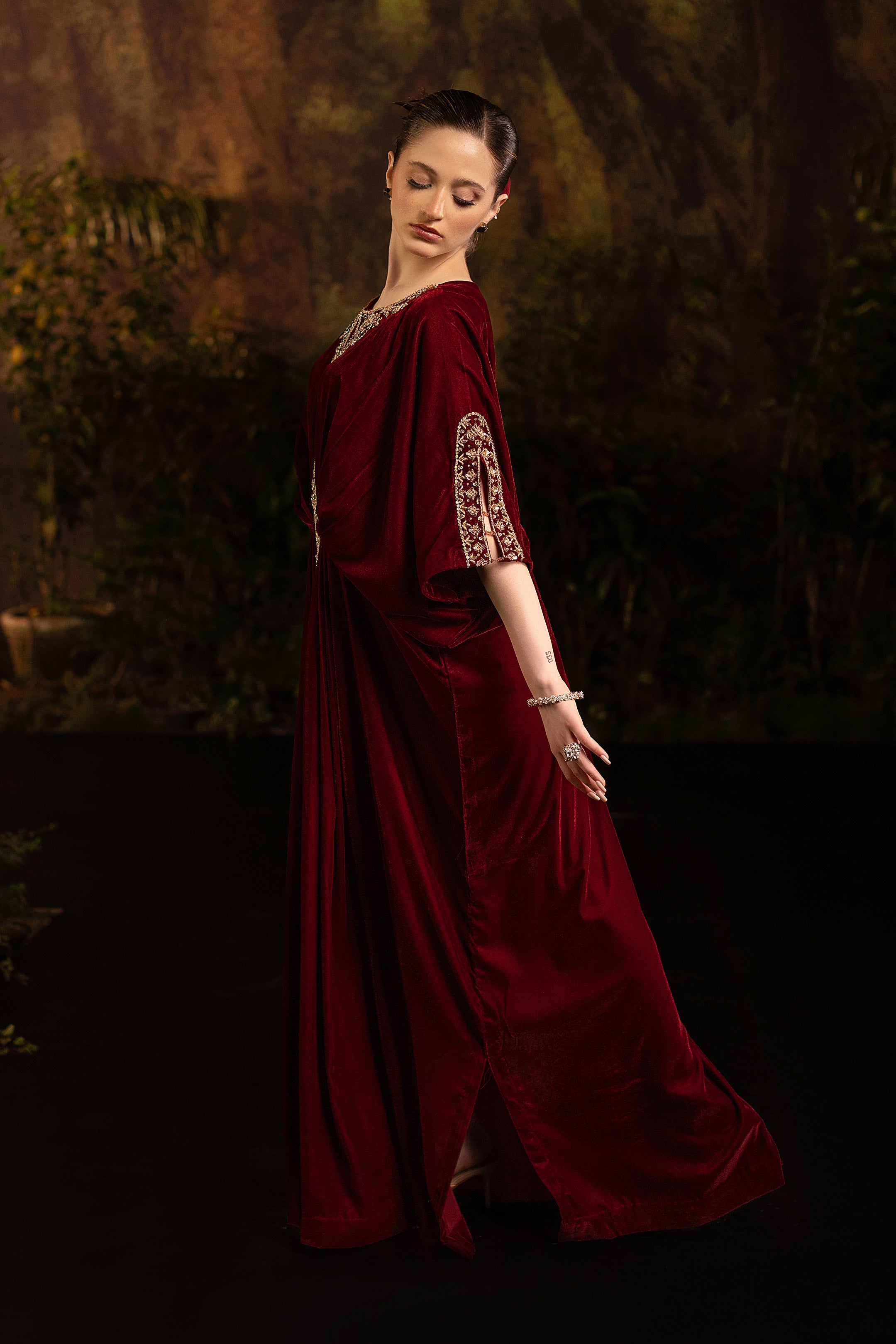 A vision of regal sophistication, this maroon velvet kaftan is the perfect blend of tradition and elegance. The rich velvet fabric drapes beautifully, enhanced by a central gathered design that flatters the silhouette. Intricate gold embroidery graces the neckline and front panel, while the sleeves are adorned with detailed embellishments for a touch of grandeur. The deep maroon hue, paired with opulent handwork, makes this kaftan an exquisite choice for weddings, festive evenings, and luxurious winter soirées.