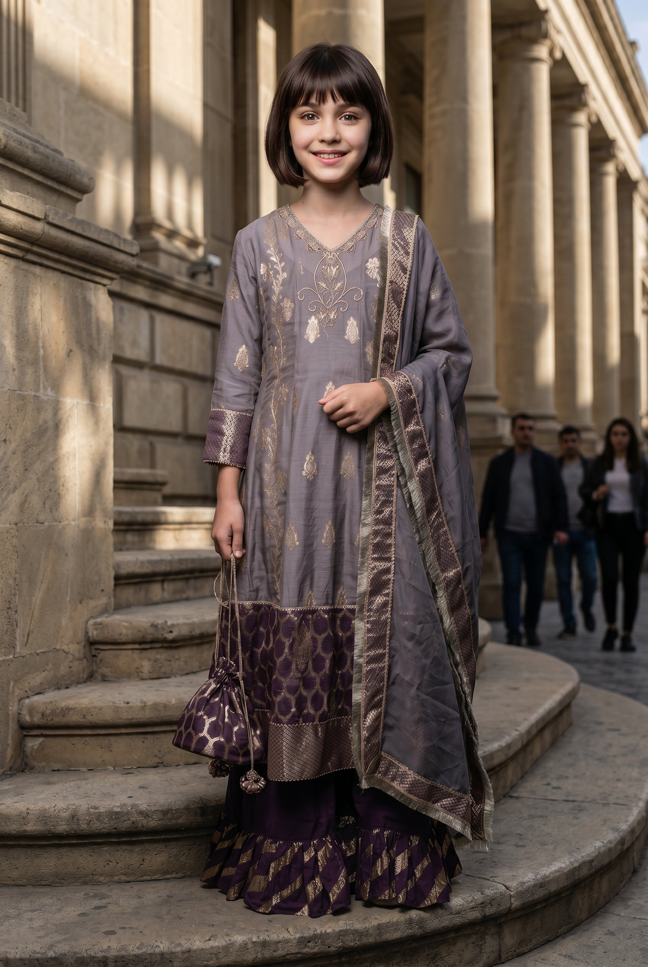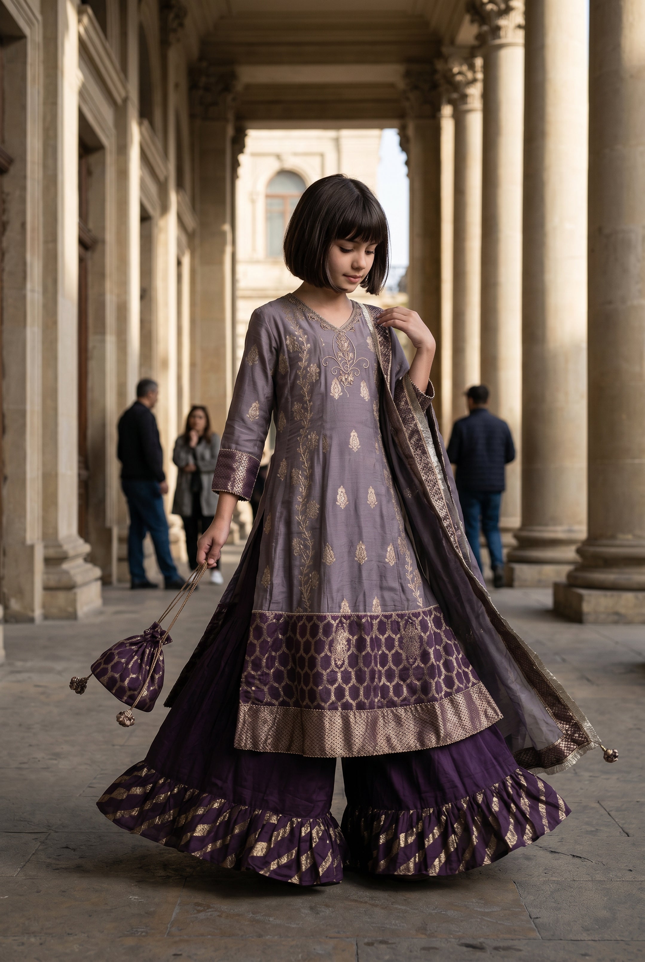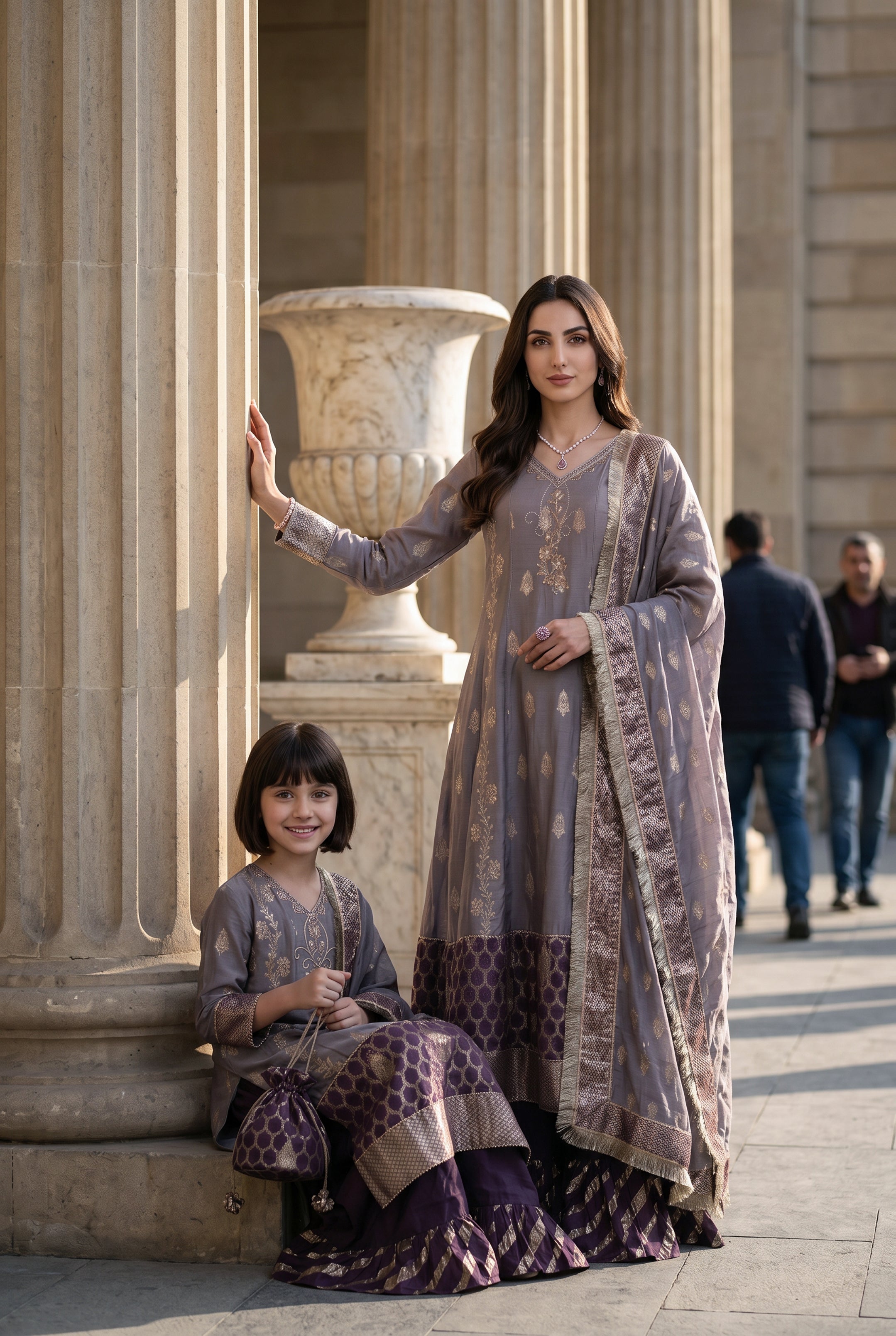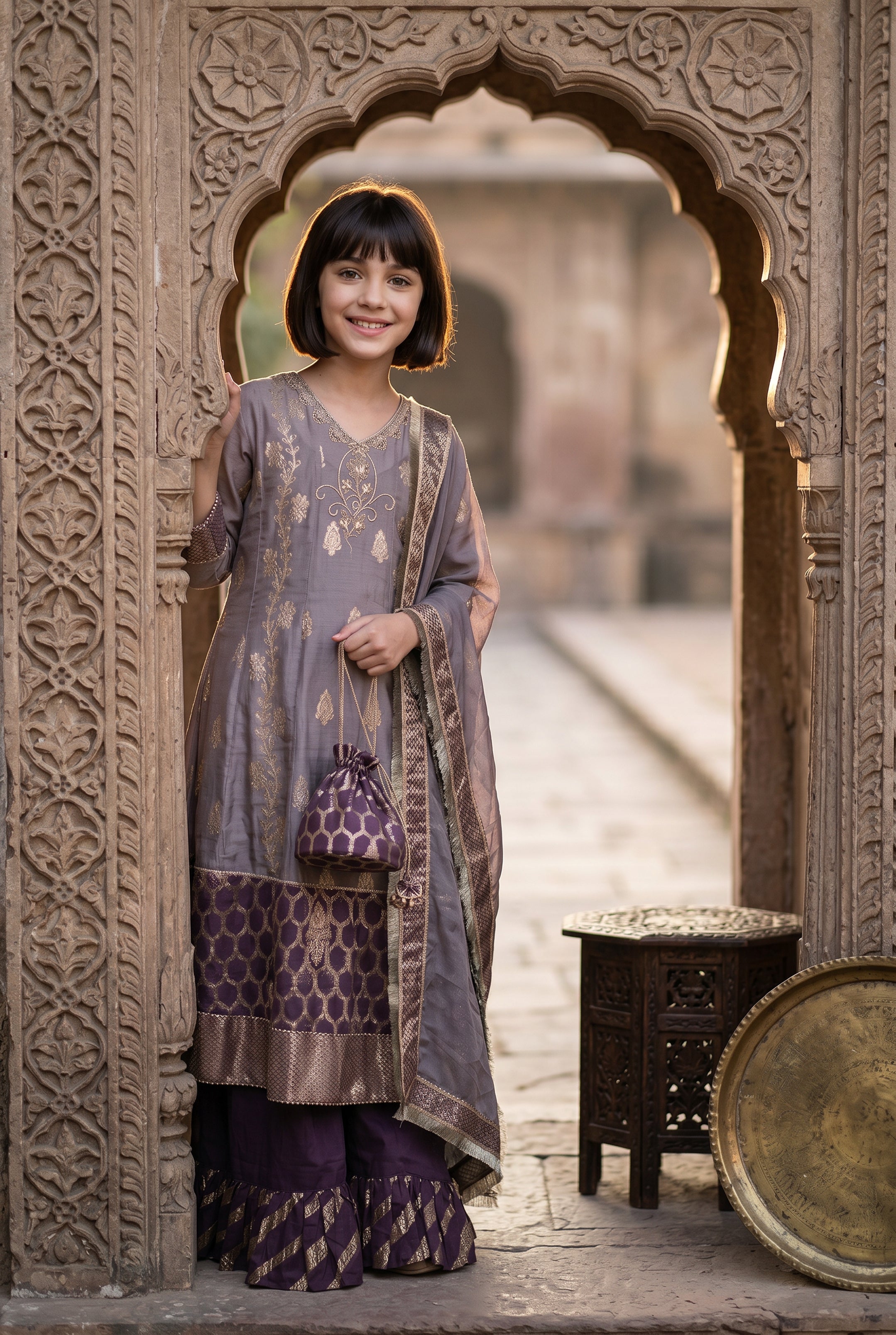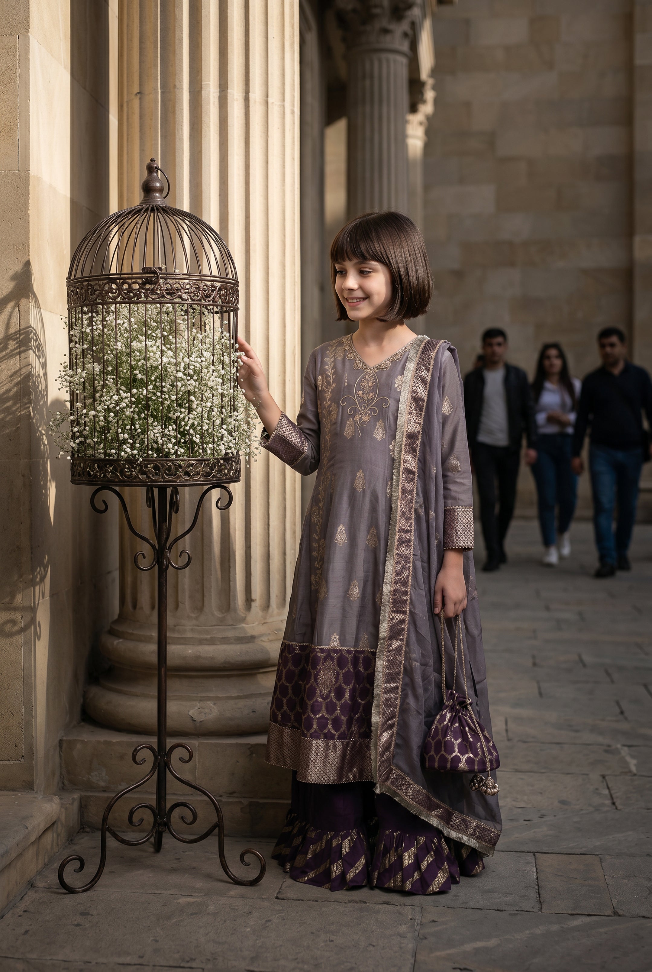 Aylin is a pretty lavender and purple embossed silk frock with fine embroidery, accompanied by a matching sharara and a chiffon dupatta with embossed borders for a stylish and charming look.