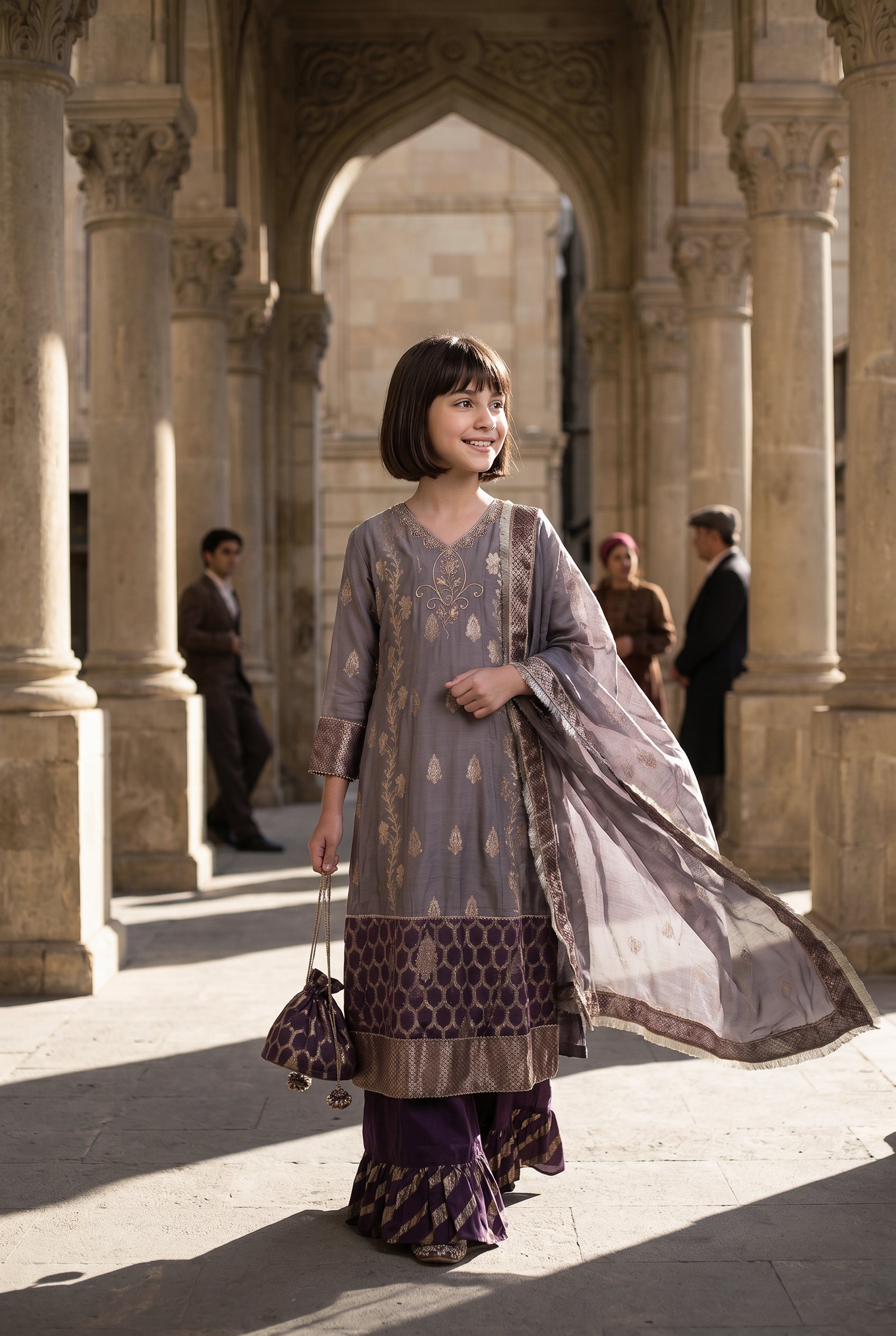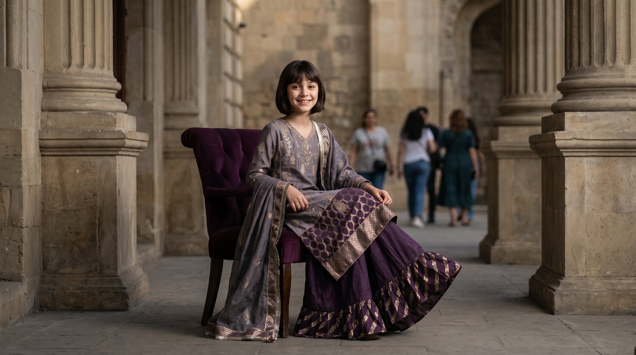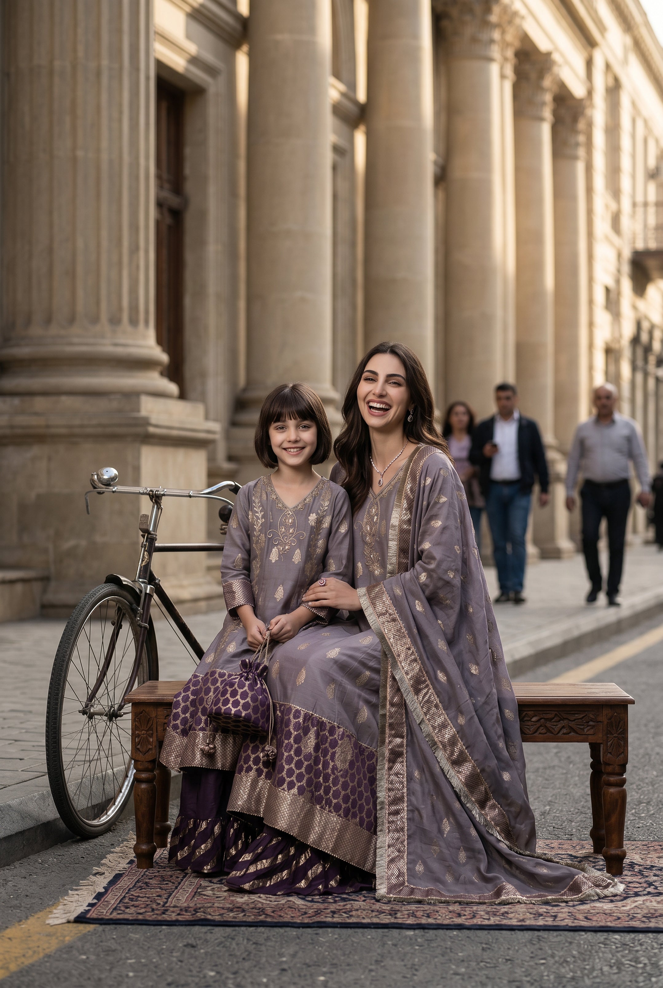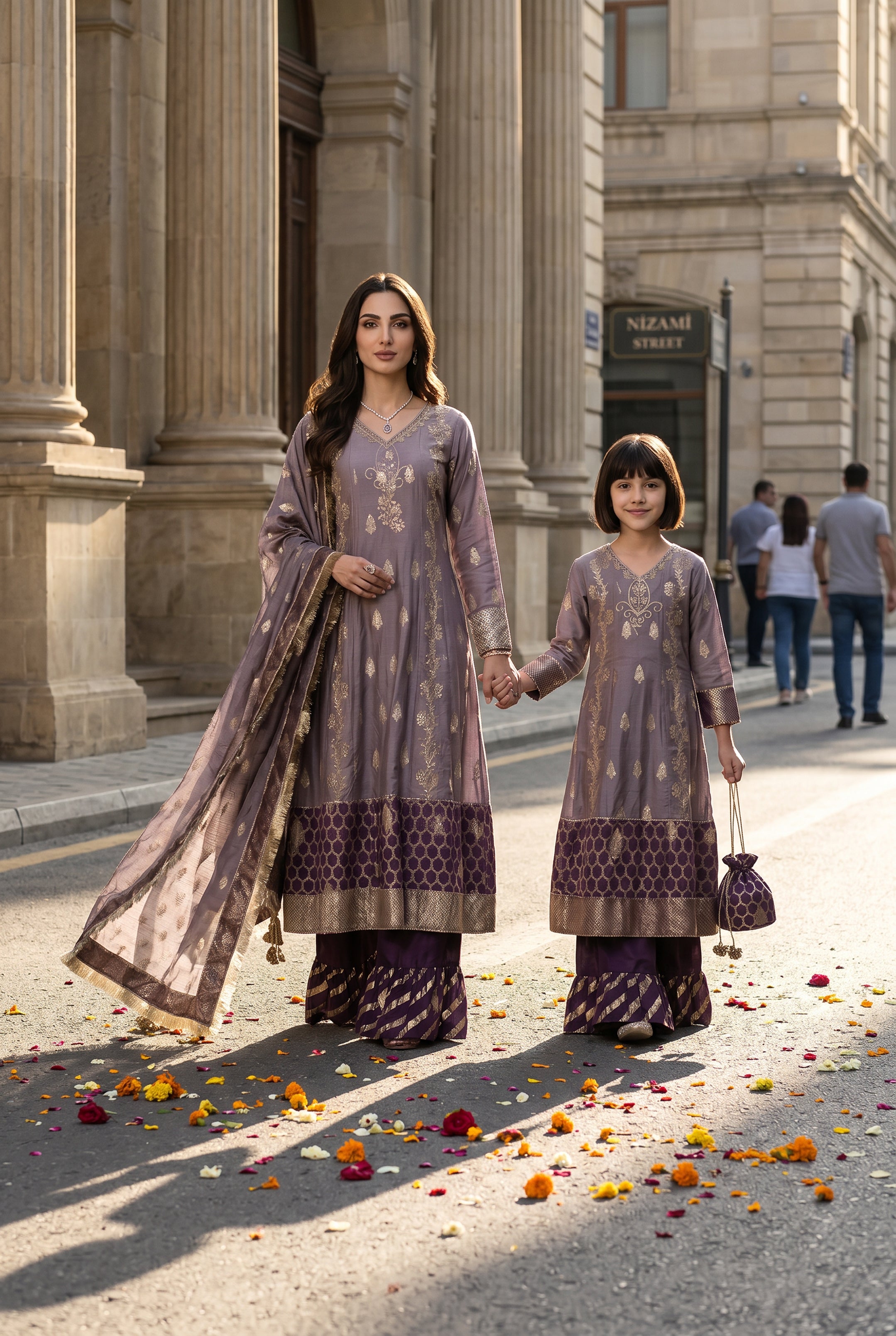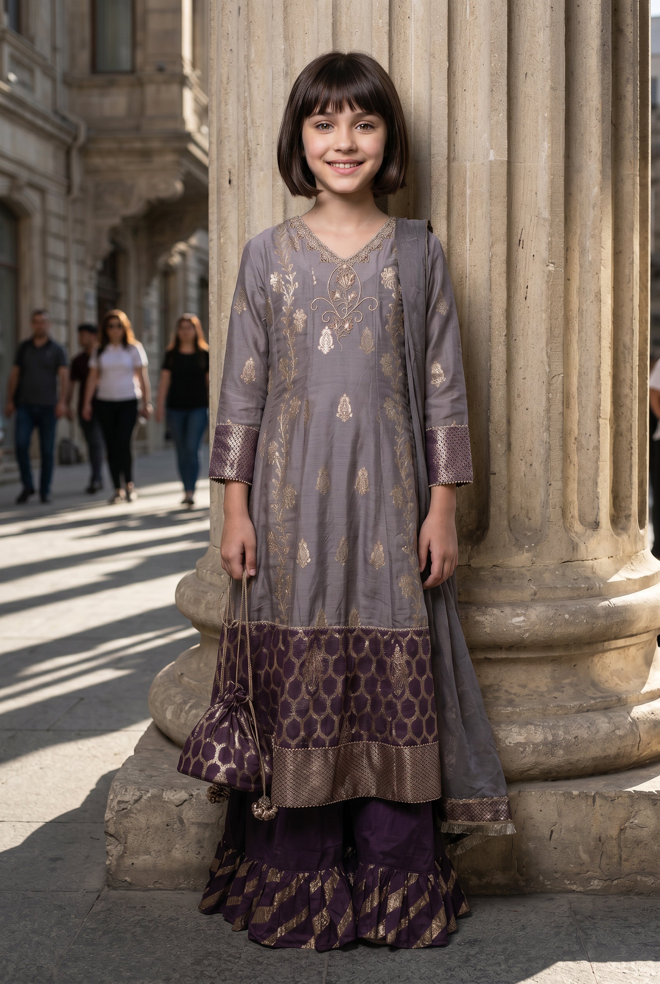 Aylin is a pretty lavender and purple embossed silk frock with fine embroidery, accompanied by a matching sharara and a chiffon dupatta with embossed borders for a stylish and charming look.