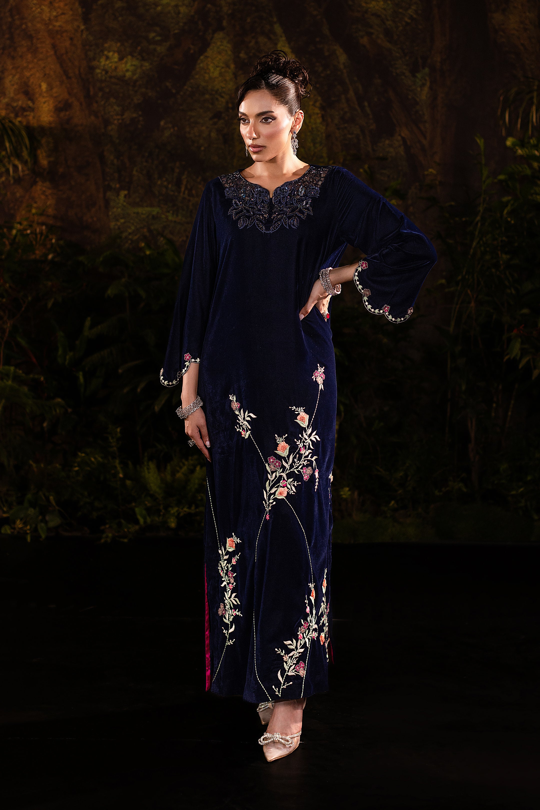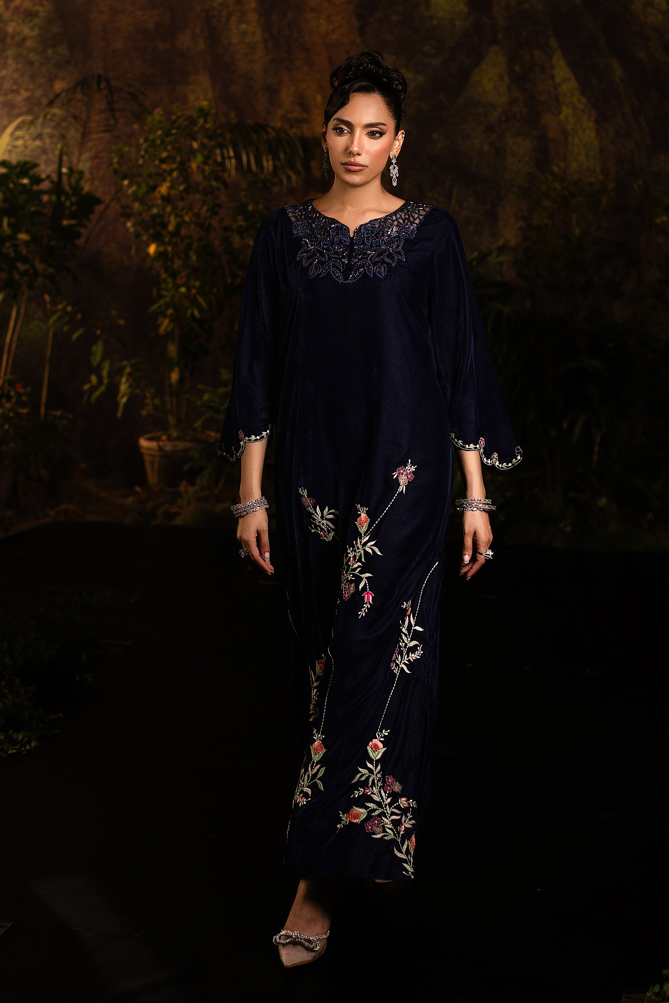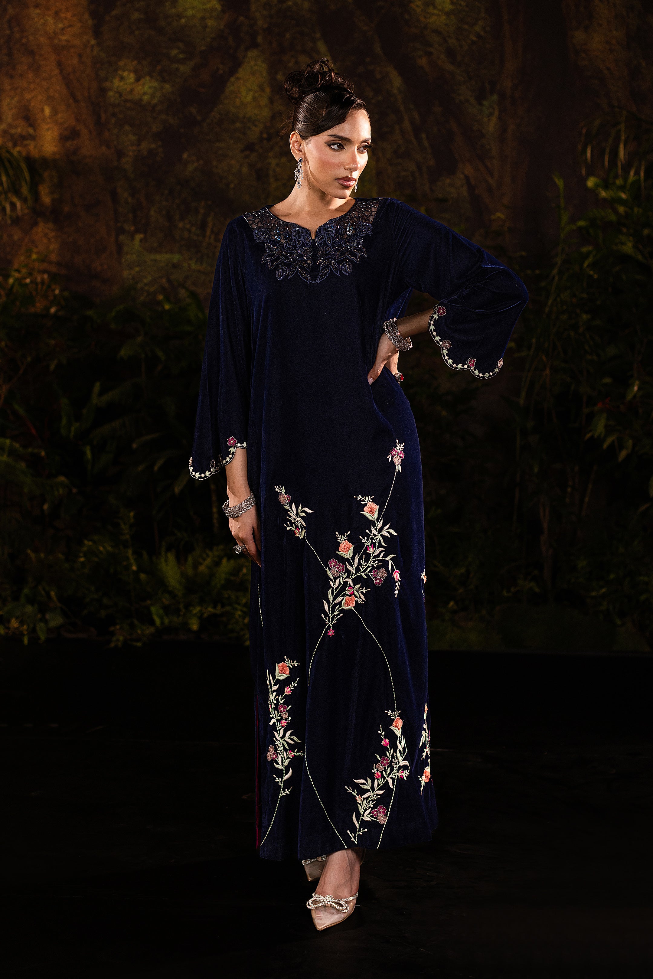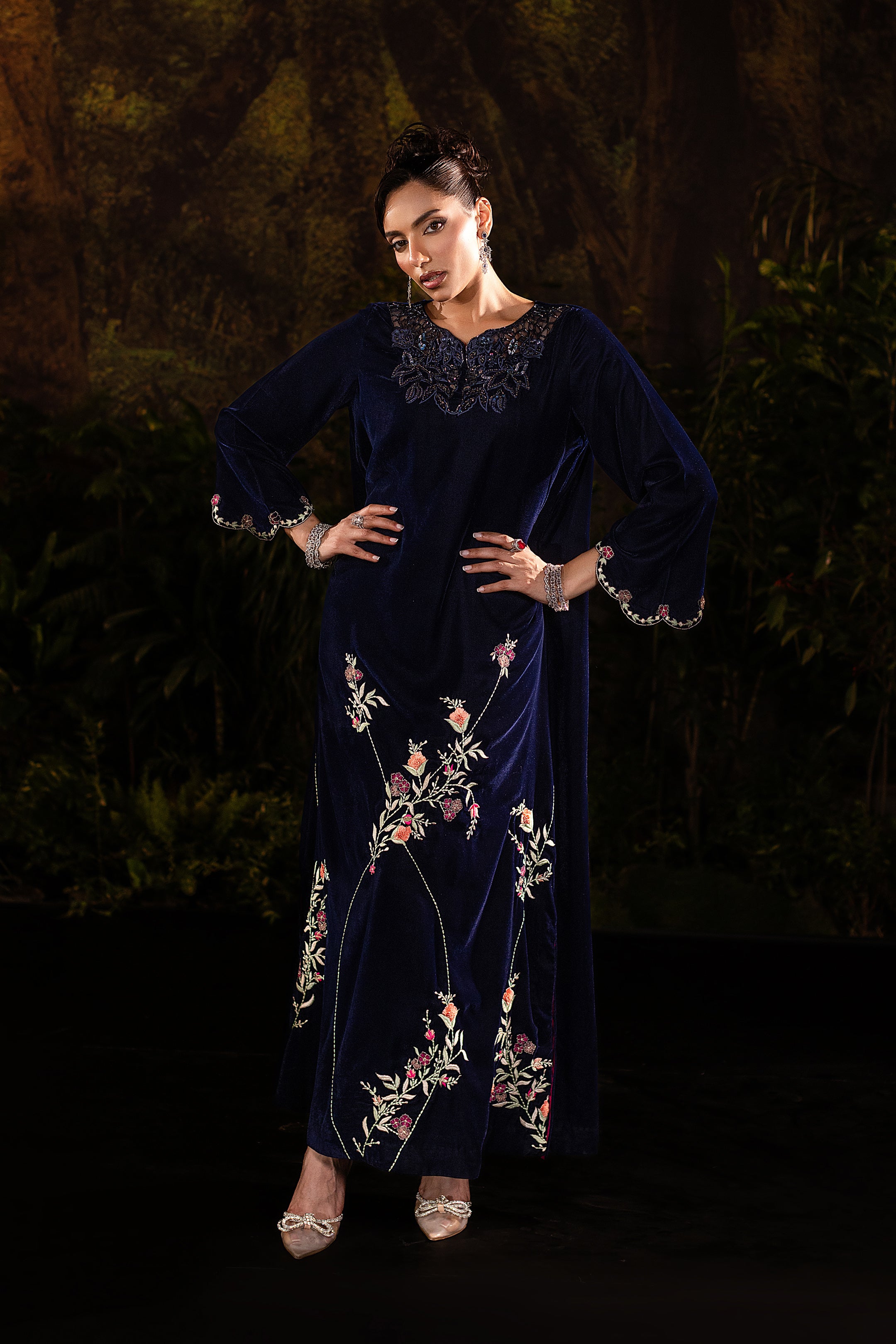 This navy blue velvet long gown captures timeless elegance with a modern touch. The soft velvet fabric drapes luxuriously, giving it a regal yet graceful flow. Intricate cutwork embellishment at the neckline adds a hint of sparkle, while delicate floral embroidery along the hemline creates a romantic contrast against the serene blue. With its full-length silhouette and refined detailing, this gown is perfect for evening soirées or formal occasions where sophistication meets subtle glamour.