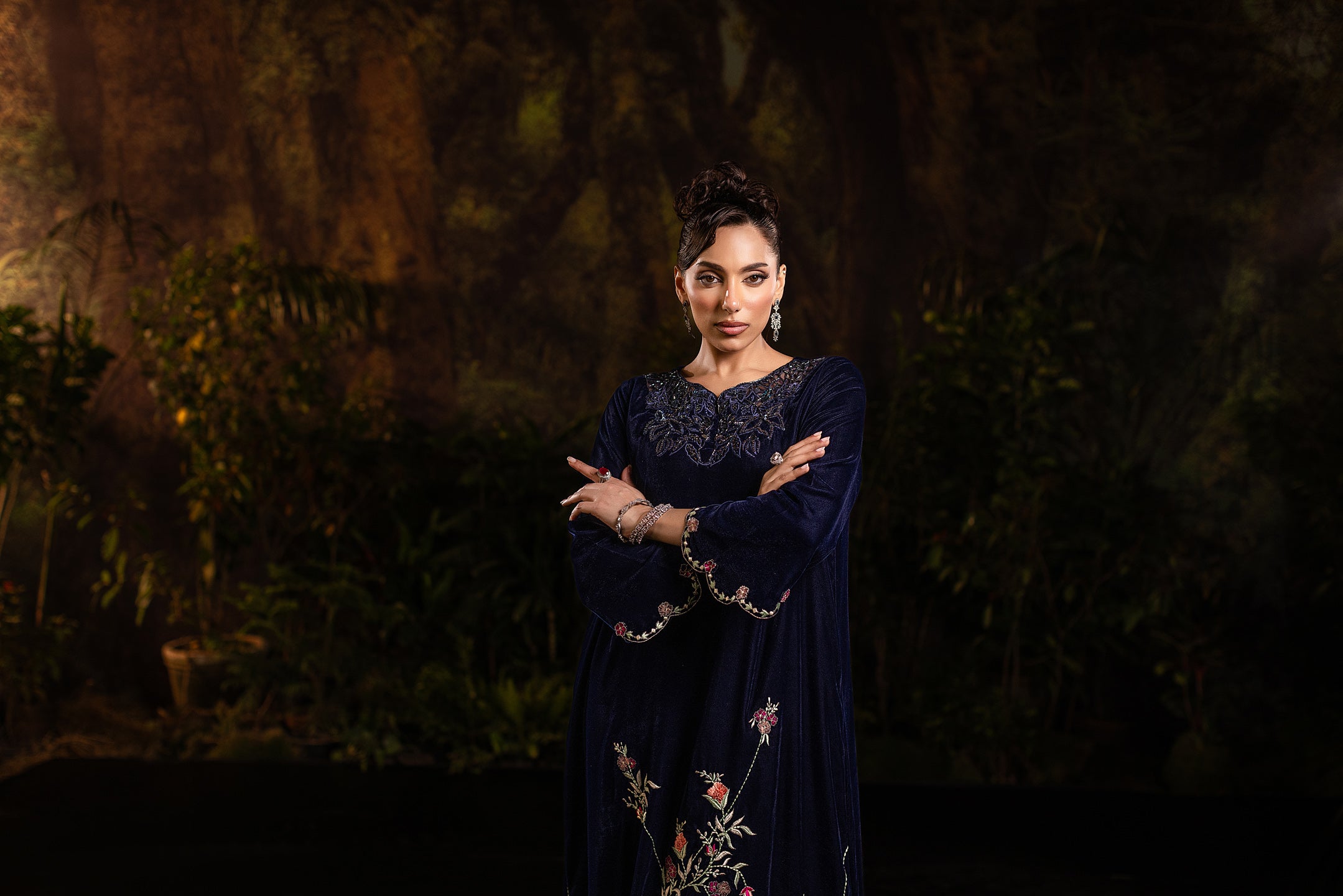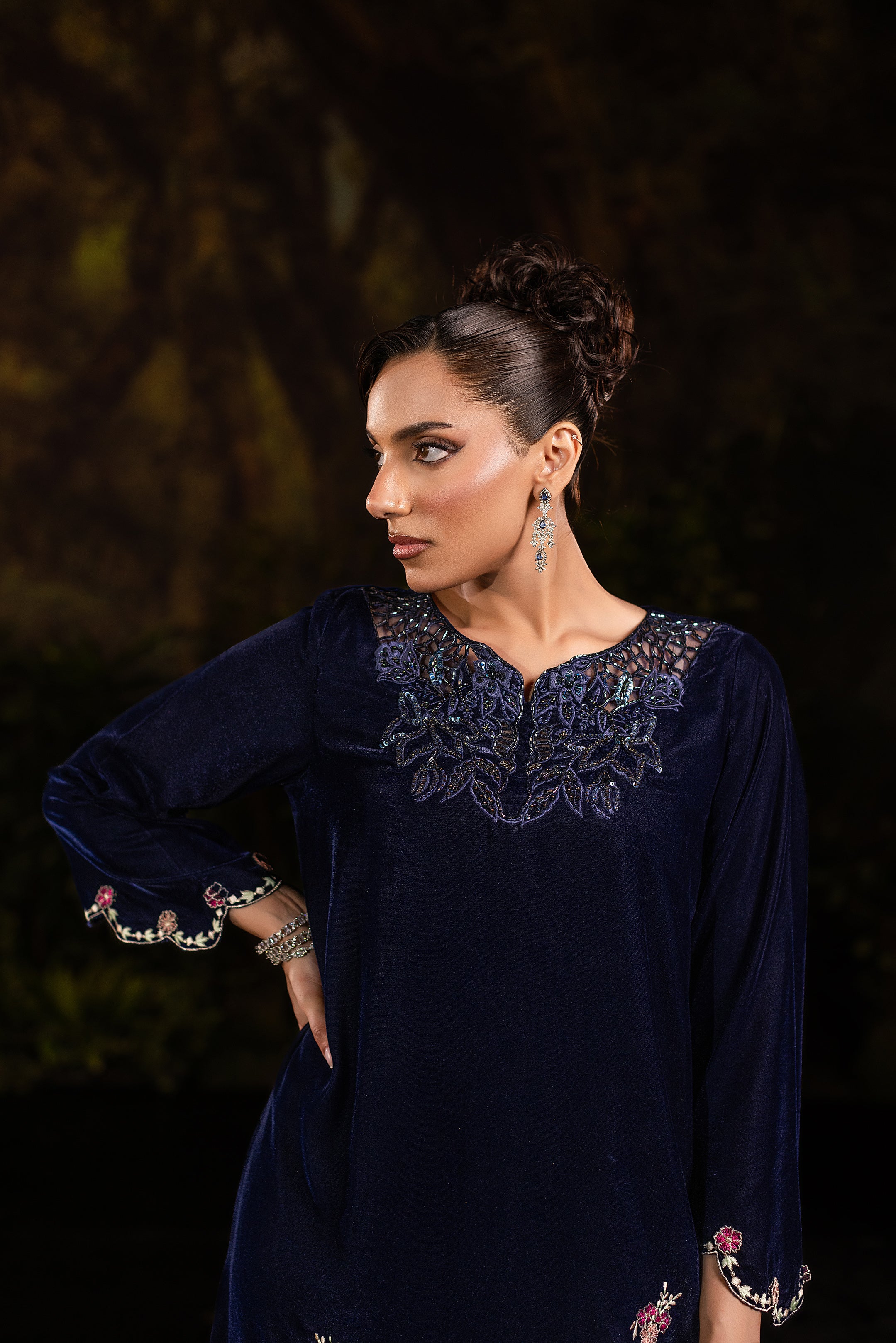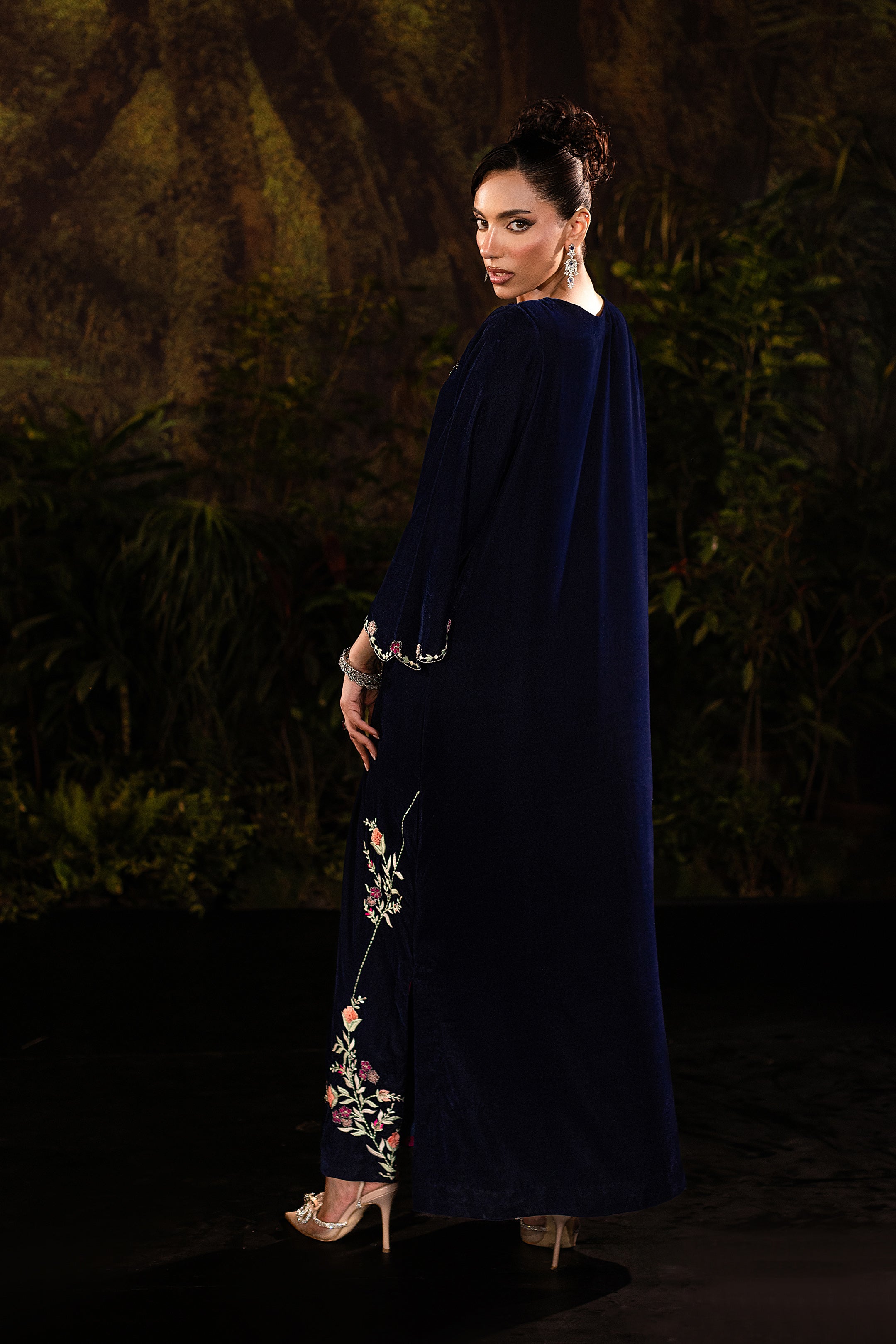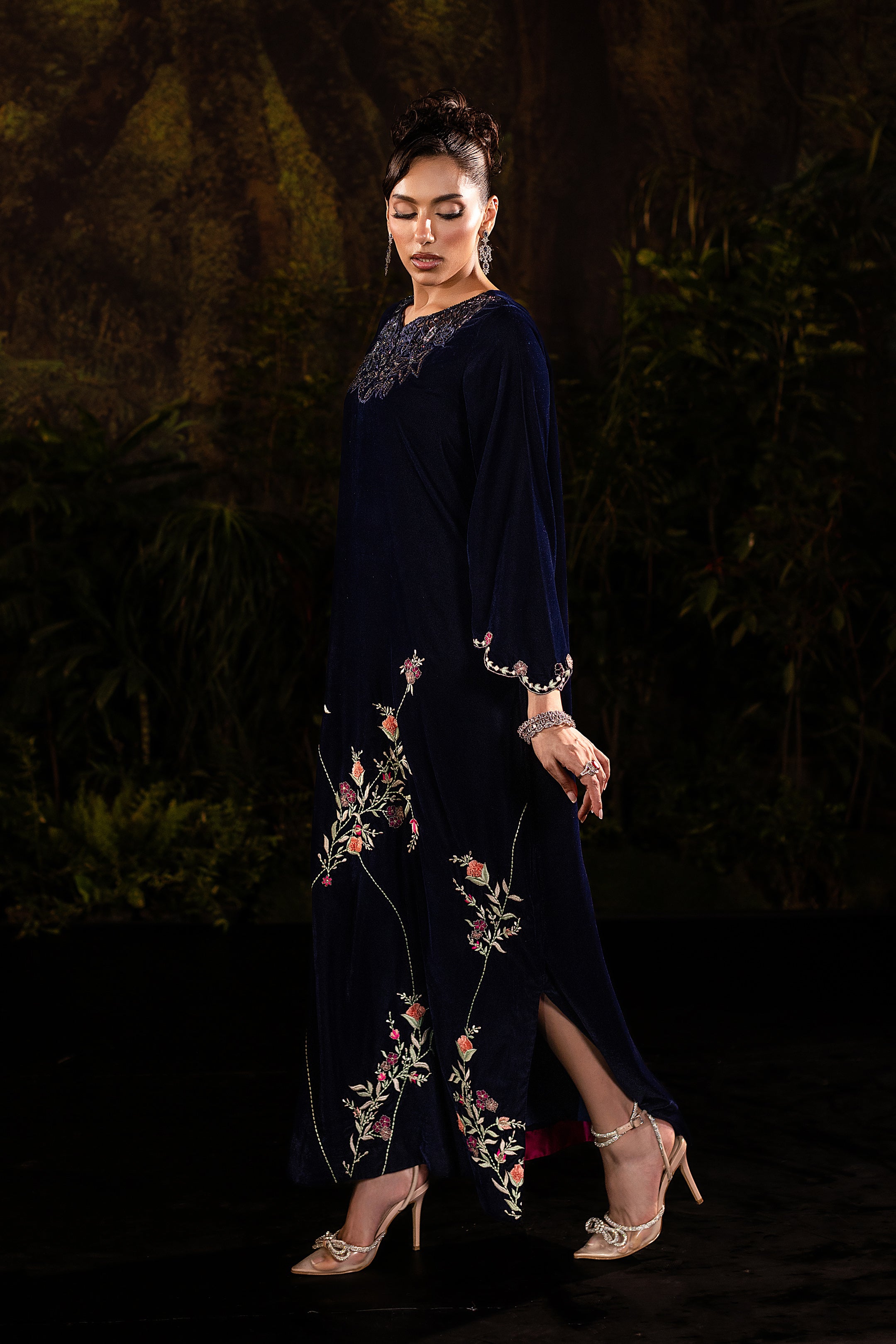 This navy blue velvet long gown captures timeless elegance with a modern touch. The soft velvet fabric drapes luxuriously, giving it a regal yet graceful flow. Intricate cutwork embellishment at the neckline adds a hint of sparkle, while delicate floral embroidery along the hemline creates a romantic contrast against the serene blue. With its full-length silhouette and refined detailing, this gown is perfect for evening soirées or formal occasions where sophistication meets subtle glamour.