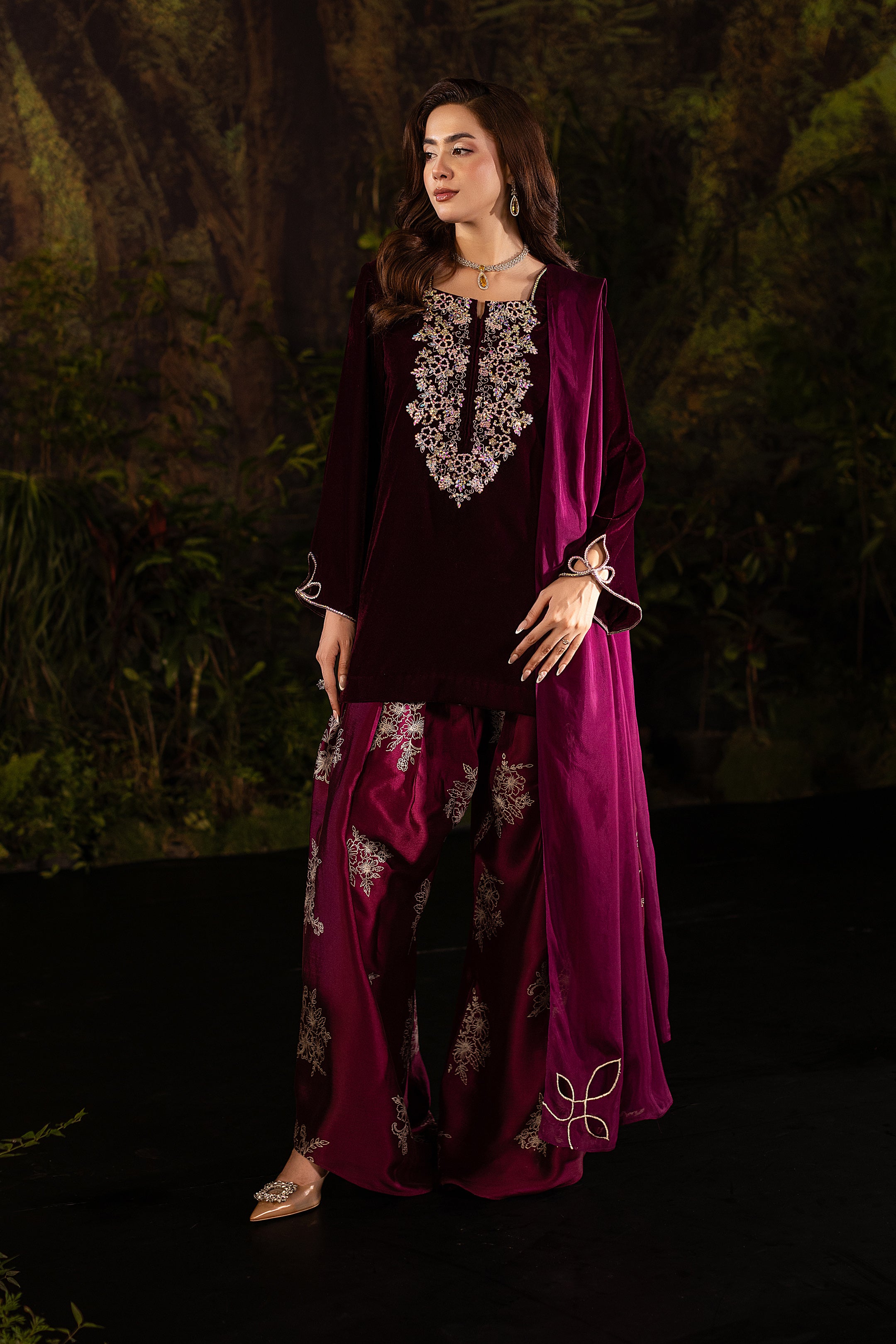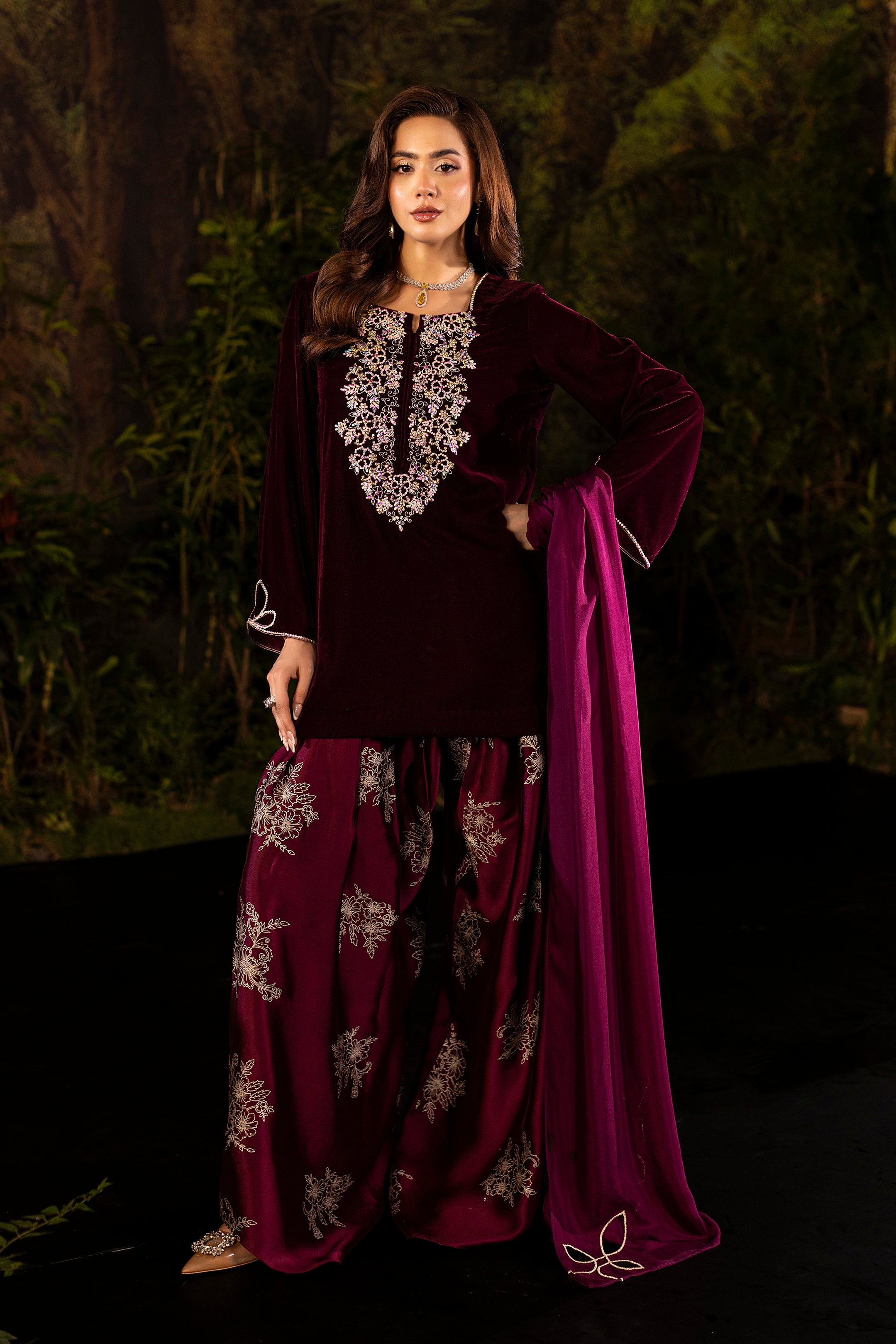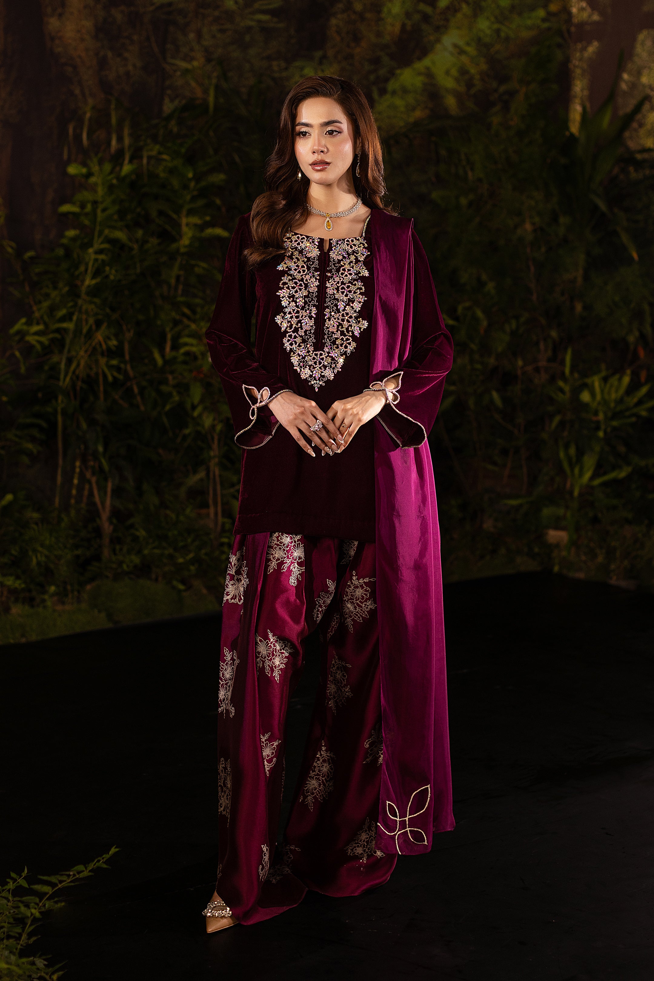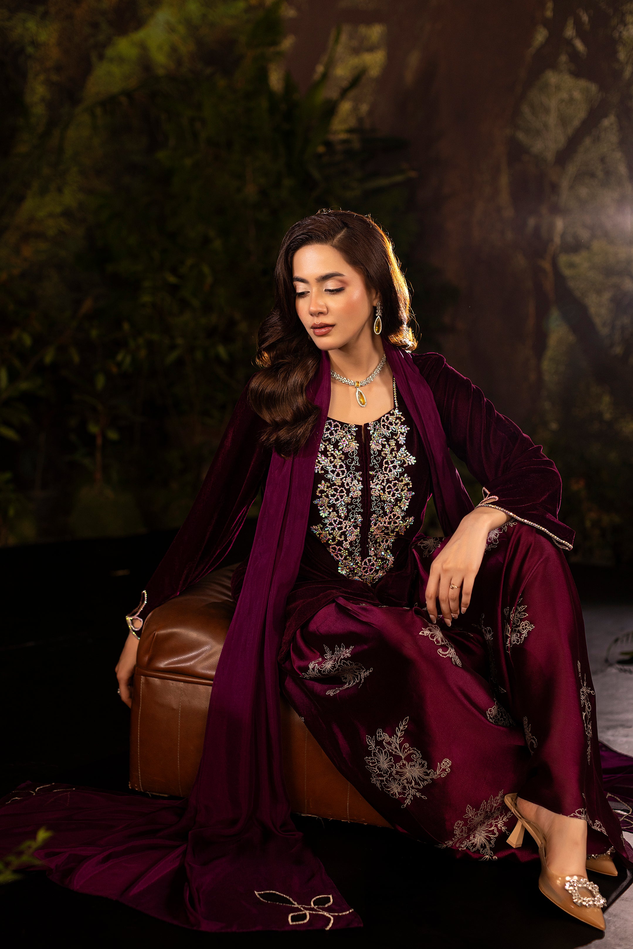 A statement in opulence, this plum velvet ensemble exudes regal charm. The rich velvet base is elevated with a lavish diamanté-embellished neckline, intricately crafted into floral vines that cascade down the bodice with luminous precision. The three-quarter sleeves are finished with delicate cut-out detailing edged in crystals, adding a contemporary twist to its classic silhouette. Effortlessly balancing tradition and modern glamour, this outfit is perfect for evening gatherings where elegance must shine with subtle sparkle.