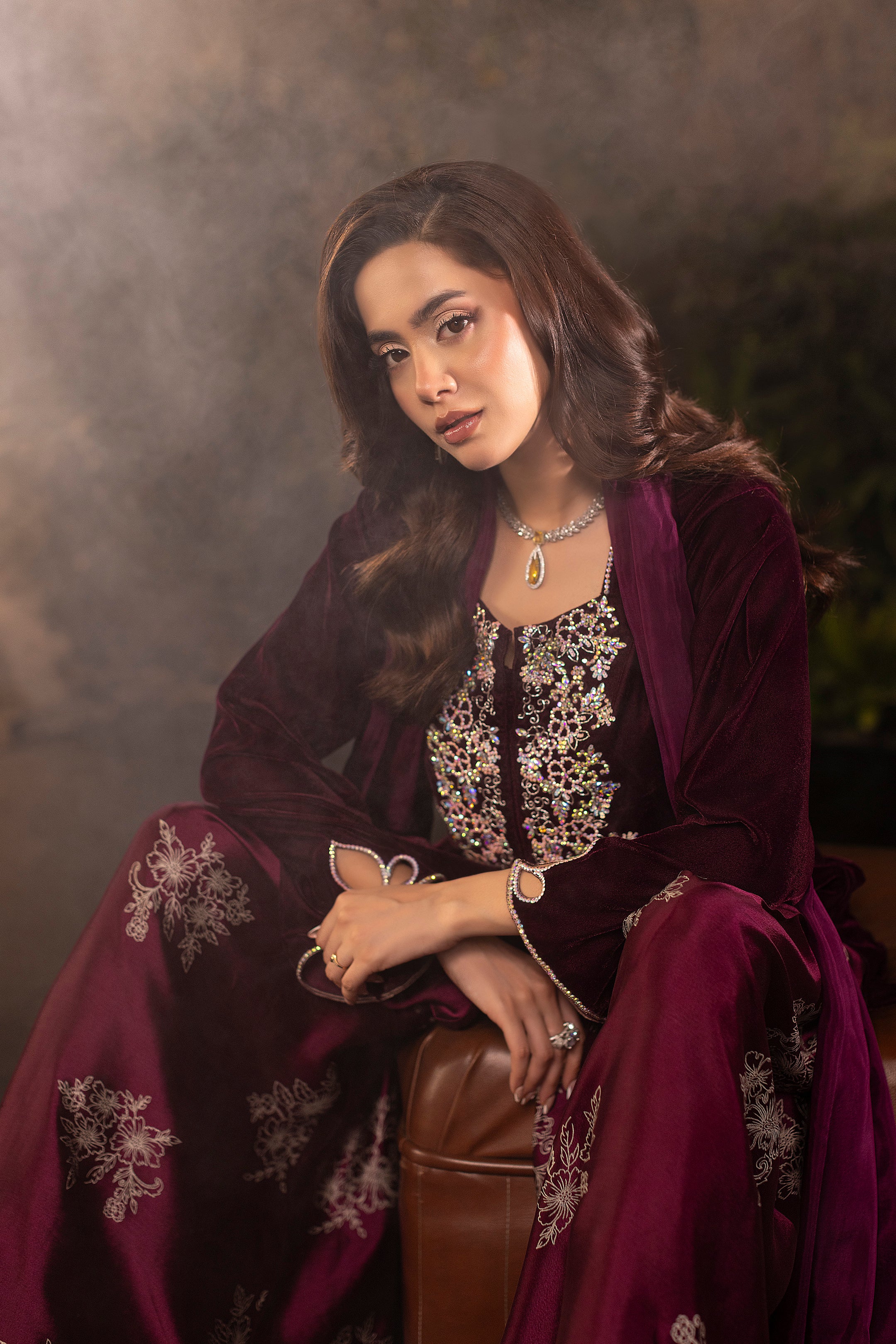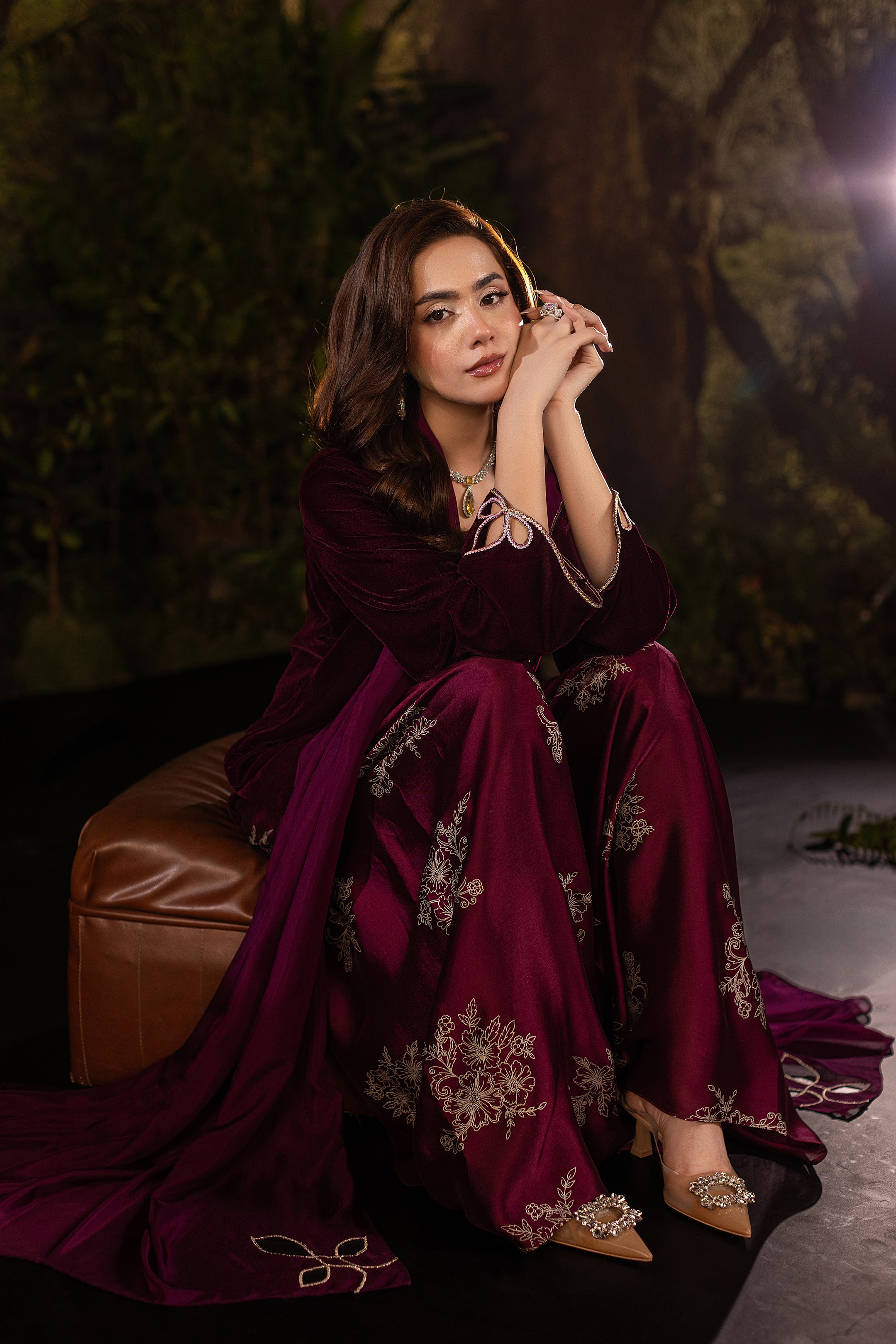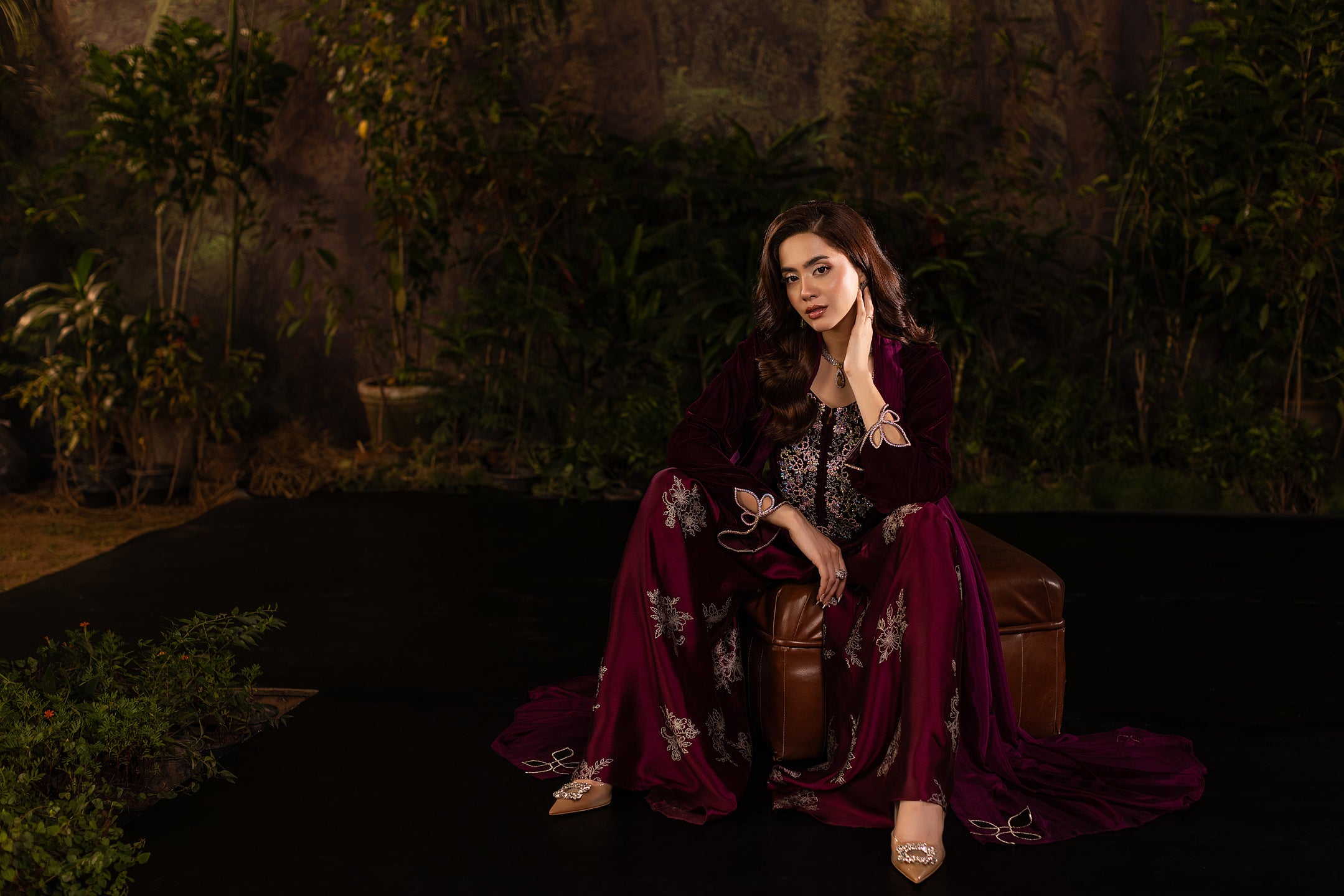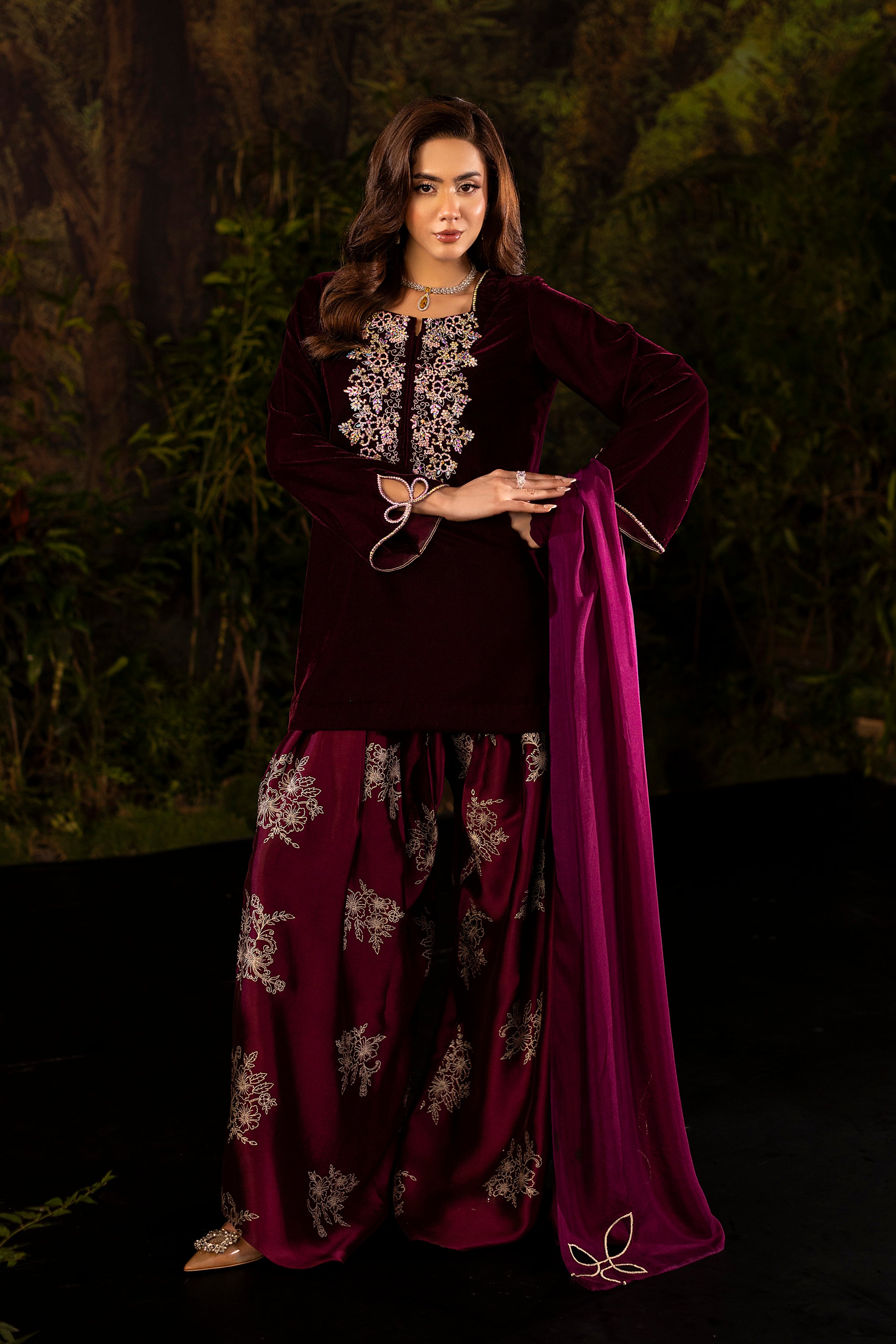 A statement in opulence, this plum velvet ensemble exudes regal charm. The rich velvet base is elevated with a lavish diamanté-embellished neckline, intricately crafted into floral vines that cascade down the bodice with luminous precision. The three-quarter sleeves are finished with delicate cut-out detailing edged in crystals, adding a contemporary twist to its classic silhouette. Effortlessly balancing tradition and modern glamour, this outfit is perfect for evening gatherings where elegance must shine with subtle sparkle.