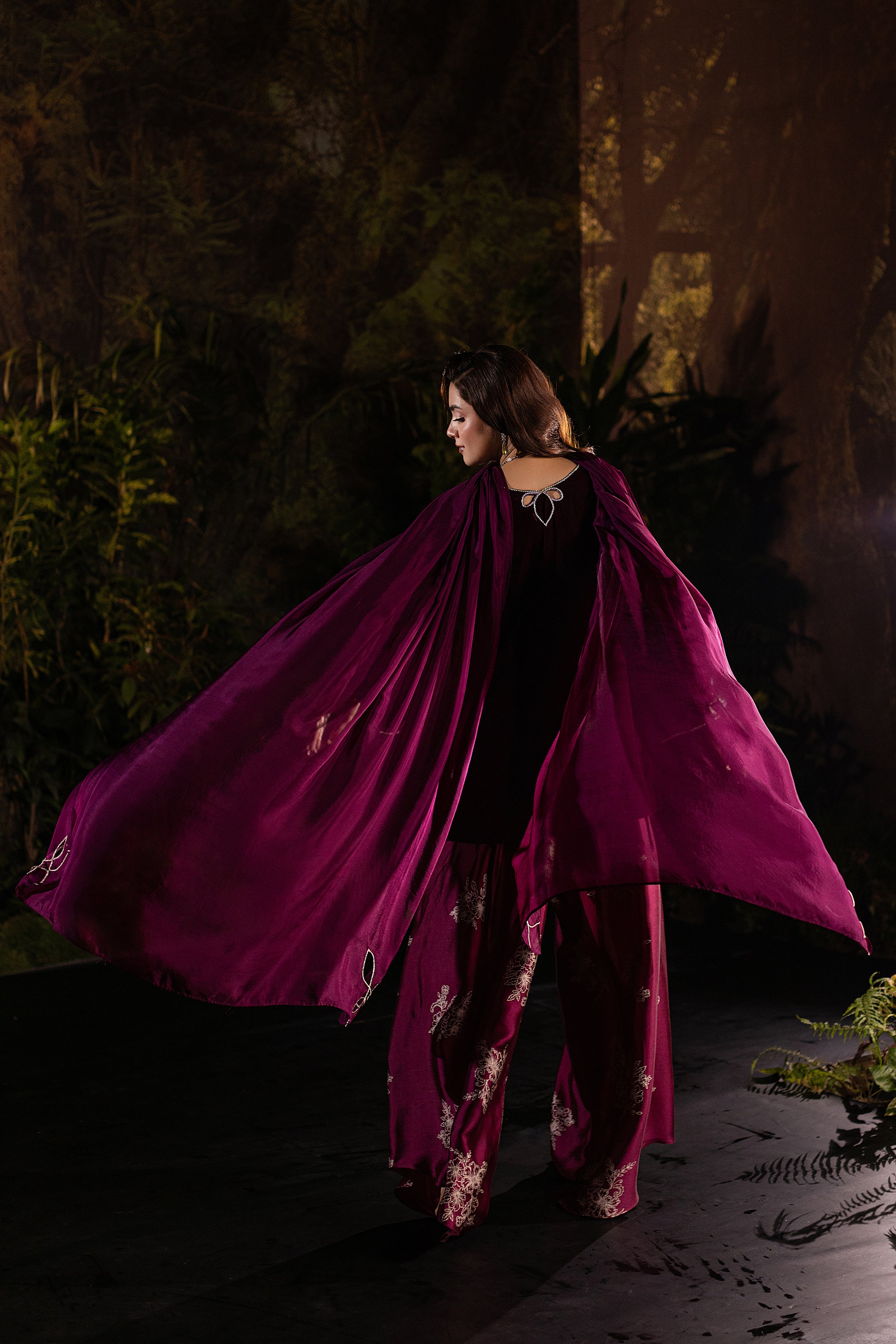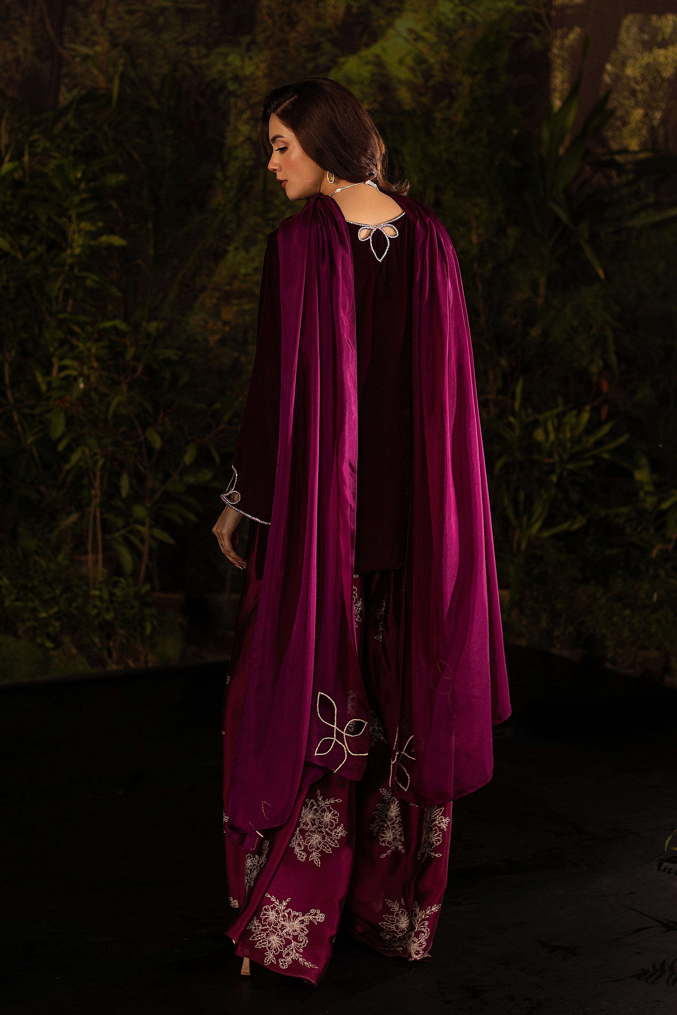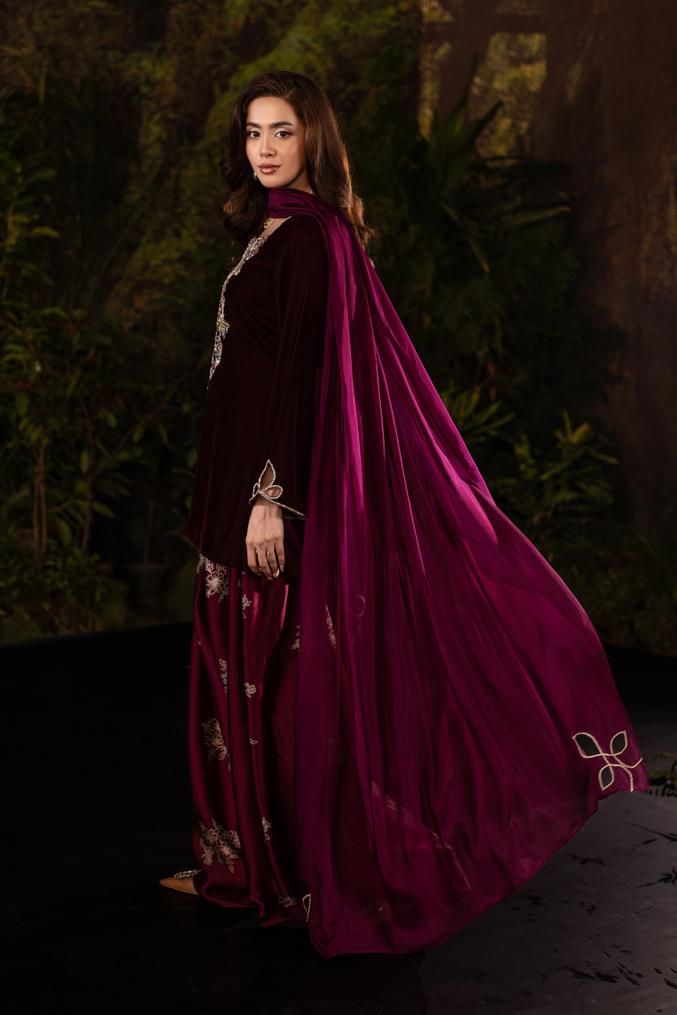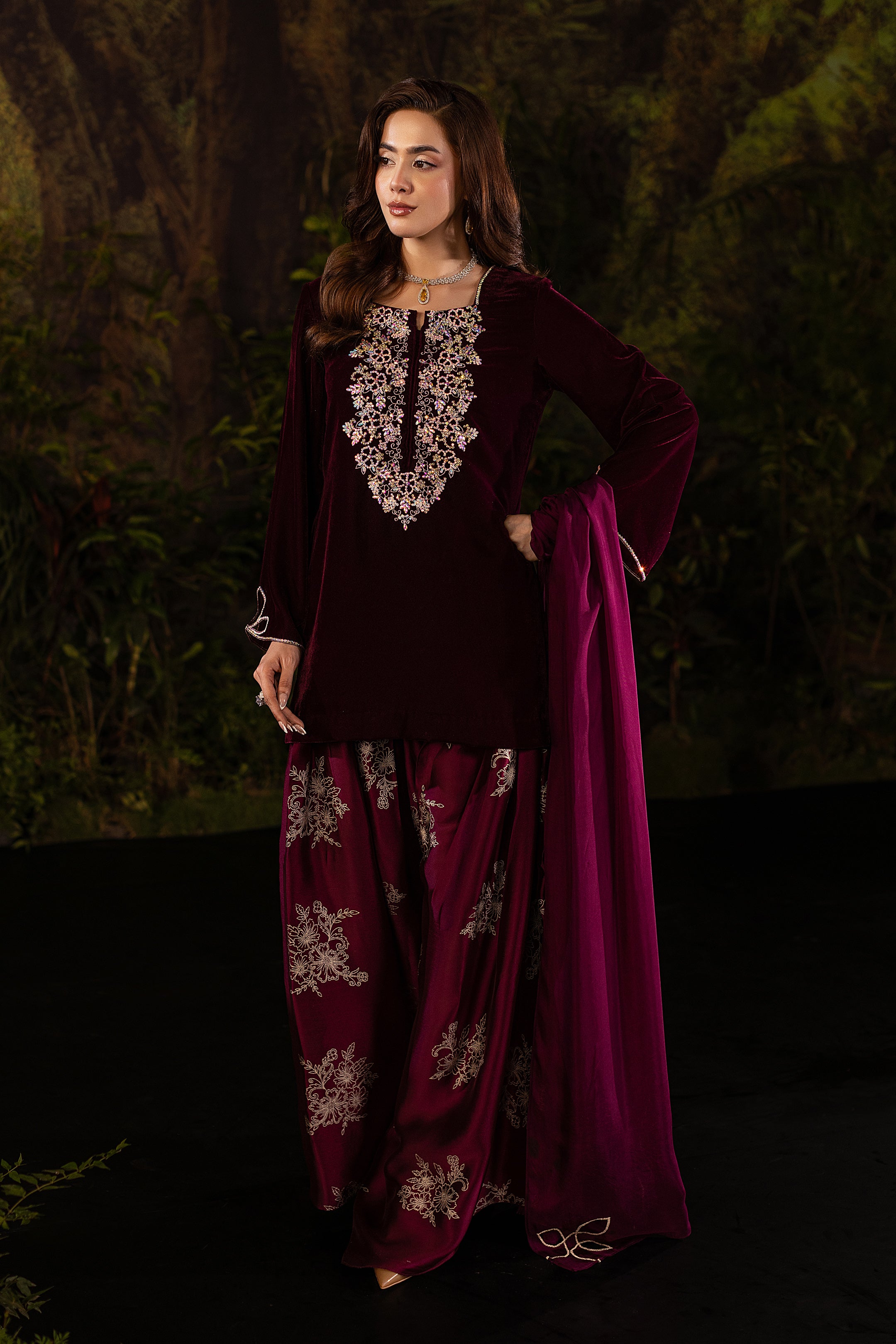 A statement in opulence, this plum velvet ensemble exudes regal charm. The rich velvet base is elevated with a lavish diamanté-embellished neckline, intricately crafted into floral vines that cascade down the bodice with luminous precision. The three-quarter sleeves are finished with delicate cut-out detailing edged in crystals, adding a contemporary twist to its classic silhouette. Effortlessly balancing tradition and modern glamour, this outfit is perfect for evening gatherings where elegance must shine with subtle sparkle.