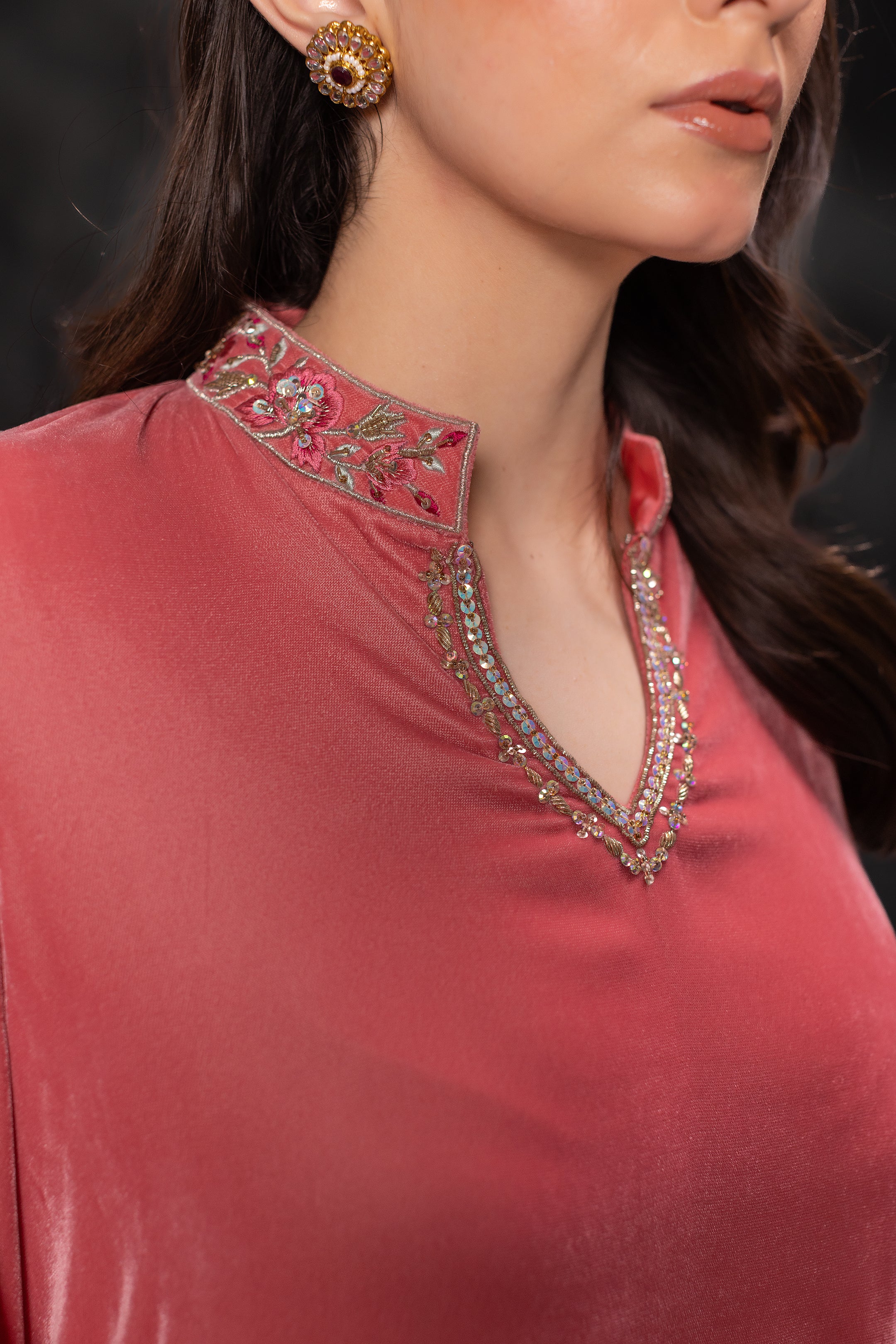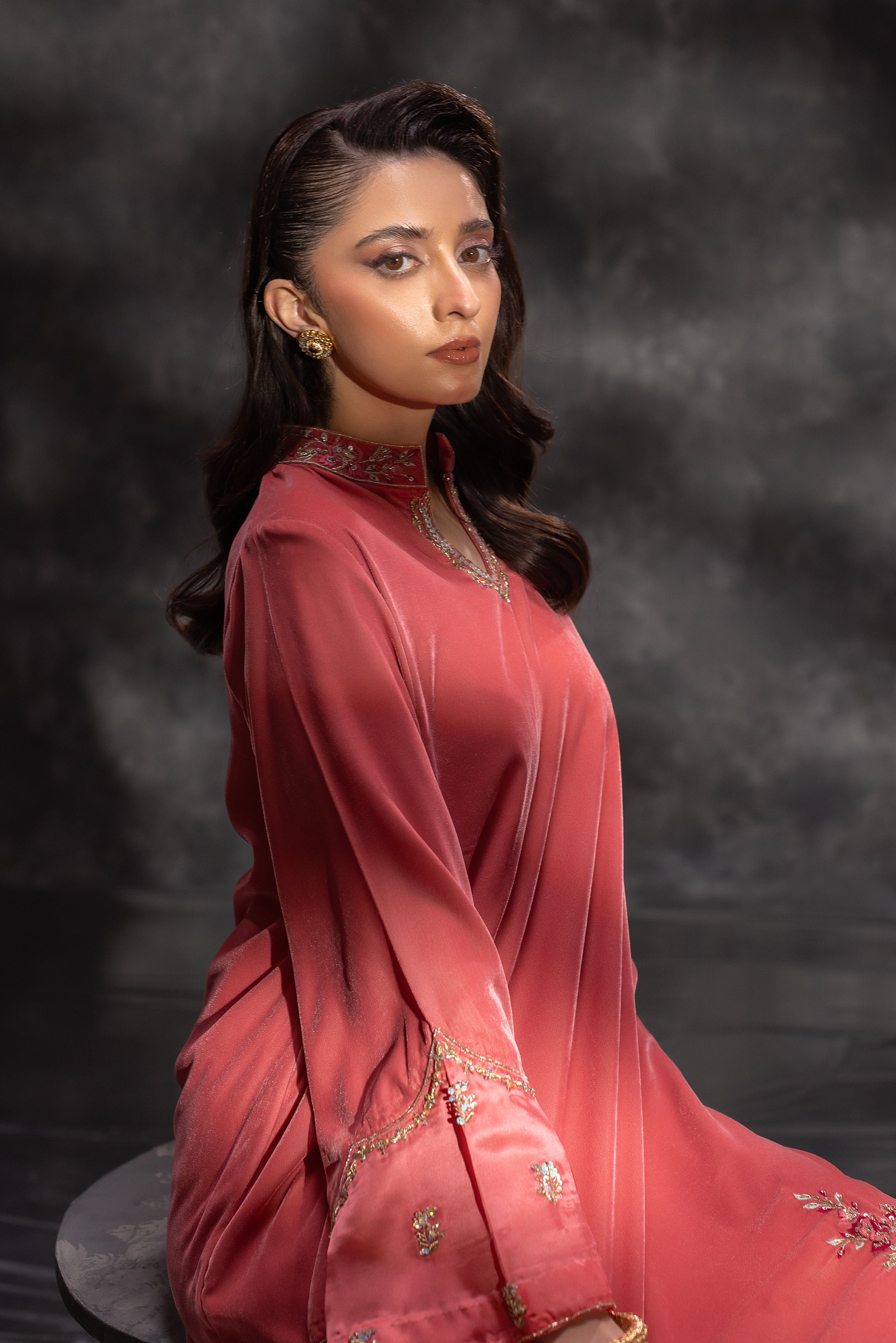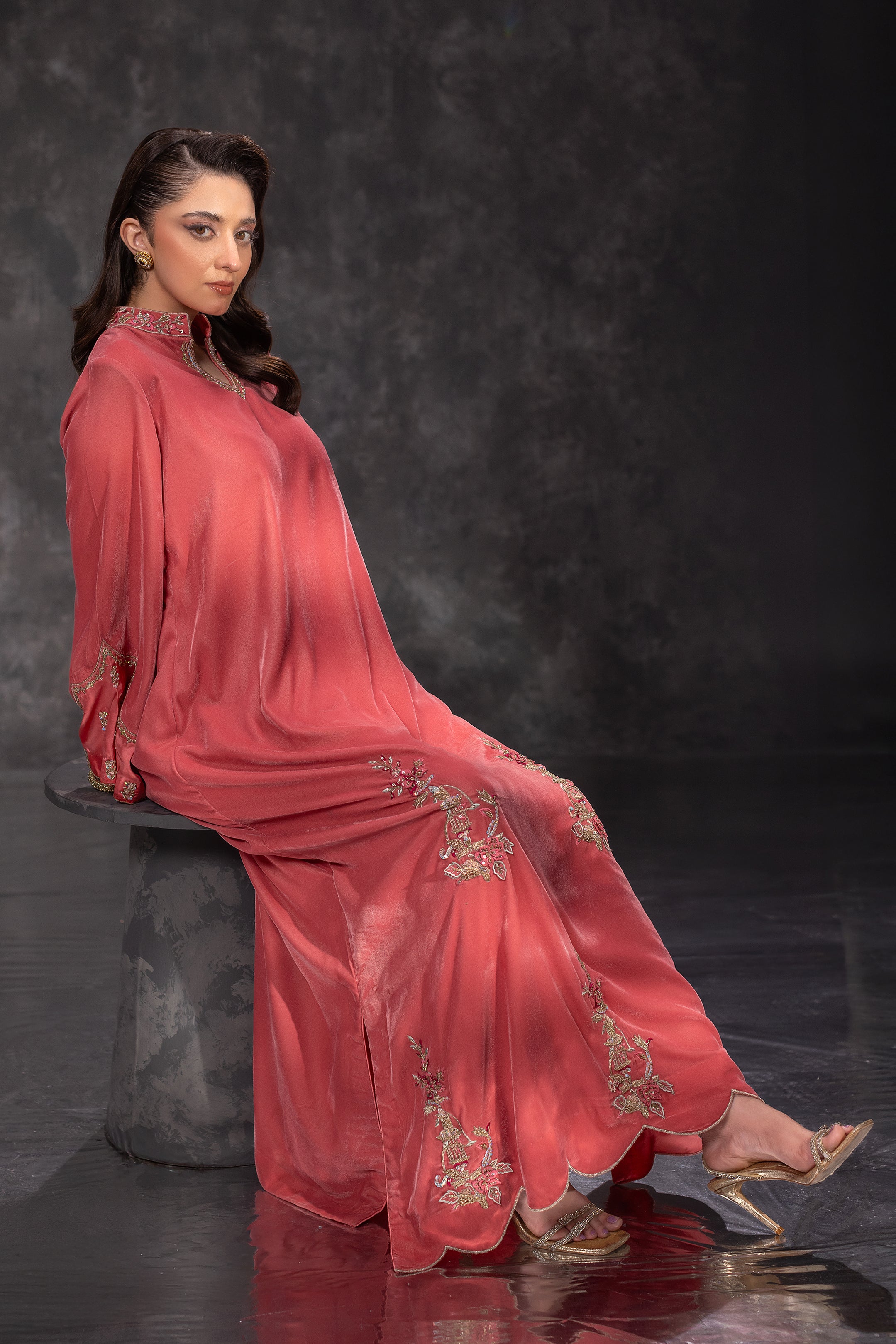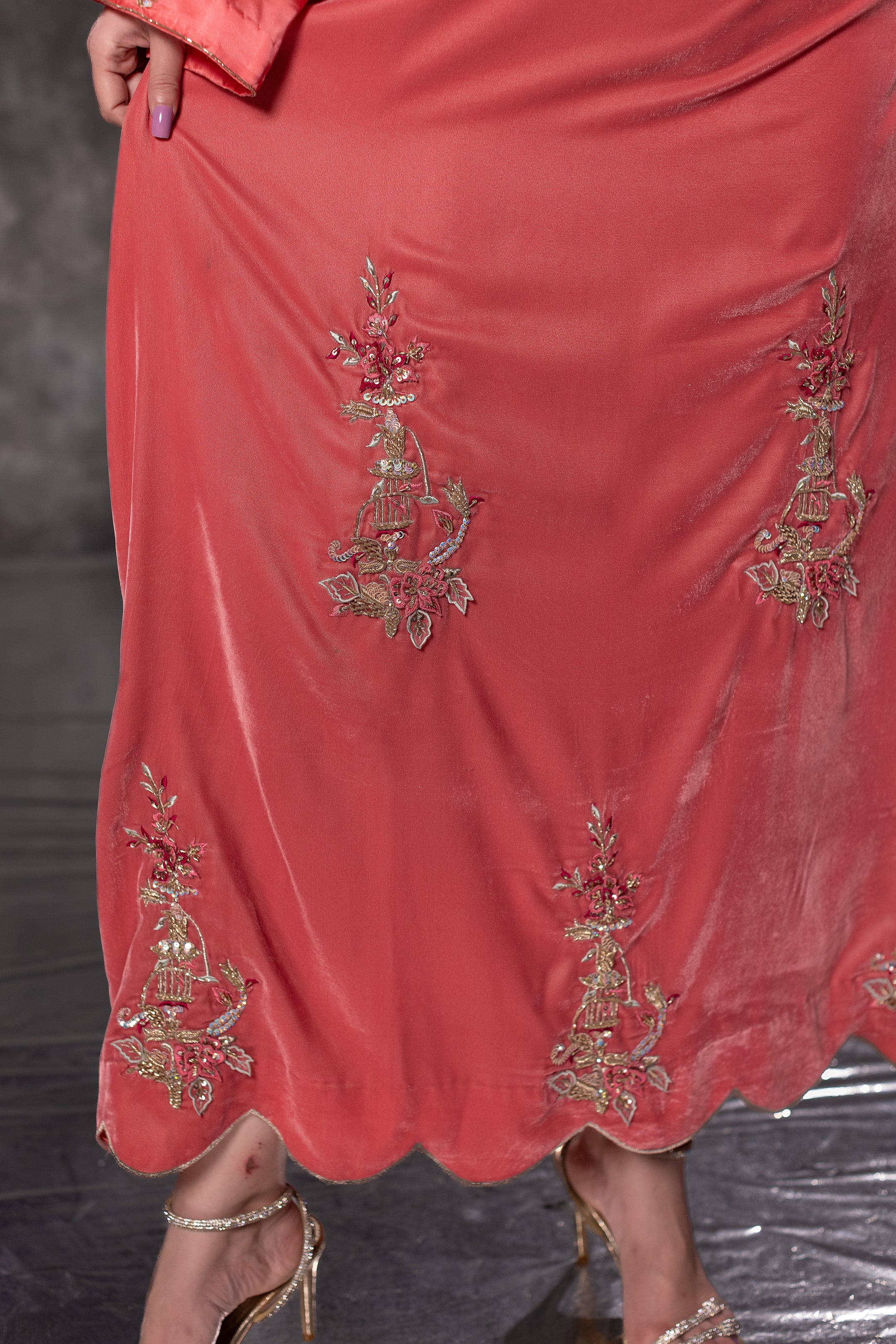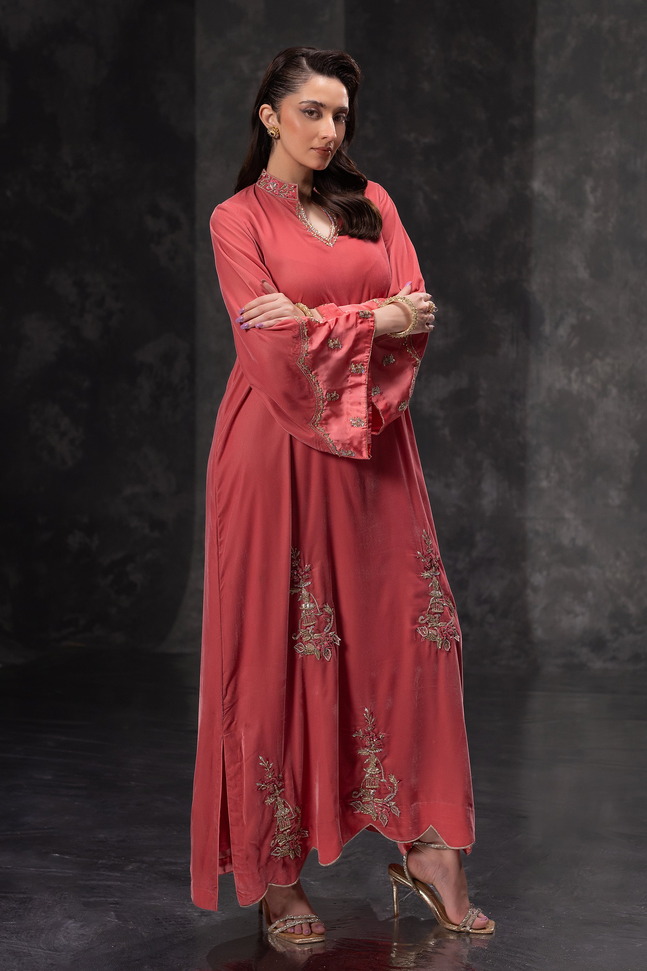 Designed in a soft blush-coral velvet, the outfit drapes elegantly in a floor-length A-line silhouette. Elyra is an effortlessly elongated form. The high neckline with an embellished collar and teardrop keyhole cutout adds a touch of refined glamour, balancing modesty with modern sophistication. The voluminous bell sleeves feature hand-embellished cuffs, catching the light with subtle shimmer, while the delicate embroidery along the hemline adds texture and ornate detail without overwhelming the design. The luxurious velvet fabric enhances the outfit’s richness, making it ideal for all festivities.