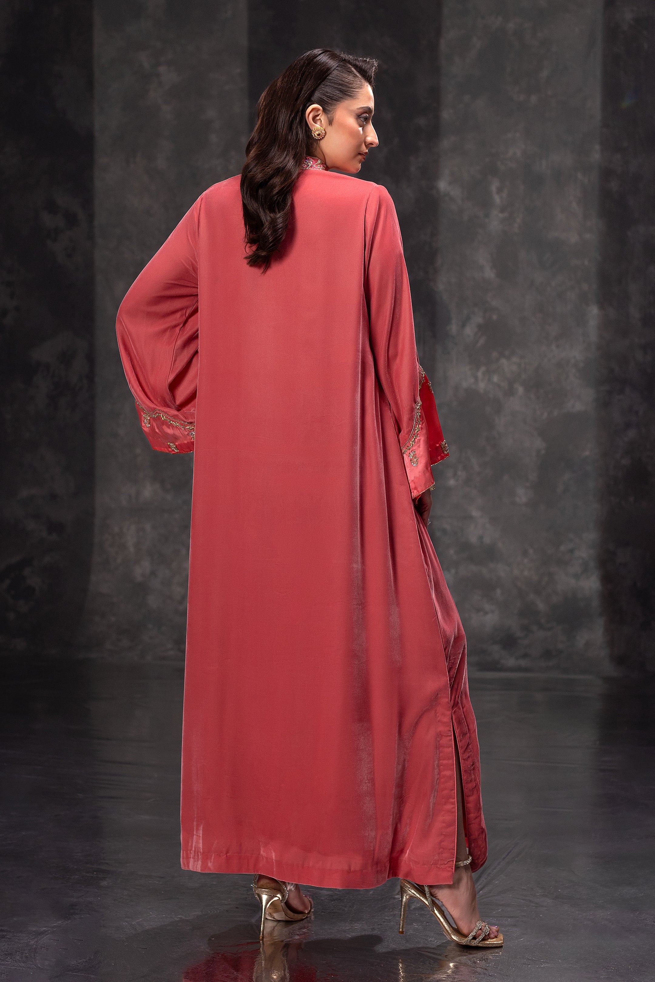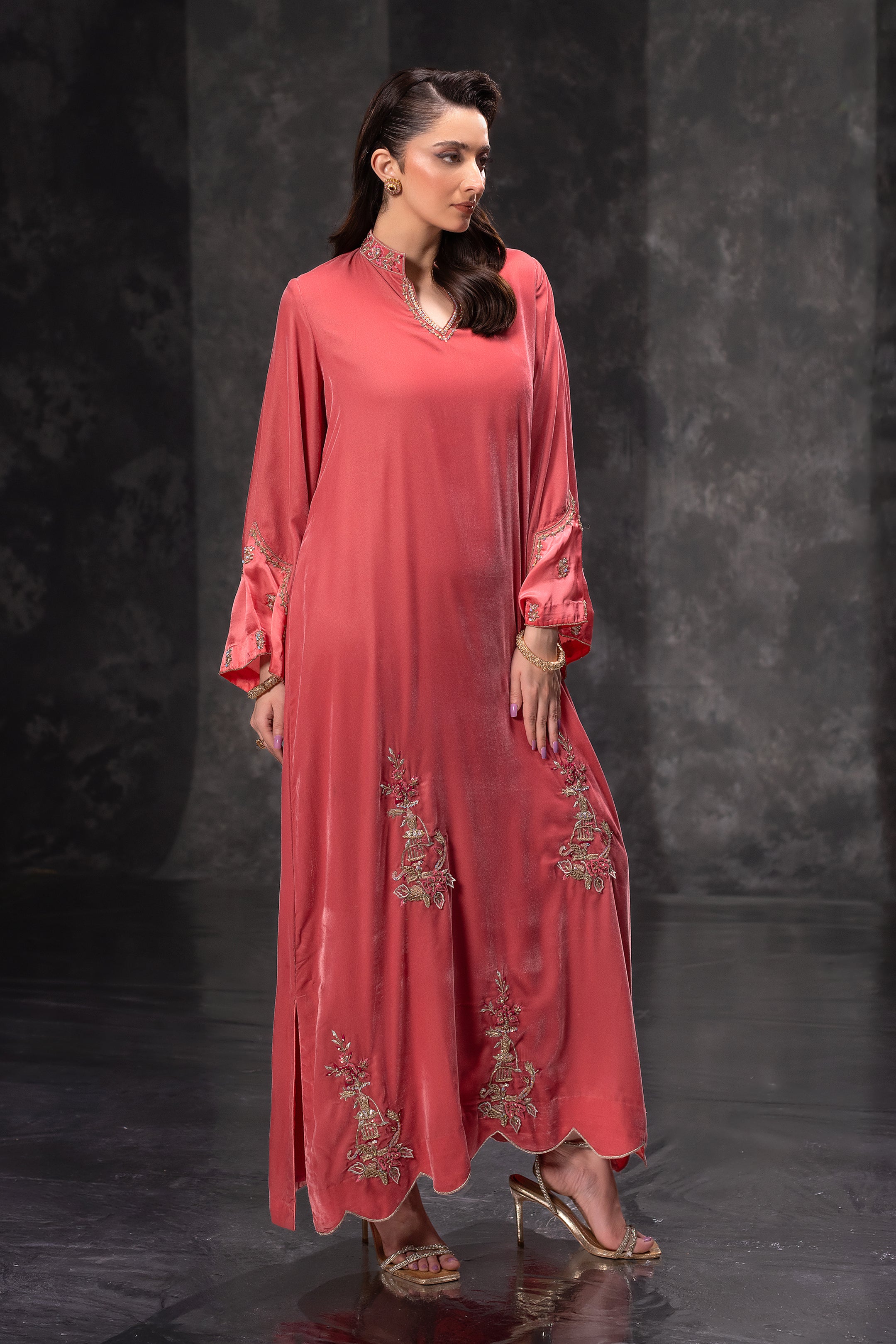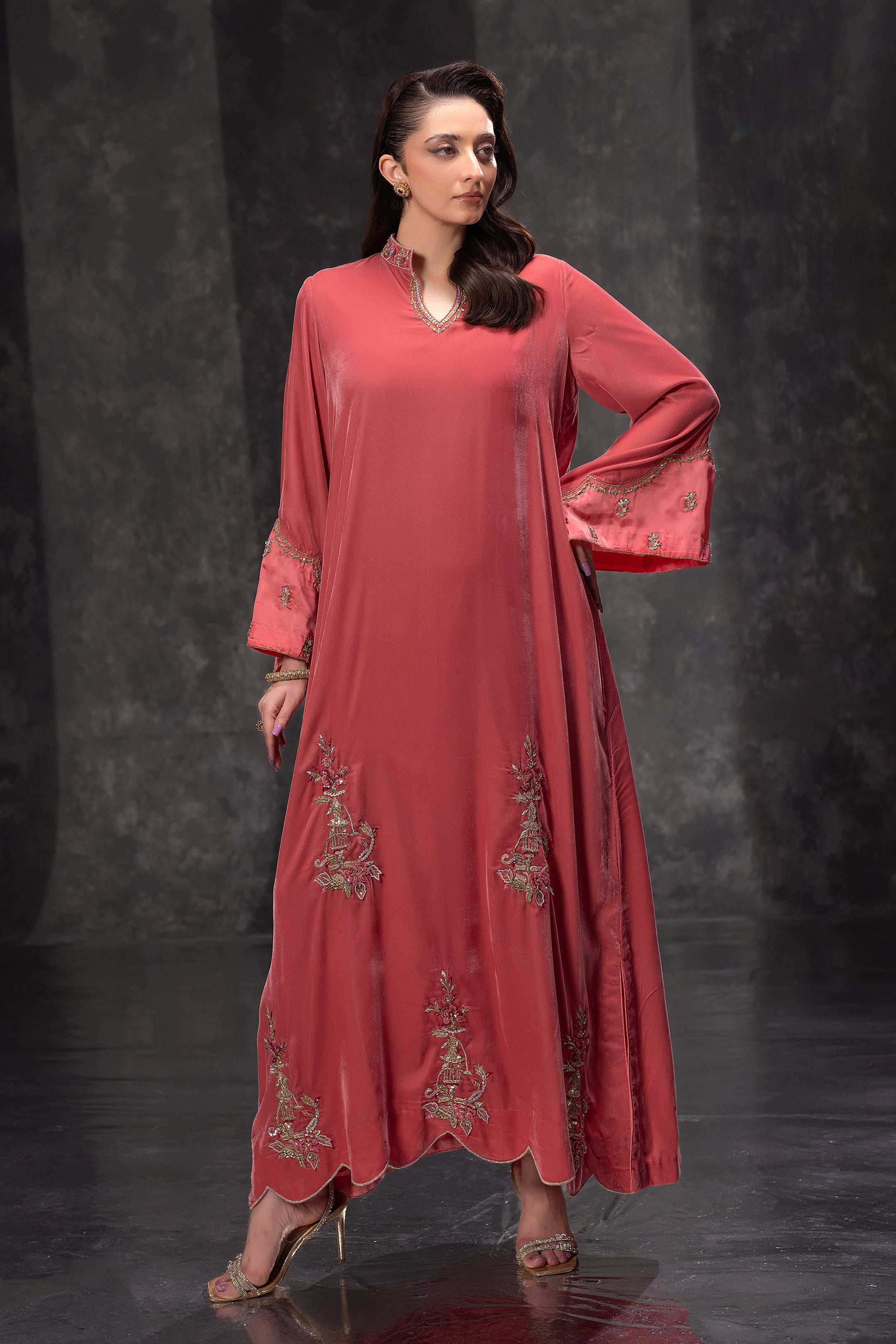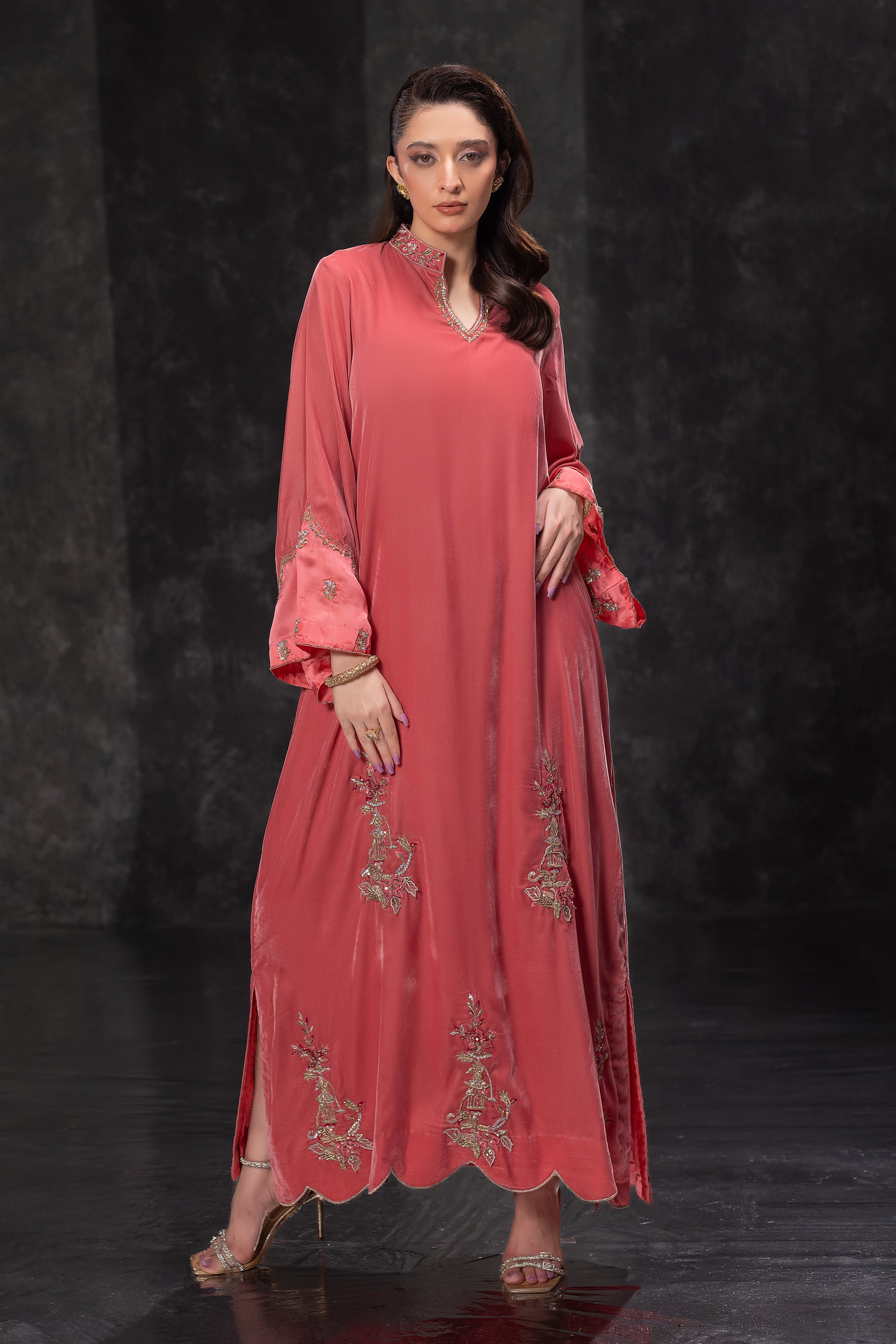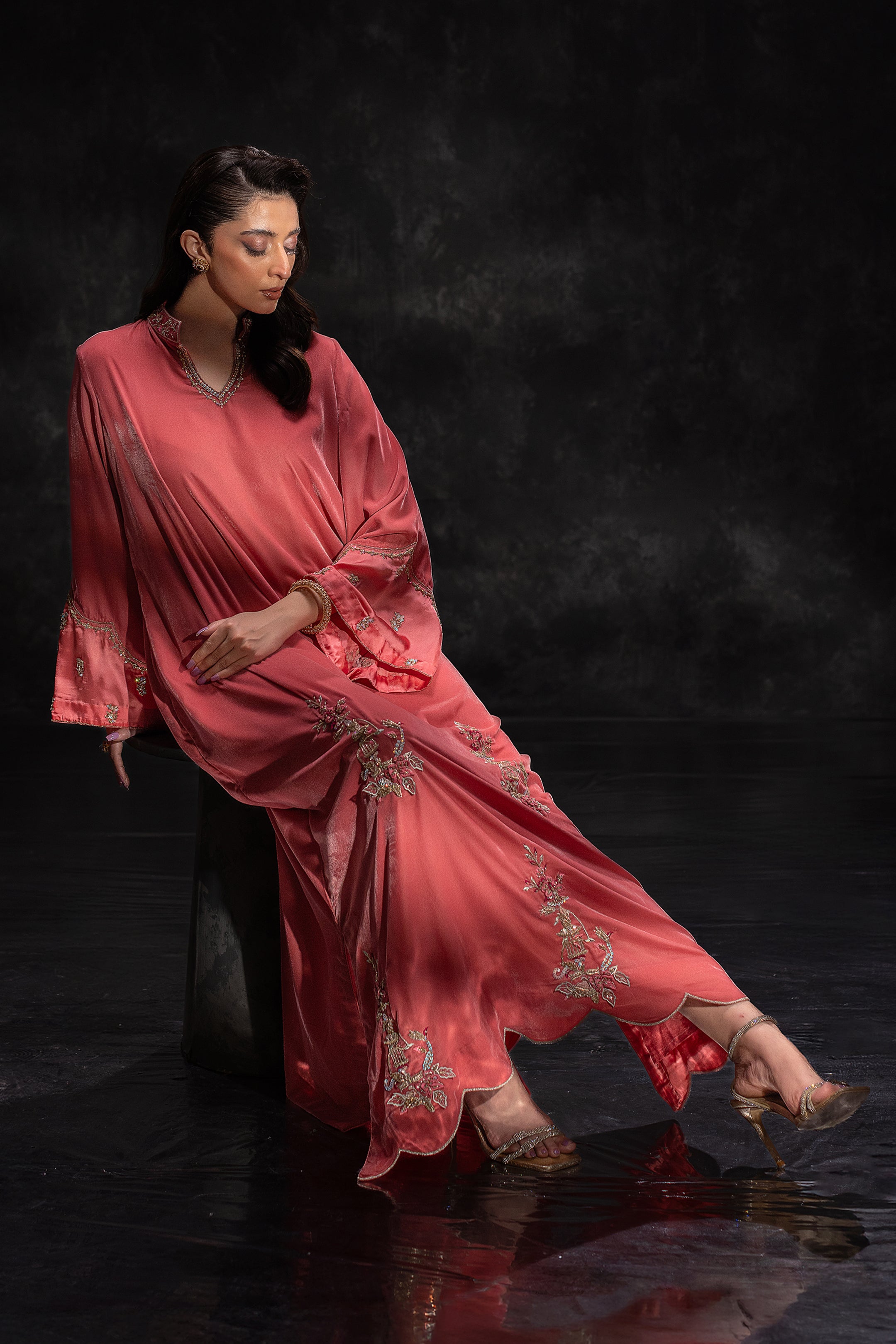 Designed in a soft blush-coral velvet, the outfit drapes elegantly in a floor-length A-line silhouette. Elyra is an effortlessly elongated form. The high neckline with an embellished collar and teardrop keyhole cutout adds a touch of refined glamour, balancing modesty with modern sophistication. The voluminous bell sleeves feature hand-embellished cuffs, catching the light with subtle shimmer, while the delicate embroidery along the hemline adds texture and ornate detail without overwhelming the design. The luxurious velvet fabric enhances the outfit’s richness, making it ideal for all festivities.