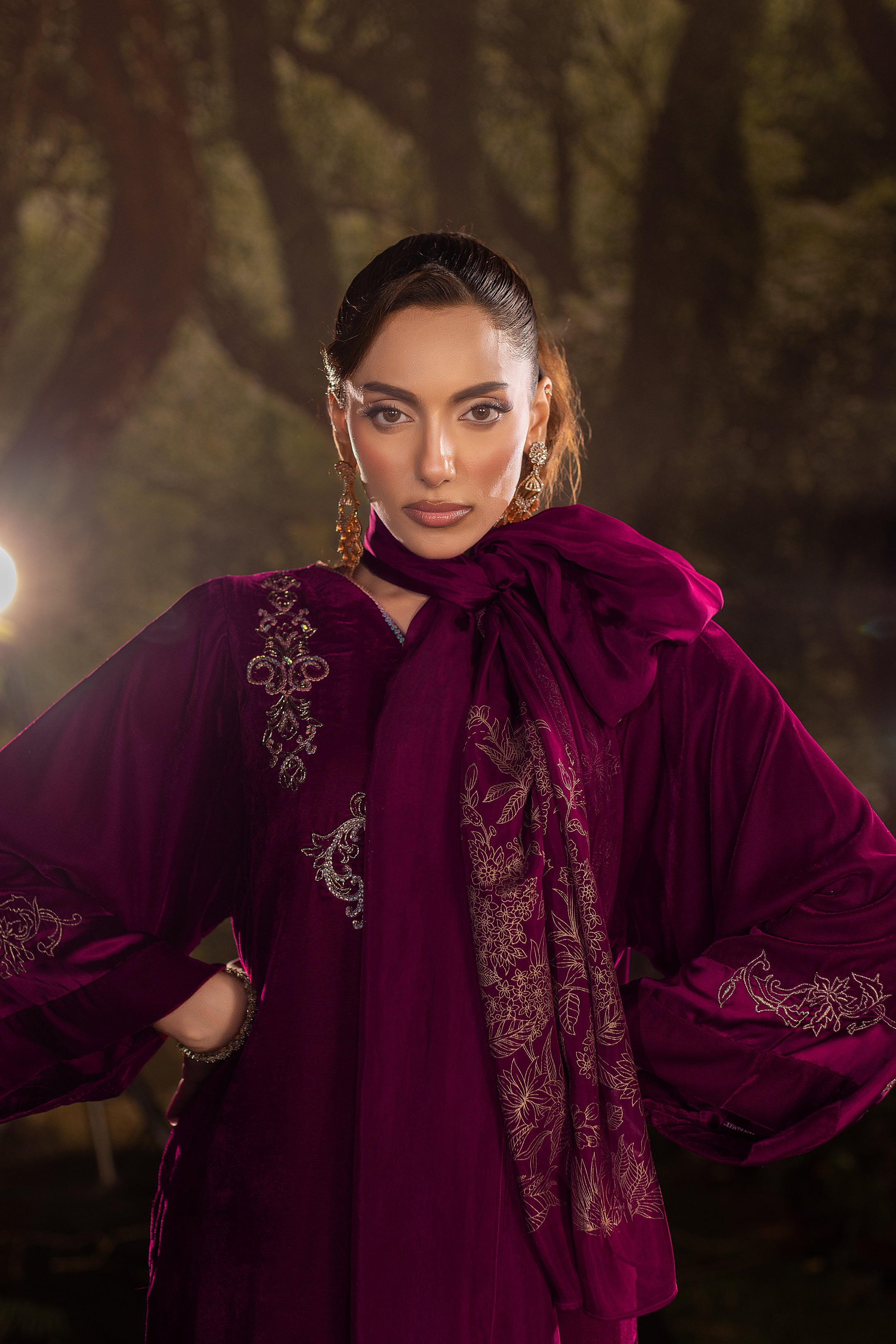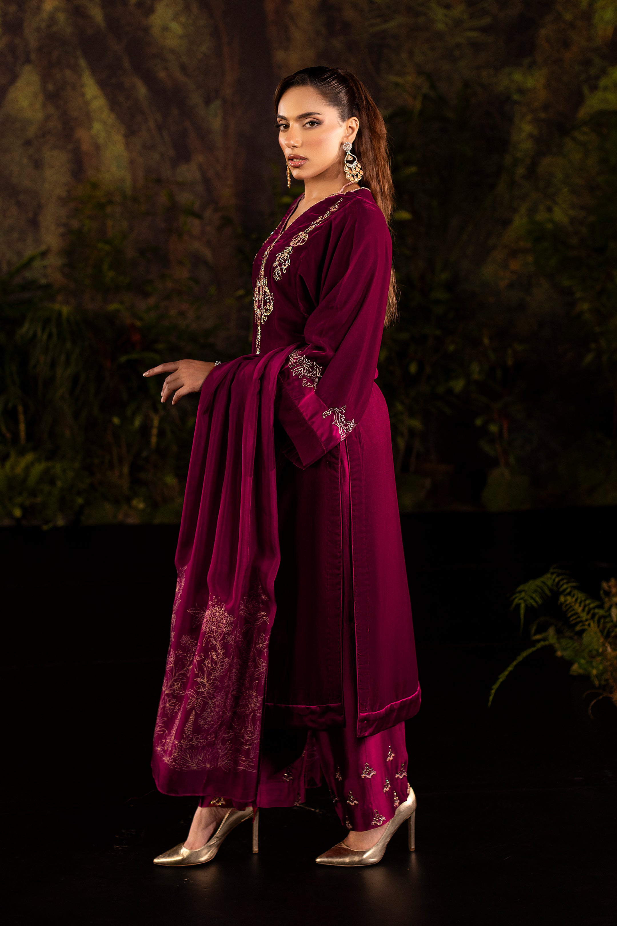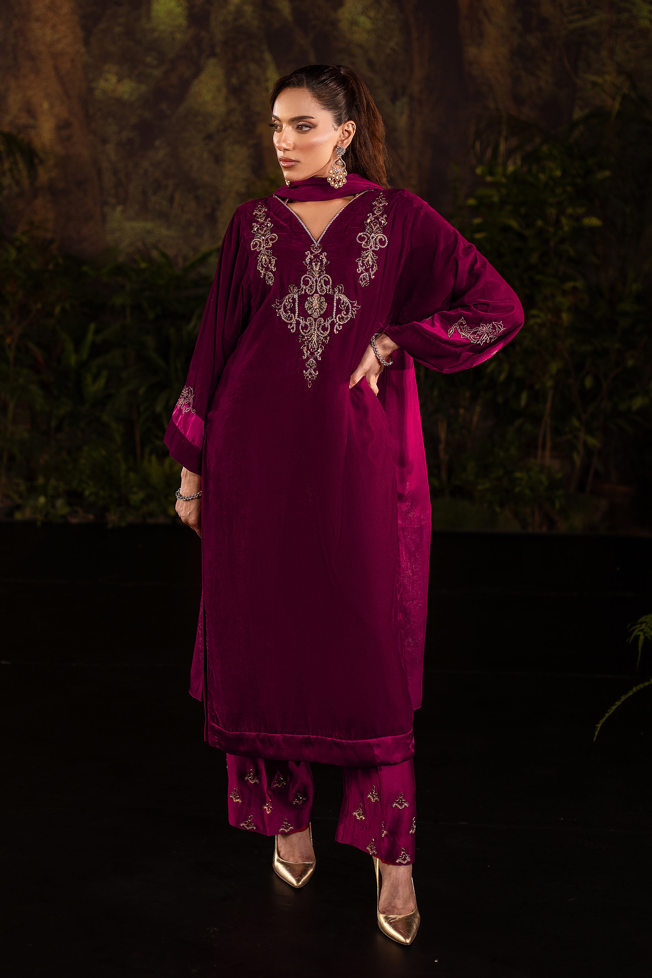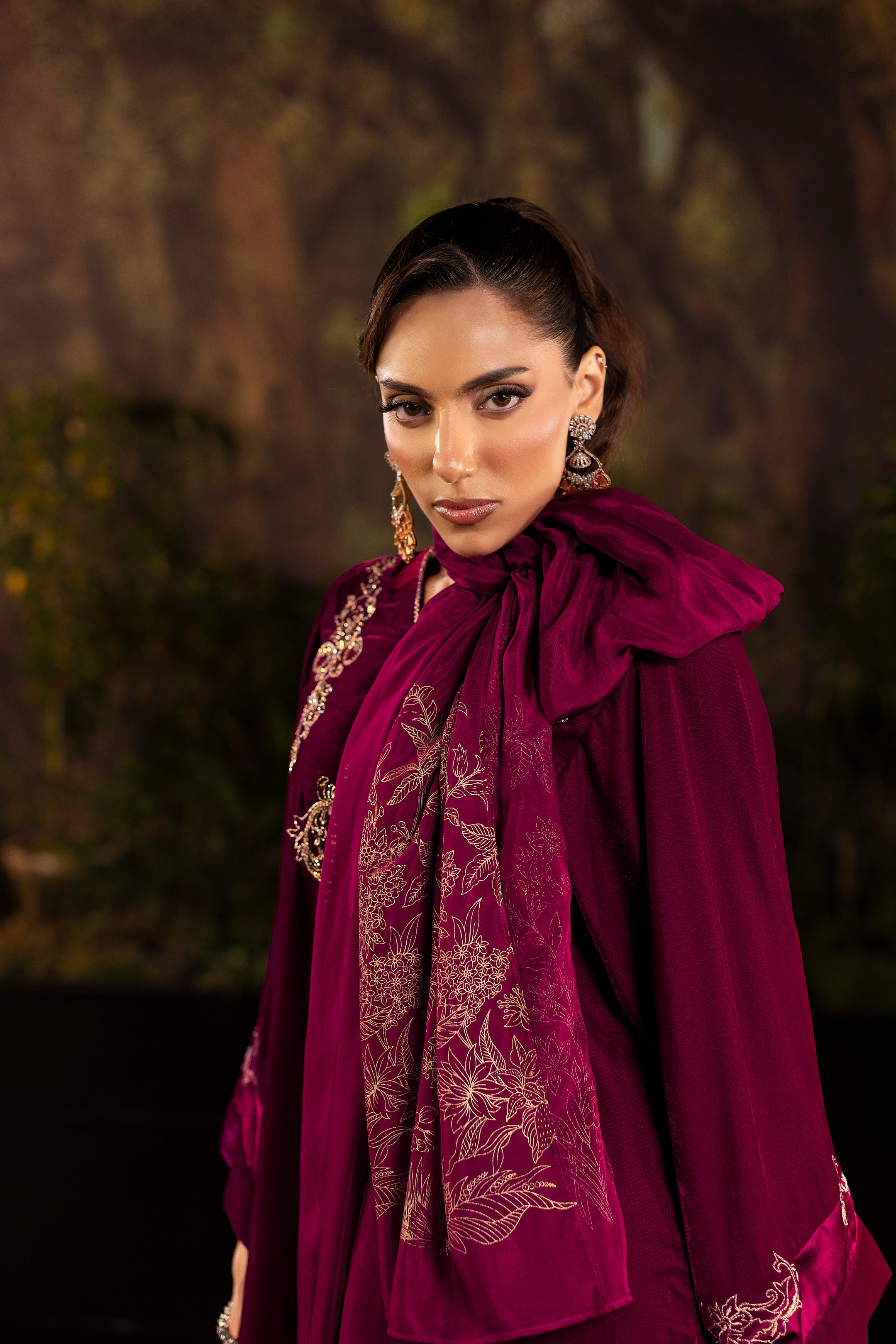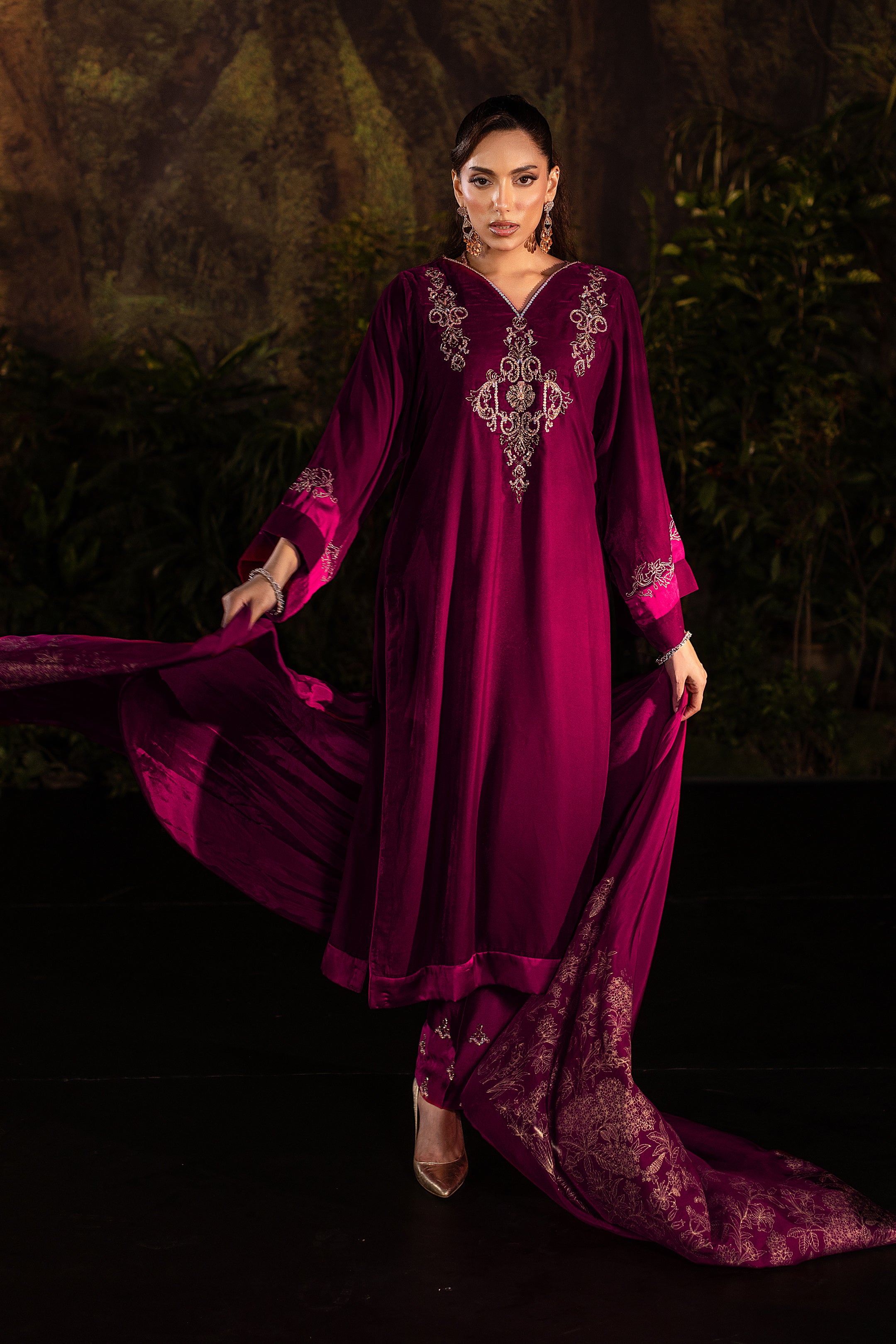A bold statement in jewel tones, this fuchsia velvet ensemble radiates contemporary elegance. The straight-cut velvet kameez is adorned with intricate embroidery across the neckline and sleeves, drawing the eye with its delicate yet striking detail. Paired with matching trousers, finished with fine embroidery that adds depth and continuity to the look, the outfit achieves a perfect balance of richness and refinement. A fuchsia silk gold printed dupatta completes the ensemble, adding movement, texture, and a touch of modern artistry to the opulent velvet canvas. Designed for evenings where colour, craft, and confidence converge.