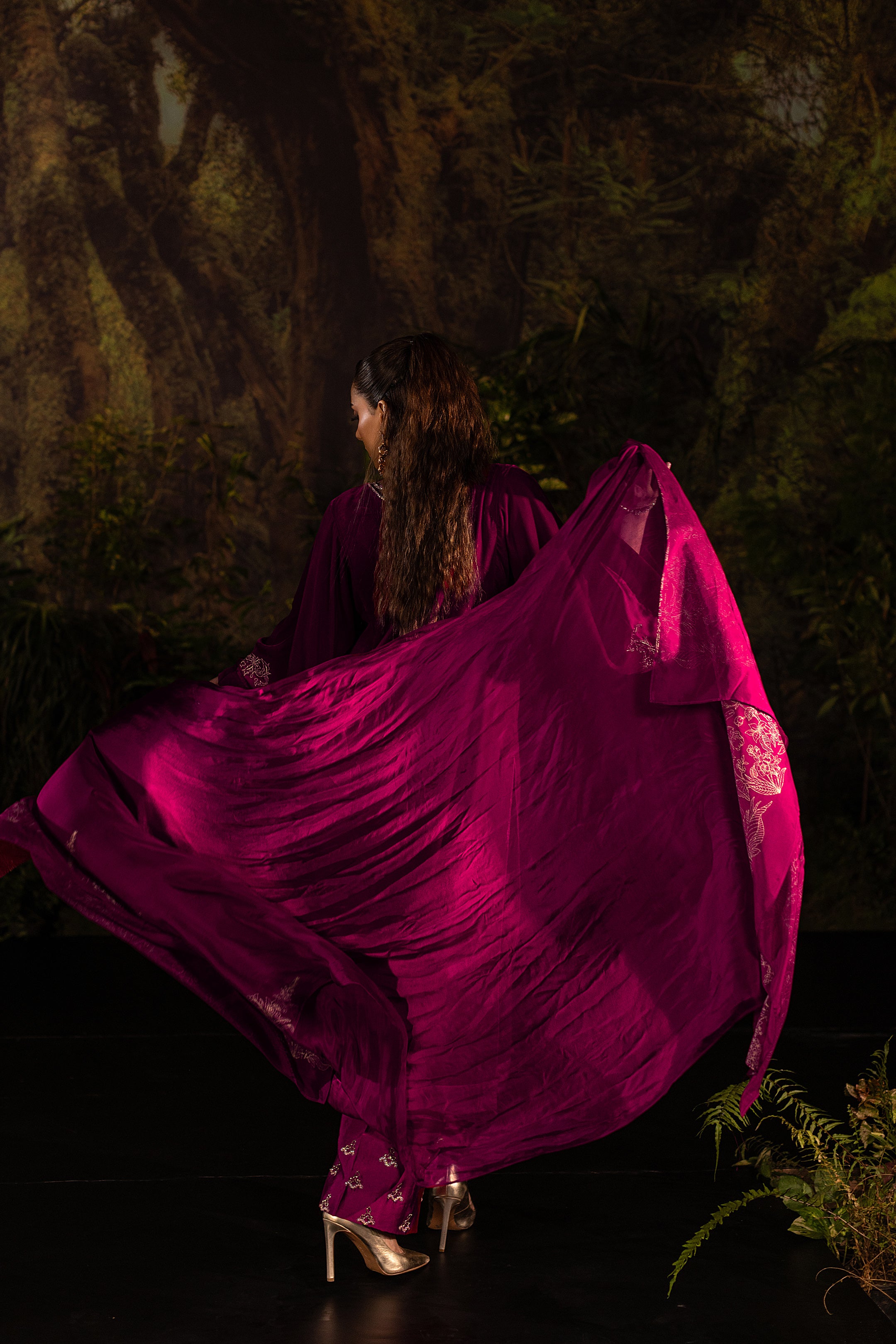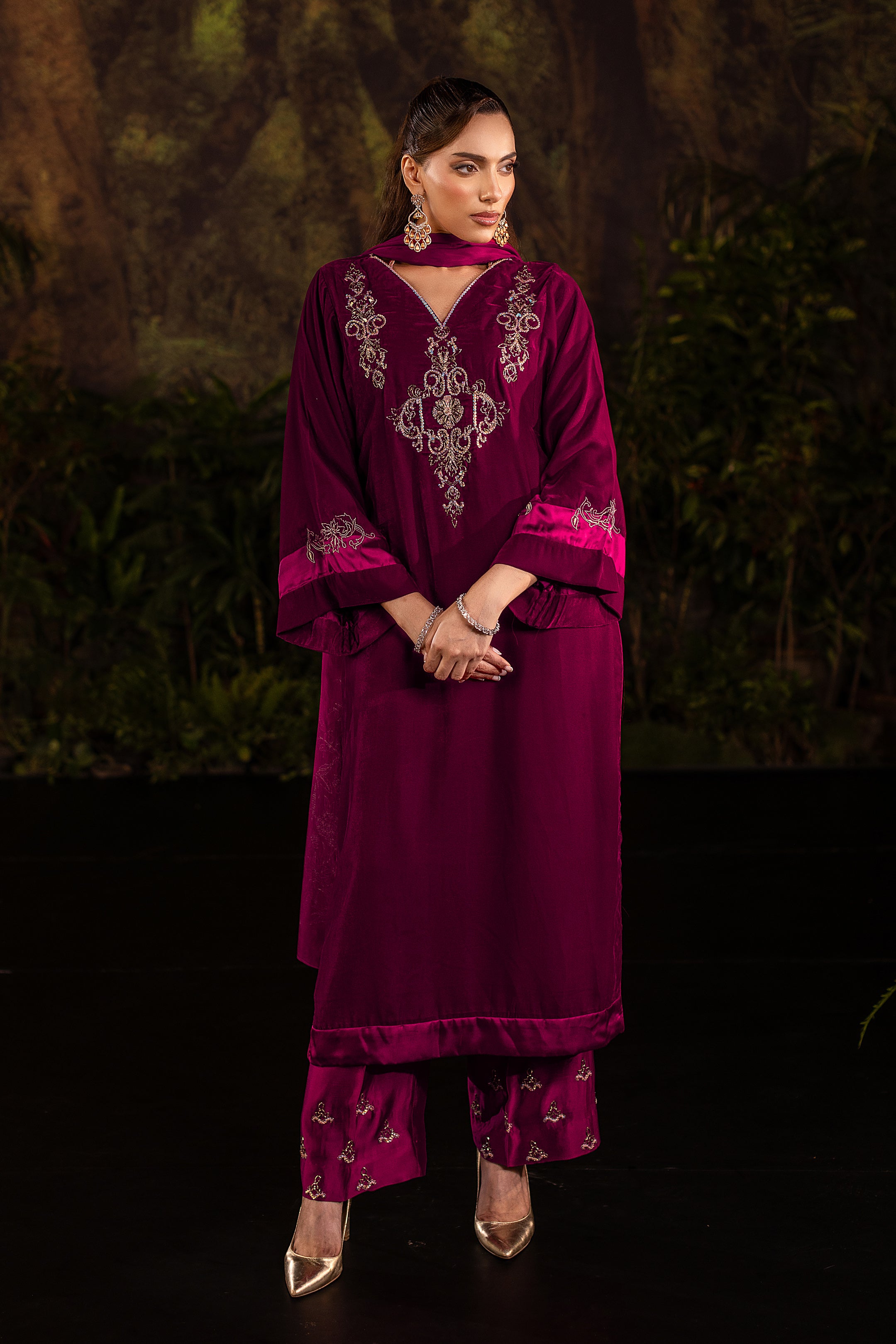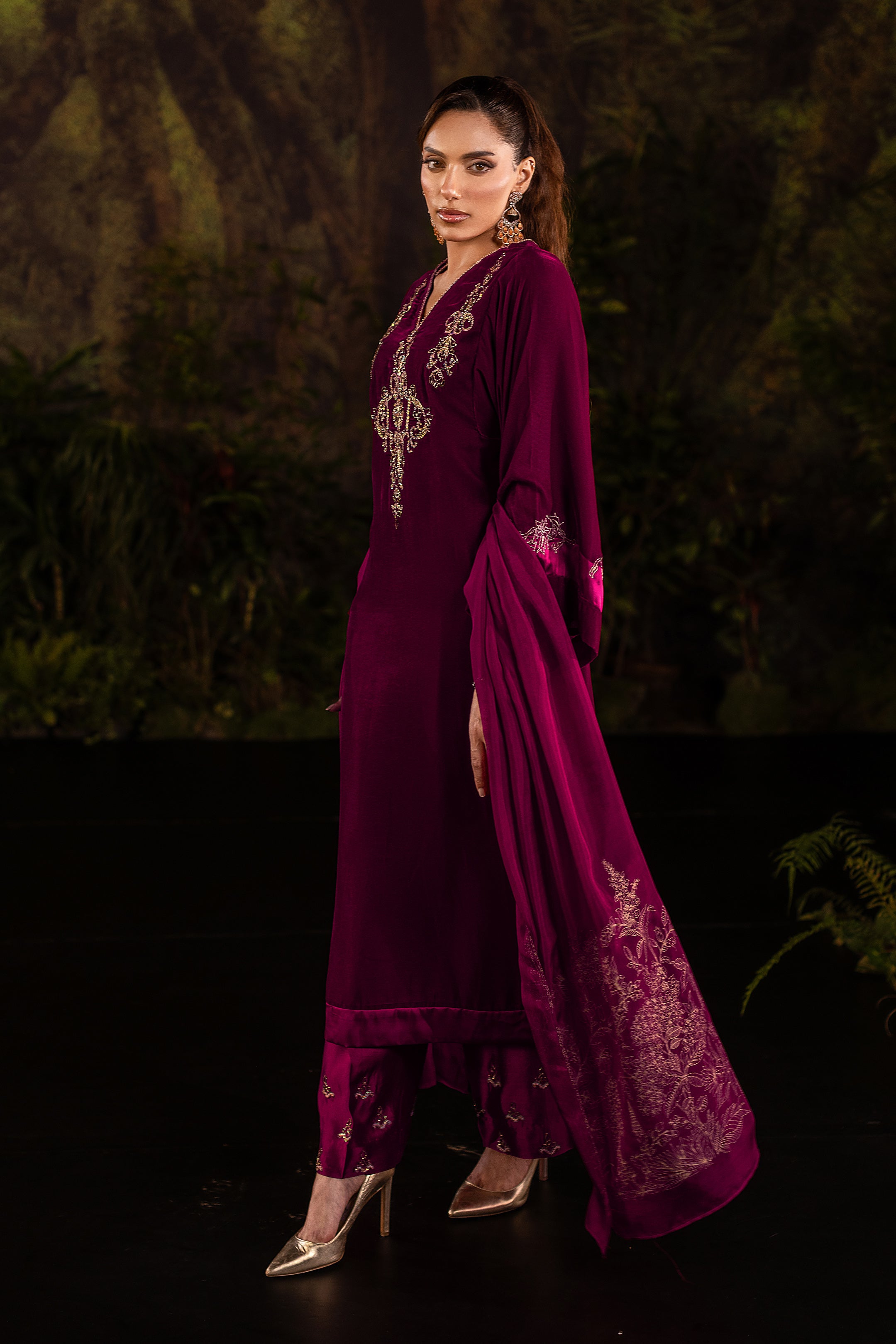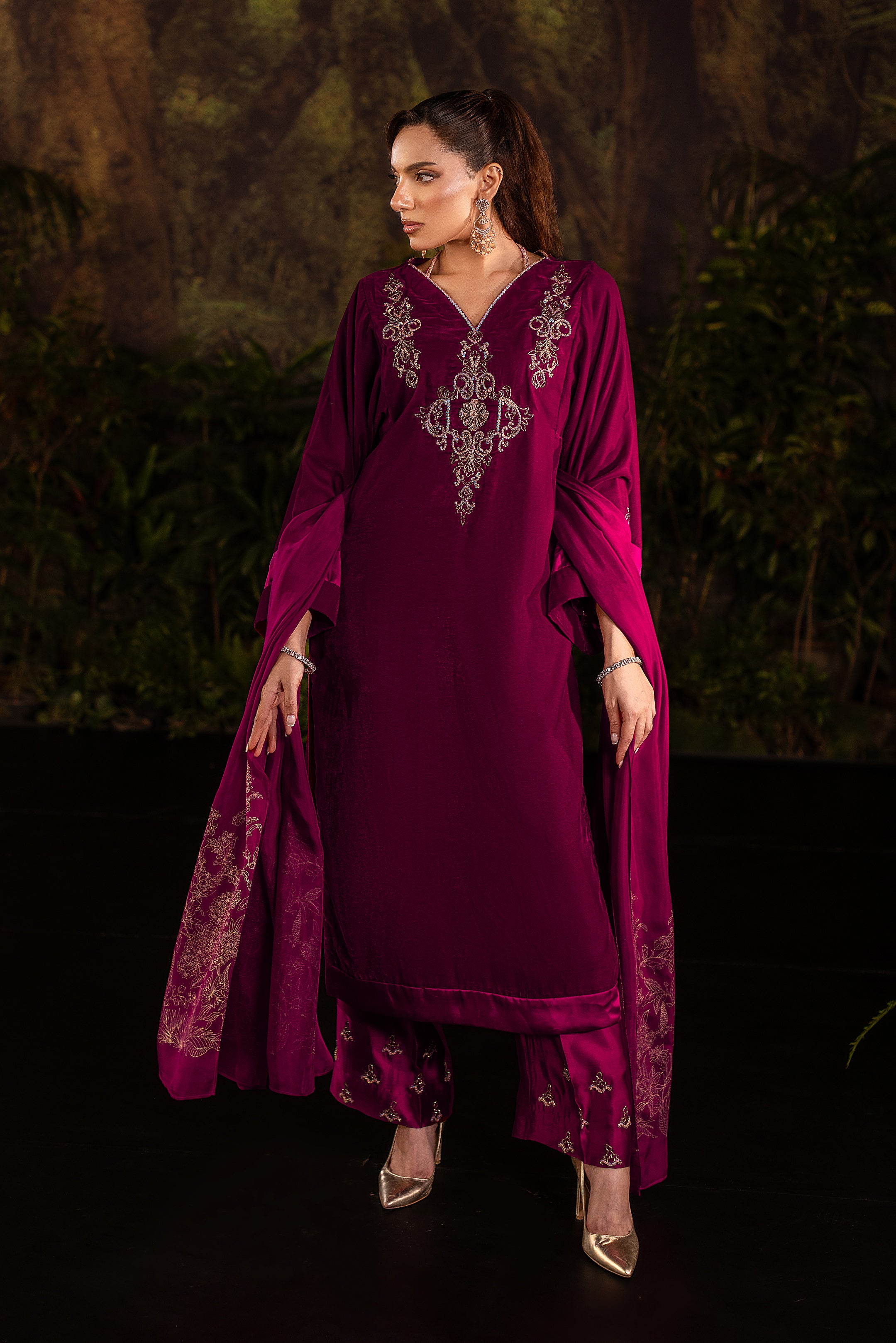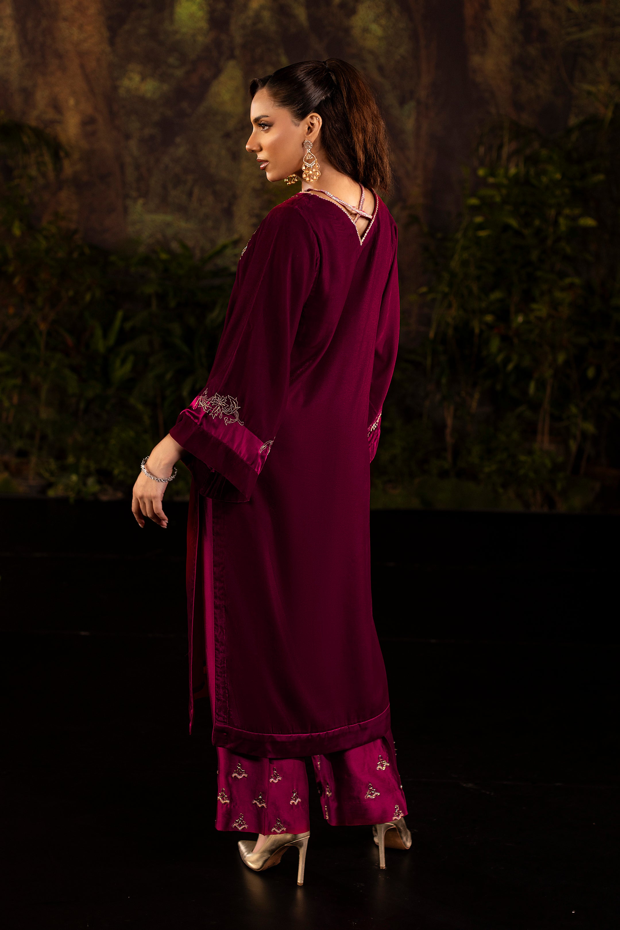 A bold statement in jewel tones, this fuchsia velvet ensemble radiates contemporary elegance. The straight-cut velvet kameez is adorned with intricate embroidery across the neckline and sleeves, drawing the eye with its delicate yet striking detail. Paired with matching trousers, finished with fine embroidery that adds depth and continuity to the look, the outfit achieves a perfect balance of richness and refinement. A fuchsia silk gold printed dupatta completes the ensemble, adding movement, texture, and a touch of modern artistry to the opulent velvet canvas. Designed for evenings where colour, craft, and confidence converge.
