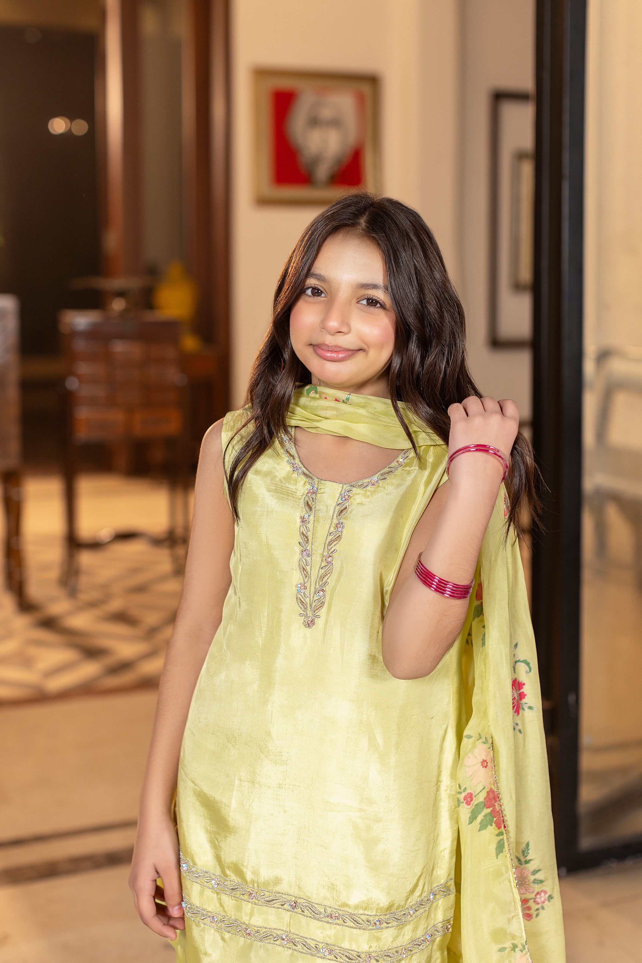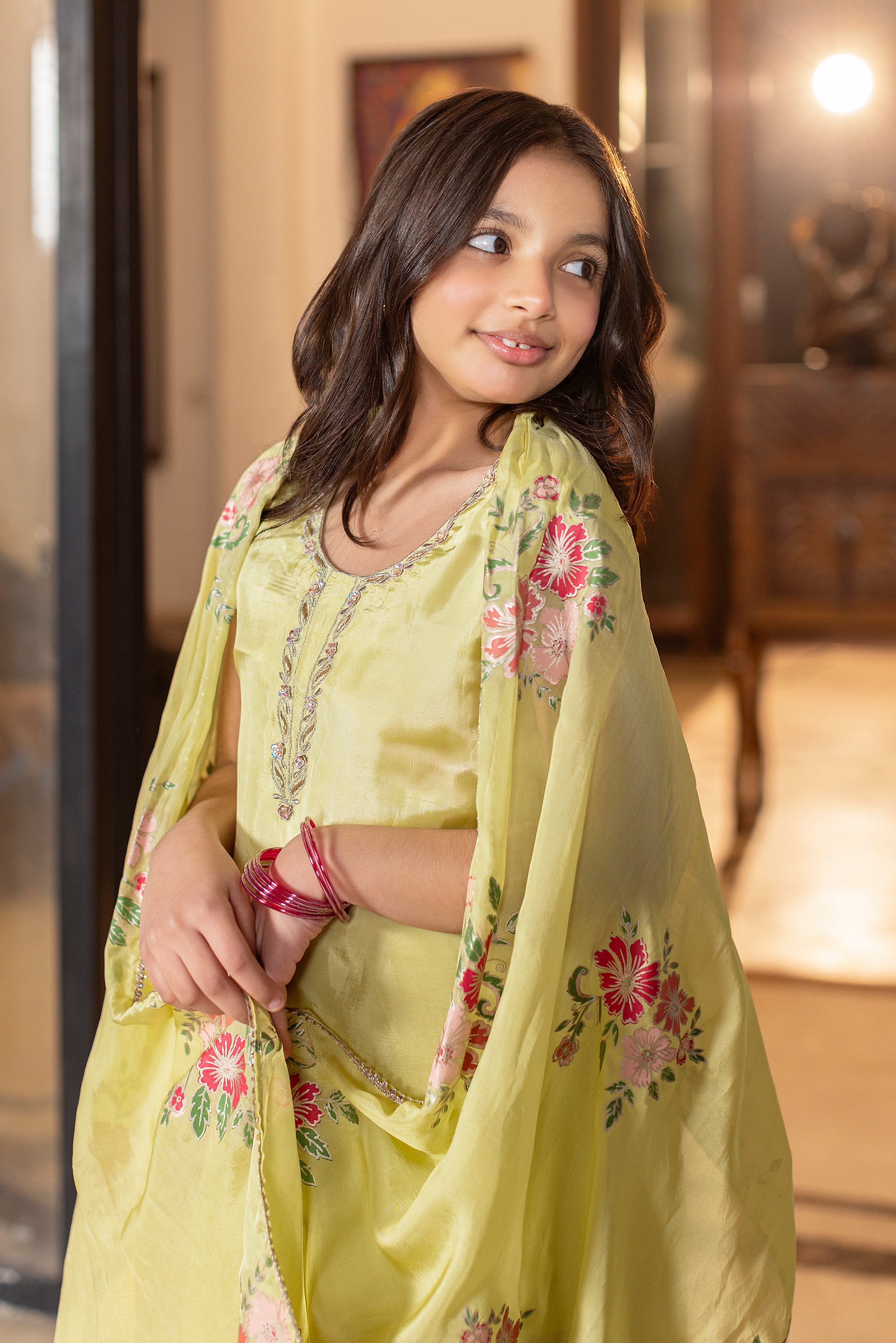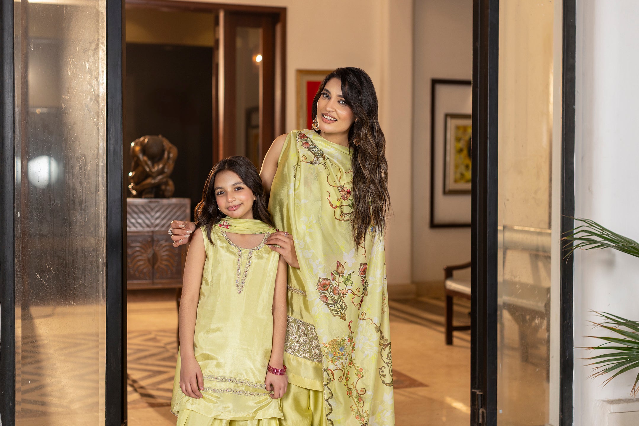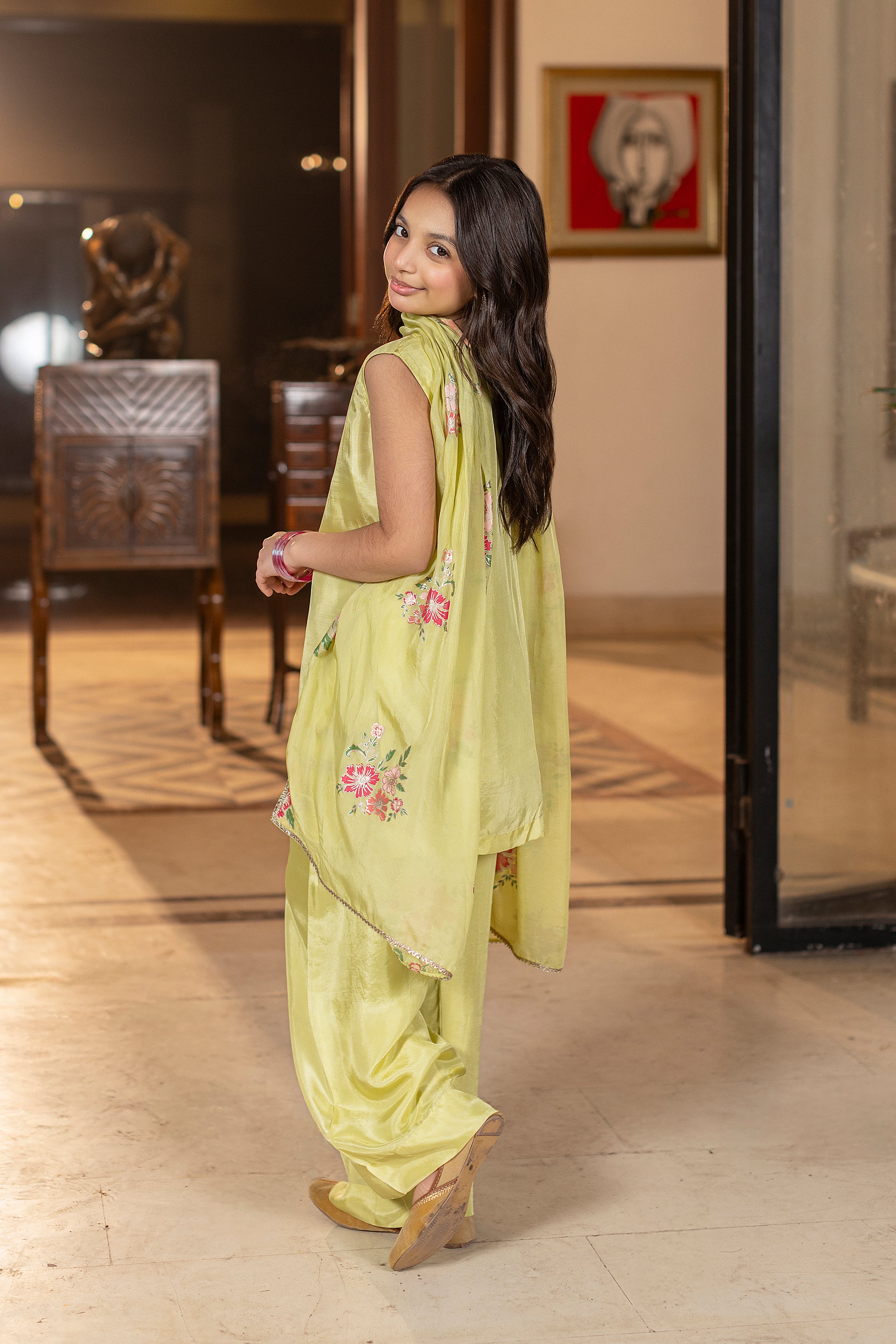 Lemara is a lime-green blended silk ensemble featuring an embroidered shirt, matching farshi trousers, and a playful screen-printed dupatta. Complimentary sleeves can be added.