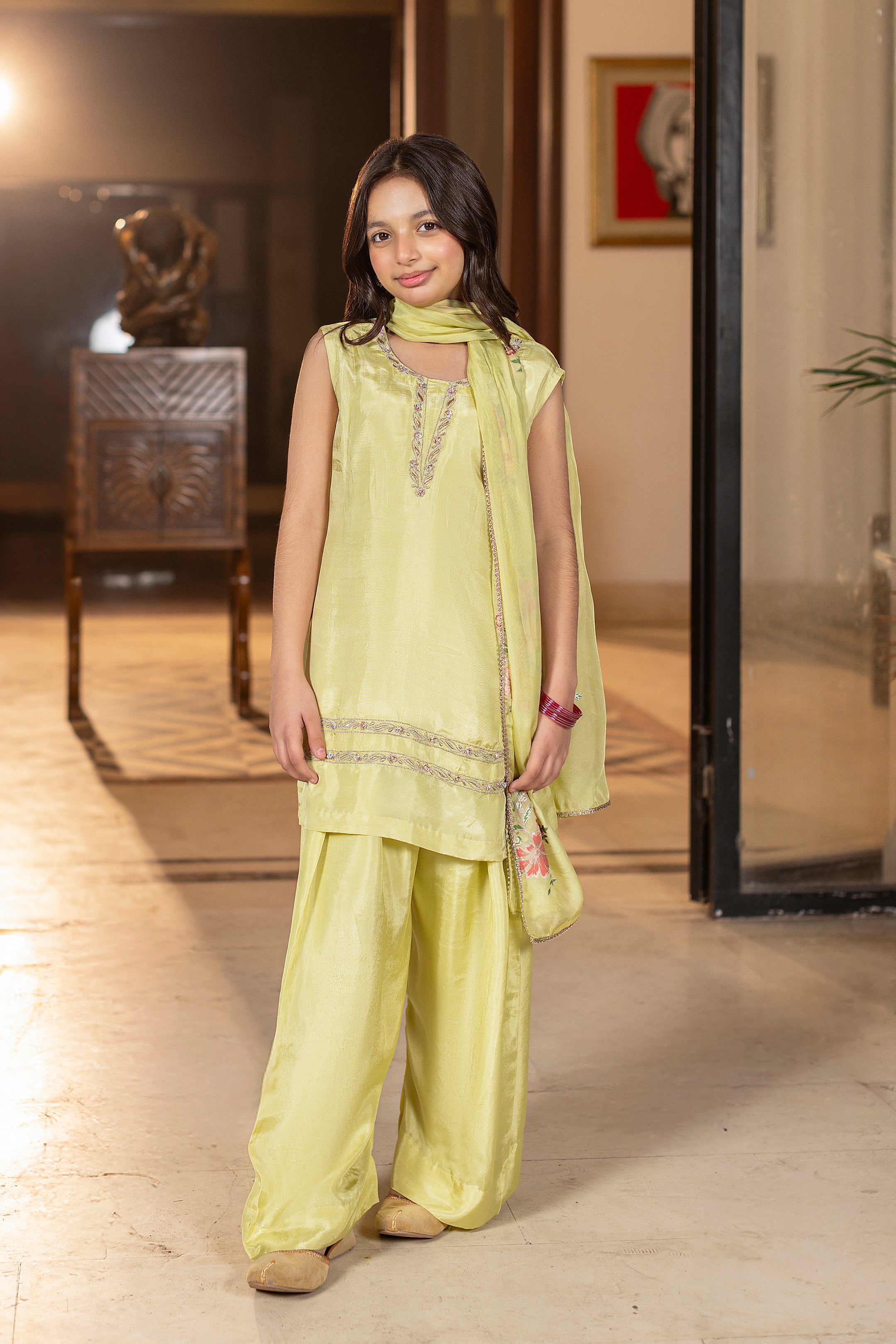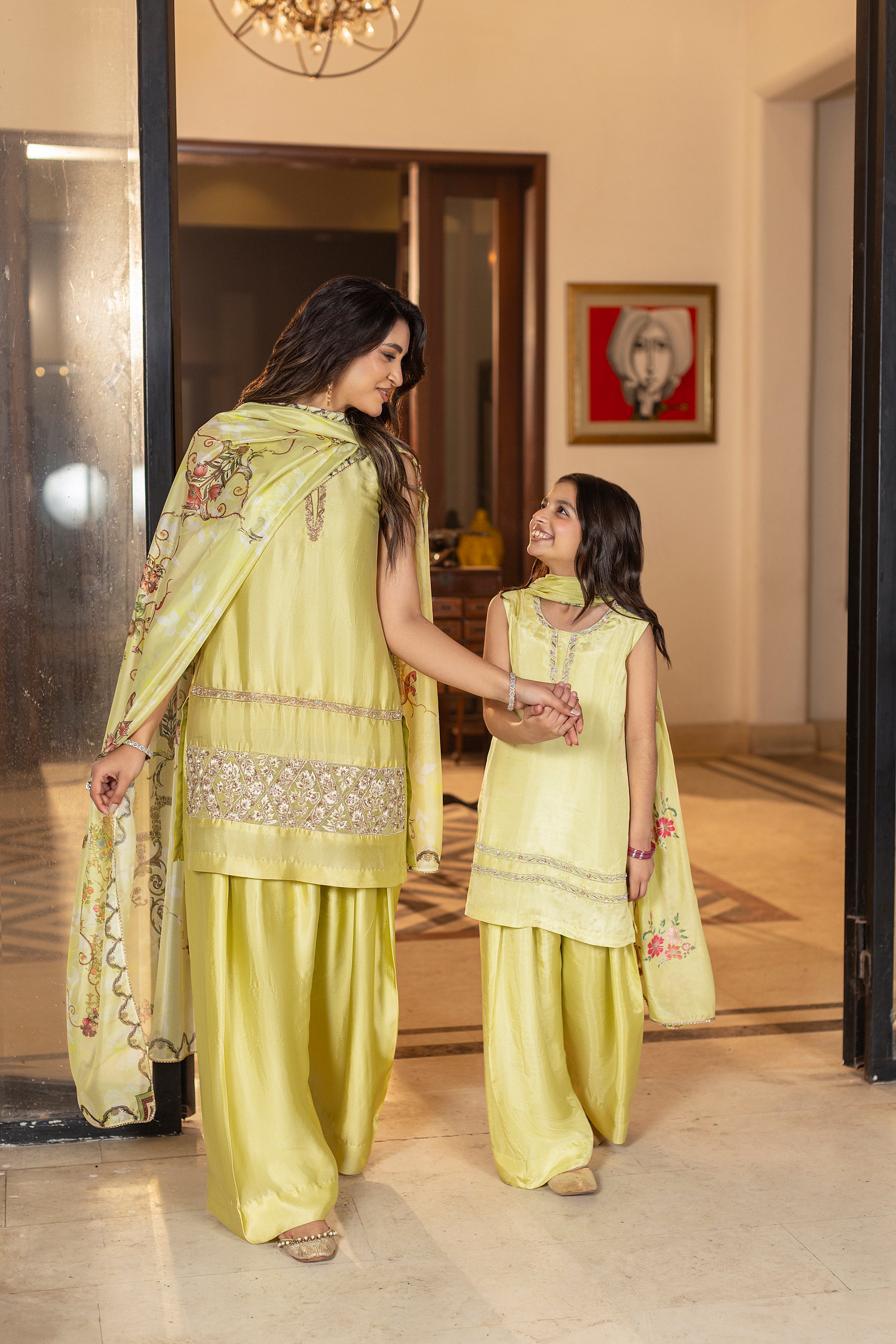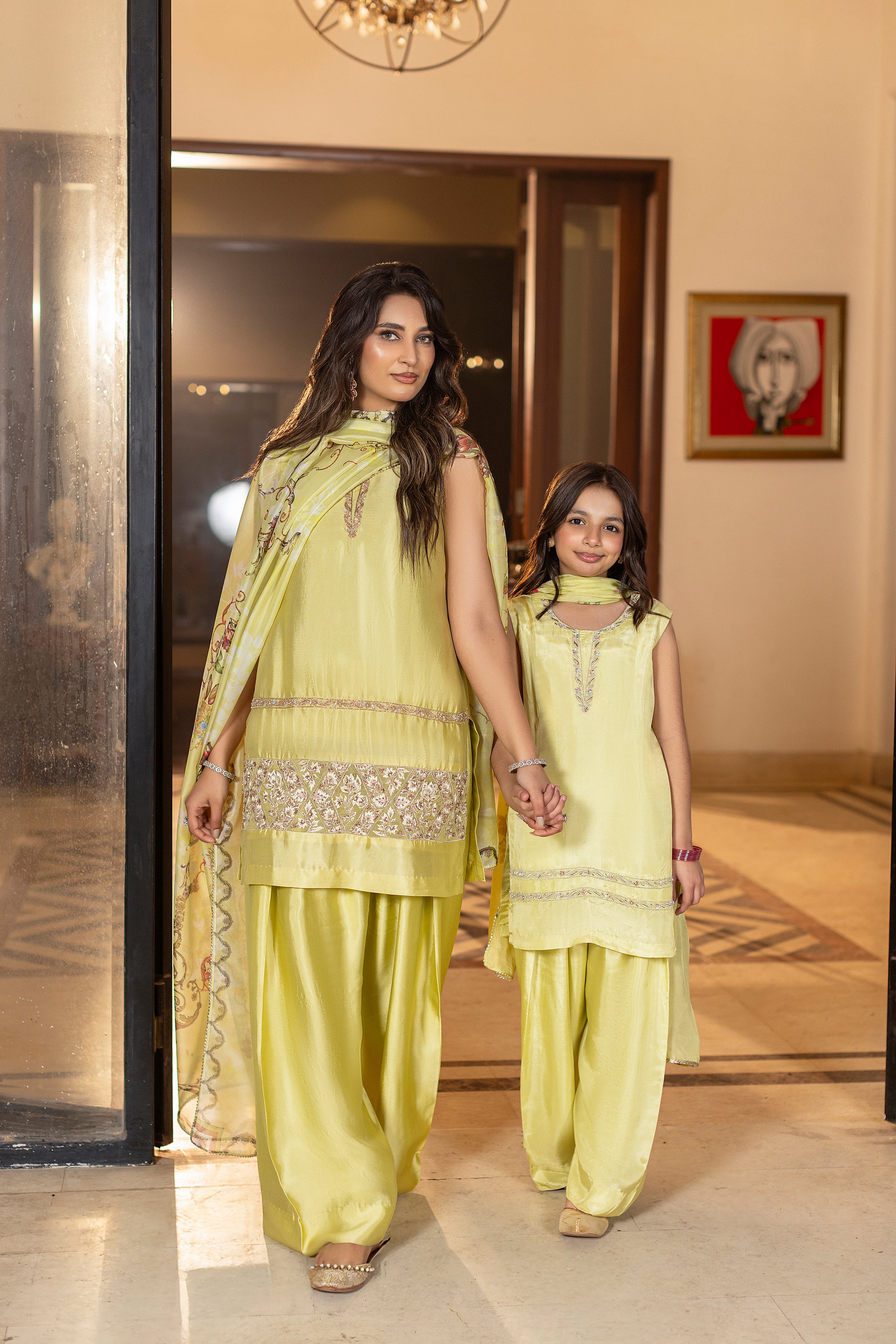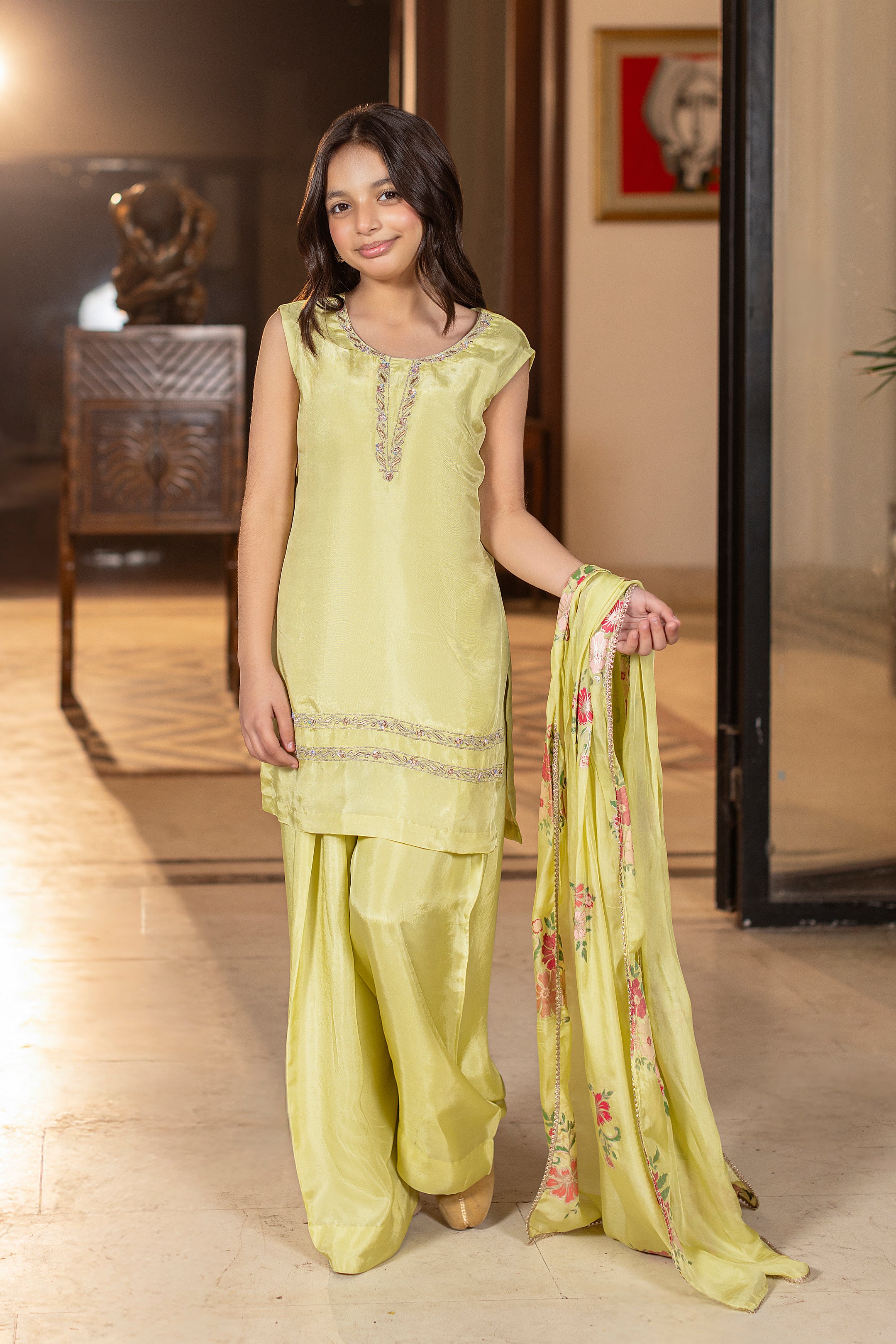 Lemara is a lime-green blended silk ensemble featuring an embroidered shirt, matching farshi trousers, and a playful screen-printed dupatta. Complimentary sleeves can be added.