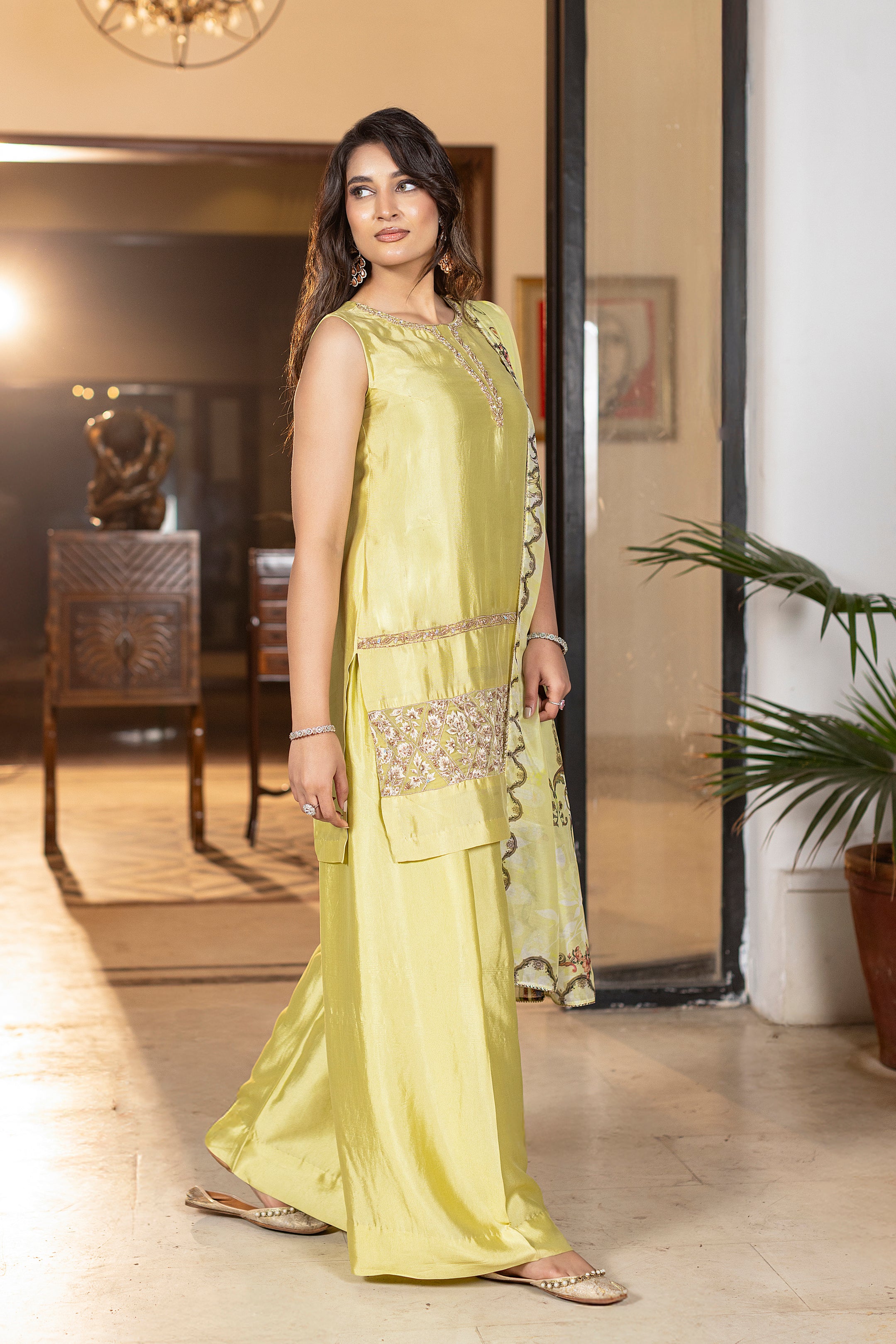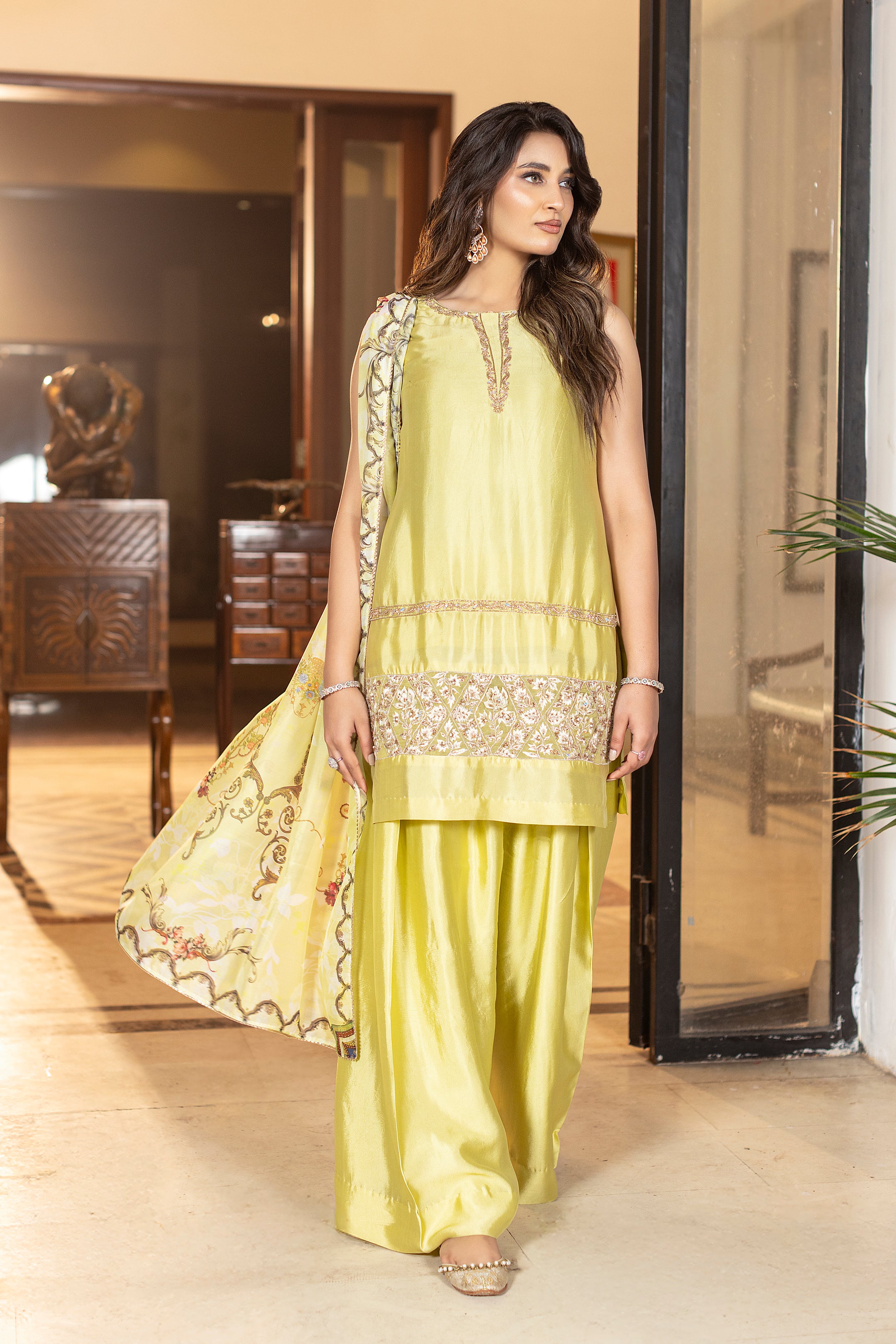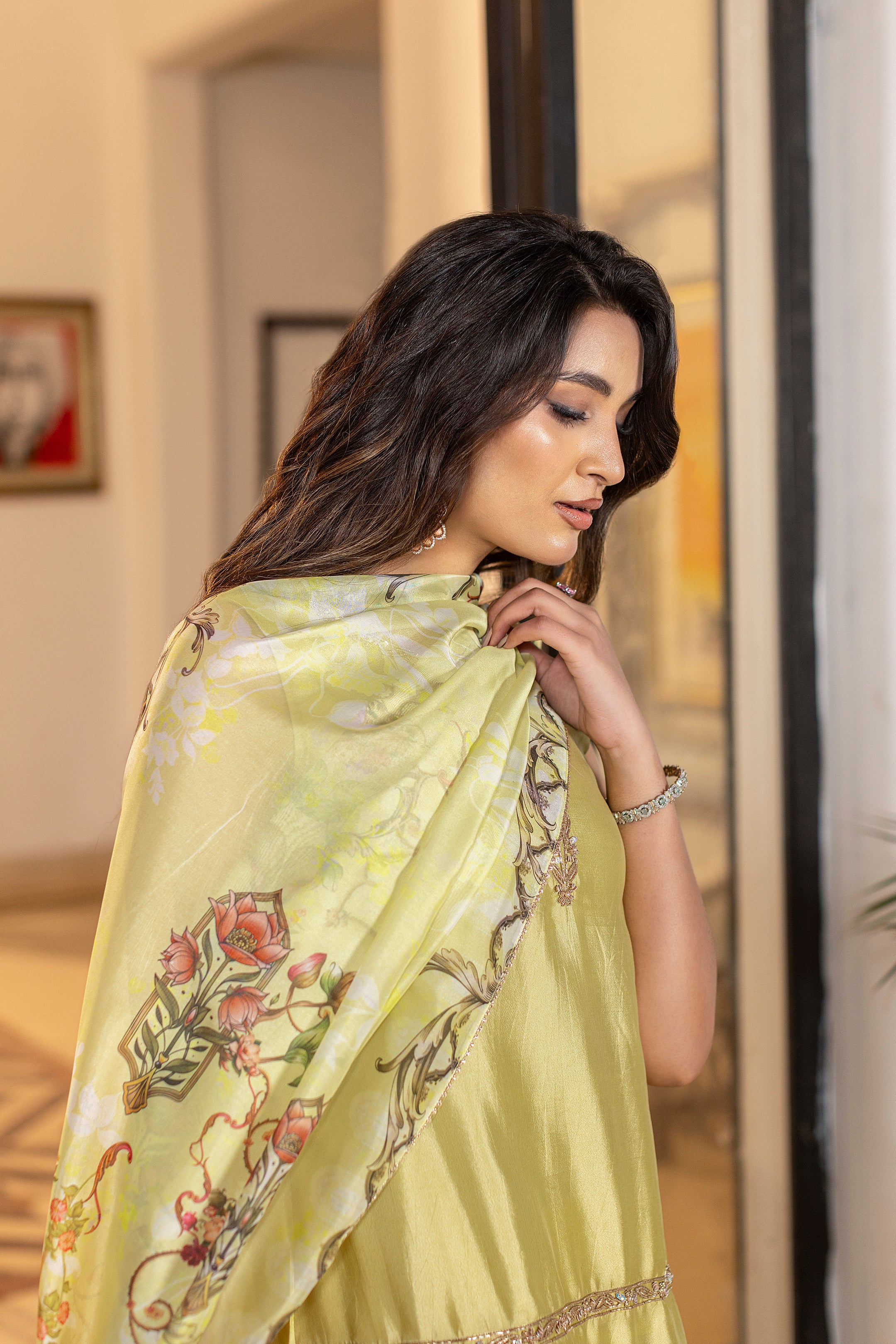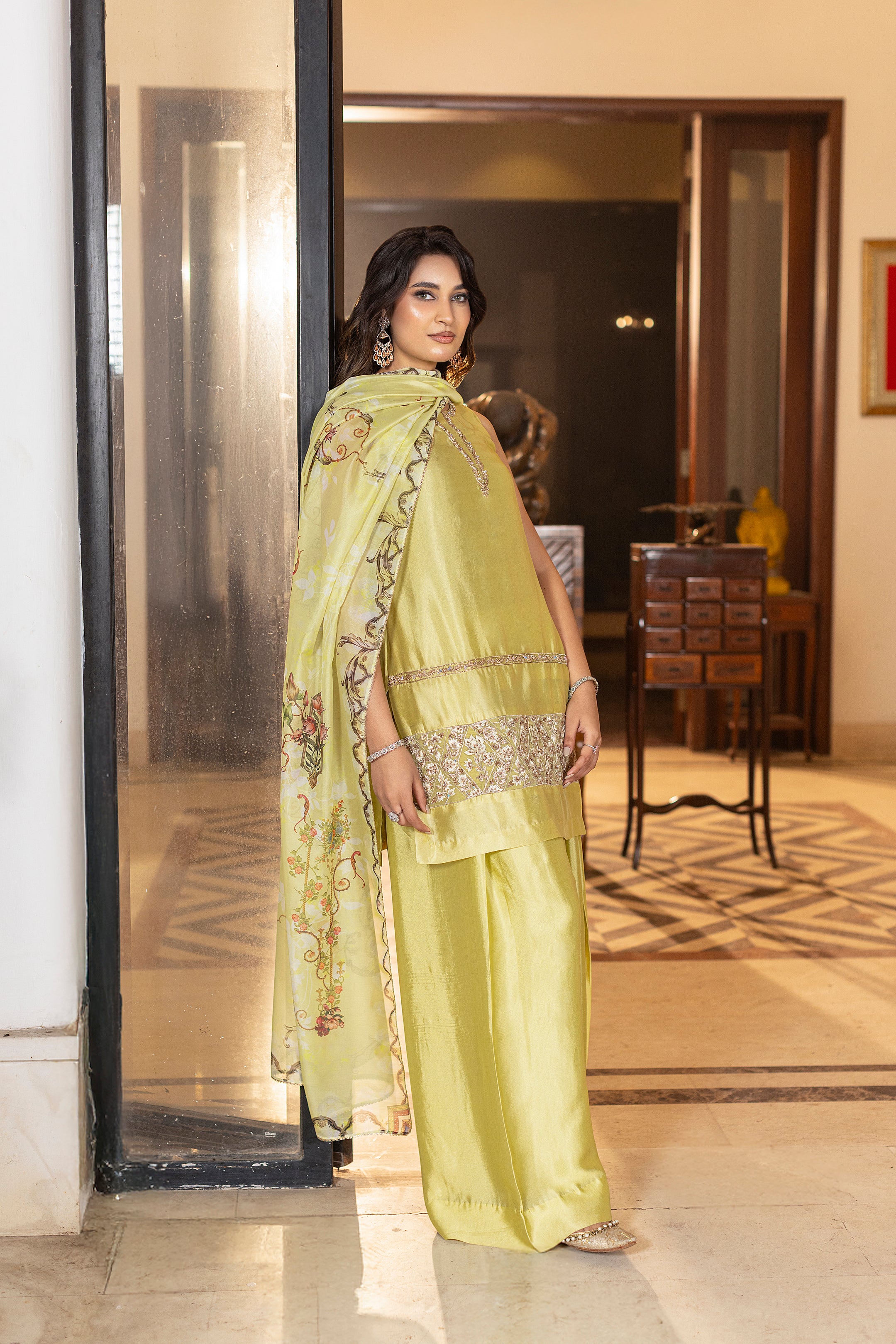 Limoré shines in a lime-green luxe glass silk ensemble, a perfect blend of elegant and contemporary style. The shirt features delicate hand and thread embroidery, paired with matching farshi trousers for a sleek design. A flowing printed silk dupatta completes the look, adding effortless grace, ideal for festive celebrations and special occasions. Complimentary sleeves can be added.