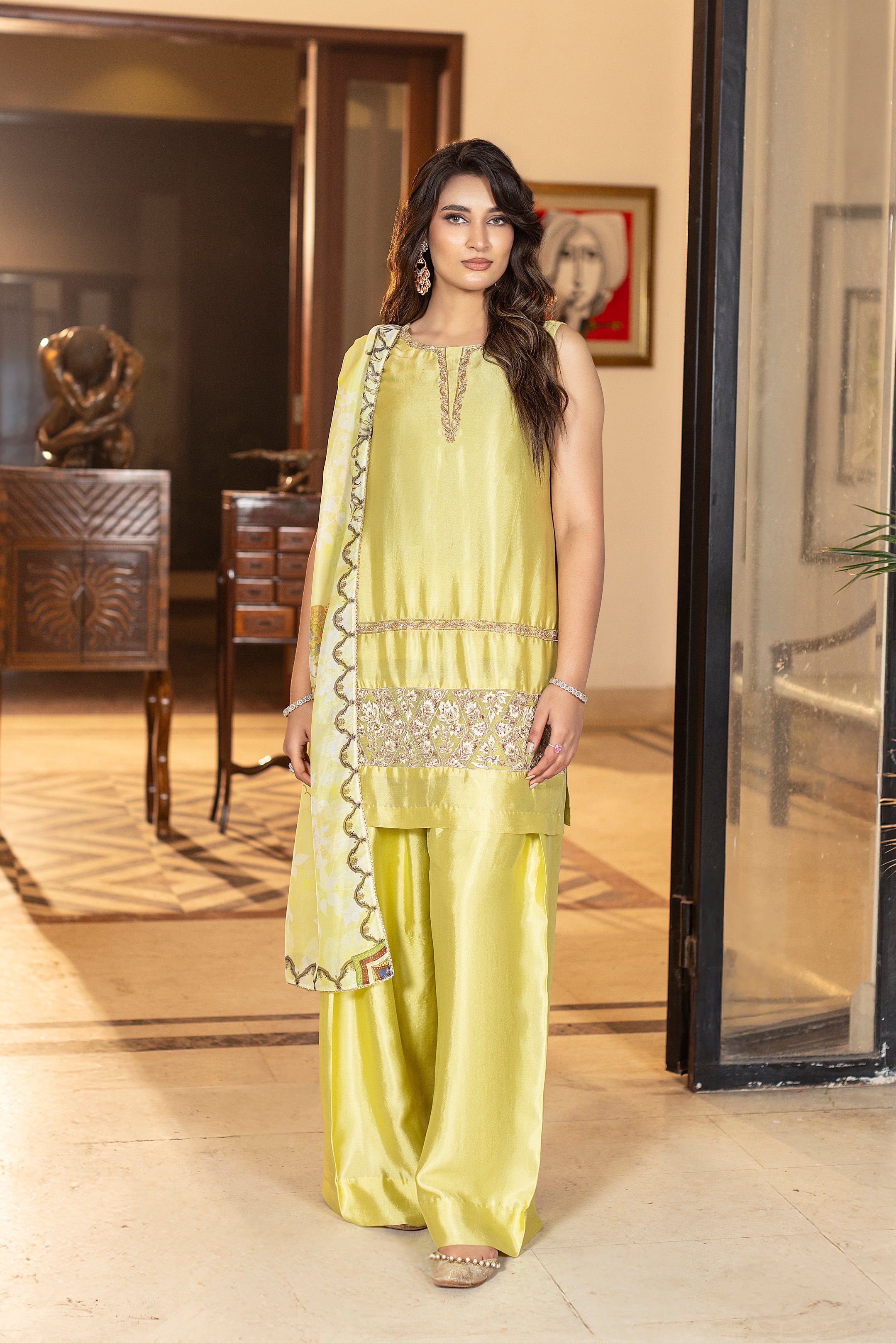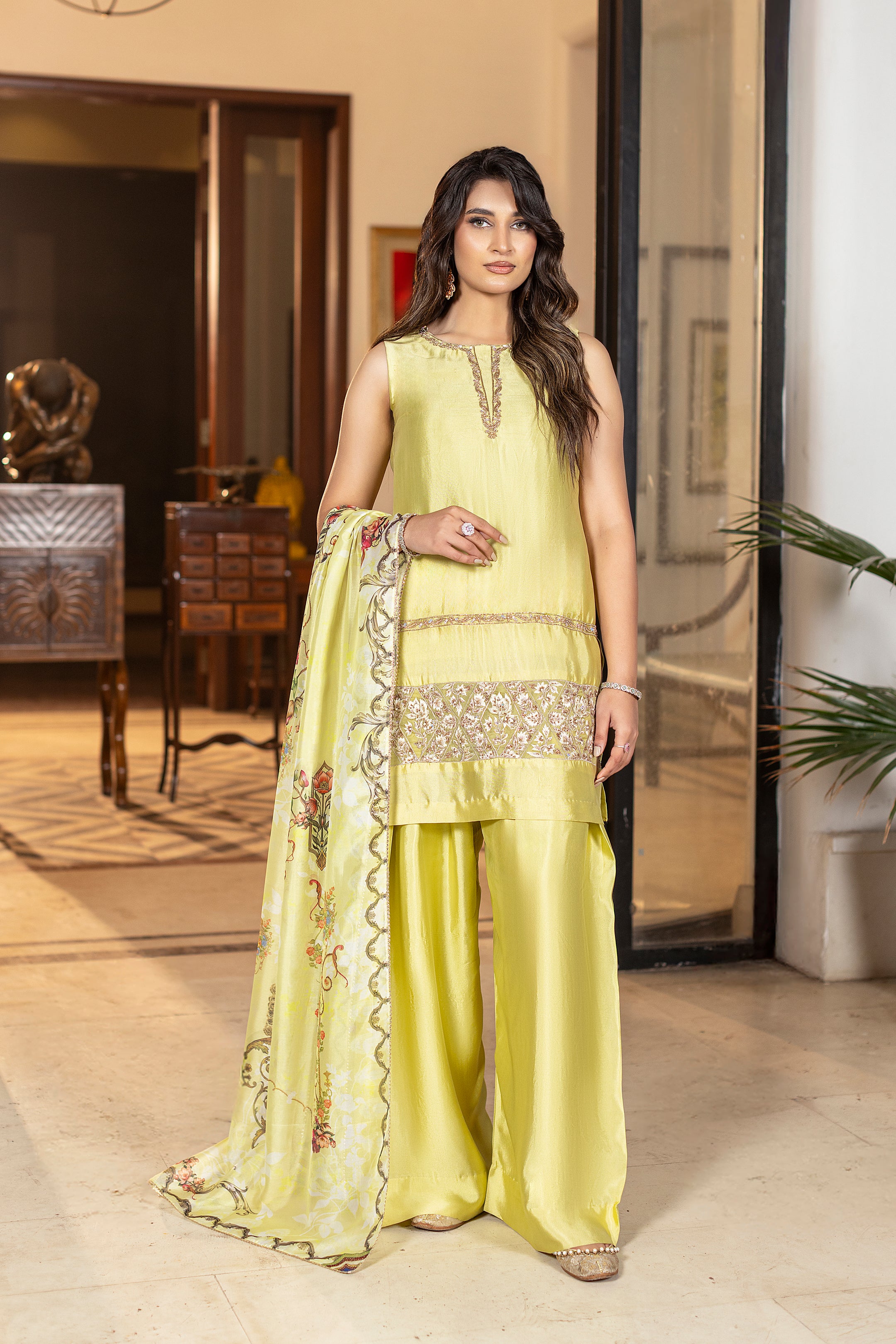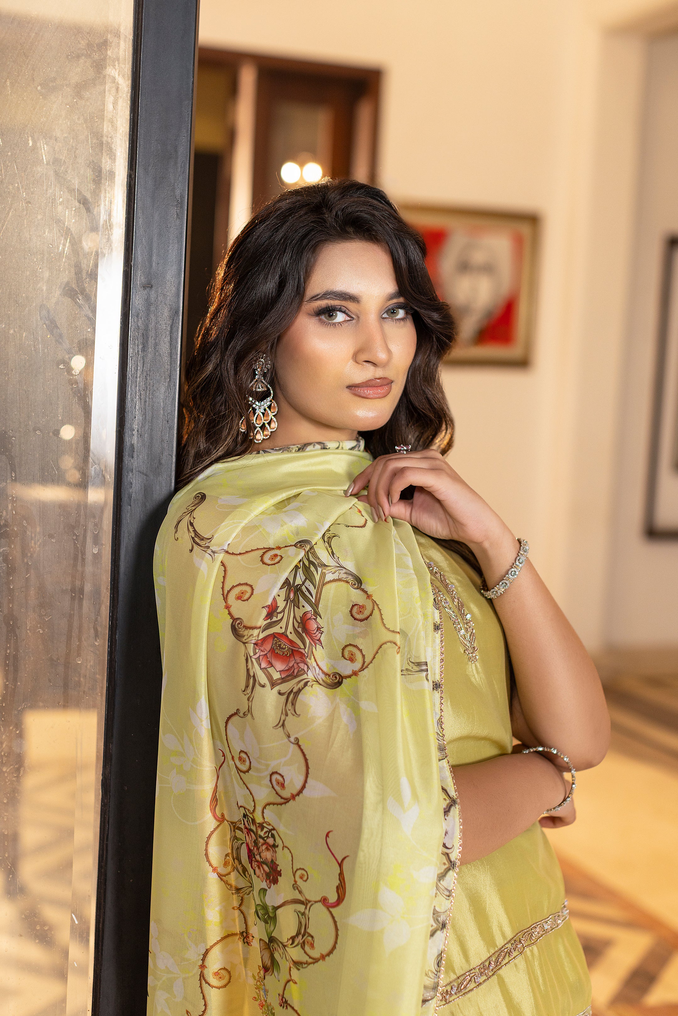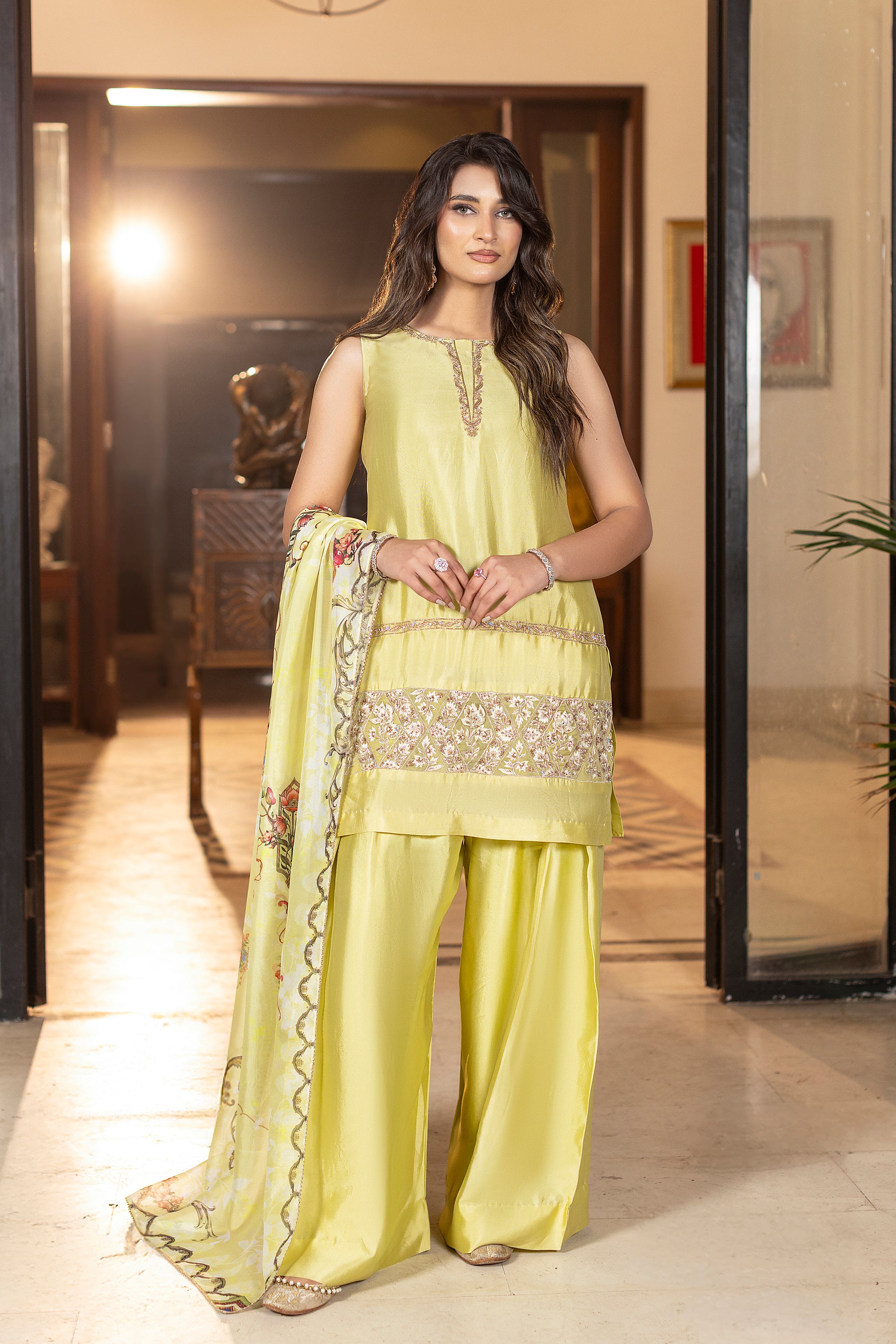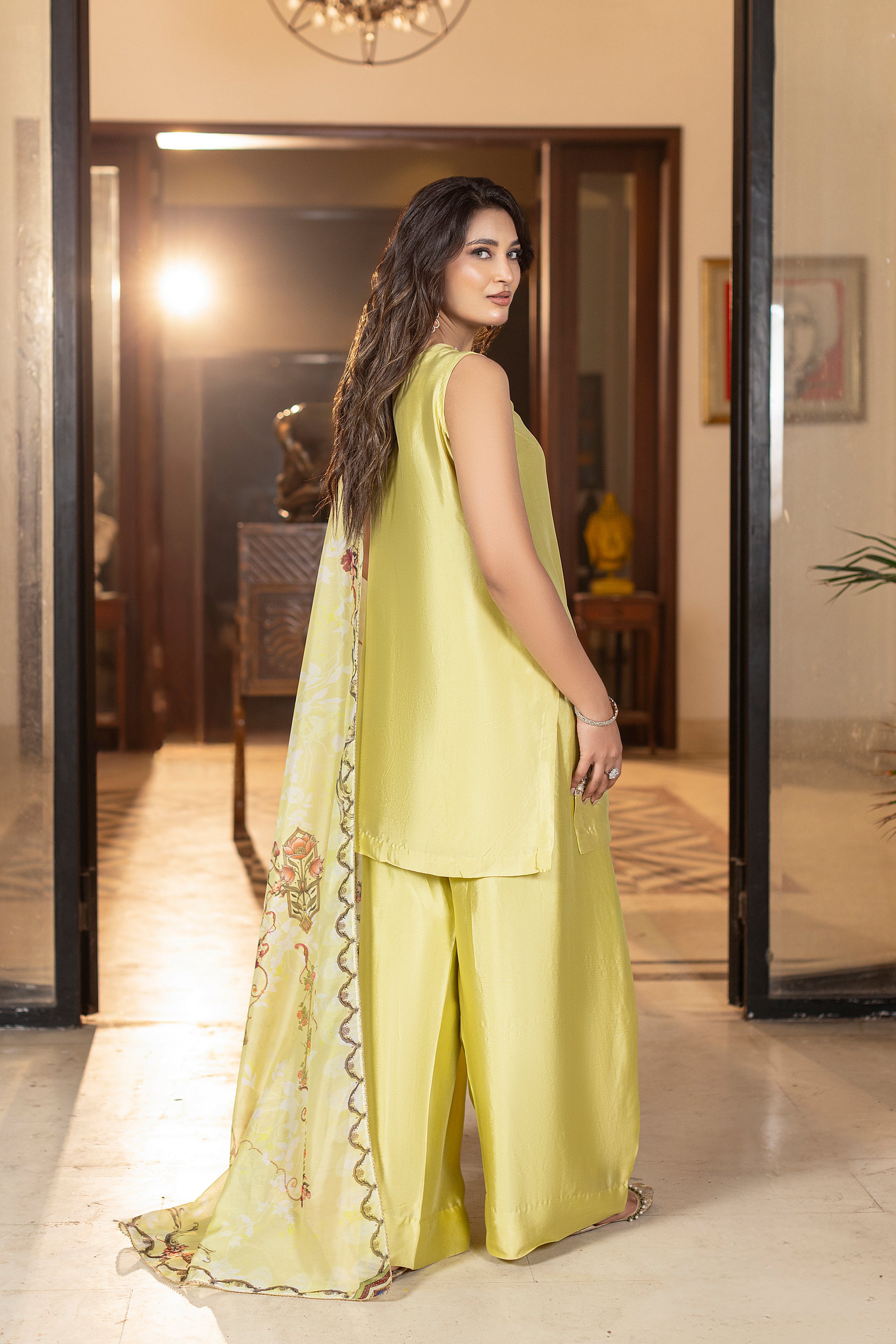 Limoré shines in a lime-green luxe glass silk ensemble, a perfect blend of elegant and contemporary style. The shirt features delicate hand and thread embroidery, paired with matching farshi trousers for a sleek design. A flowing printed silk dupatta completes the look, adding effortless grace, ideal for festive celebrations and special occasions. Complimentary sleeves can be added.