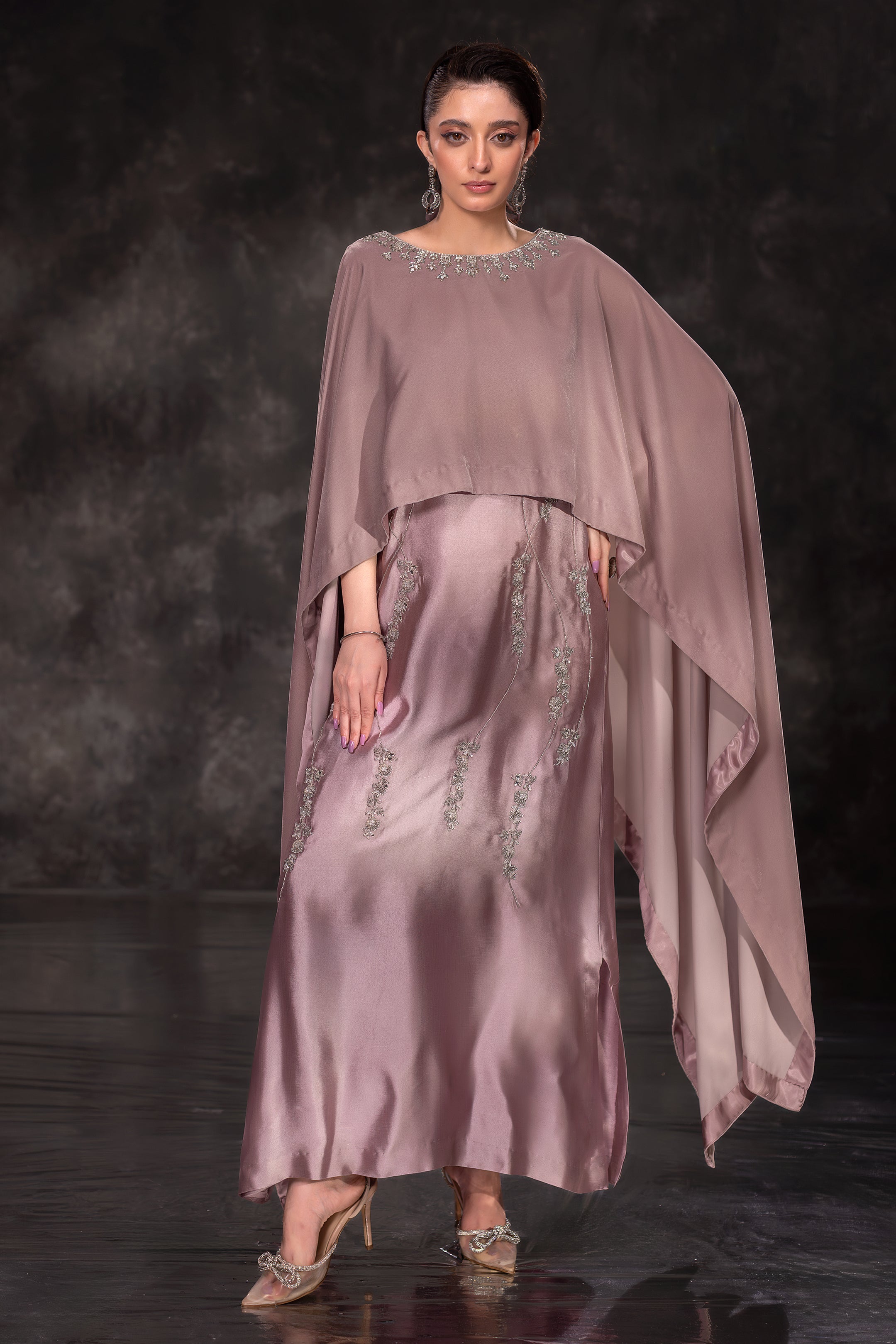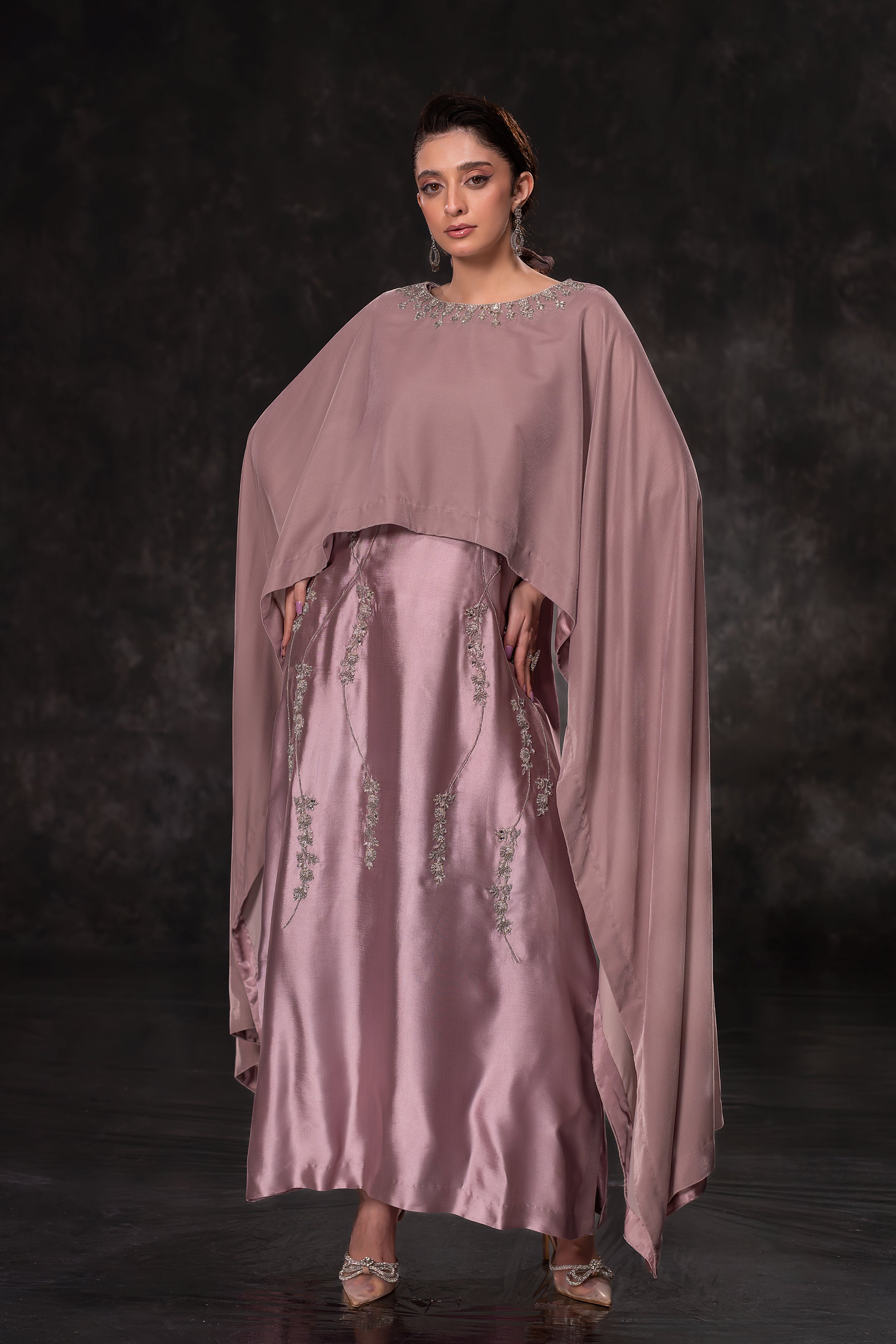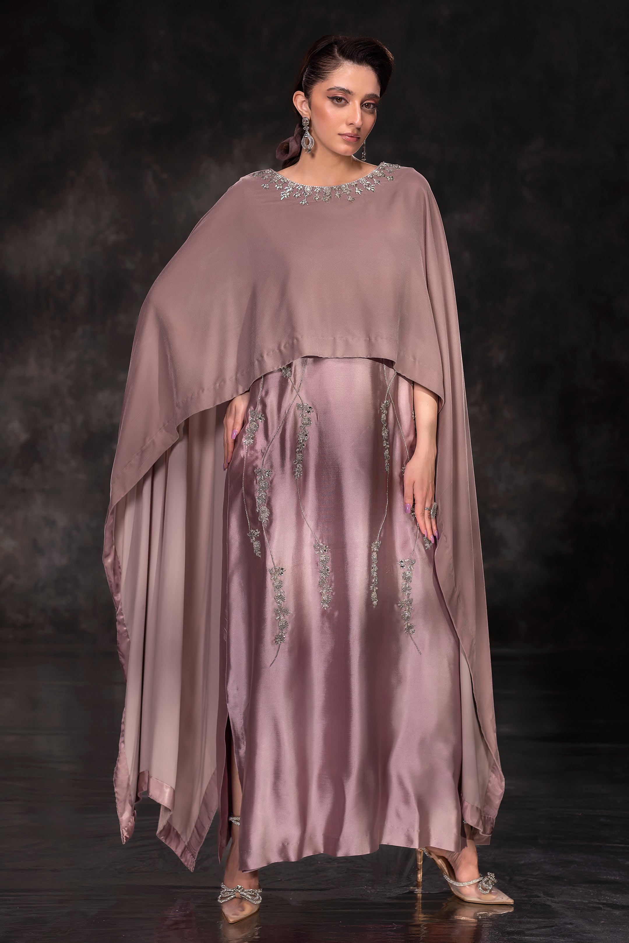 Lunara exudes modern royalty with a touch of celestial grace, designed in a soft dusty lilac hue, featuring a flowing cape overlay that cascades effortlessly, creating a dreamy silhouette. The delicately hand-embellished neckline and vertical silver embroidery elongate the frame, adding a refined sparkle without overwhelming the look. Perfect for evening galas, engagement soirées, or high-end festive events, this look captures the essence of quiet glamour, poised, ethereal, and effortlessly chic.