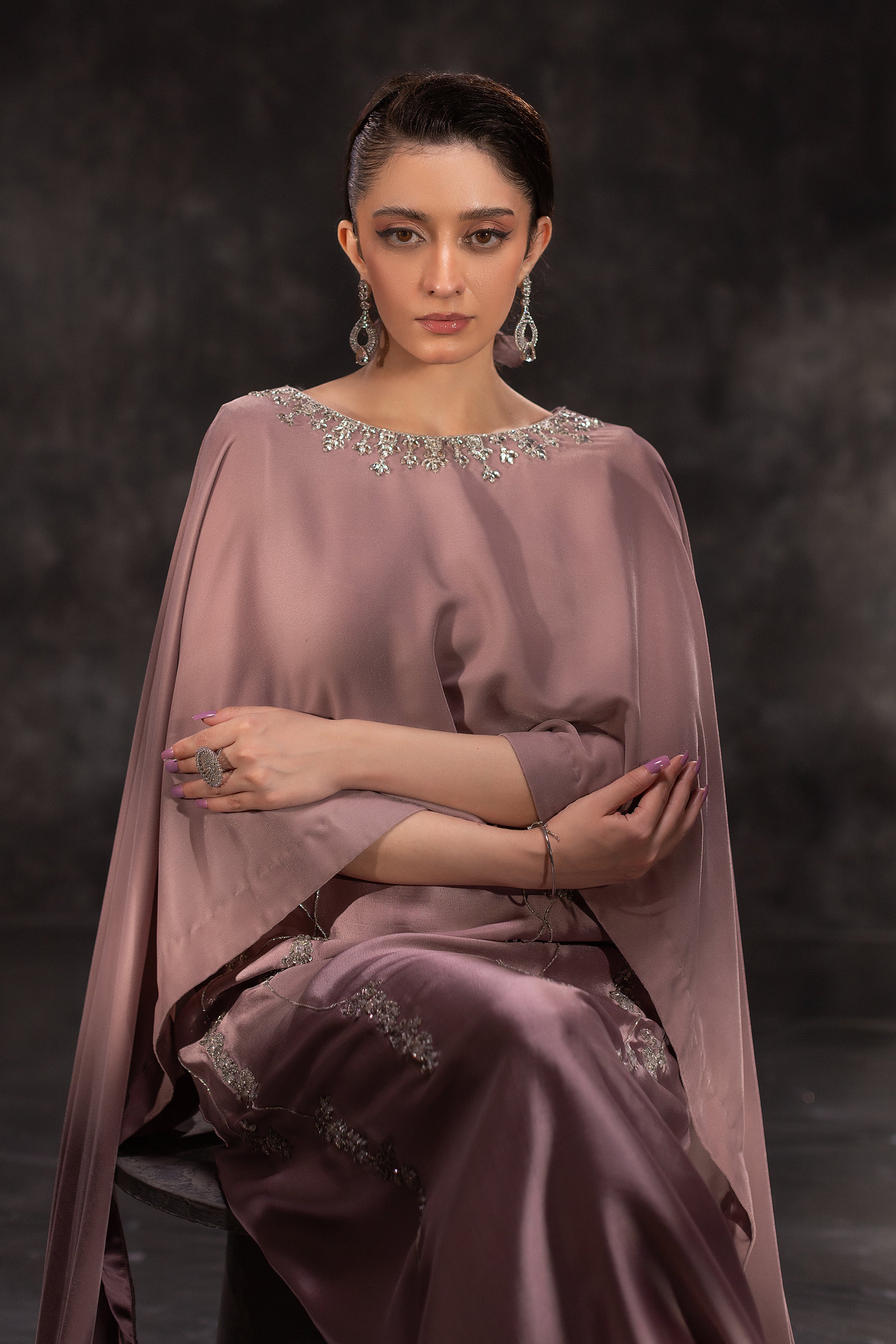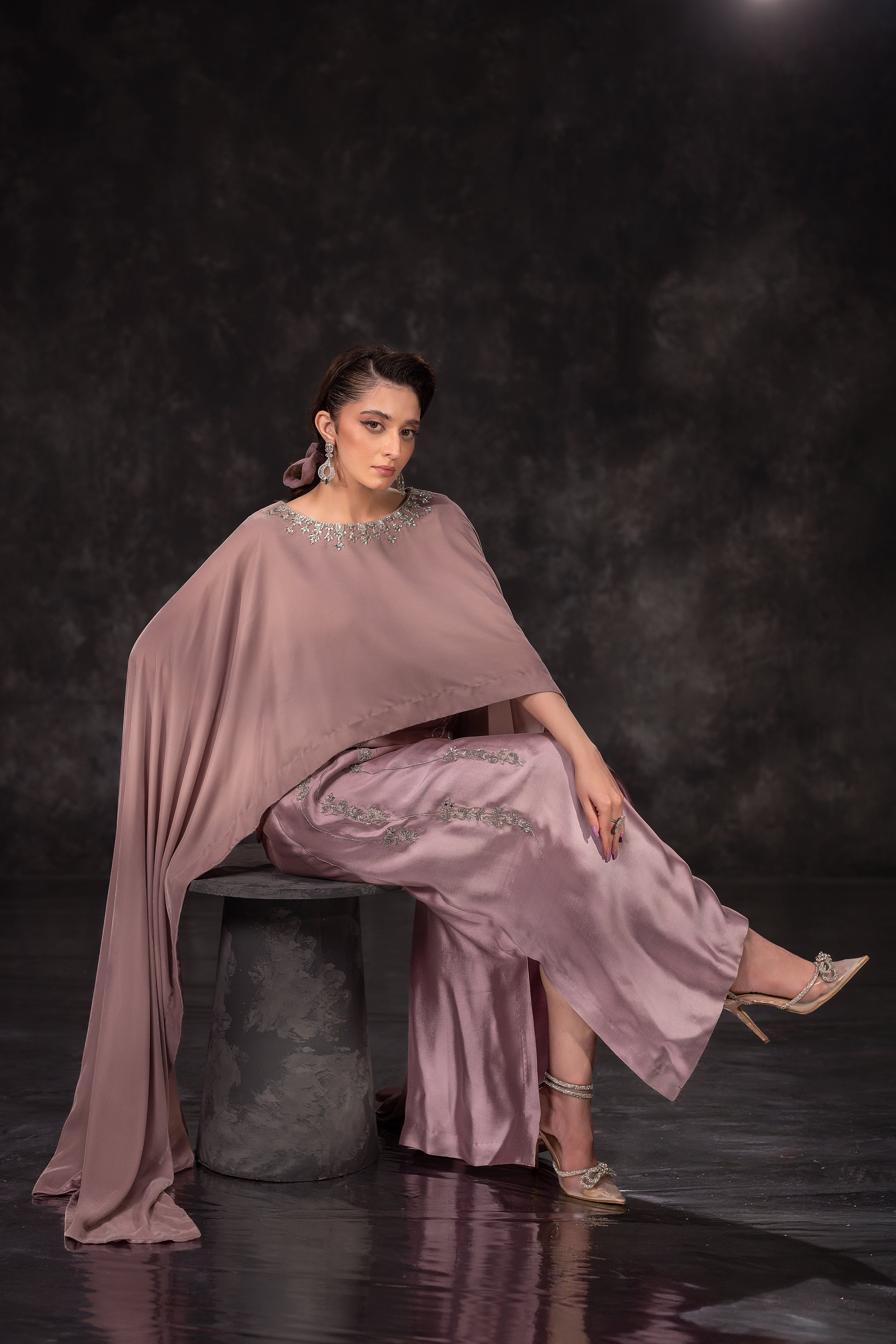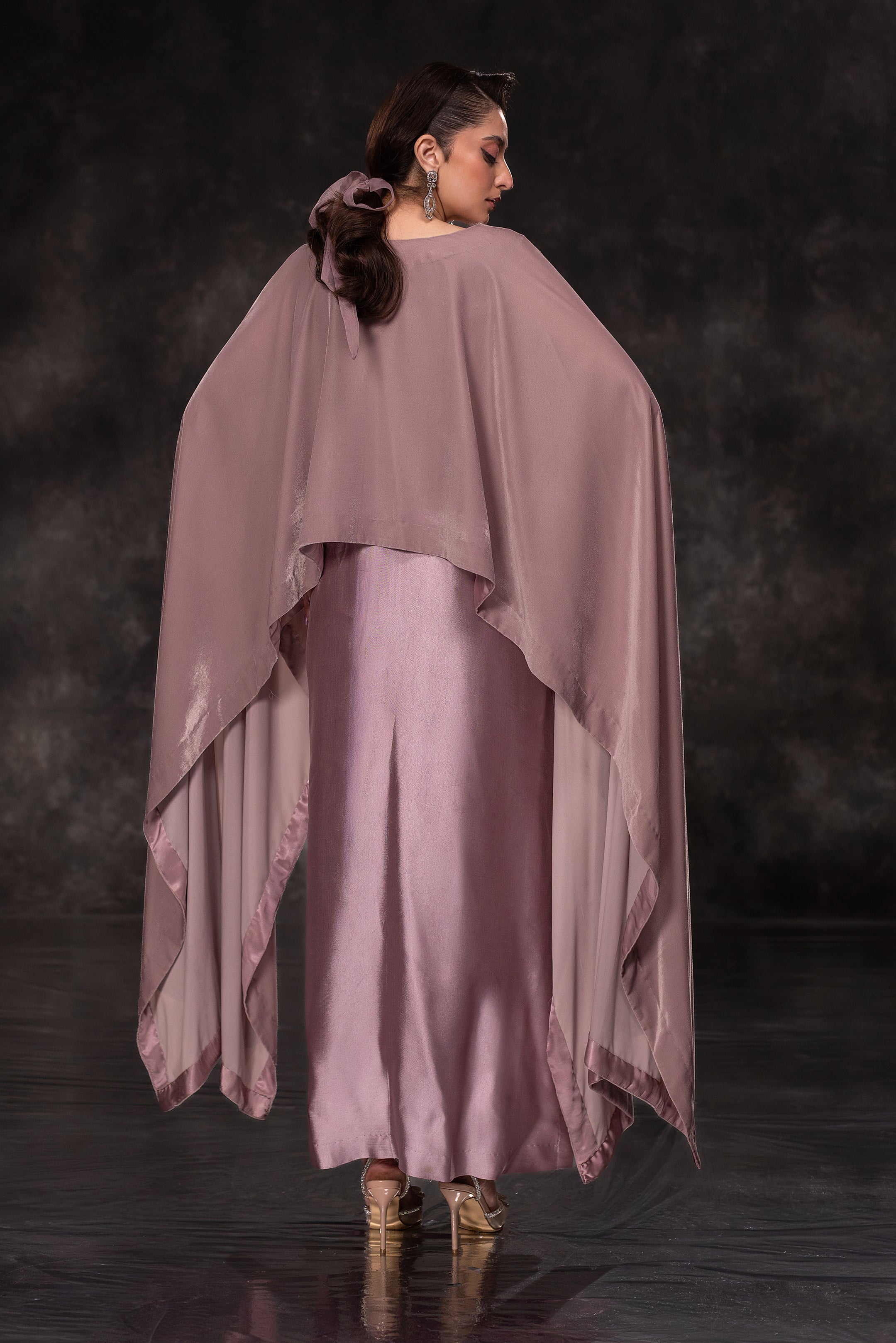 Lunara exudes modern royalty with a touch of celestial grace, designed in a soft dusty lilac hue, featuring a flowing cape overlay that cascades effortlessly, creating a dreamy silhouette. The delicately hand-embellished neckline and vertical silver embroidery elongate the frame, adding a refined sparkle without overwhelming the look. Perfect for evening galas, engagement soirées, or high-end festive events, this look captures the essence of quiet glamour, poised, ethereal, and effortlessly chic.