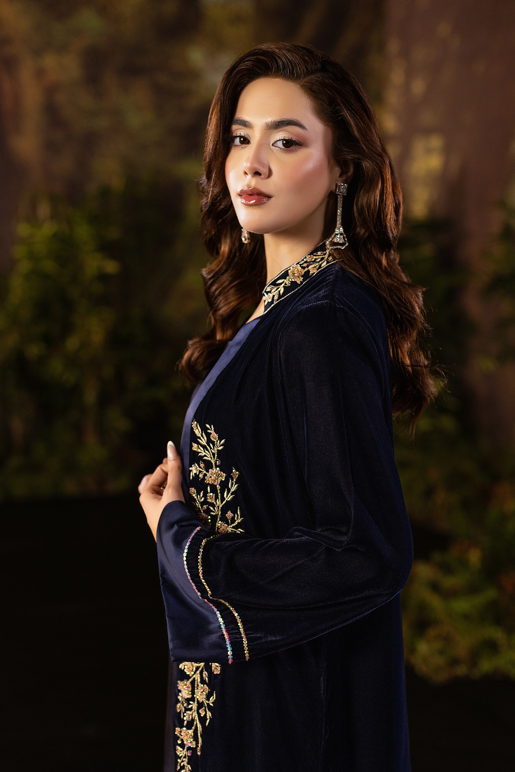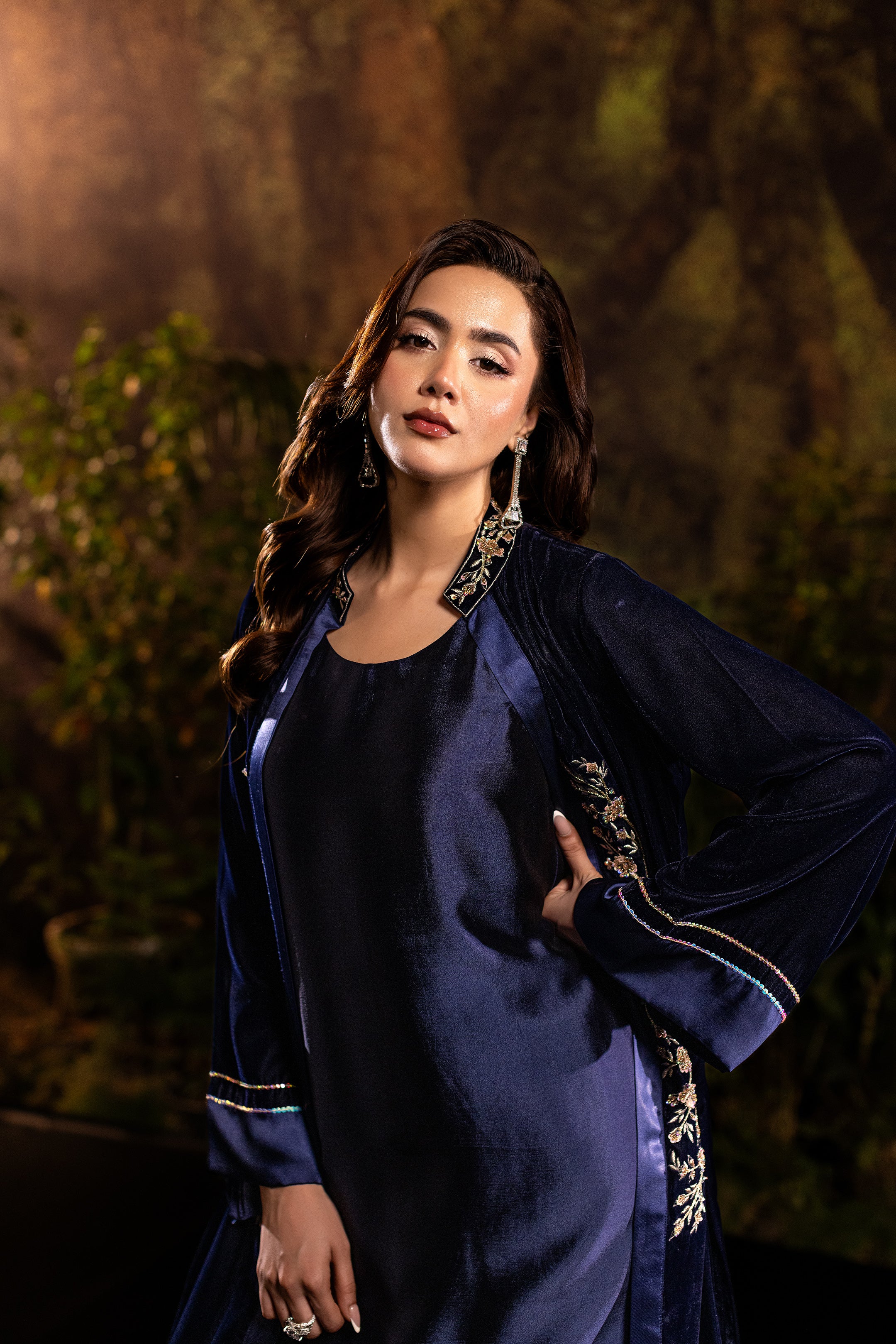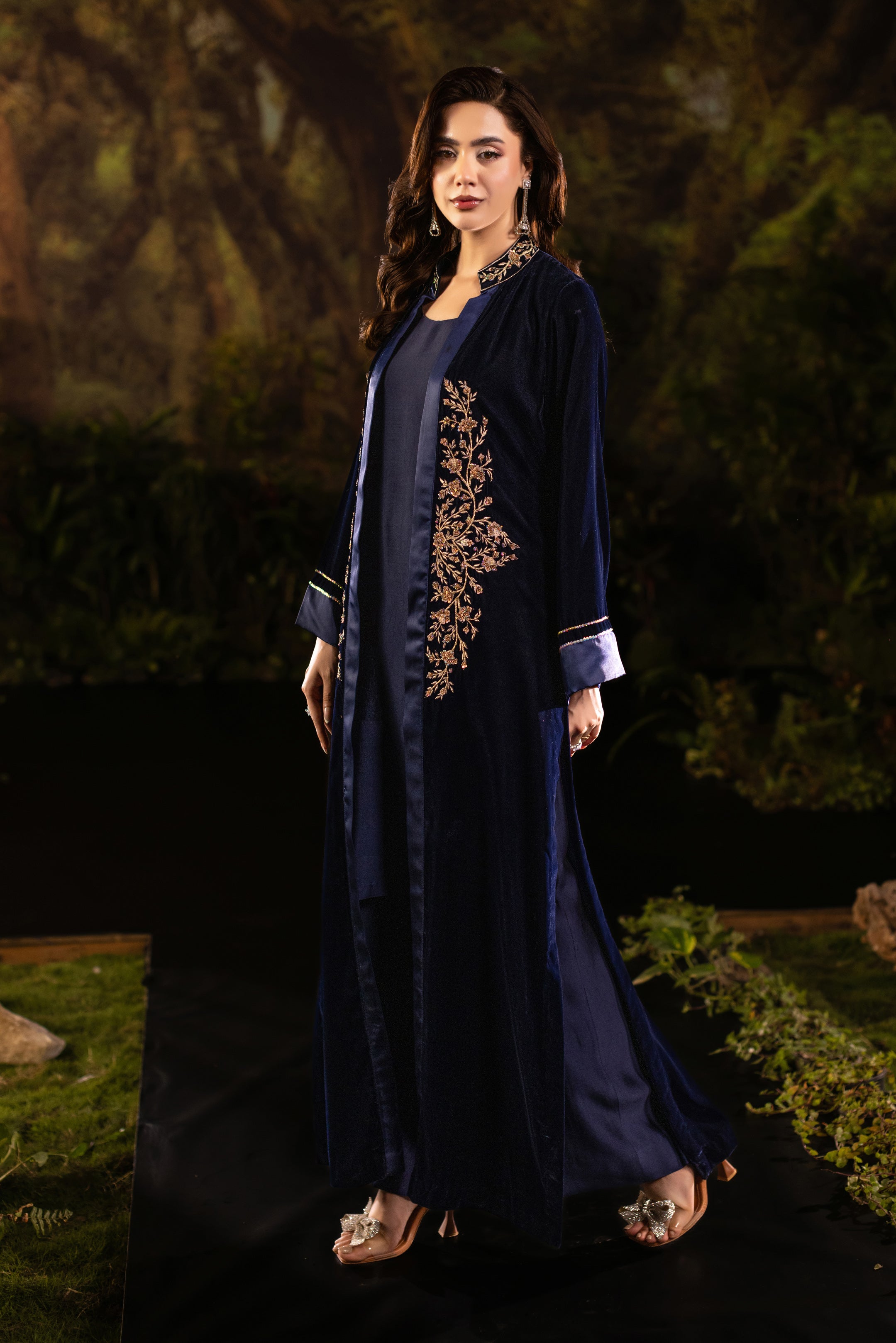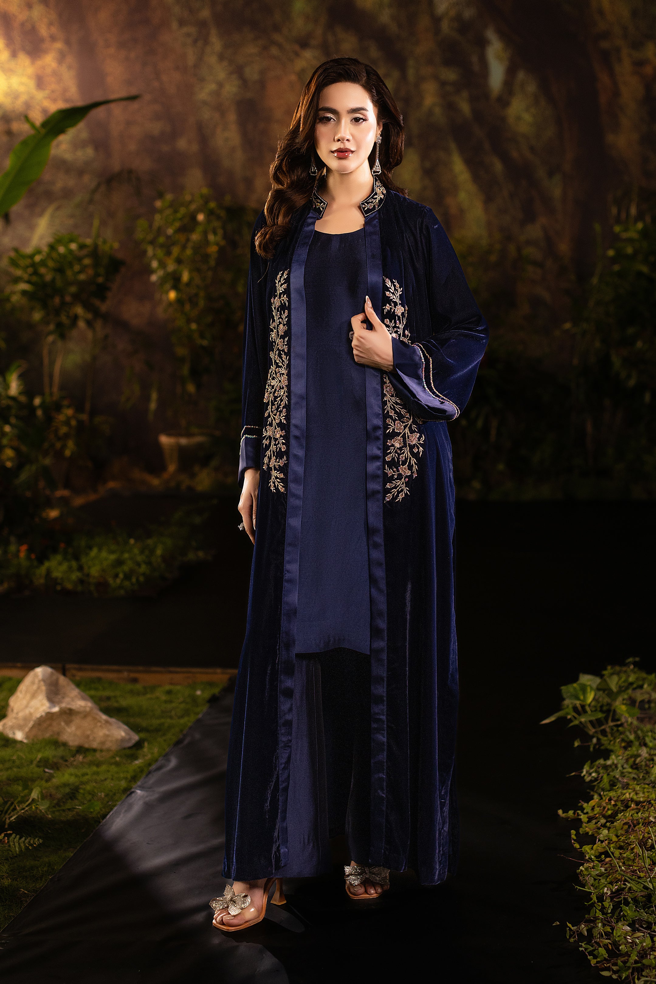 A regal navy blue velvet long jacket, beautifully accented with intricate golden embroidery that climbs delicately along the front panels. The silhouette flows with quiet grandeur, enhanced by the rich sheen of the velvet and satin trims that frame the design. Finished with a high collar and detailed cuffs, and paired with an inner shirt and straight trousers, this piece exudes timeless elegance - perfect for evening occasions where luxury and refinement take centre stage.