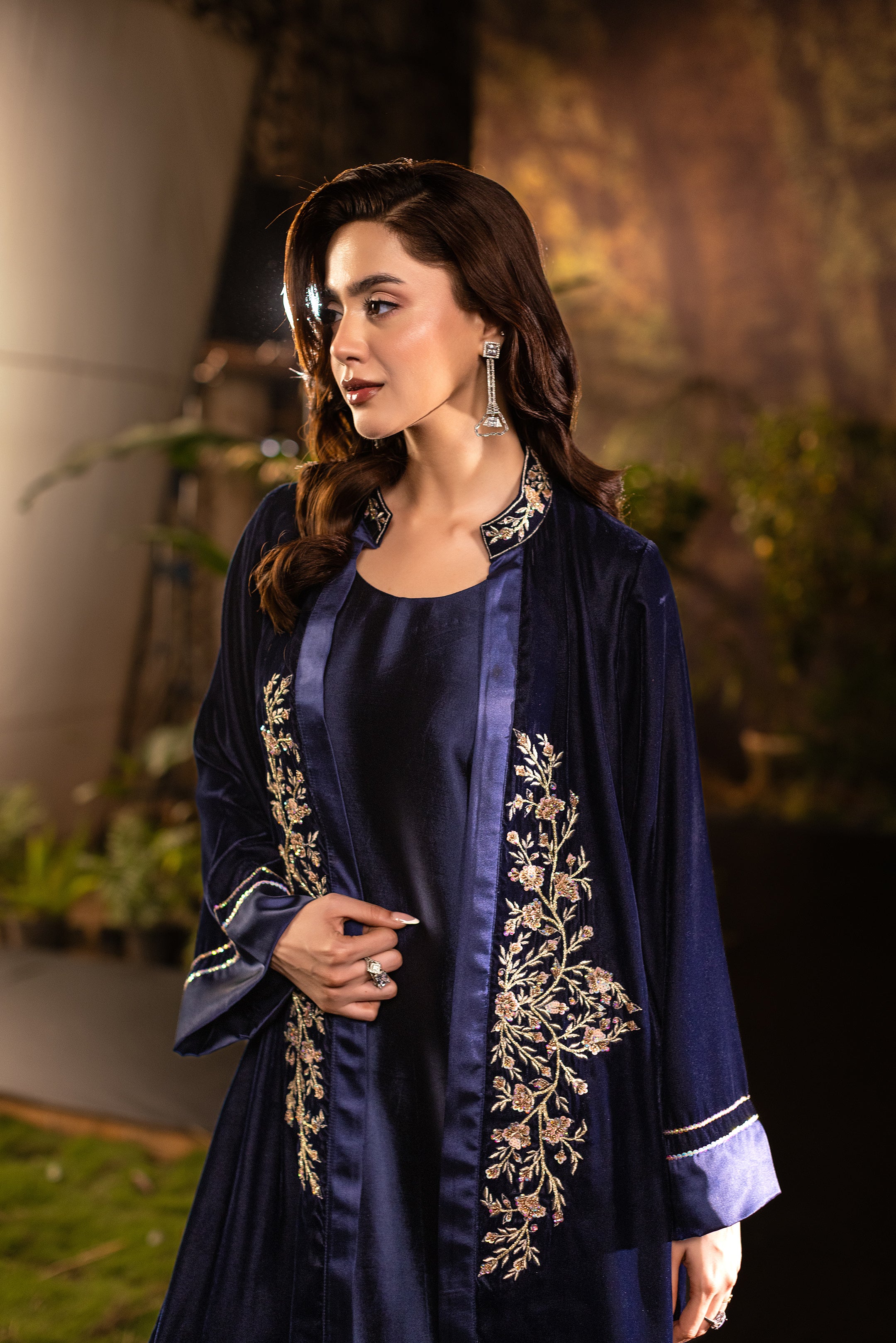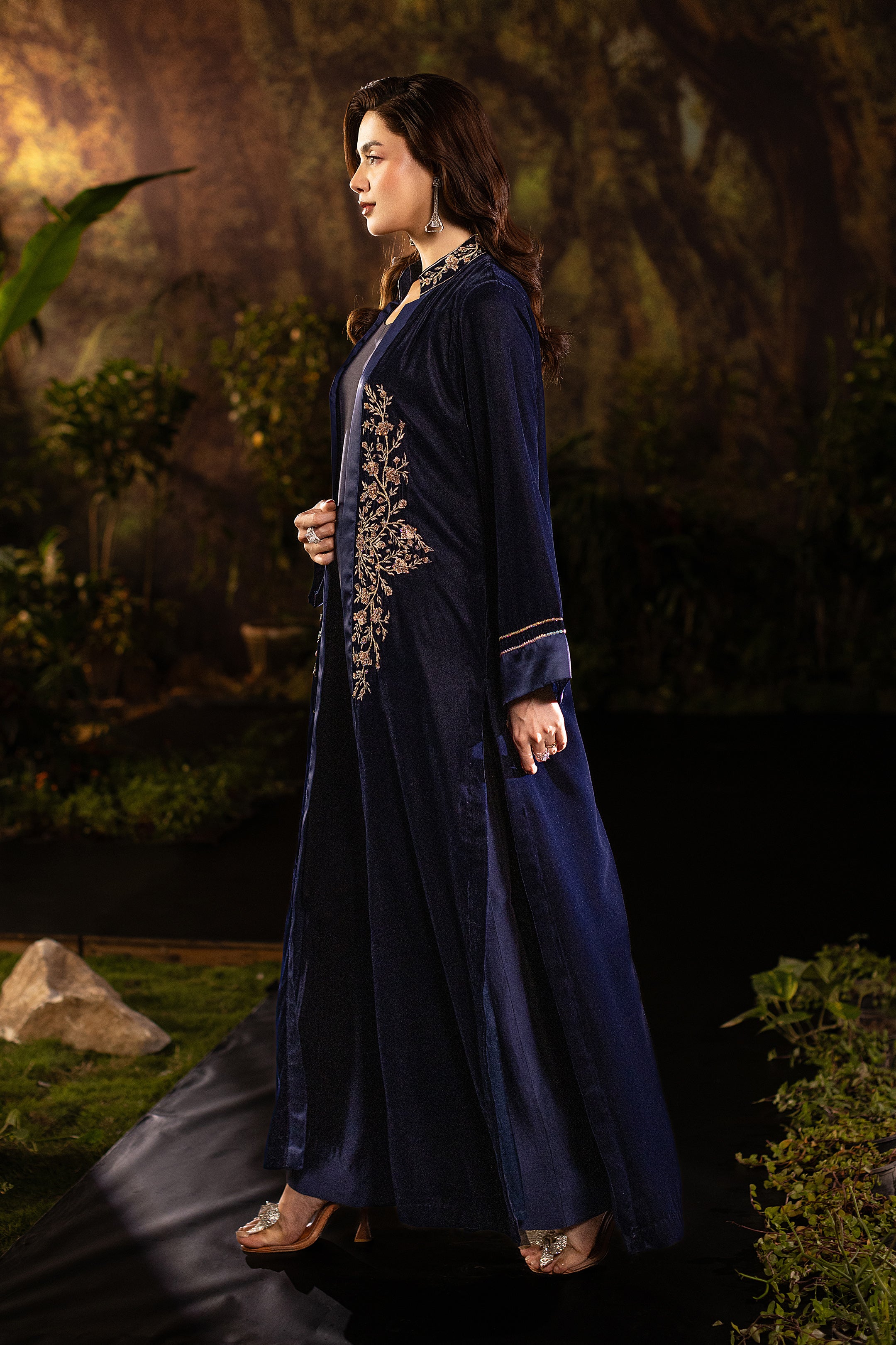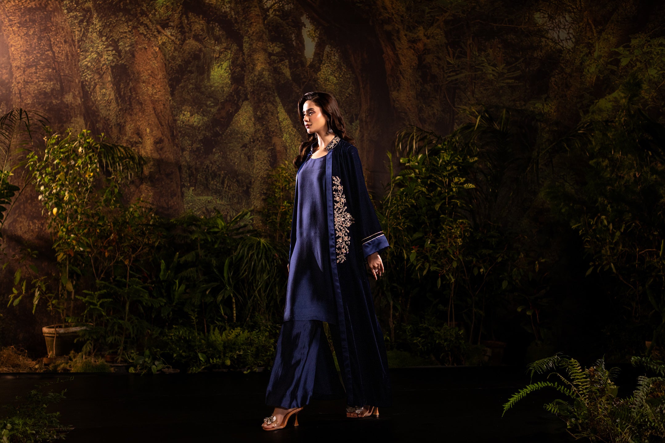 A regal navy blue velvet long jacket, beautifully accented with intricate golden embroidery that climbs delicately along the front panels. The silhouette flows with quiet grandeur, enhanced by the rich sheen of the velvet and satin trims that frame the design. Finished with a high collar and detailed cuffs, and paired with an inner shirt and straight trousers, this piece exudes timeless elegance - perfect for evening occasions where luxury and refinement take centre stage.