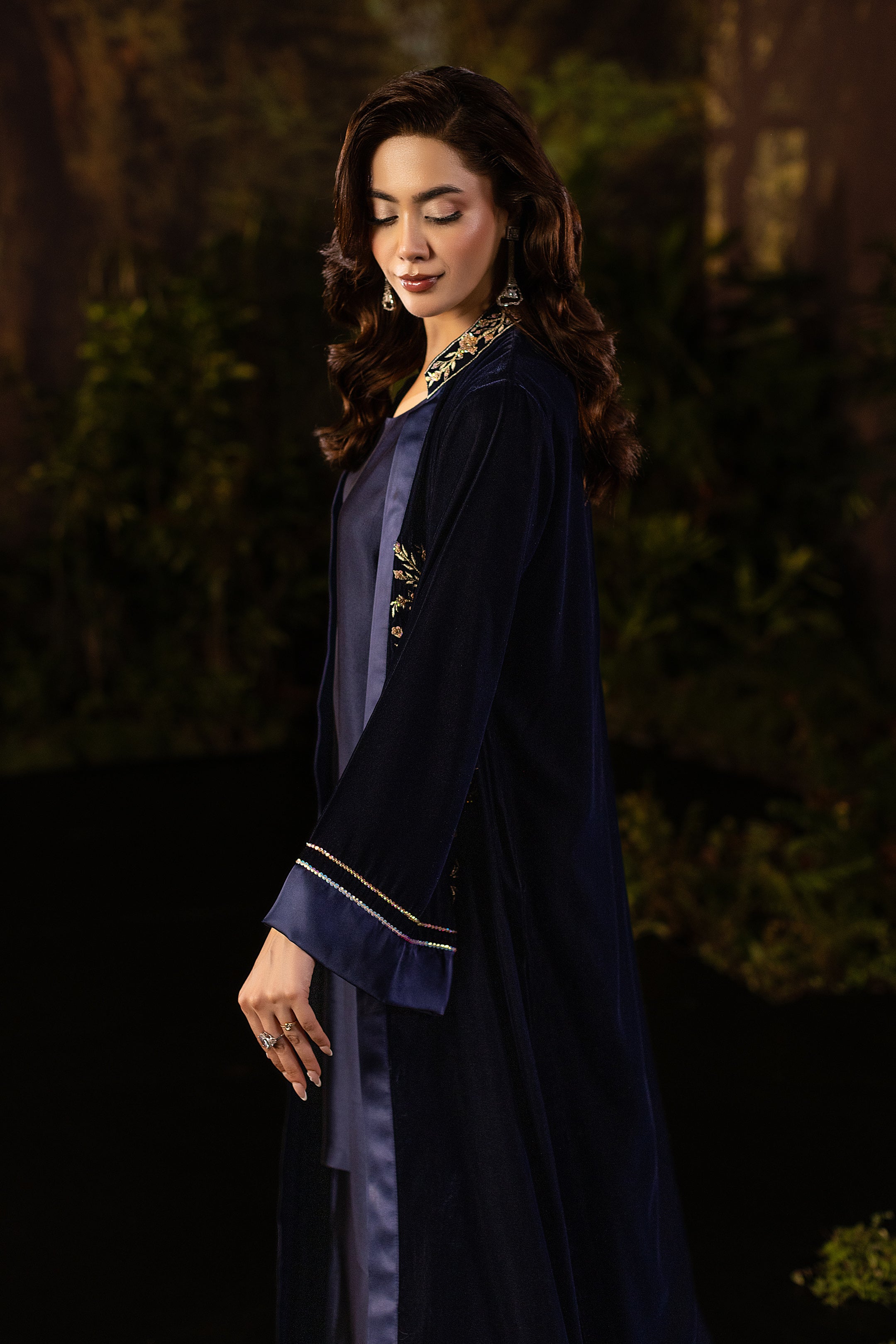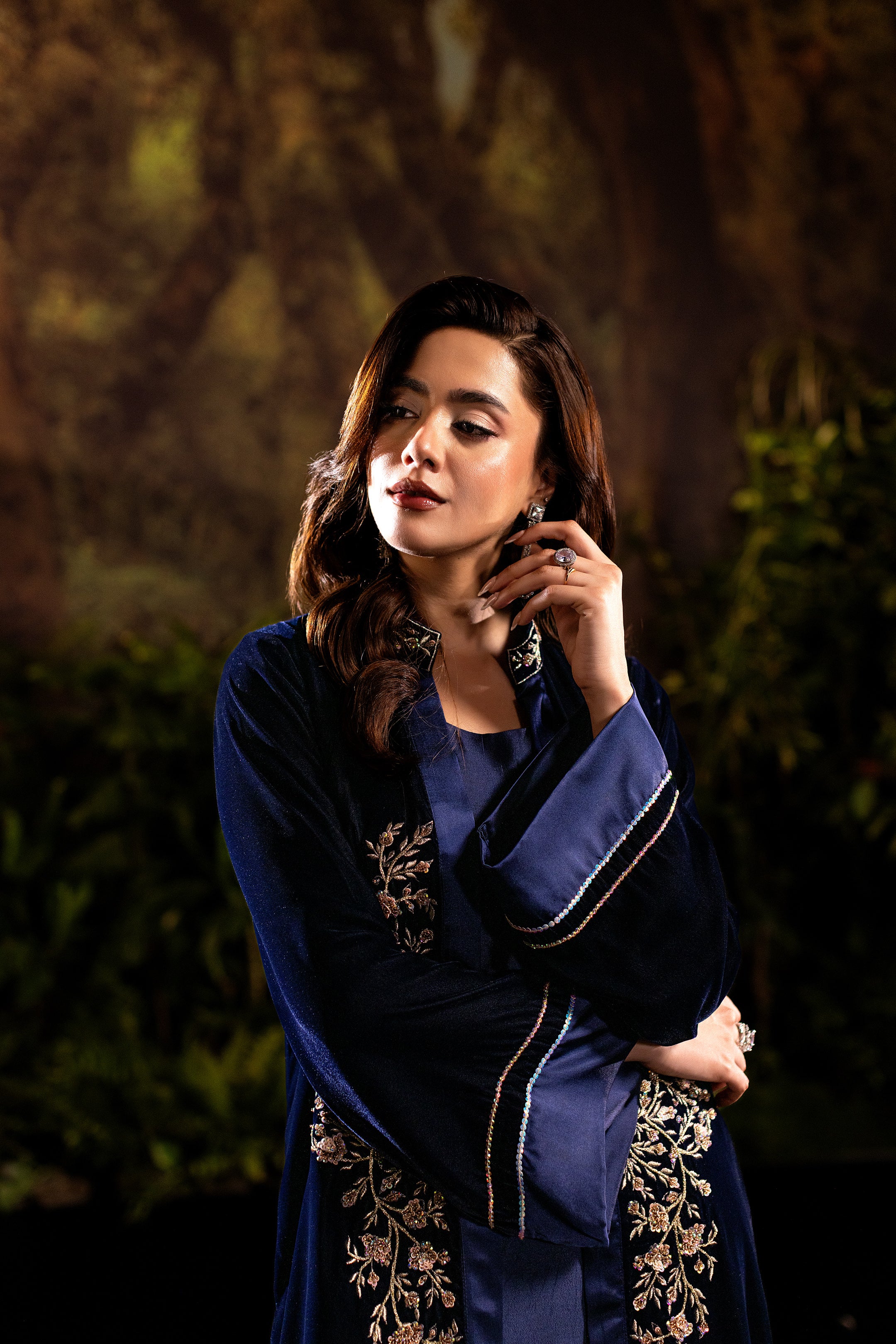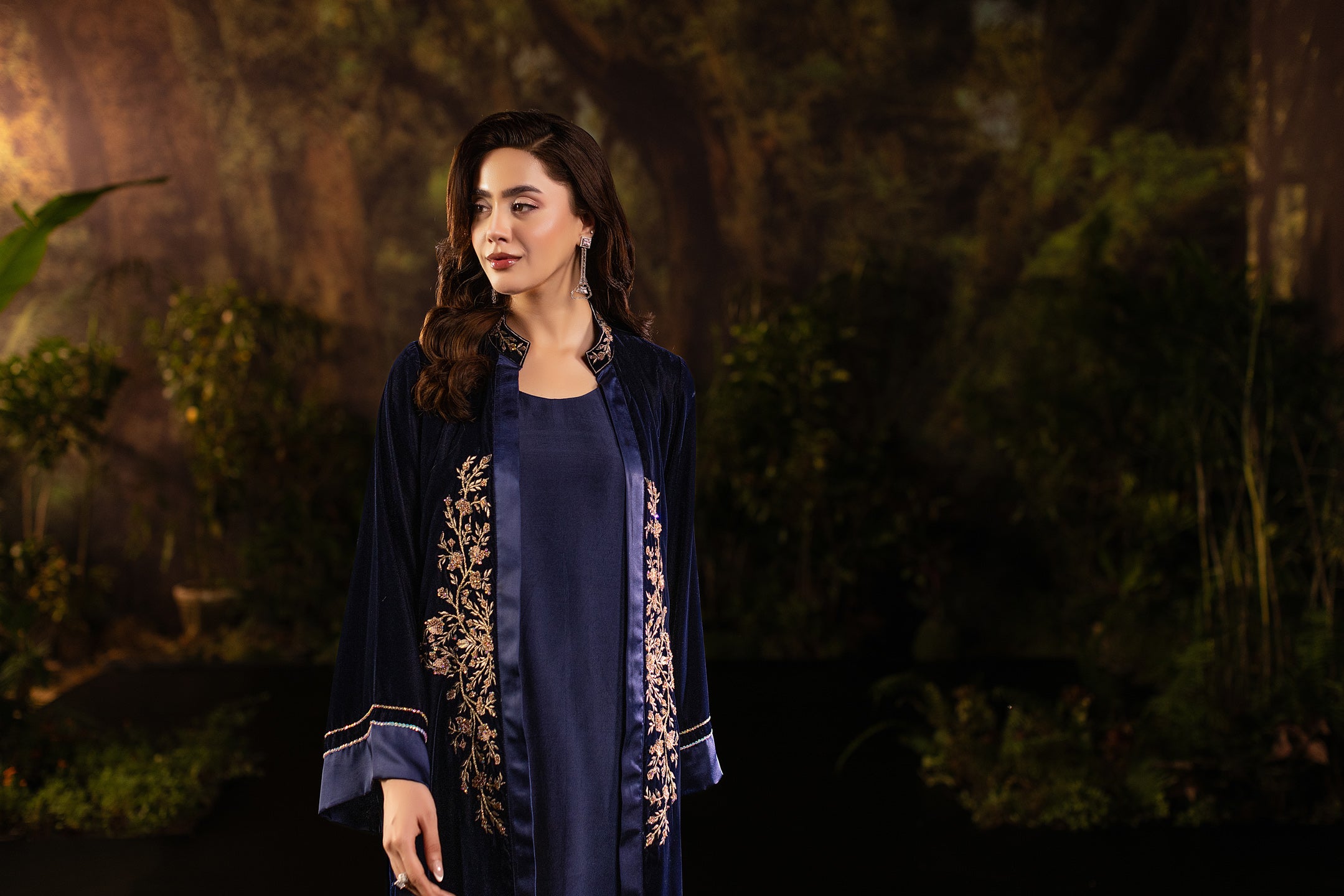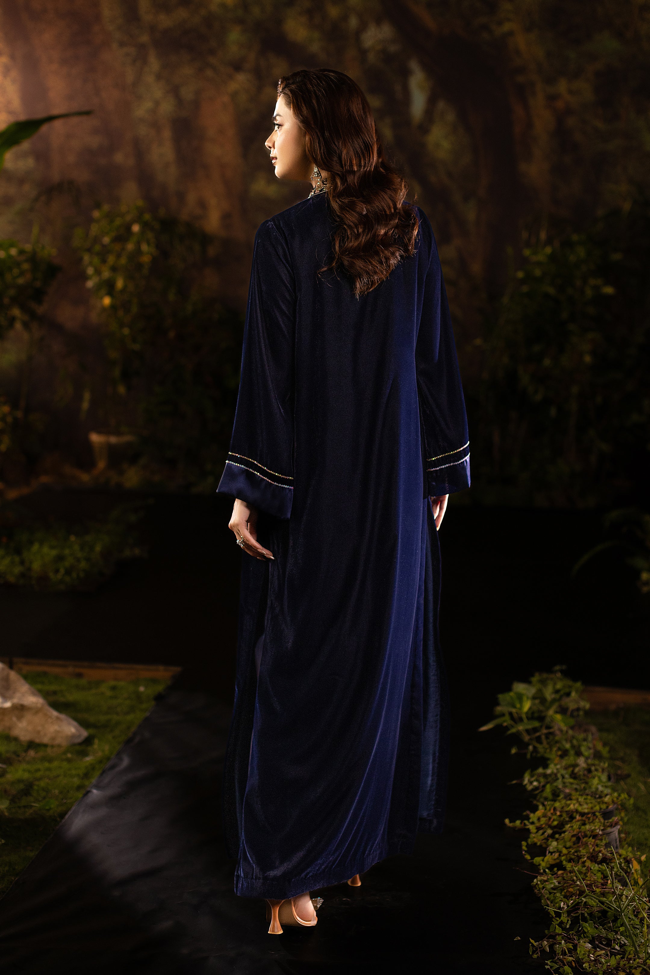 A regal navy blue velvet long jacket, beautifully accented with intricate golden embroidery that climbs delicately along the front panels. The silhouette flows with quiet grandeur, enhanced by the rich sheen of the velvet and satin trims that frame the design. Finished with a high collar and detailed cuffs, and paired with an inner shirt and straight trousers, this piece exudes timeless elegance - perfect for evening occasions where luxury and refinement take centre stage.