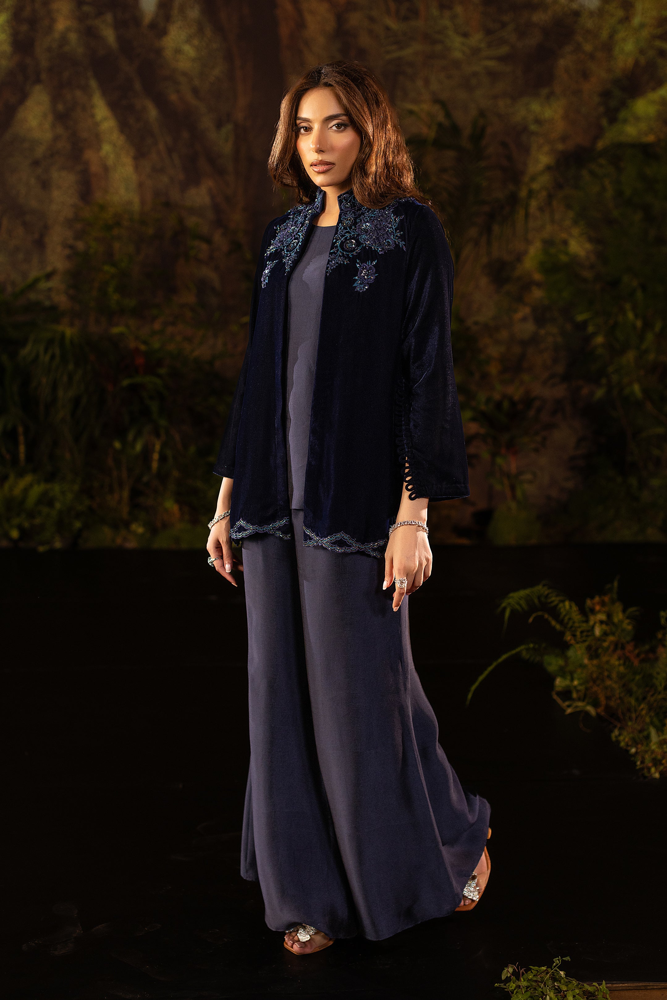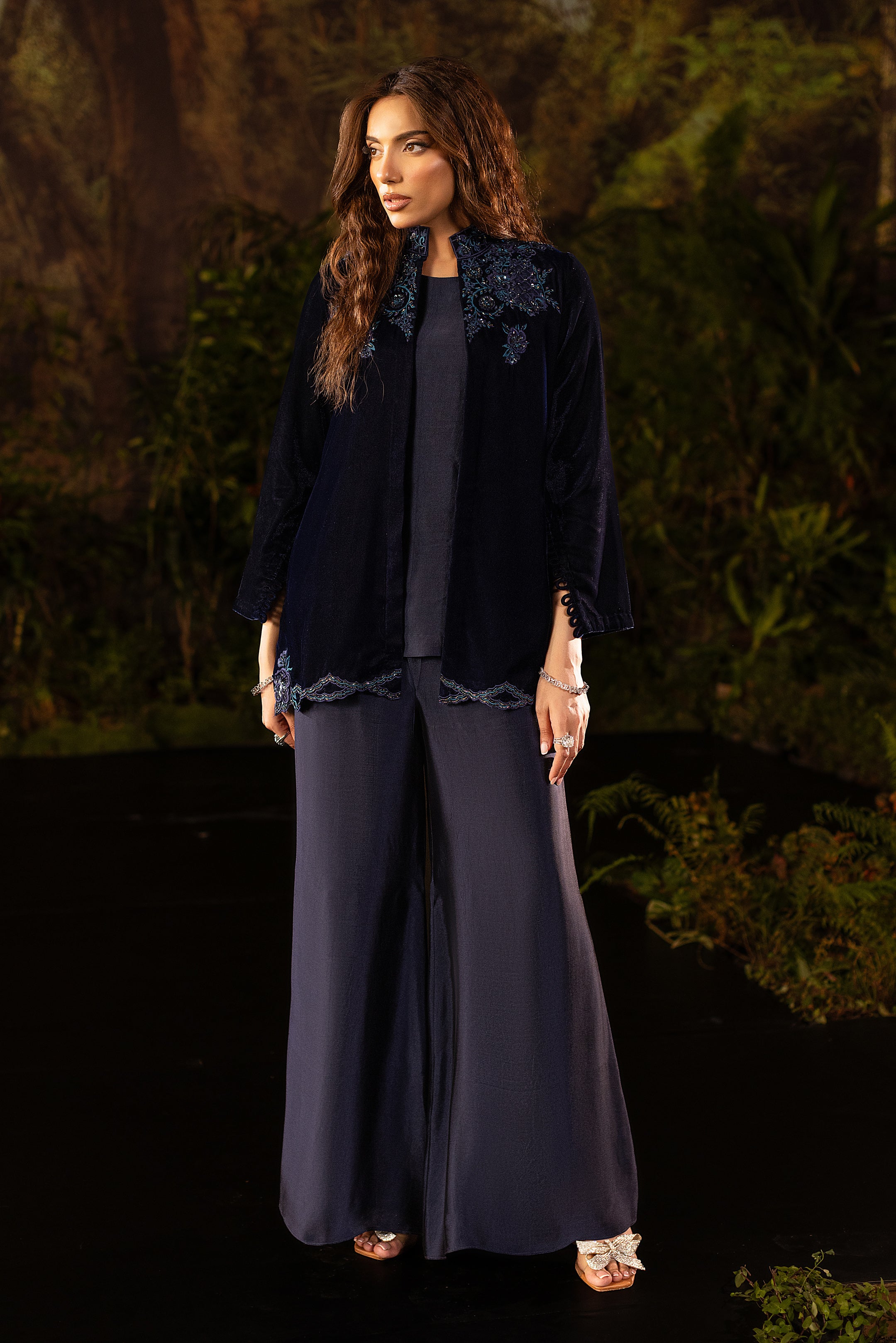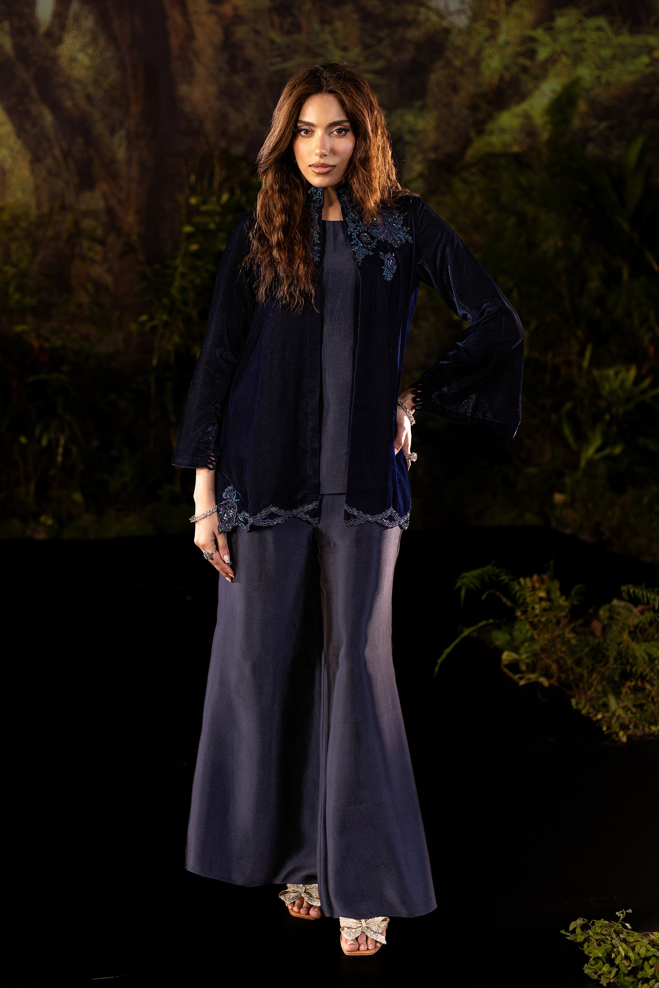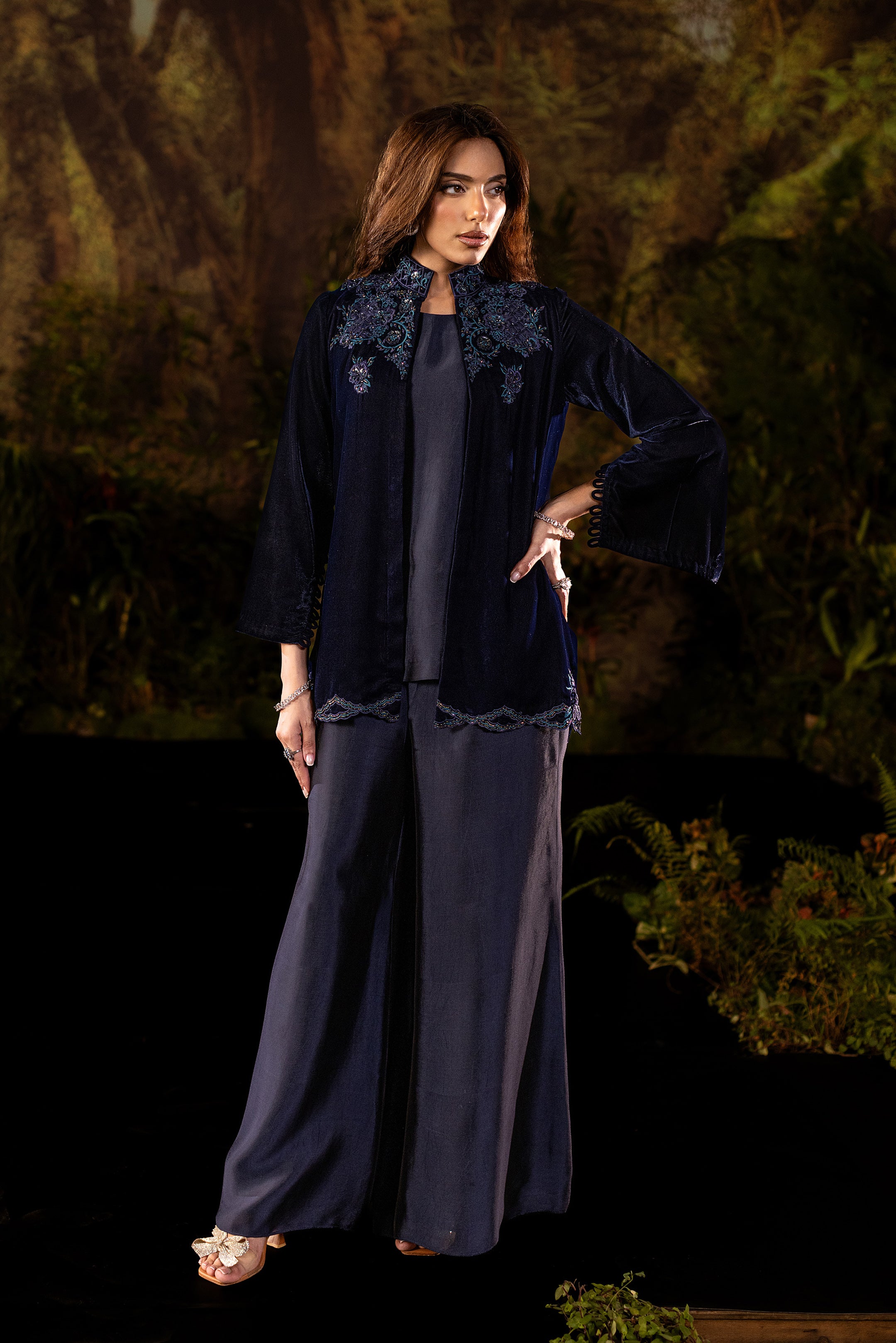 Draped in deep navy velvet, this short jacket exudes understated luxury. The neckline and shoulders are adorned with intricate cutwork embroidery in shimmering sapphire tones, highlighted with delicate beadwork that catches the light with every movement. Subtle floral motifs trail along the hemline, adding a refined flourish to its structured silhouette. Paired with an inner shirt and flared pants, this elegant yet versatile piece layers effortlessly for evening glamour or a chic festive look.