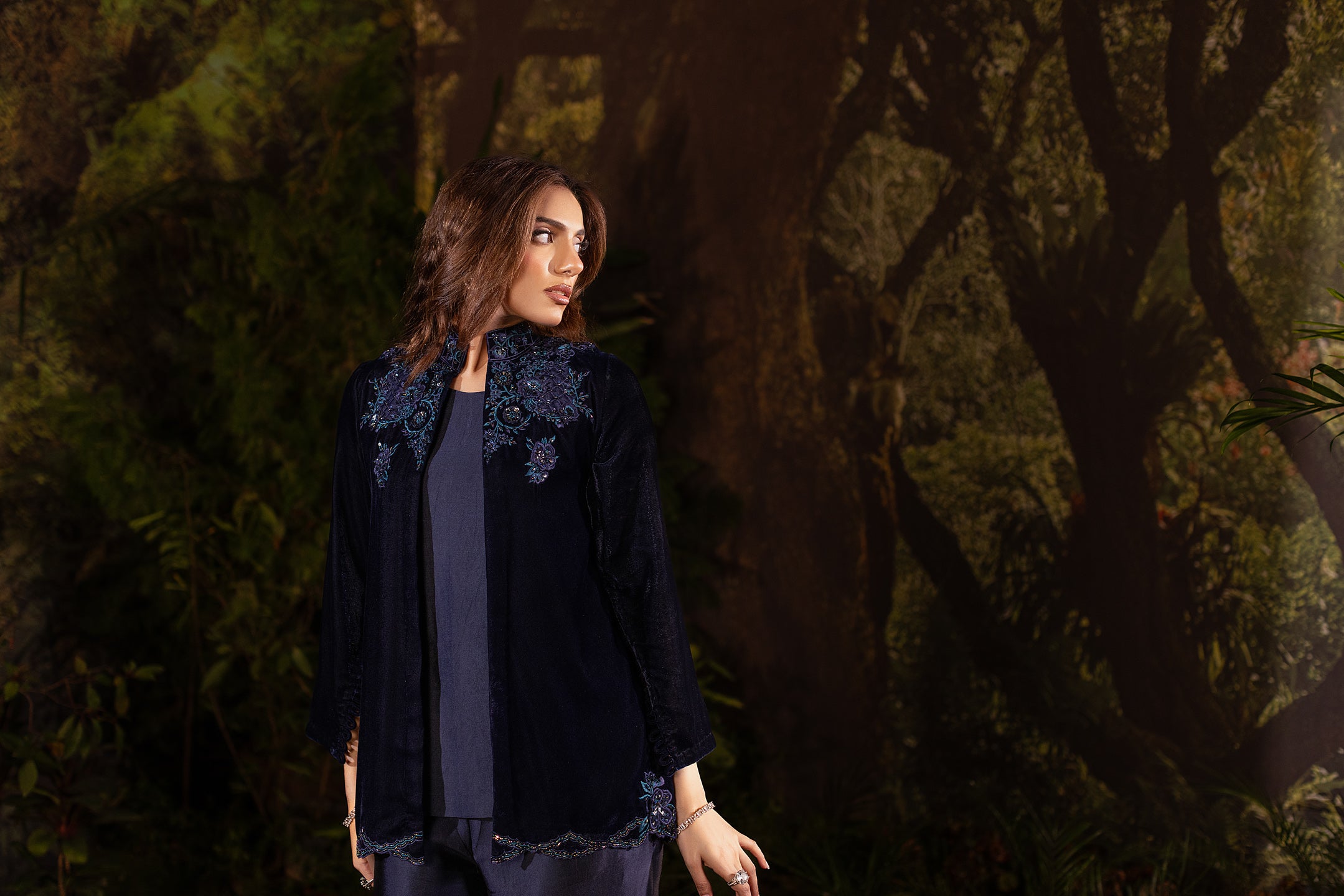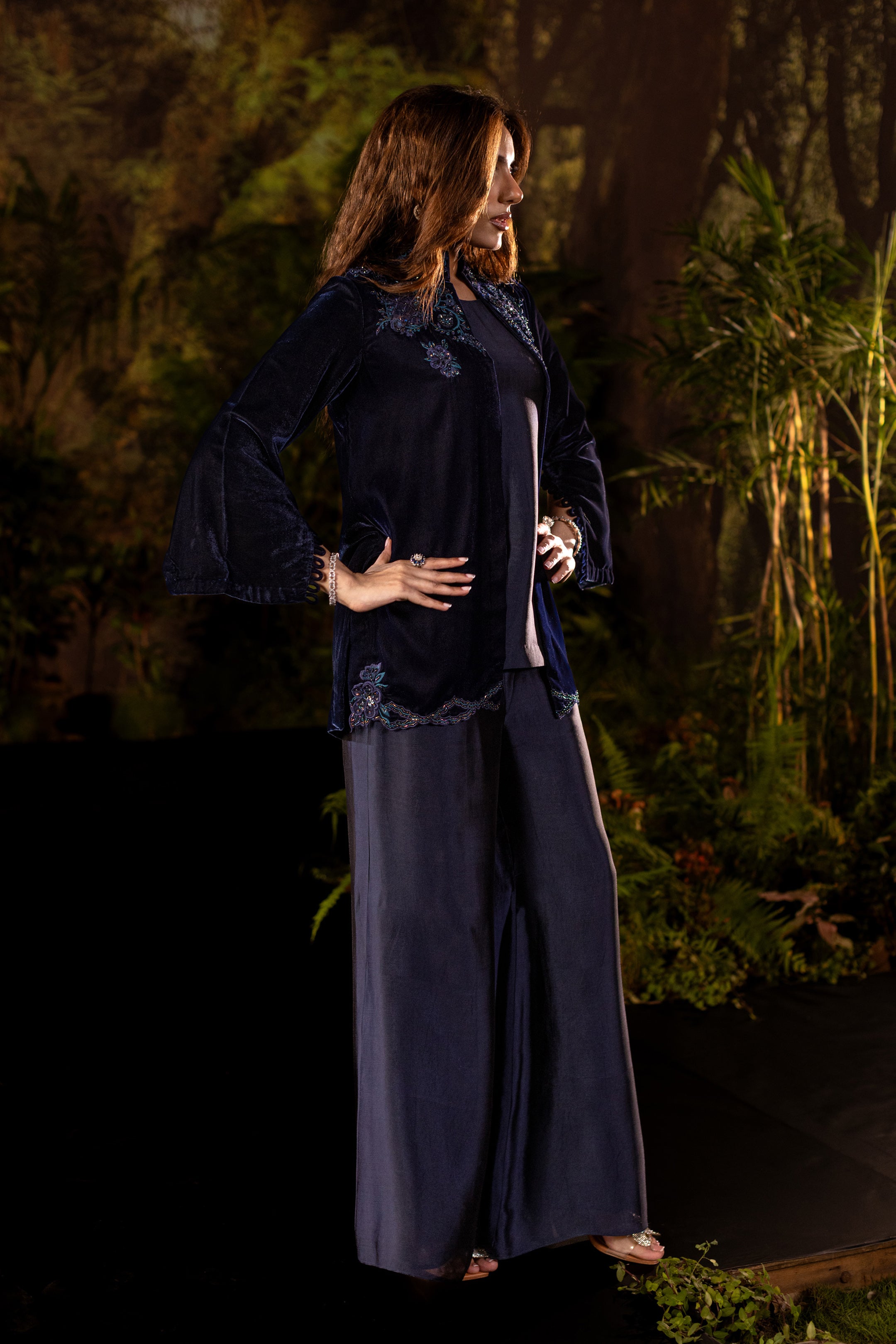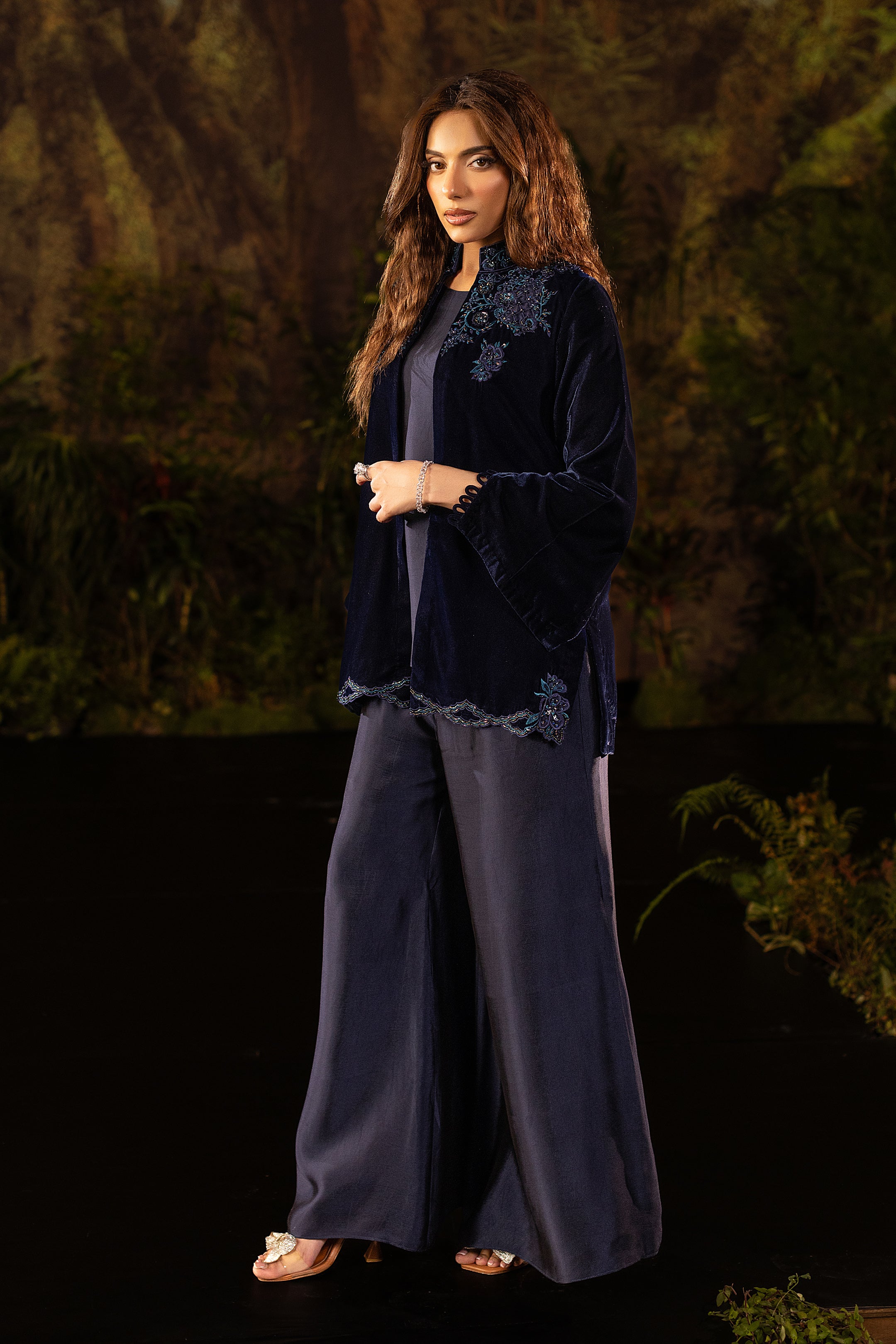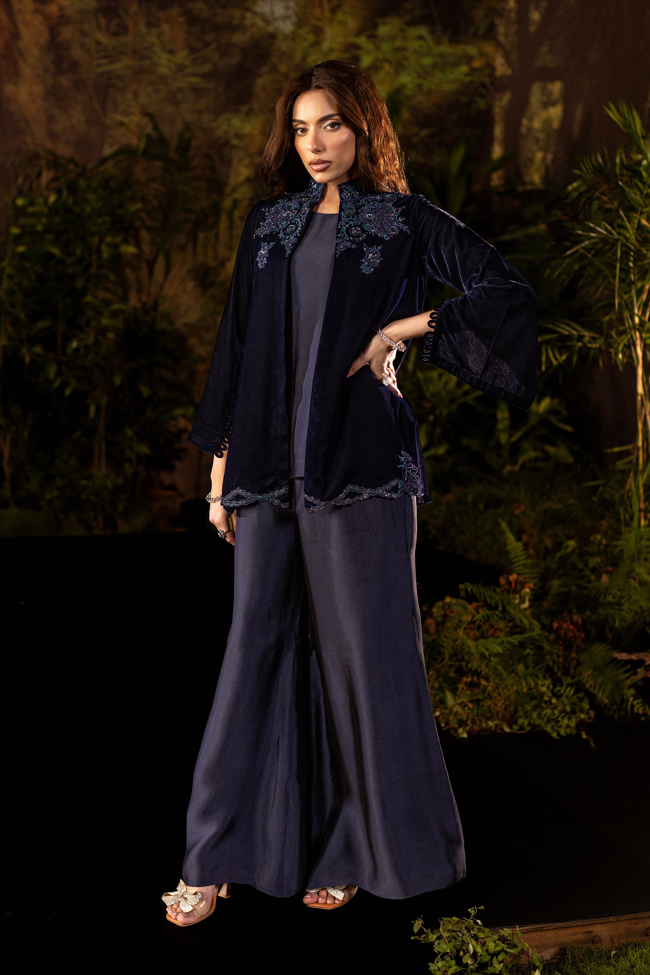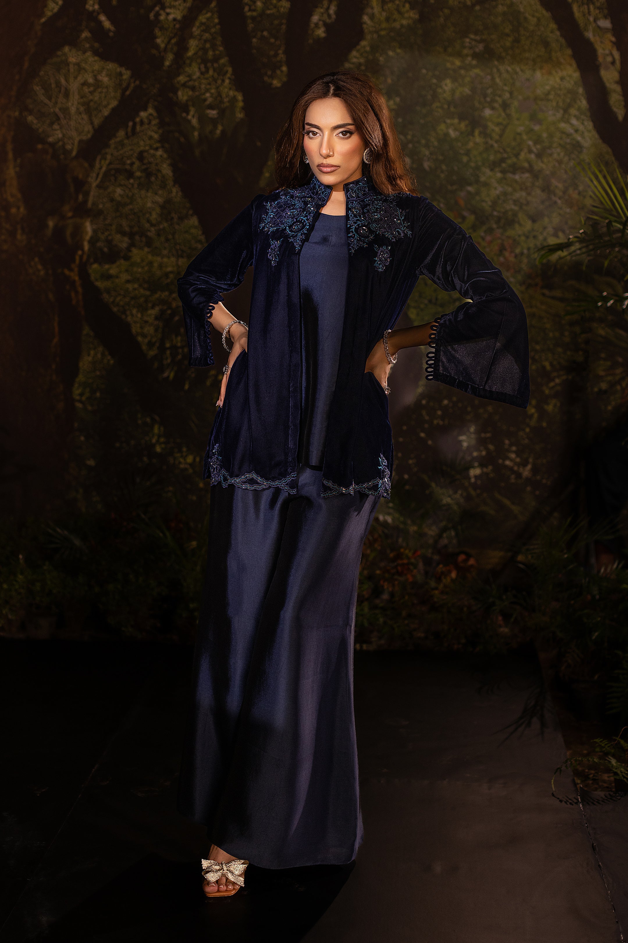 Draped in deep navy velvet, this short jacket exudes understated luxury. The neckline and shoulders are adorned with intricate cutwork embroidery in shimmering sapphire tones, highlighted with delicate beadwork that catches the light with every movement. Subtle floral motifs trail along the hemline, adding a refined flourish to its structured silhouette. Paired with an inner shirt and flared pants, this elegant yet versatile piece layers effortlessly for evening glamour or a chic festive look.
