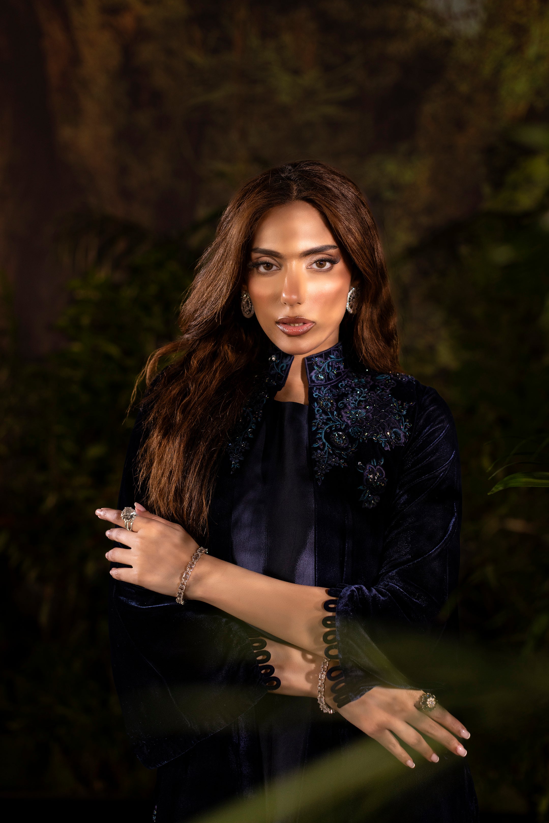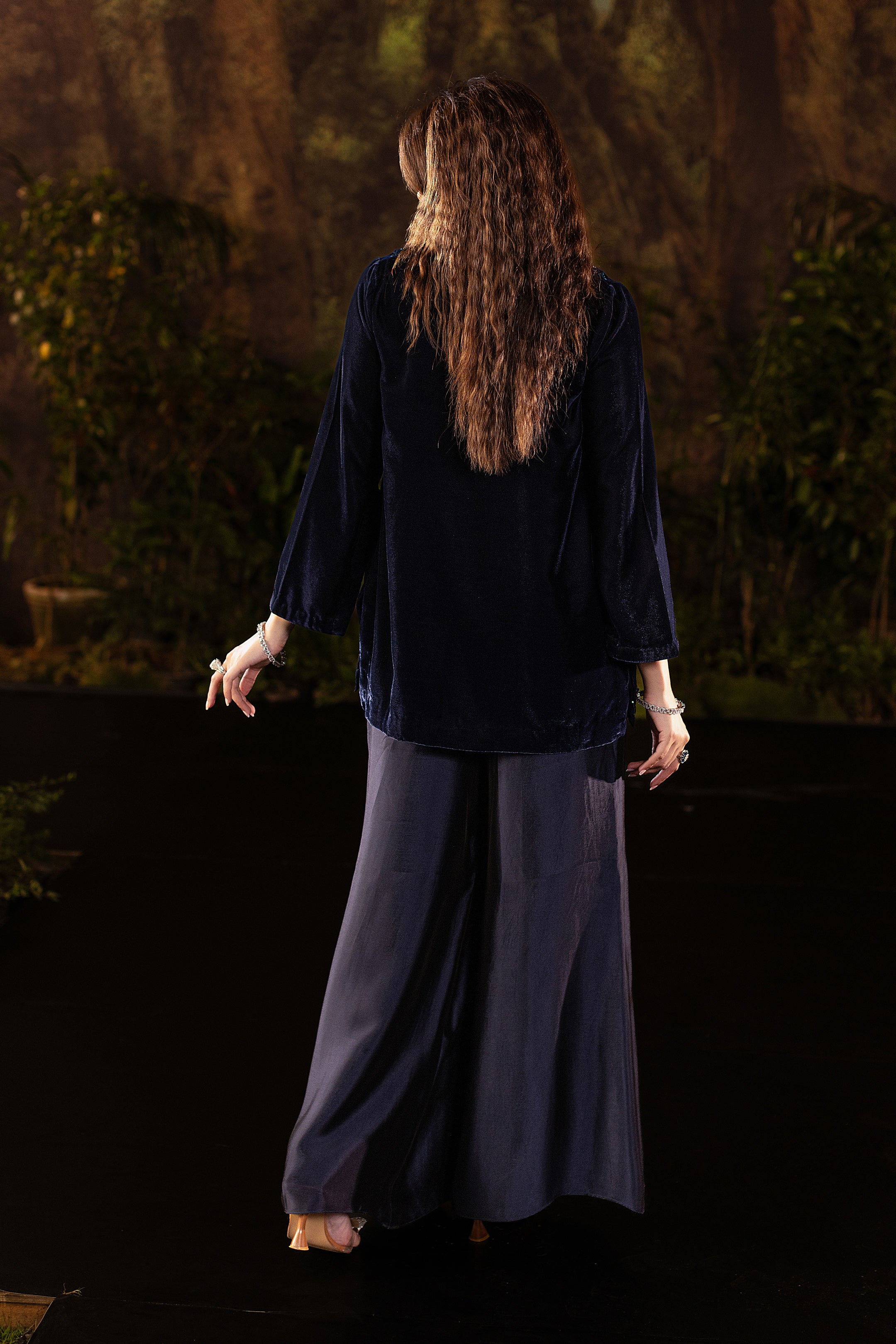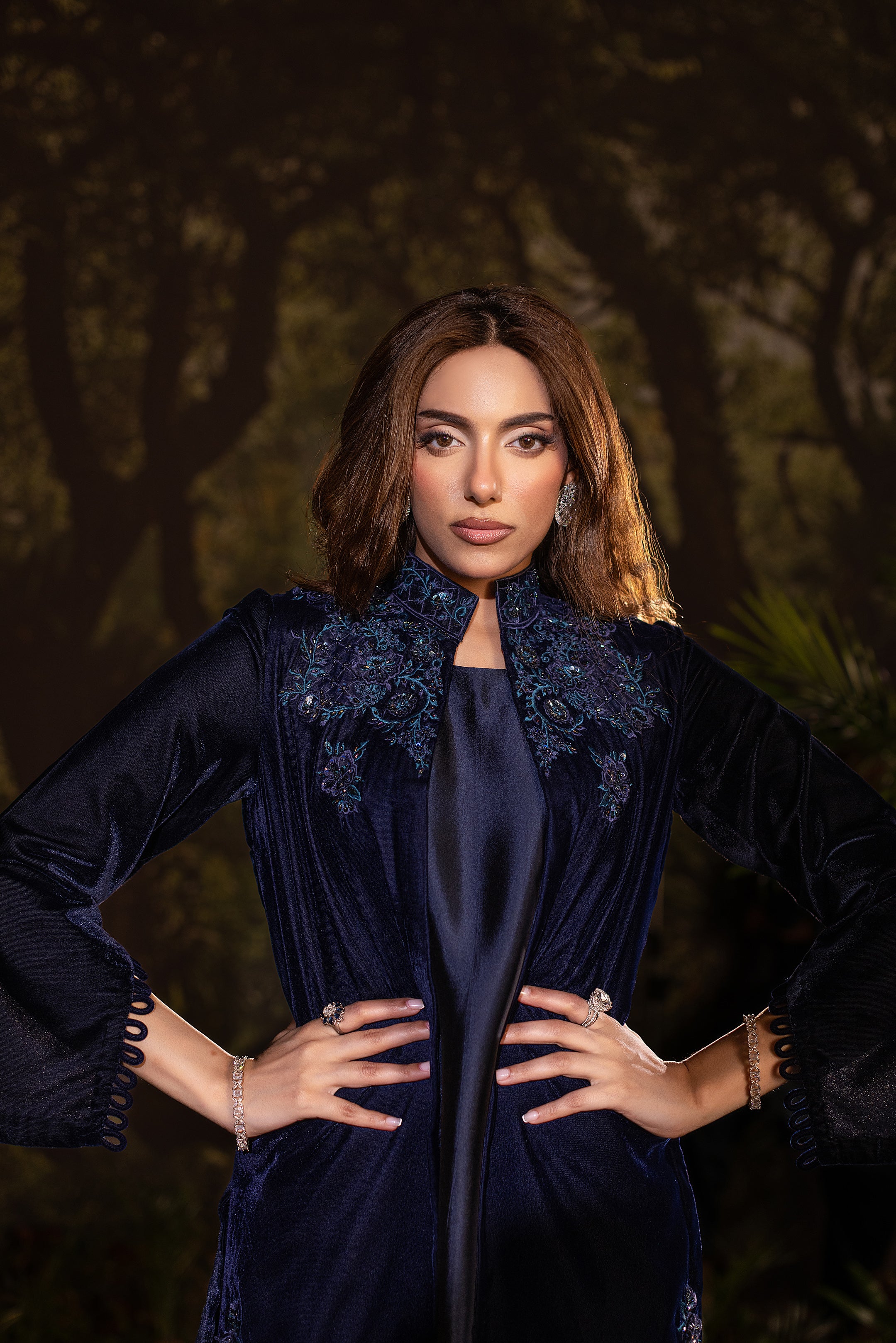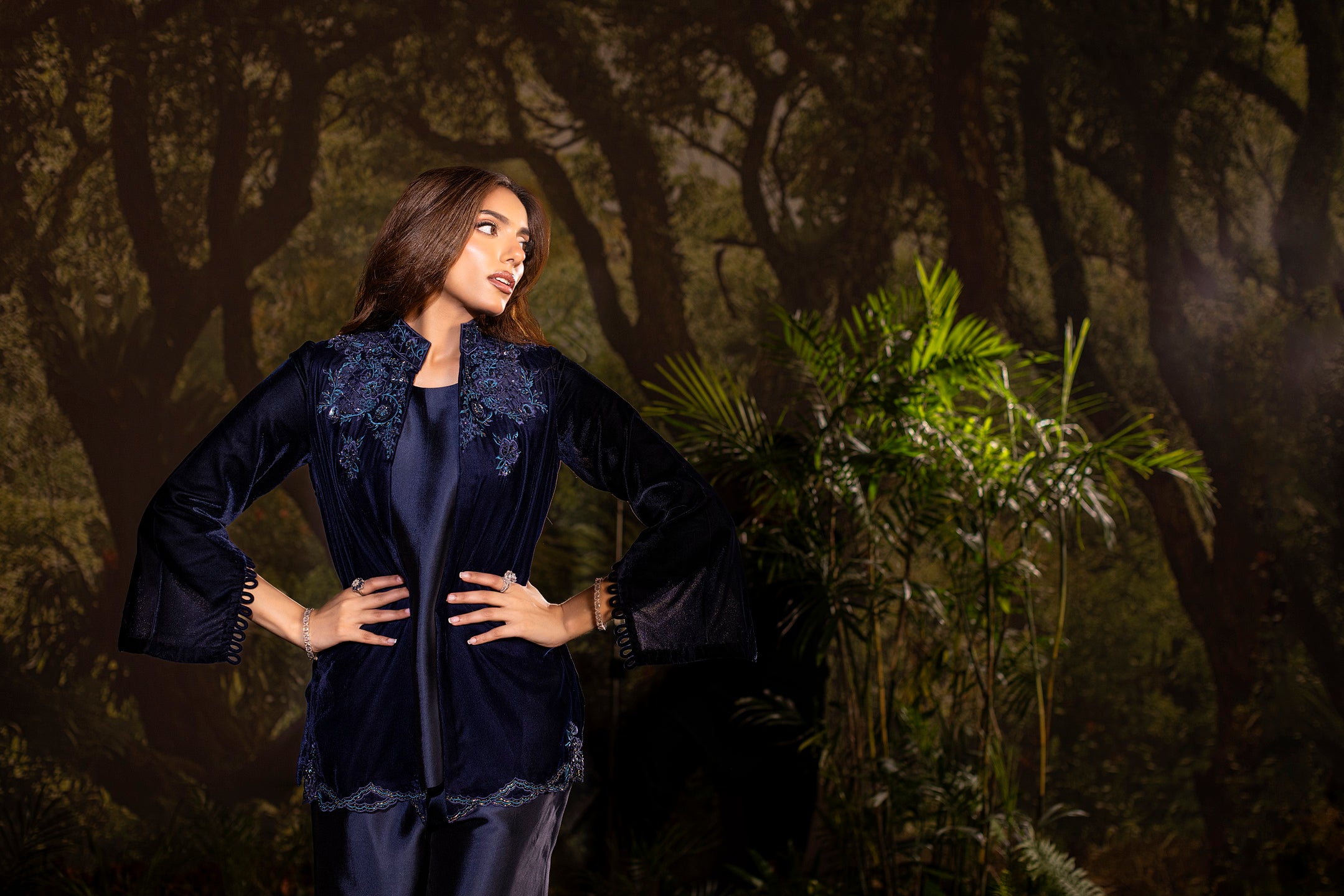Draped in deep navy velvet, this short jacket exudes understated luxury. The neckline and shoulders are adorned with intricate cutwork embroidery in shimmering sapphire tones, highlighted with delicate beadwork that catches the light with every movement. Subtle floral motifs trail along the hemline, adding a refined flourish to its structured silhouette. Paired with an inner shirt and flared pants, this elegant yet versatile piece layers effortlessly for evening glamour or a chic festive look.