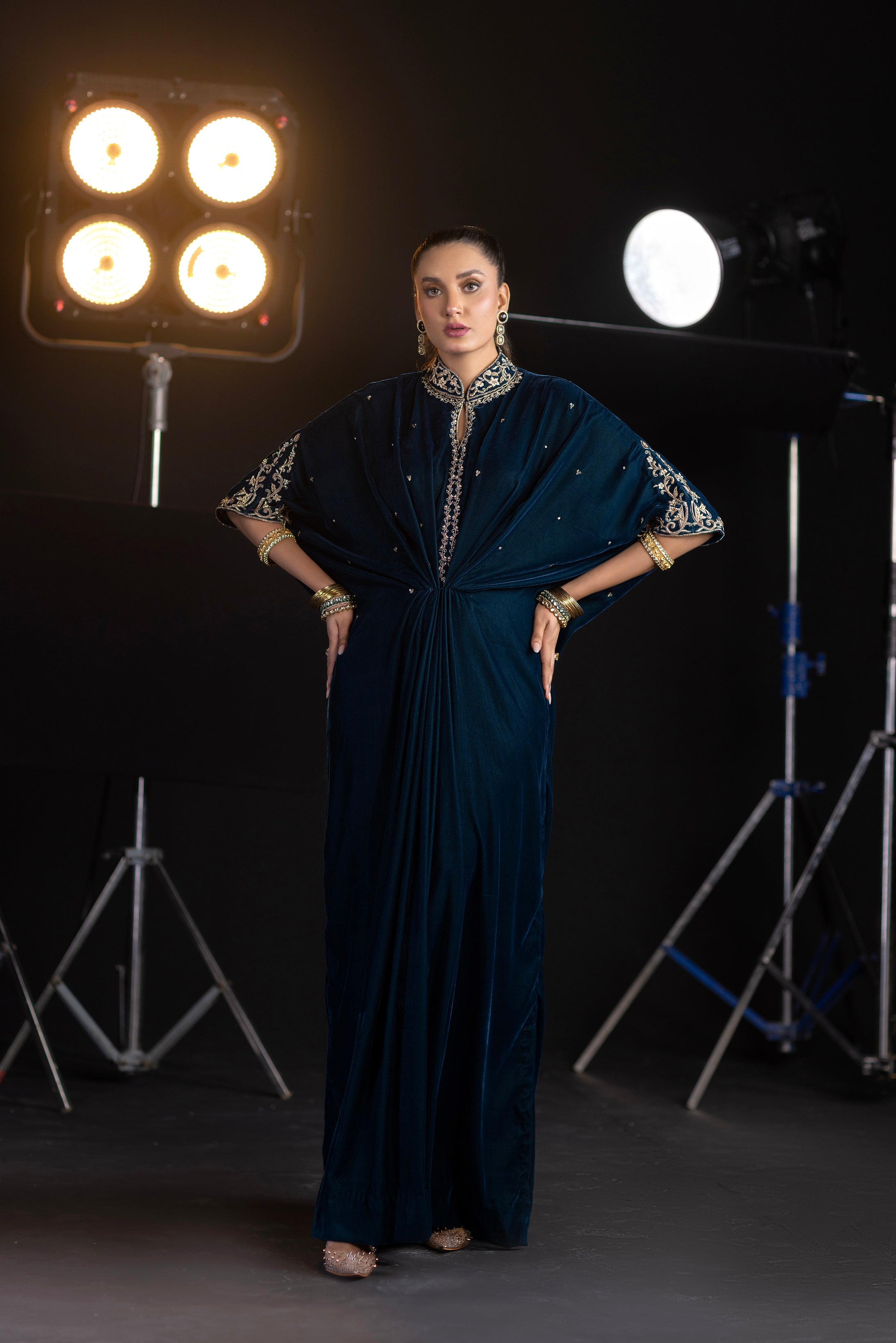 The defining feature of this luxurious teal velvet kaftan is the intricate embroidery with elaborate patterns meticulously embroidered on the neck ban and front, creating a striking visual effect that immediately draws attention to the neckline. The embroidery on the sleeves adds further detailing and complements the overall design. Colour: Teal Fabric: Velvet Model Height: 5ft 9". Model is wearing: Free Size (One Size Fits All) |