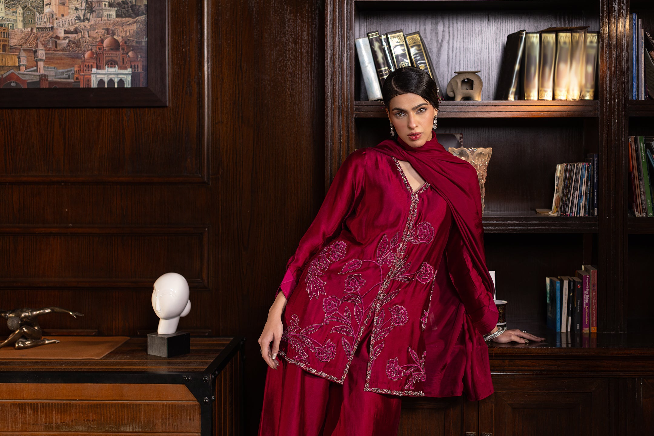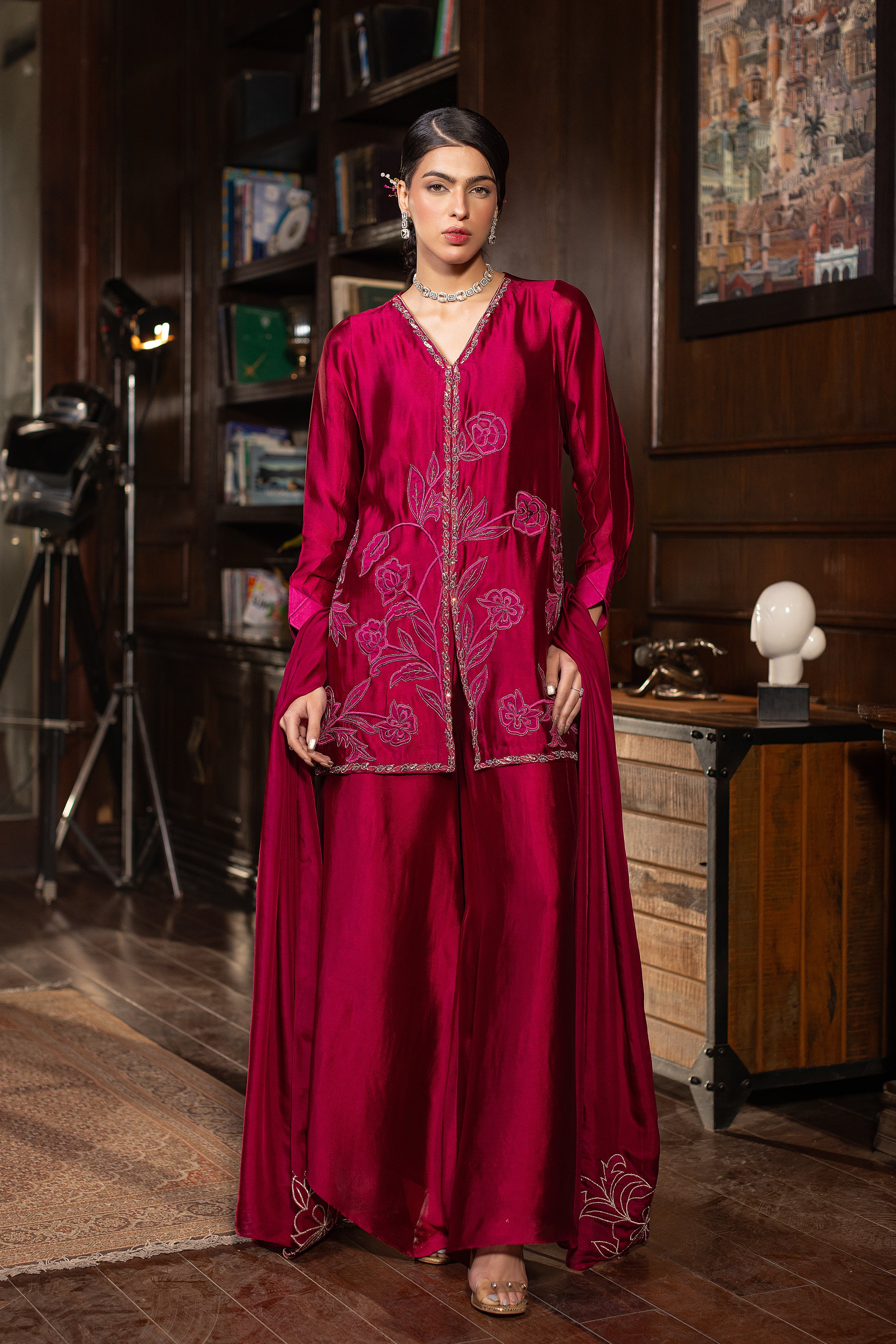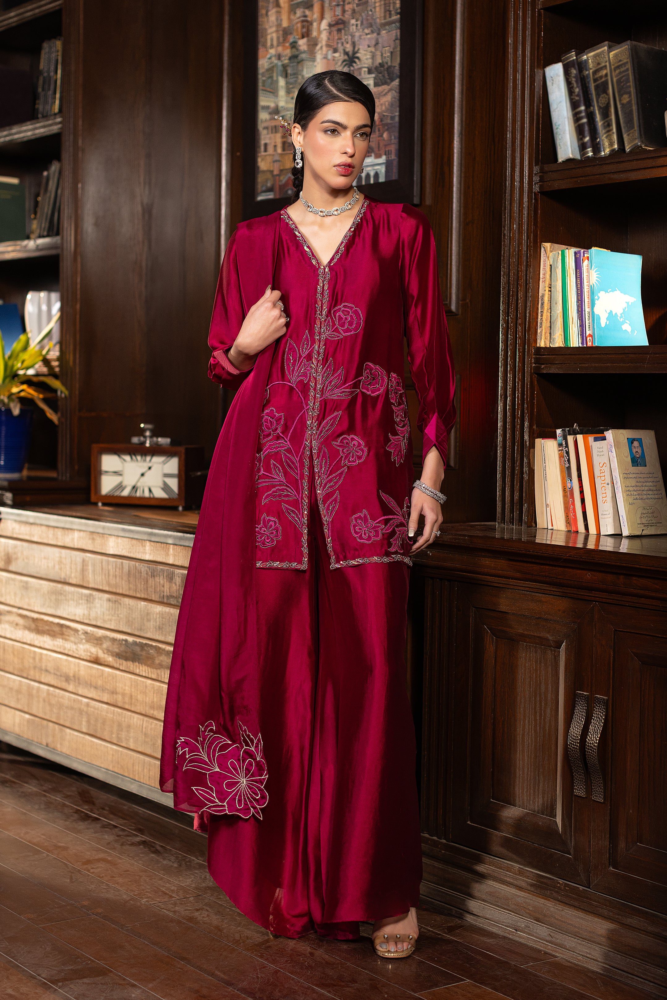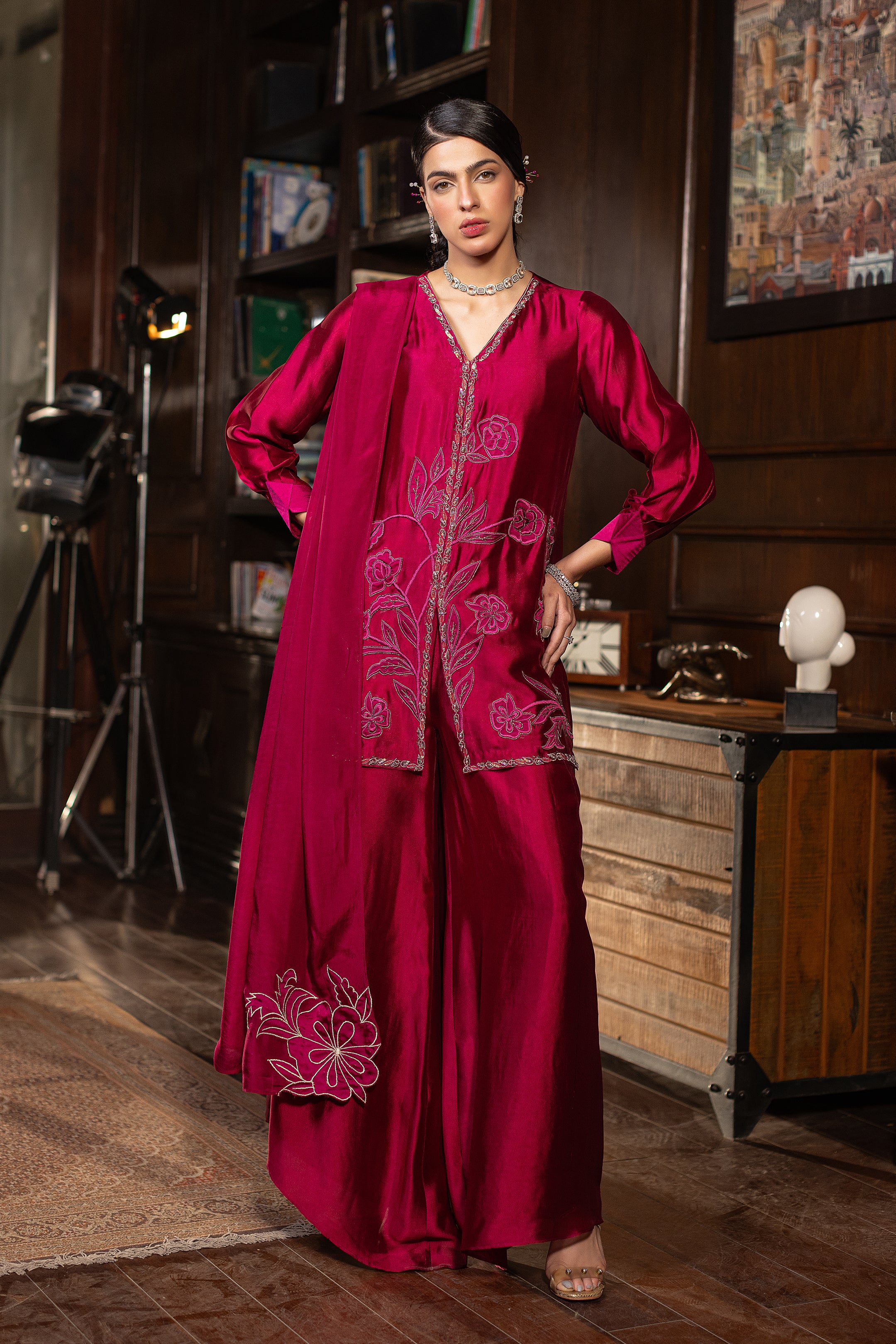 Roselyn shines in a vibrant magenta hue, exuding lively elegance. The silhouette is adorned with intricate appliqué work and delicate hand embroidery, creating a rich, textured finish. Paired with flared trousers for a graceful look, the outfit is completed with an embroidered dupatta, adding a refined and sophisticated touch.