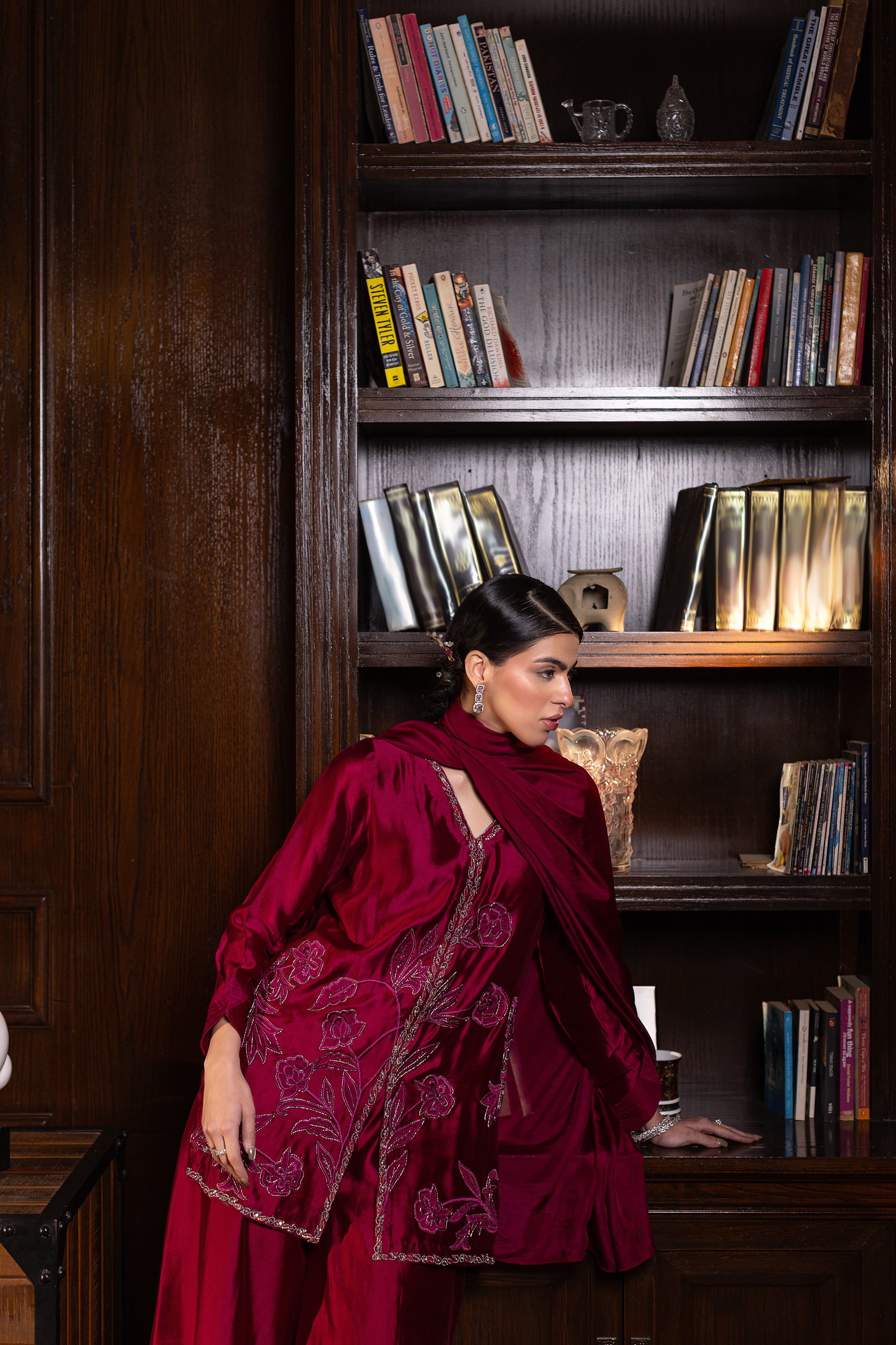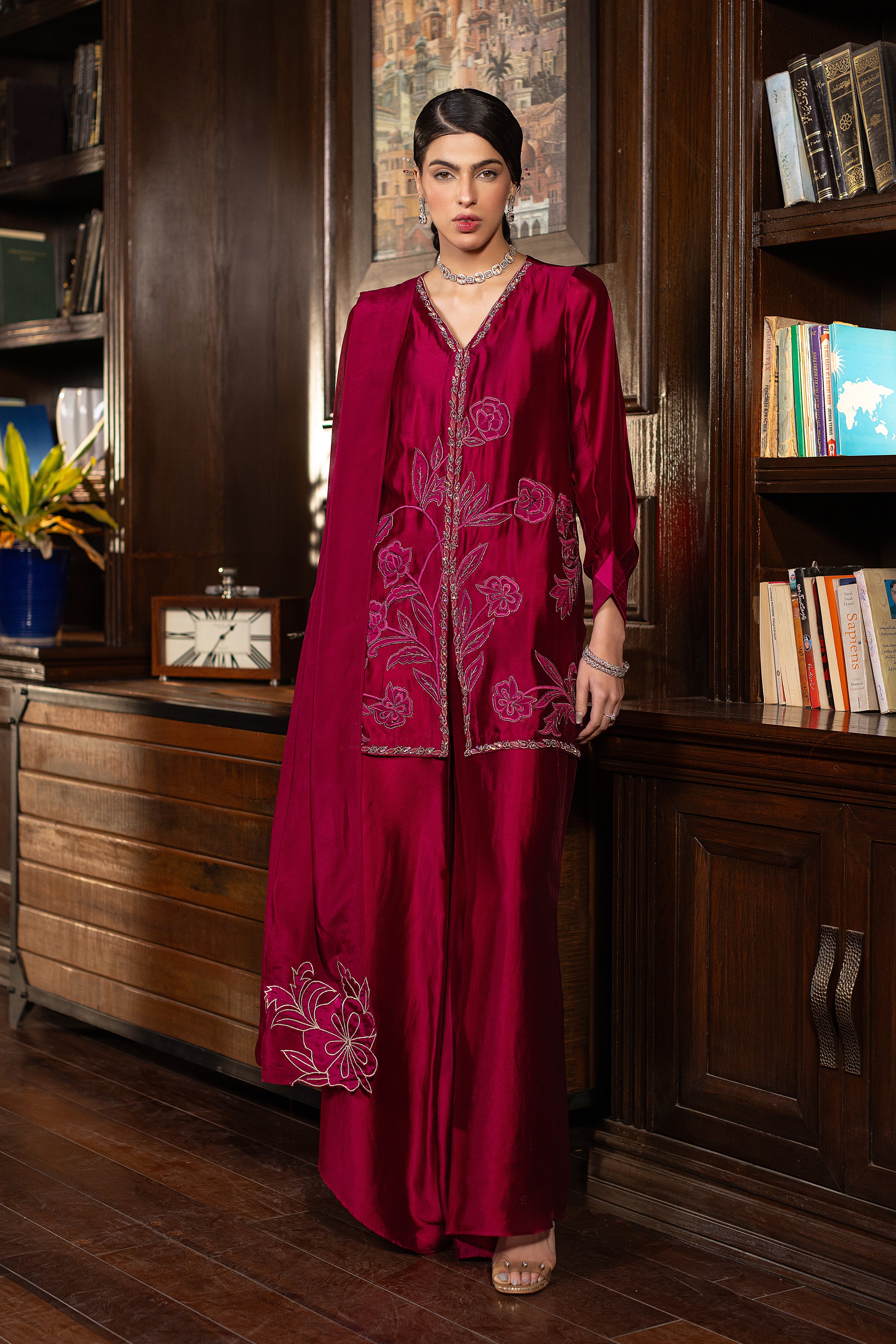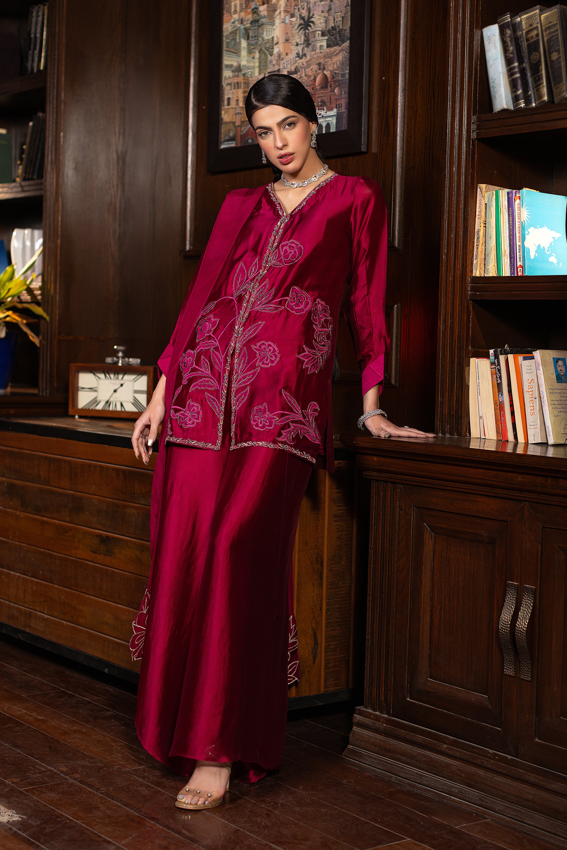 Roselyn shines in a vibrant magenta hue, exuding lively elegance. The silhouette is adorned with intricate appliqué work and delicate hand embroidery, creating a rich, textured finish. Paired with flared trousers for a graceful look, the outfit is completed with an embroidered dupatta, adding a refined and sophisticated touch.