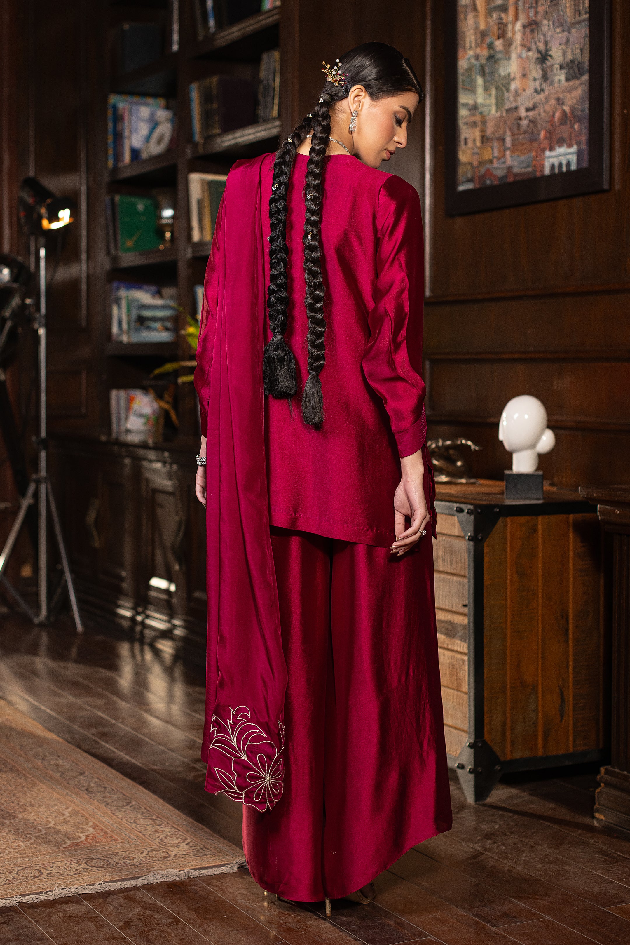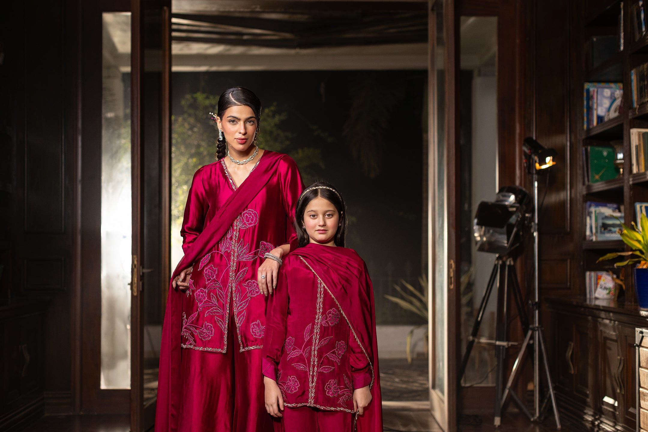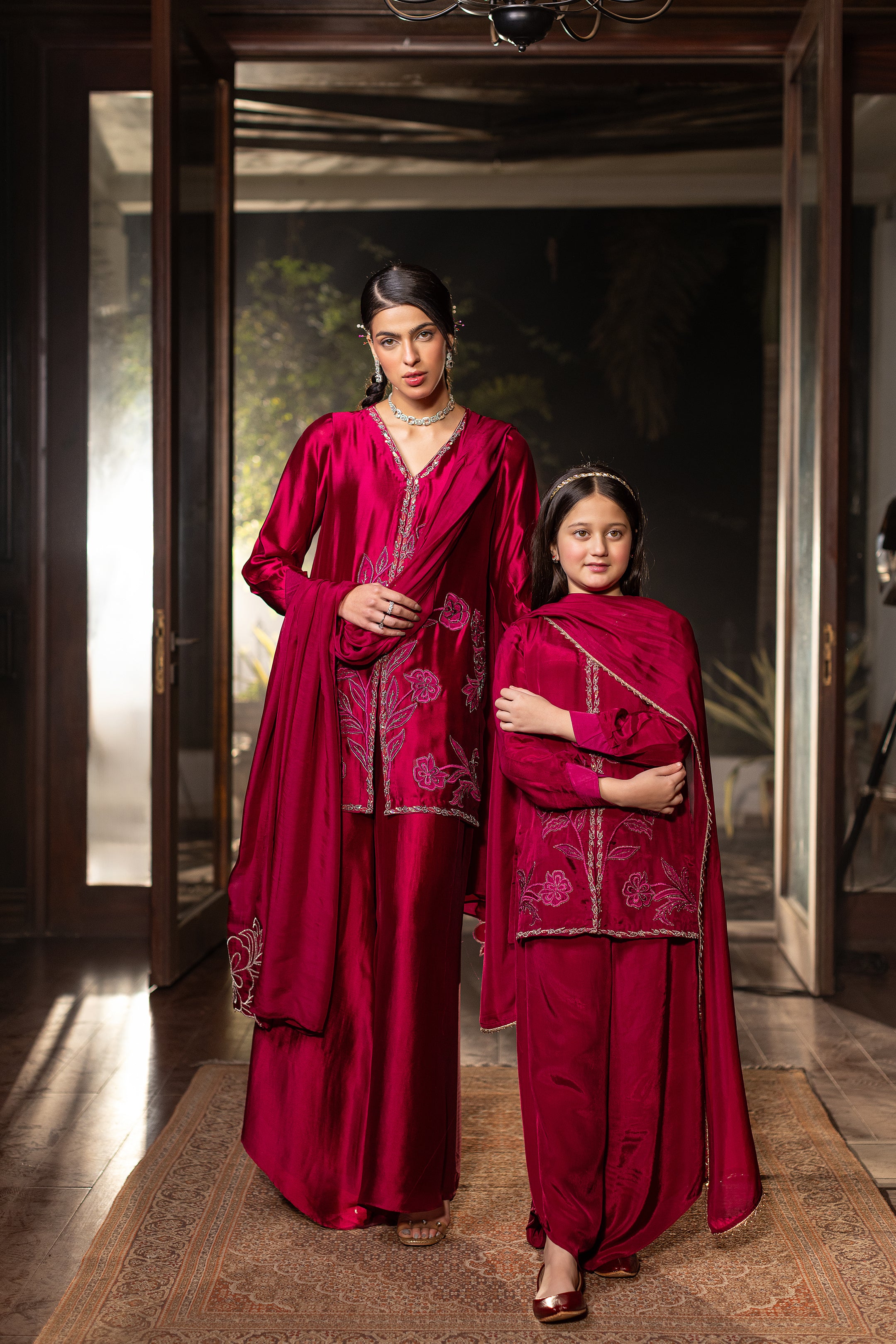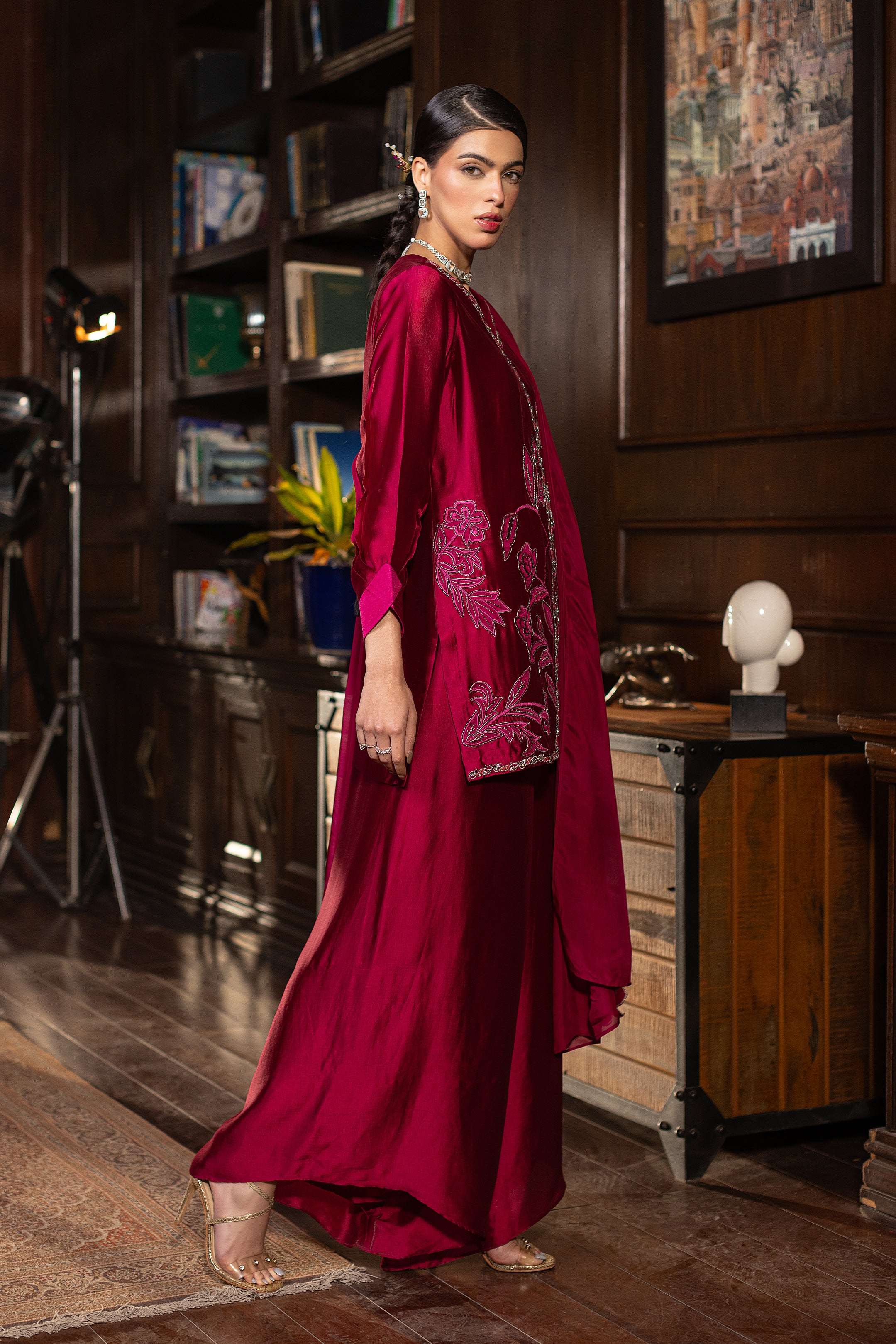 Roselyn shines in a vibrant magenta hue, exuding lively elegance. The silhouette is adorned with intricate appliqué work and delicate hand embroidery, creating a rich, textured finish. Paired with flared trousers for a graceful look, the outfit is completed with an embroidered dupatta, adding a refined and sophisticated touch.