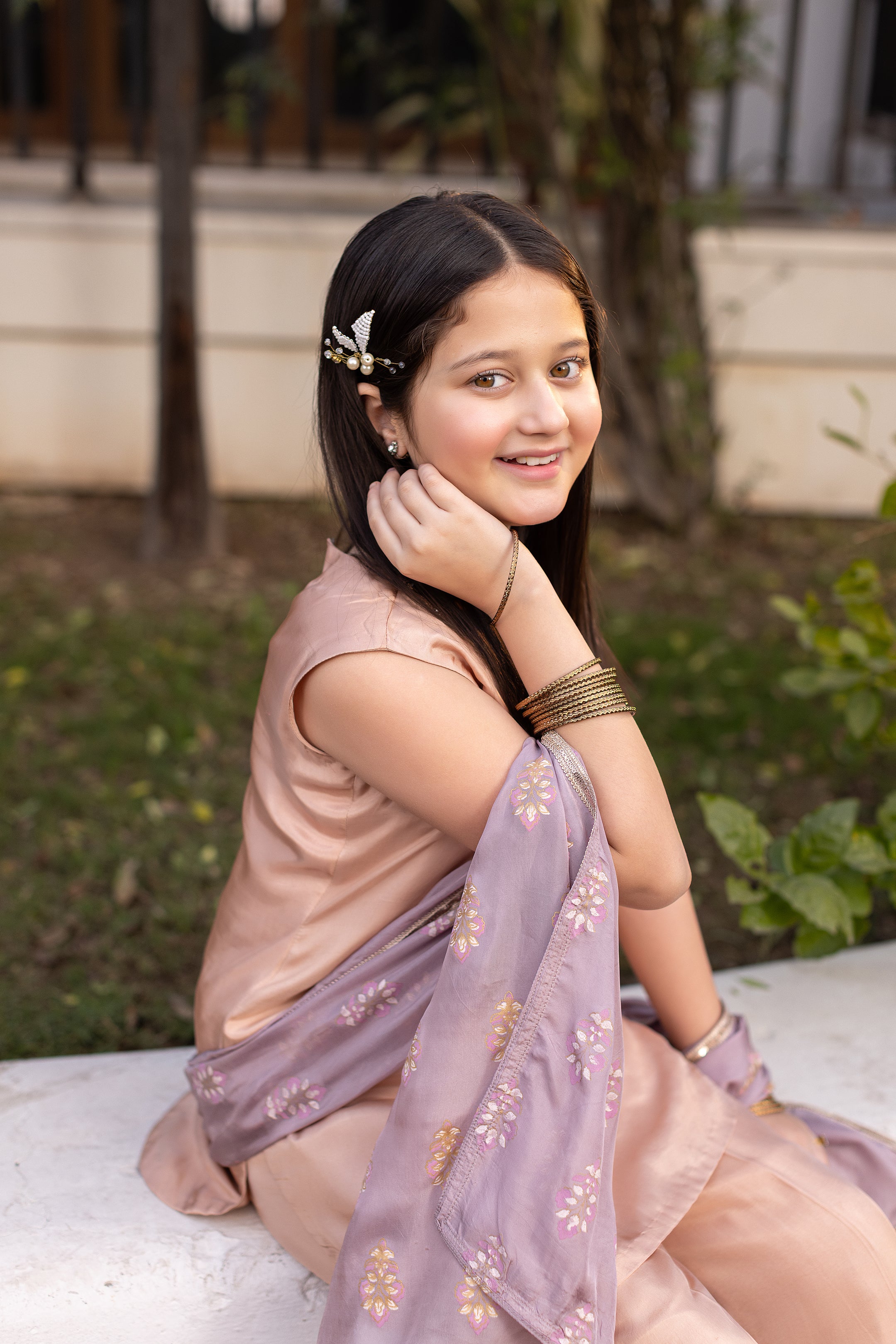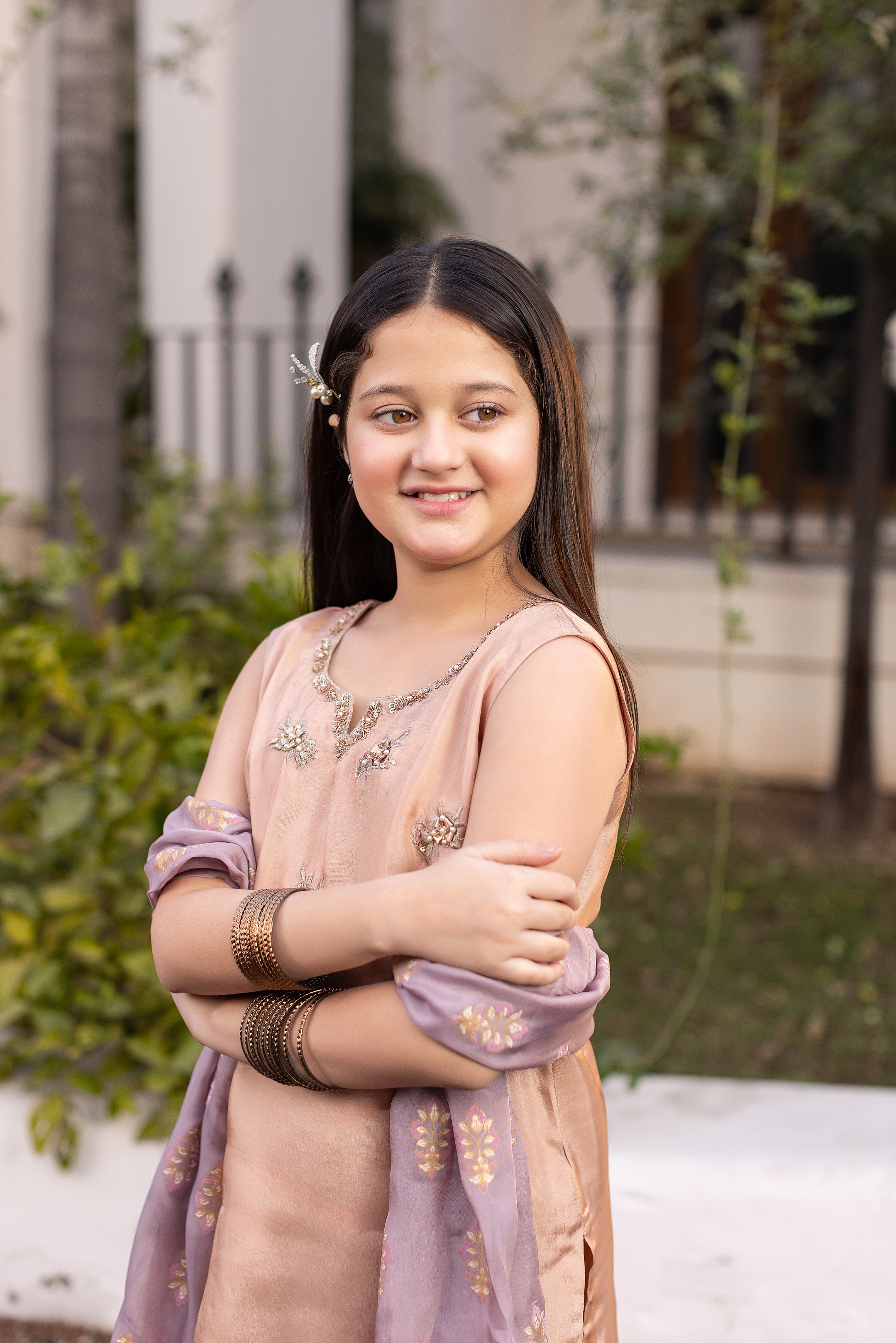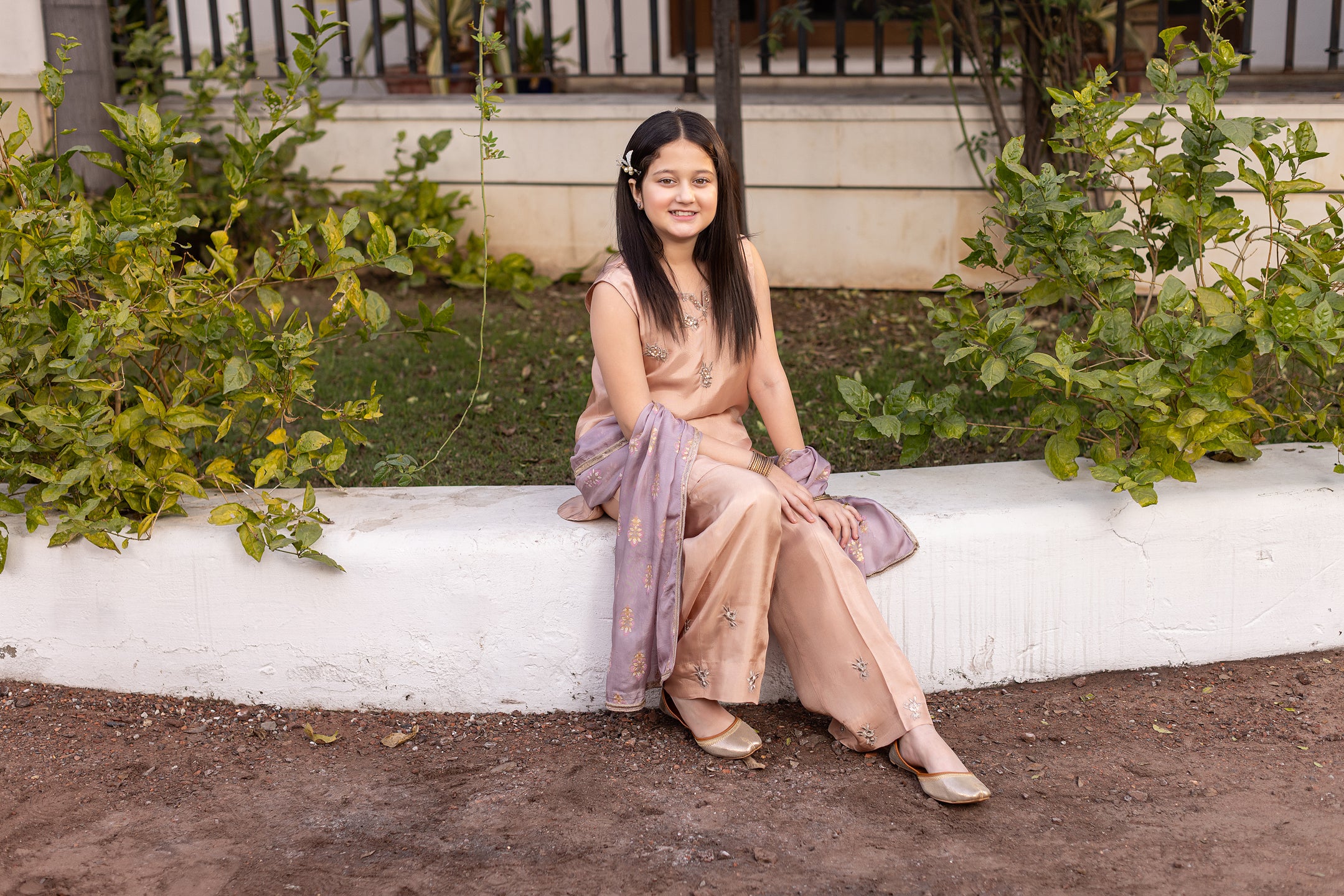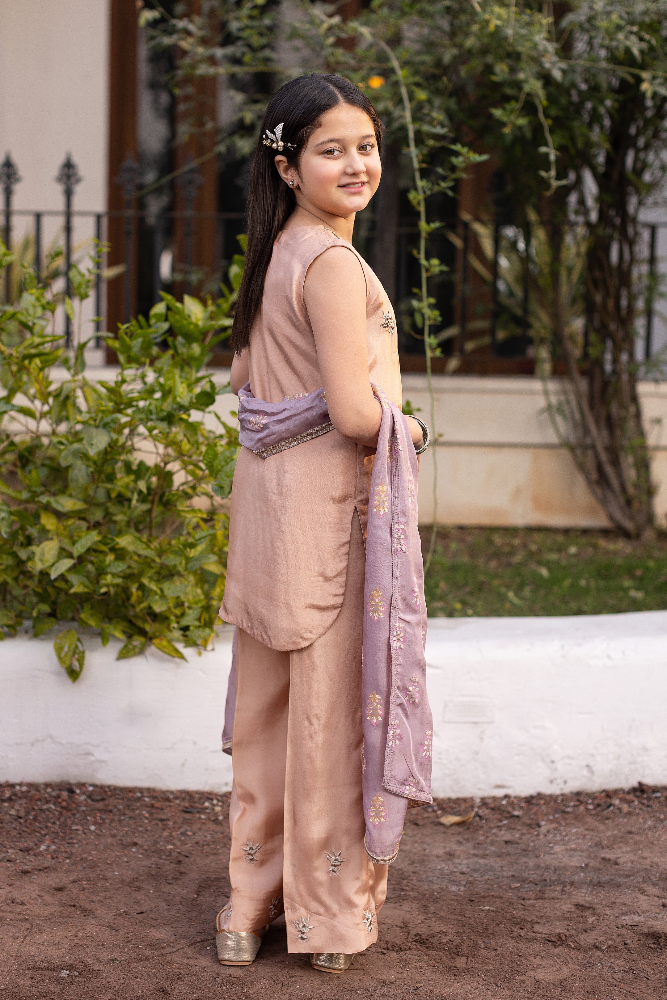 Semira is a blush beige kids’ outfit featuring an embroidered shirt with embroidered flared trousers and a playful screen printed dupatta. Complimentary sleeves can be added.