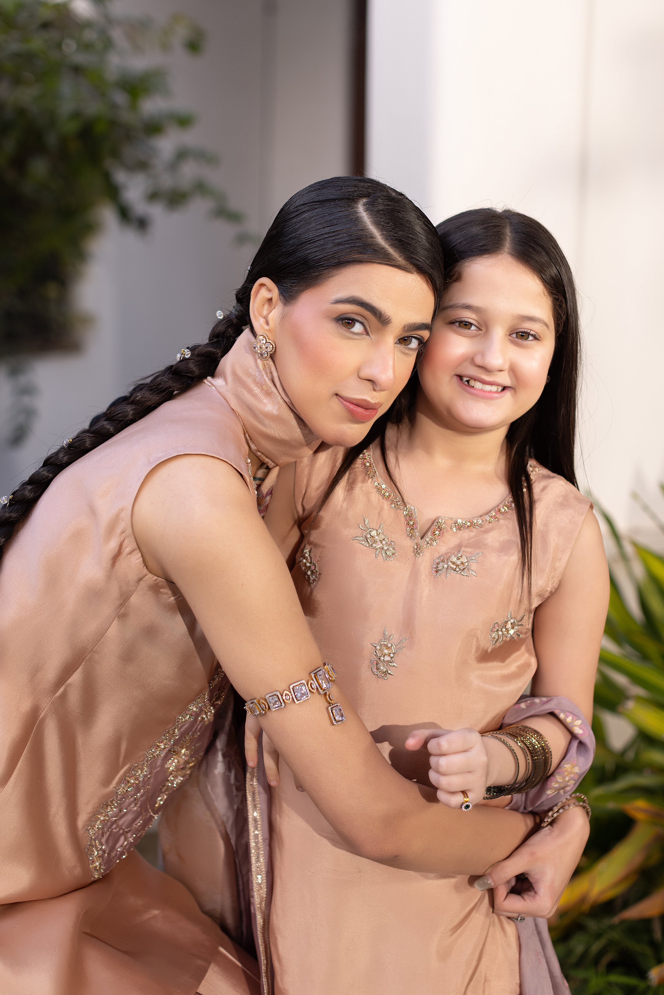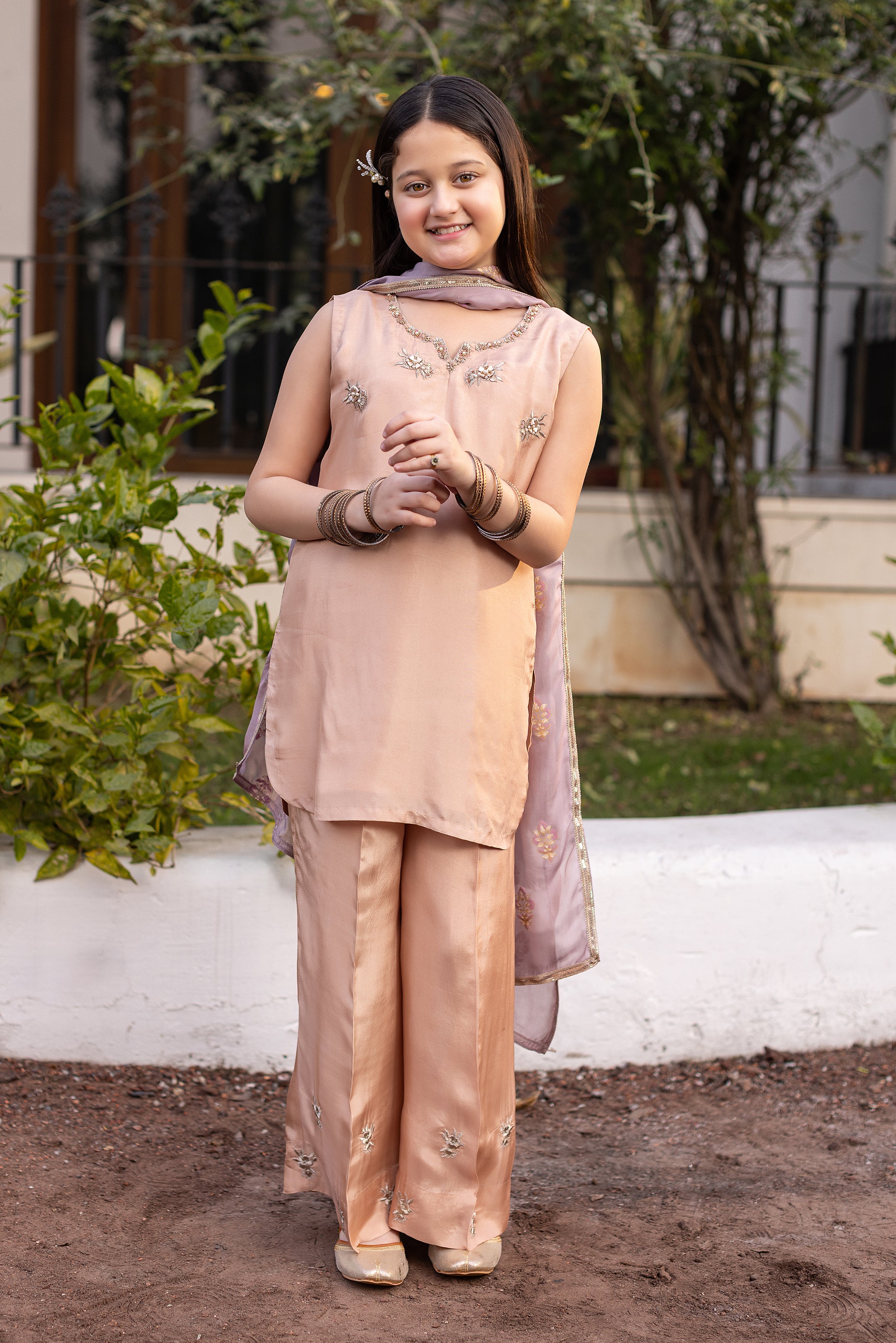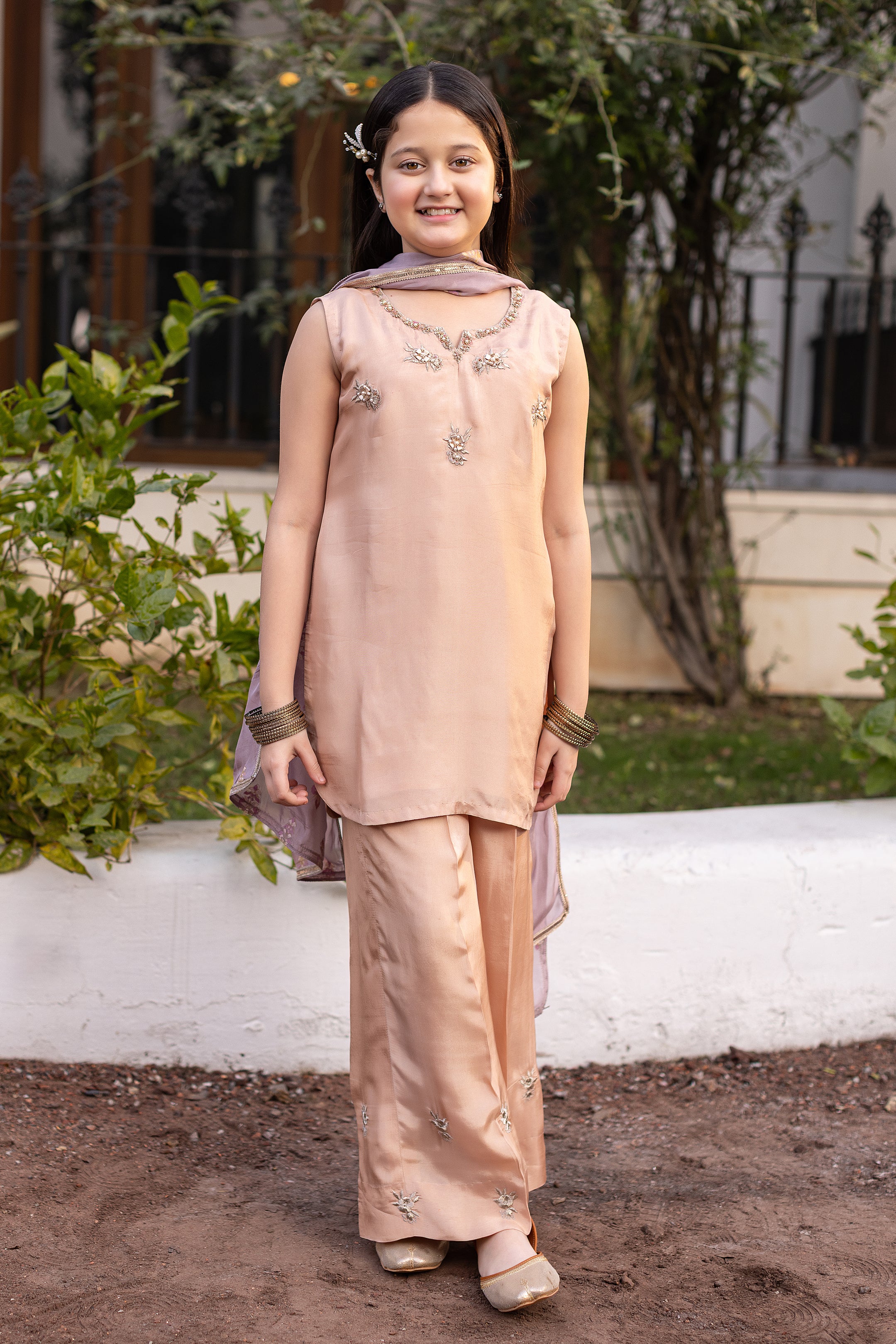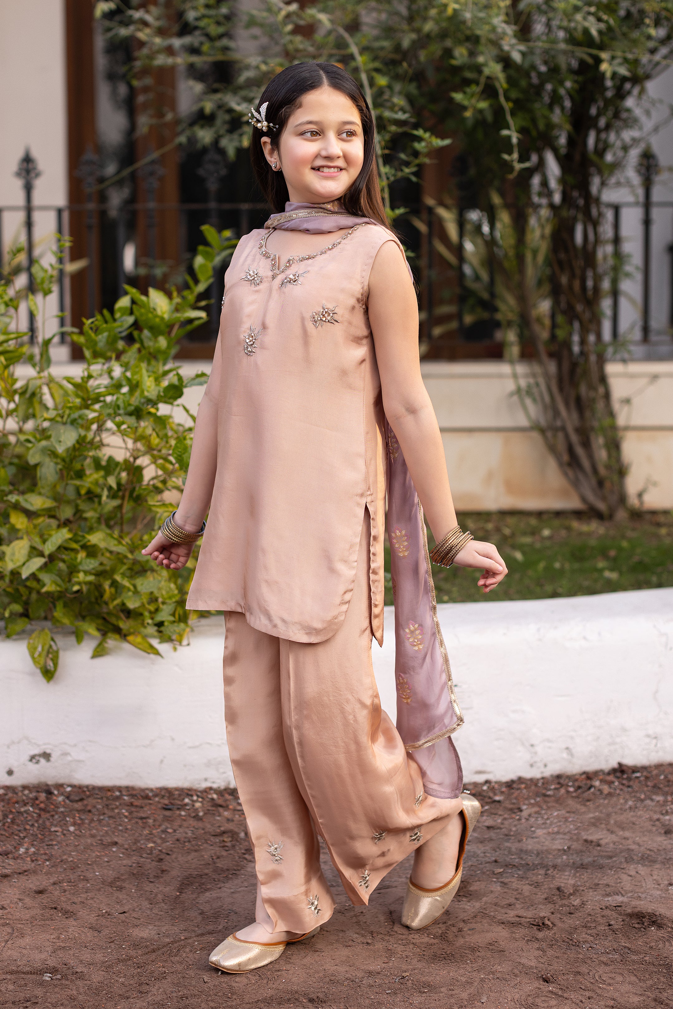 Semira is a blush beige kids’ outfit featuring an embroidered shirt with embroidered flared trousers and a playful screen printed dupatta. Complimentary sleeves can be added.