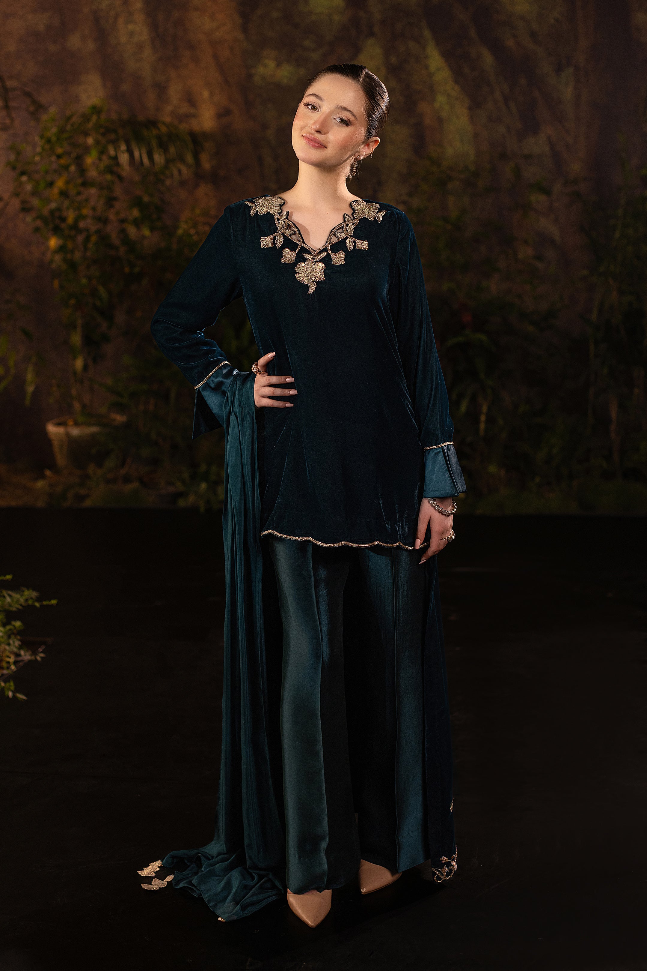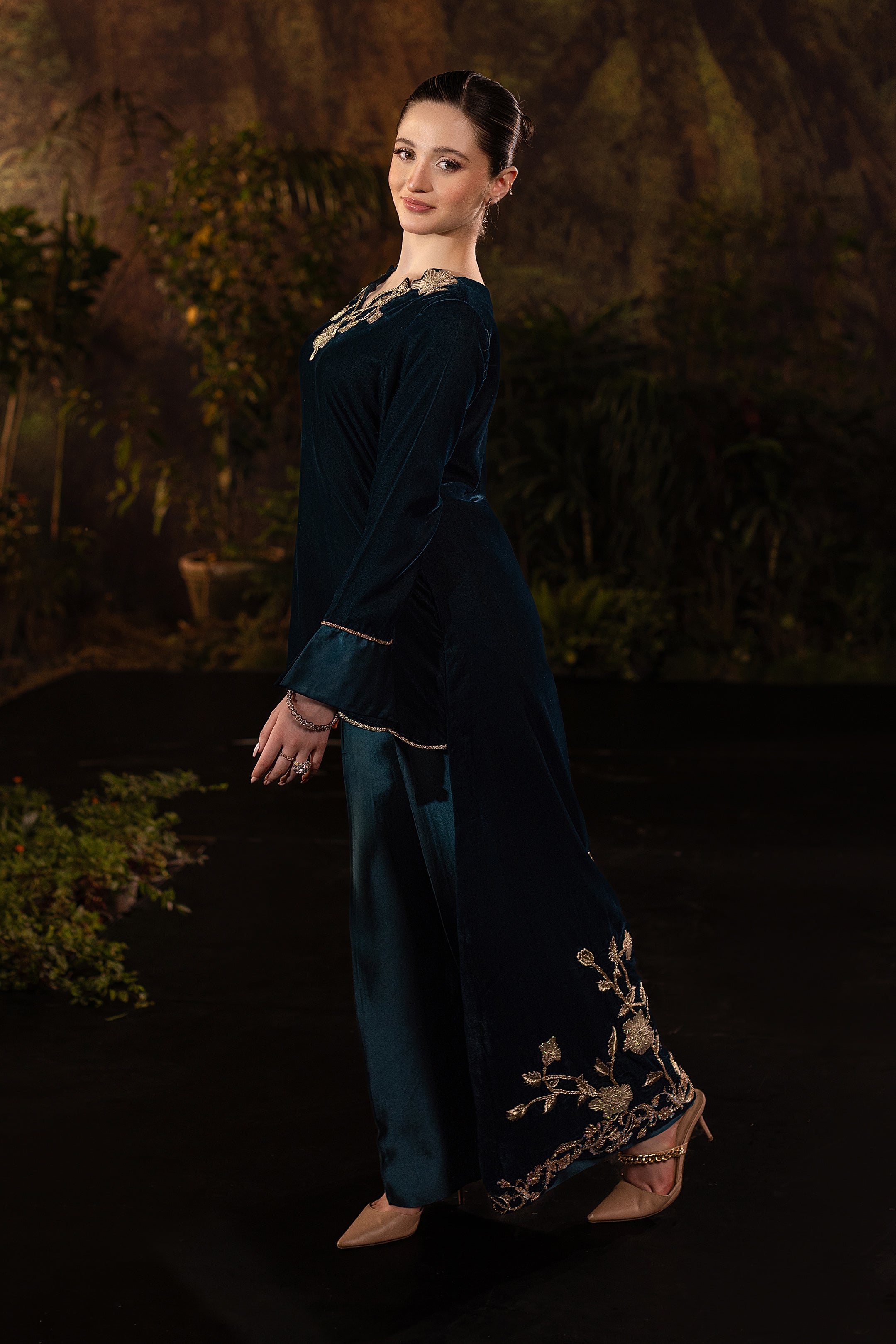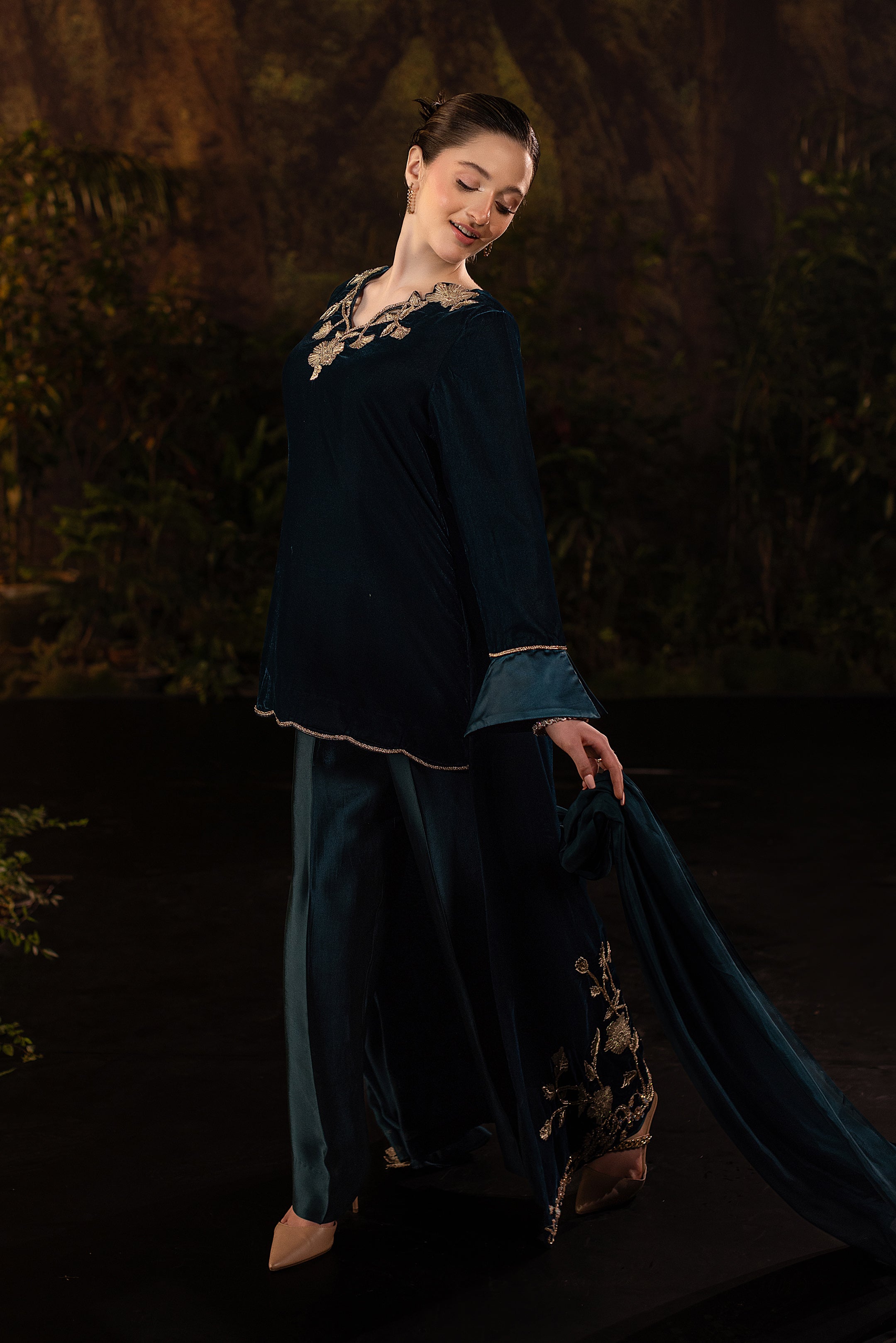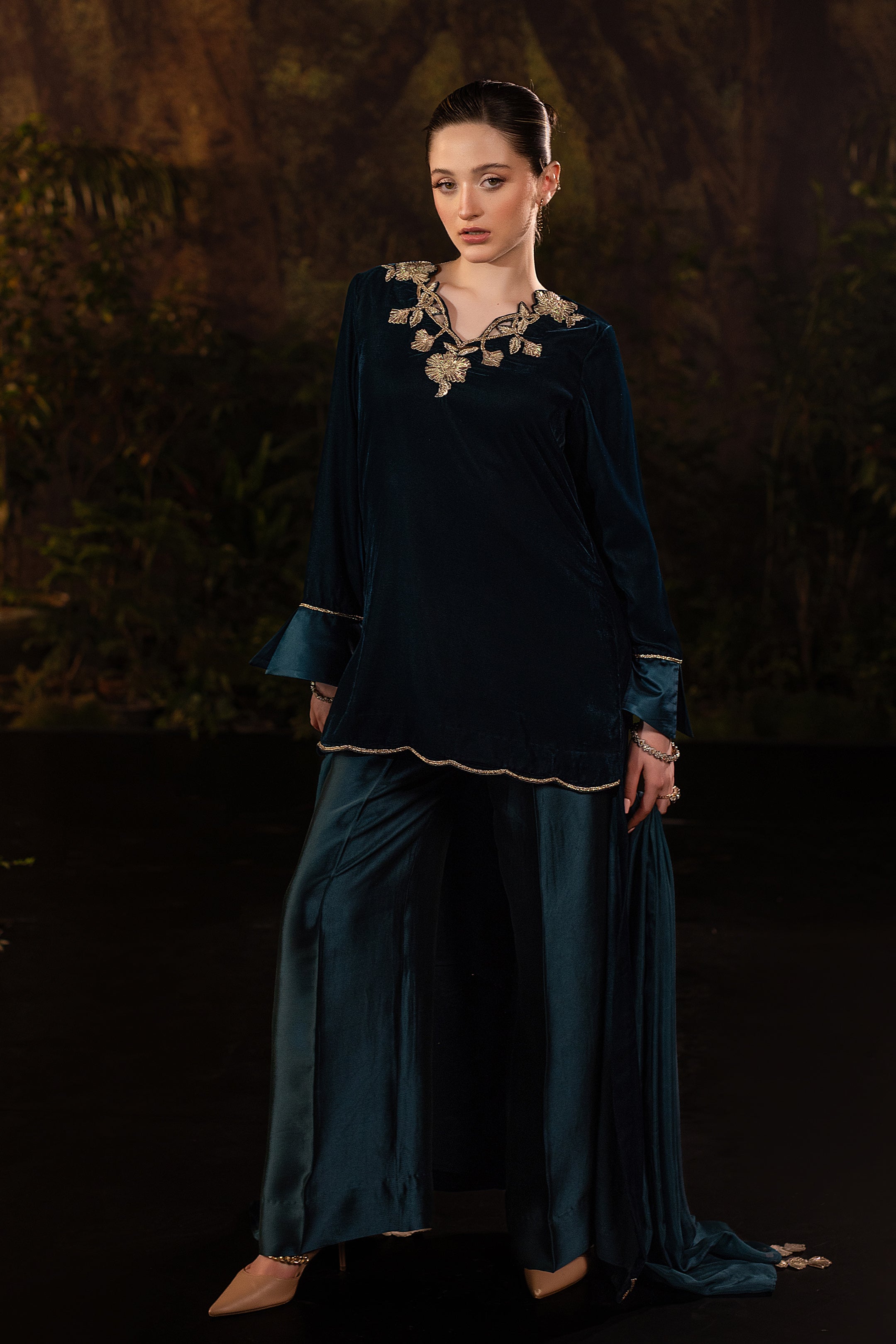 A contemporary silhouette steeped in classic luxury, this teal-blue velvet outfit is cut in a hi-low design that flows with effortless grace. The front carries a minimal elegance, highlighted by floral embroidery blooming around the neckline, while the back hemline is adorned with delicate embroidered detailing—an unexpected flourish that leaves a lasting impression from every angle. The lustrous velvet drapes with fluid ease, while the flared sleeves and scalloped edging add refined finishing touches. Paired with flared pants, sophisticated yet modern, this piece captures the balance of understated charm and statement detail.