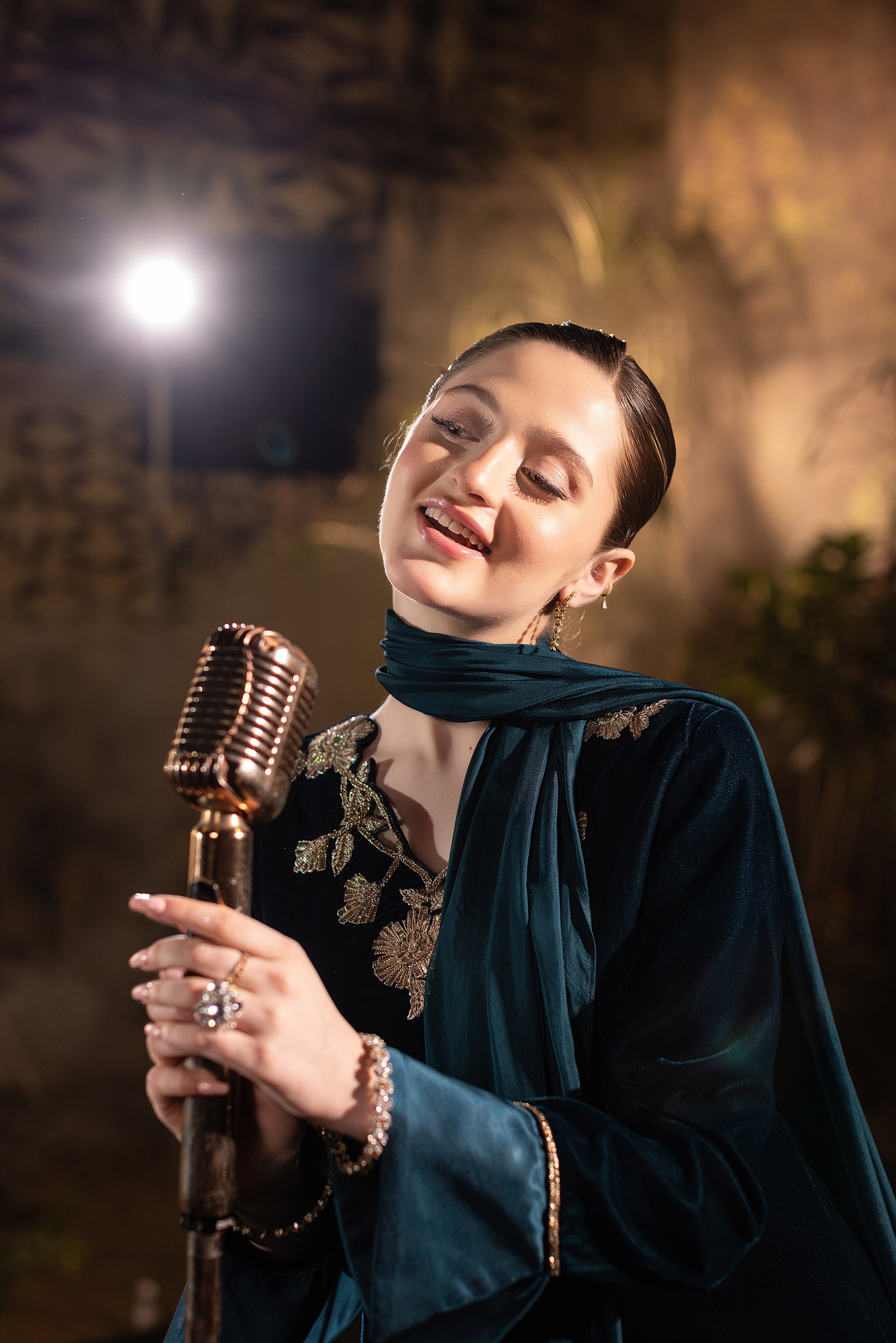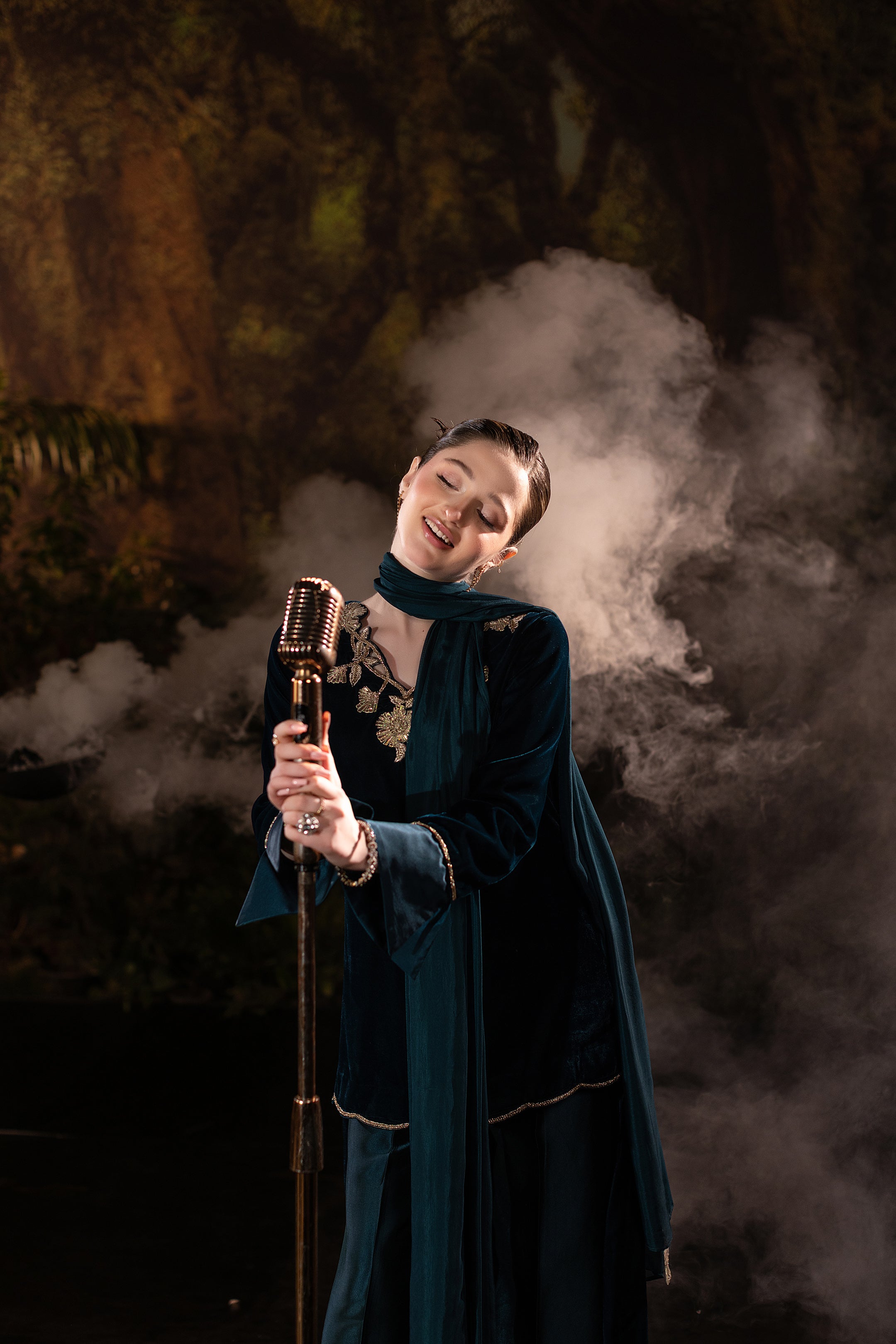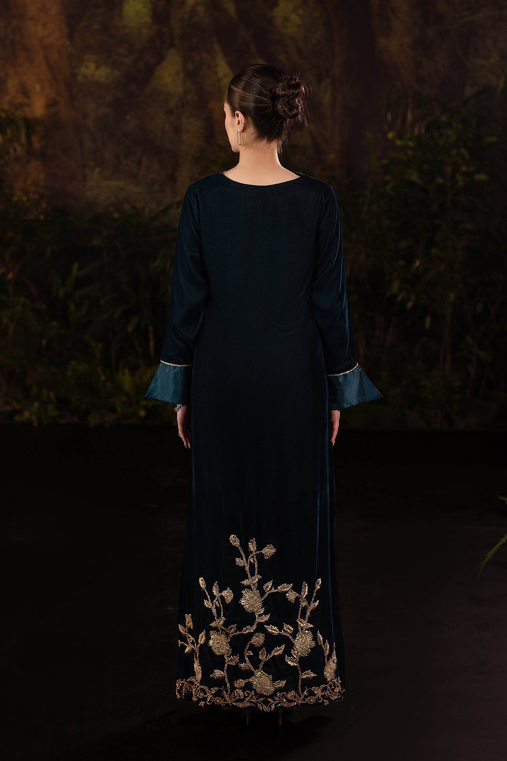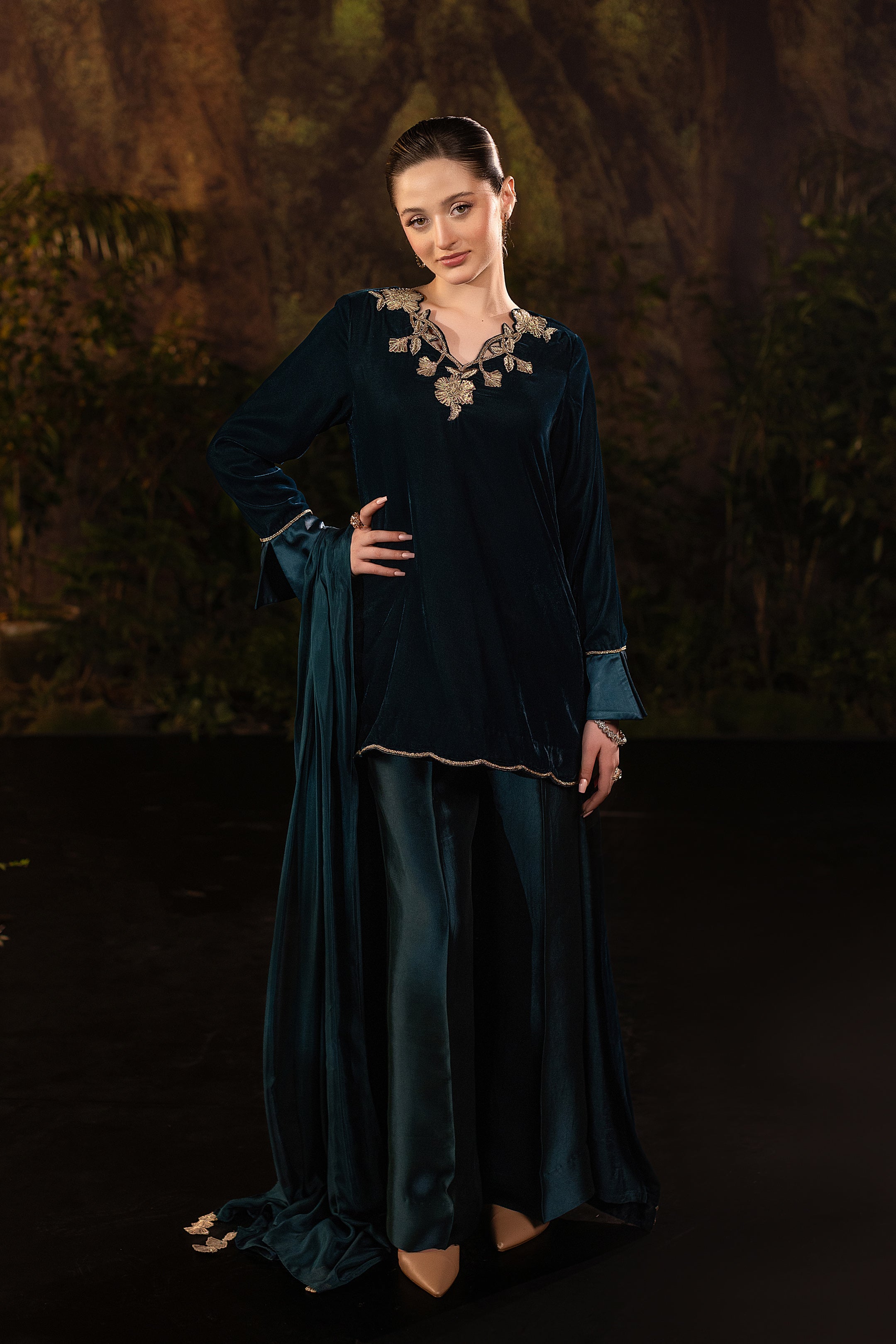 A contemporary silhouette steeped in classic luxury, this teal-blue velvet outfit is cut in a hi-low design that flows with effortless grace. The front carries a minimal elegance, highlighted by floral embroidery blooming around the neckline, while the back hemline is adorned with delicate embroidered detailing—an unexpected flourish that leaves a lasting impression from every angle. The lustrous velvet drapes with fluid ease, while the flared sleeves and scalloped edging add refined finishing touches. Paired with flared pants, sophisticated yet modern, this piece captures the balance of understated charm and statement detail.