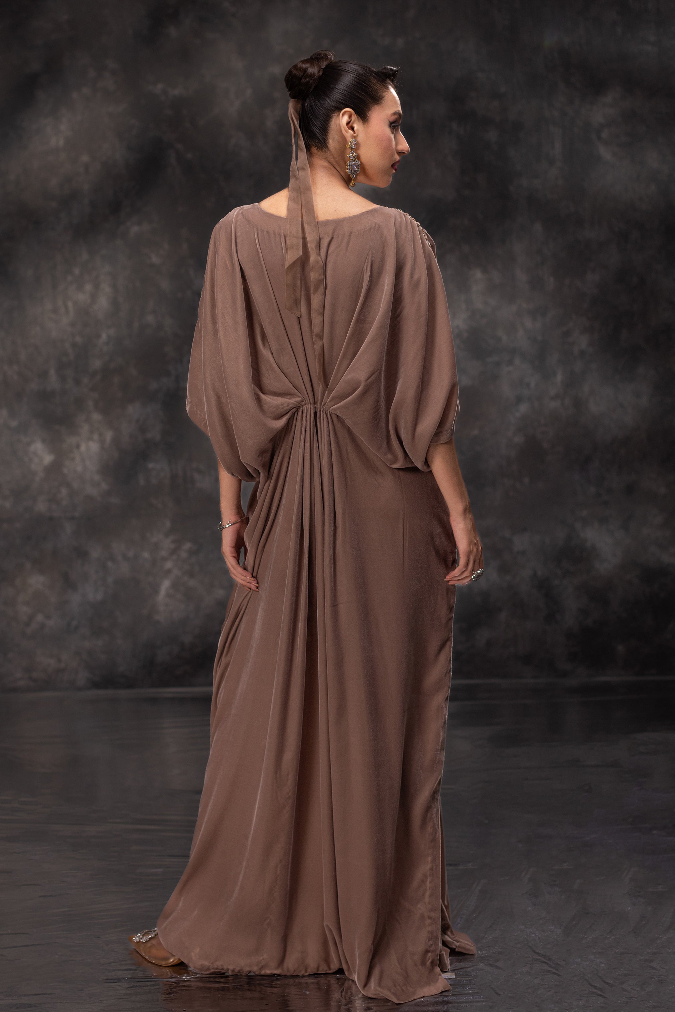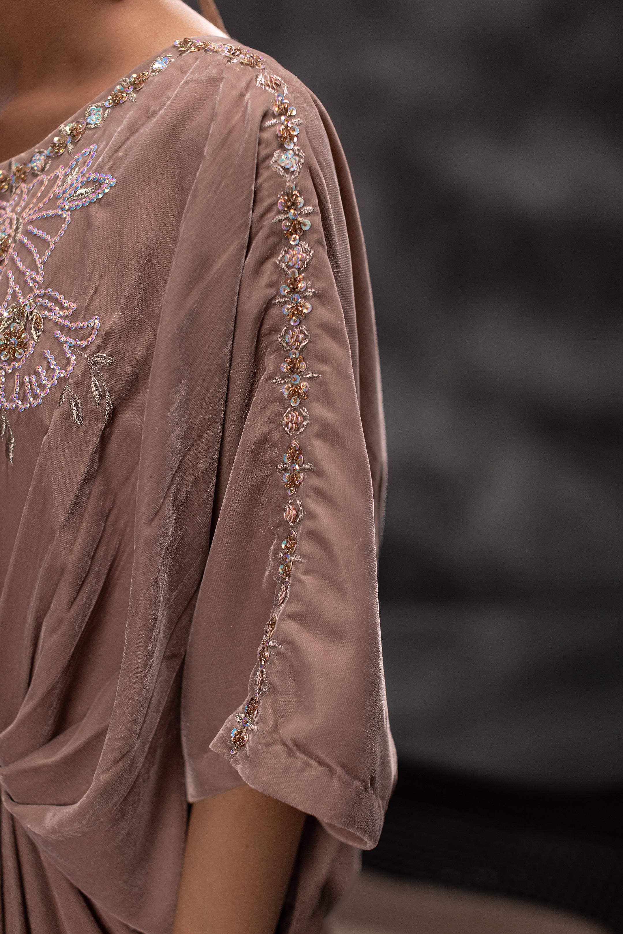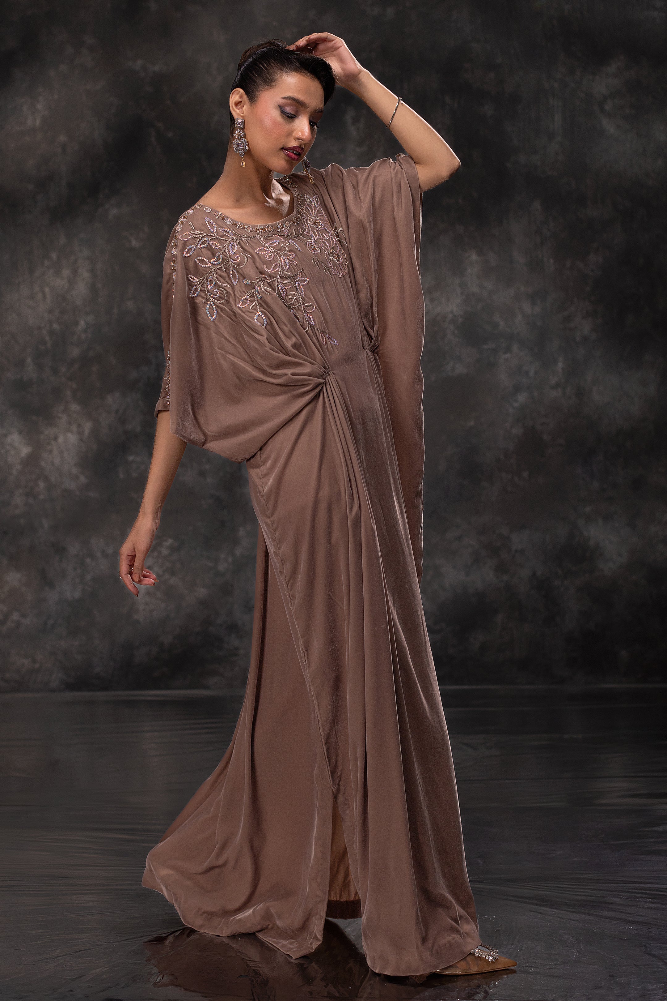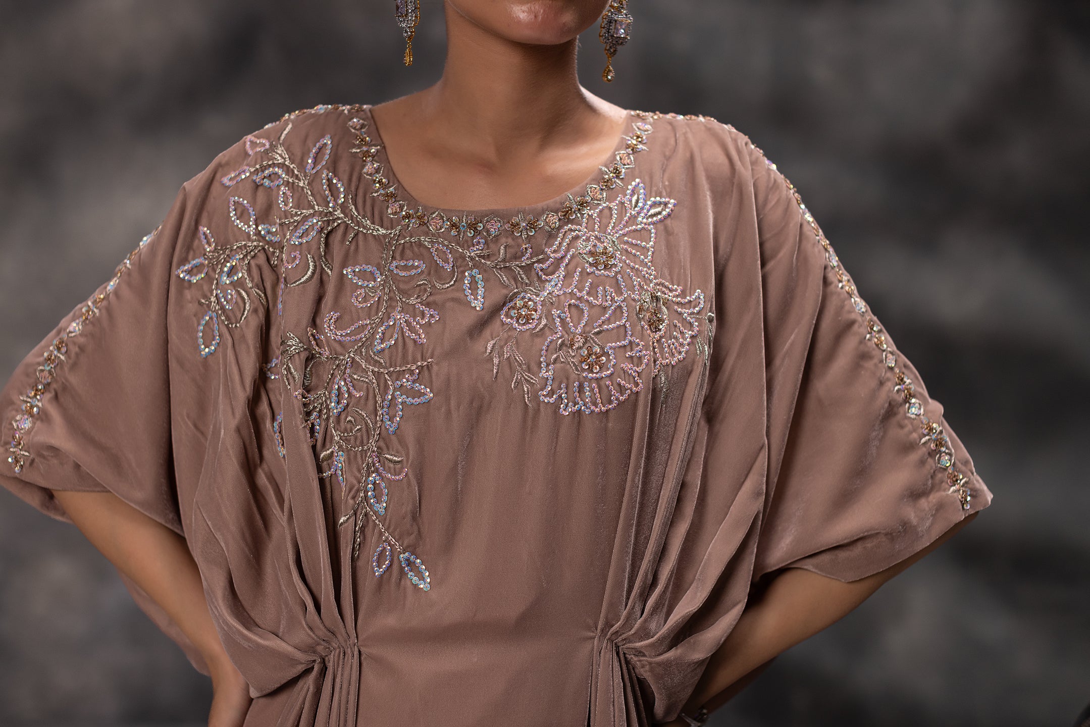 This ensemble embodies effortless couture and elegant design. Made from soft mocha-taupe velvet, the kaftan drapes gracefully, with gentle gathers and pleats that shape the body while keeping a relaxed, Grecian flow.