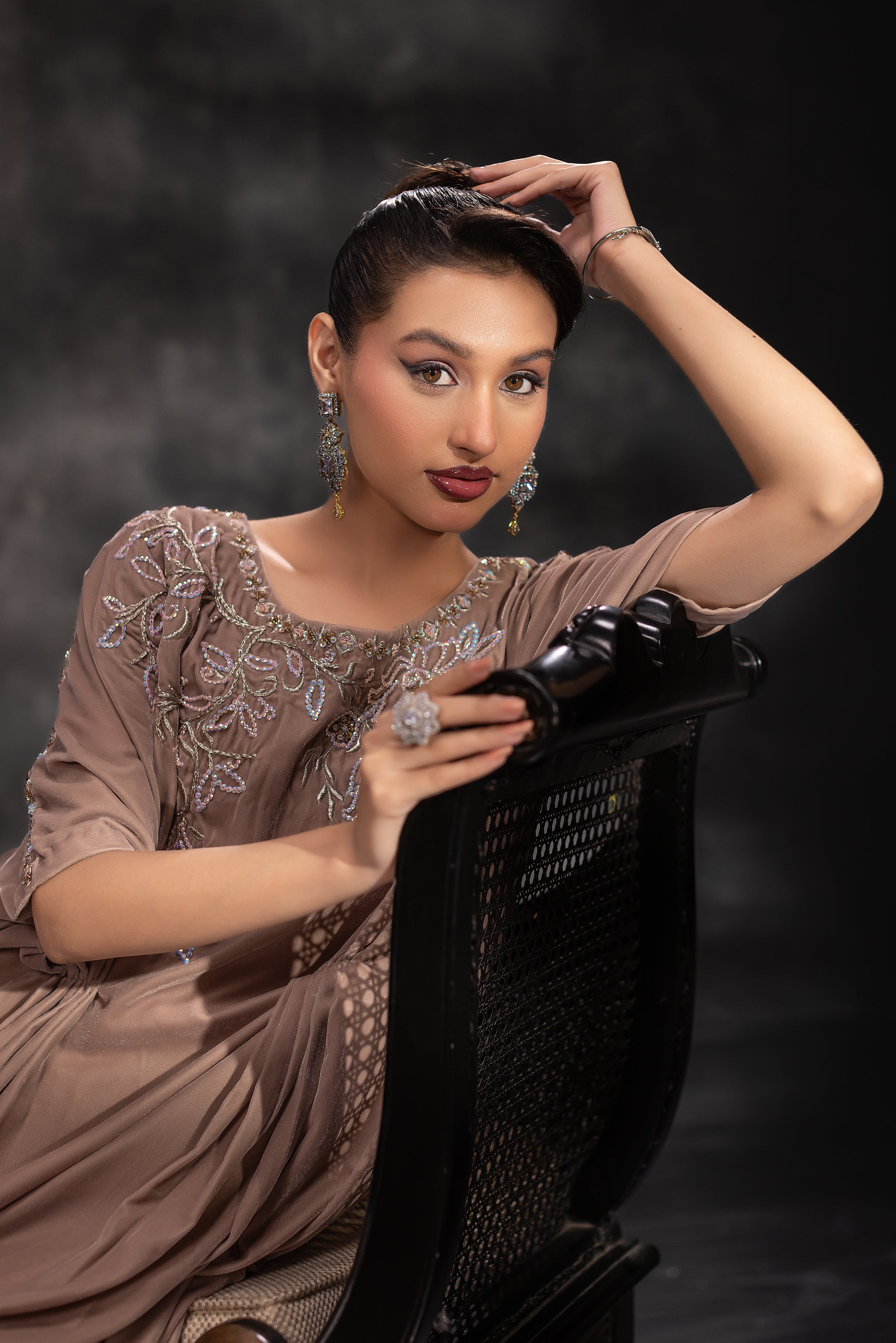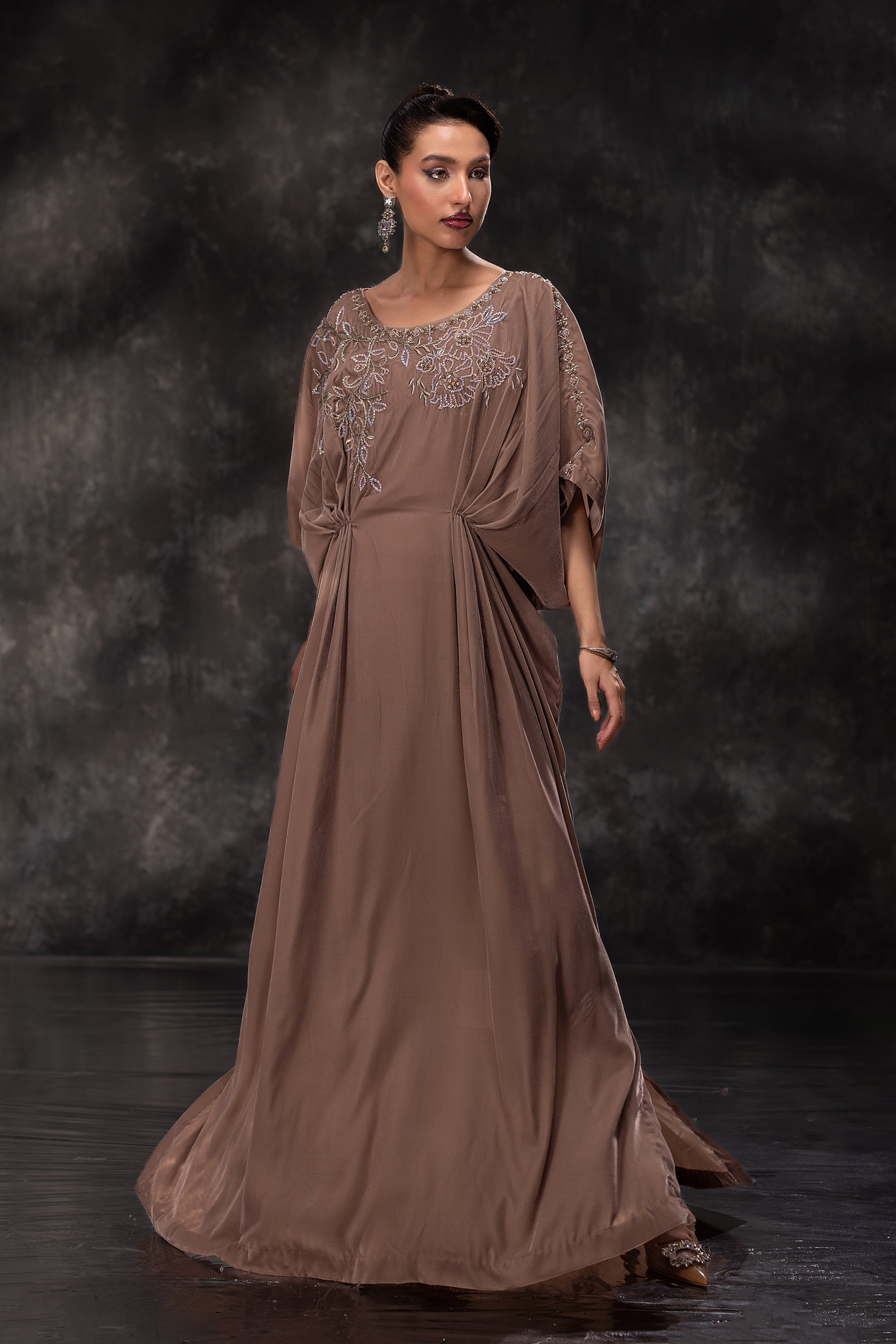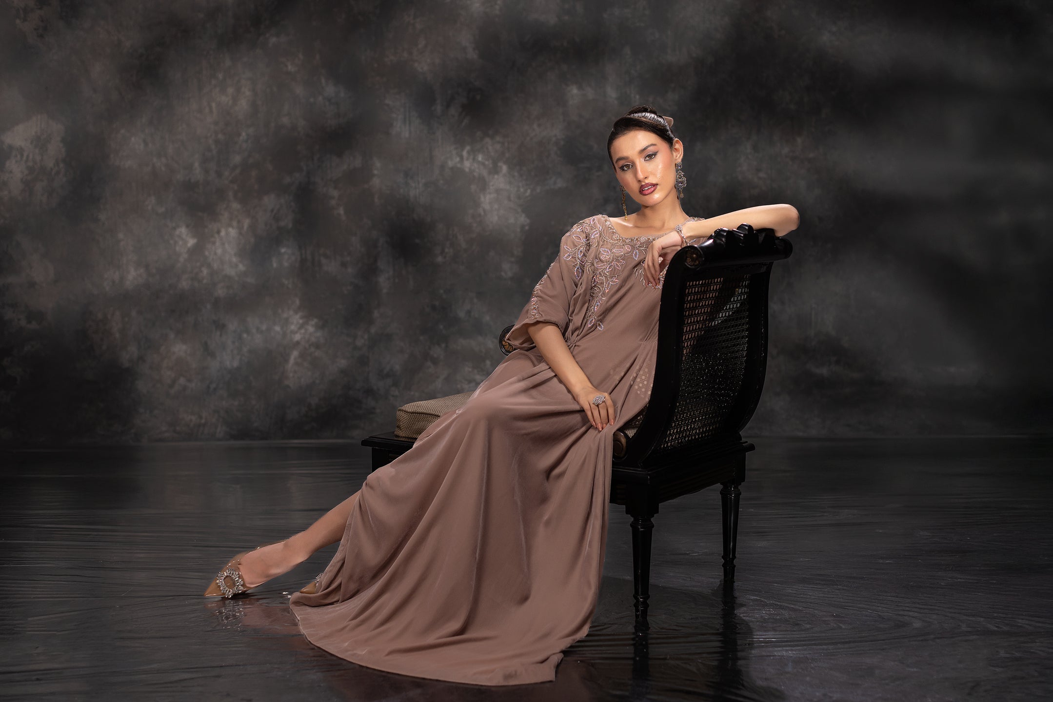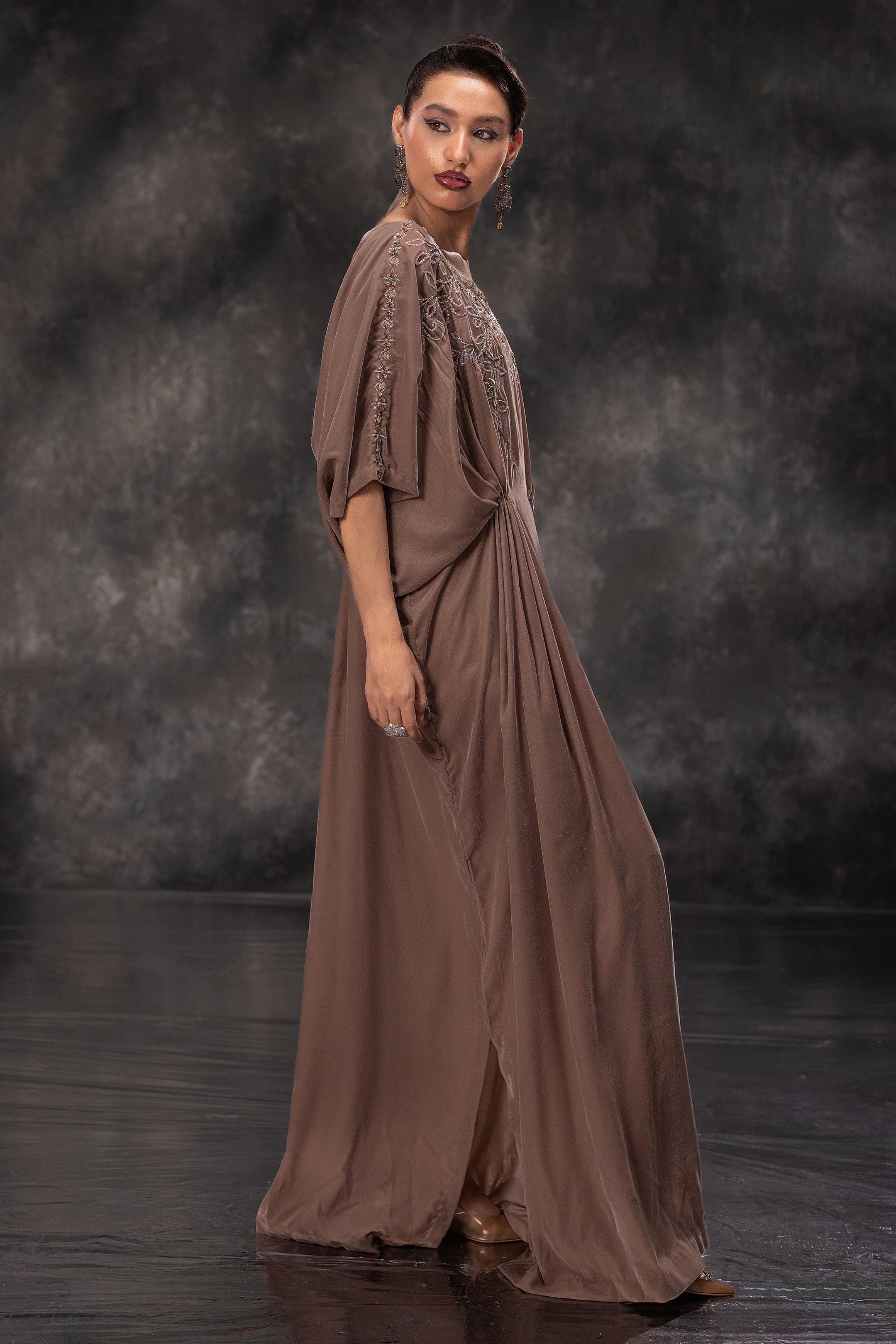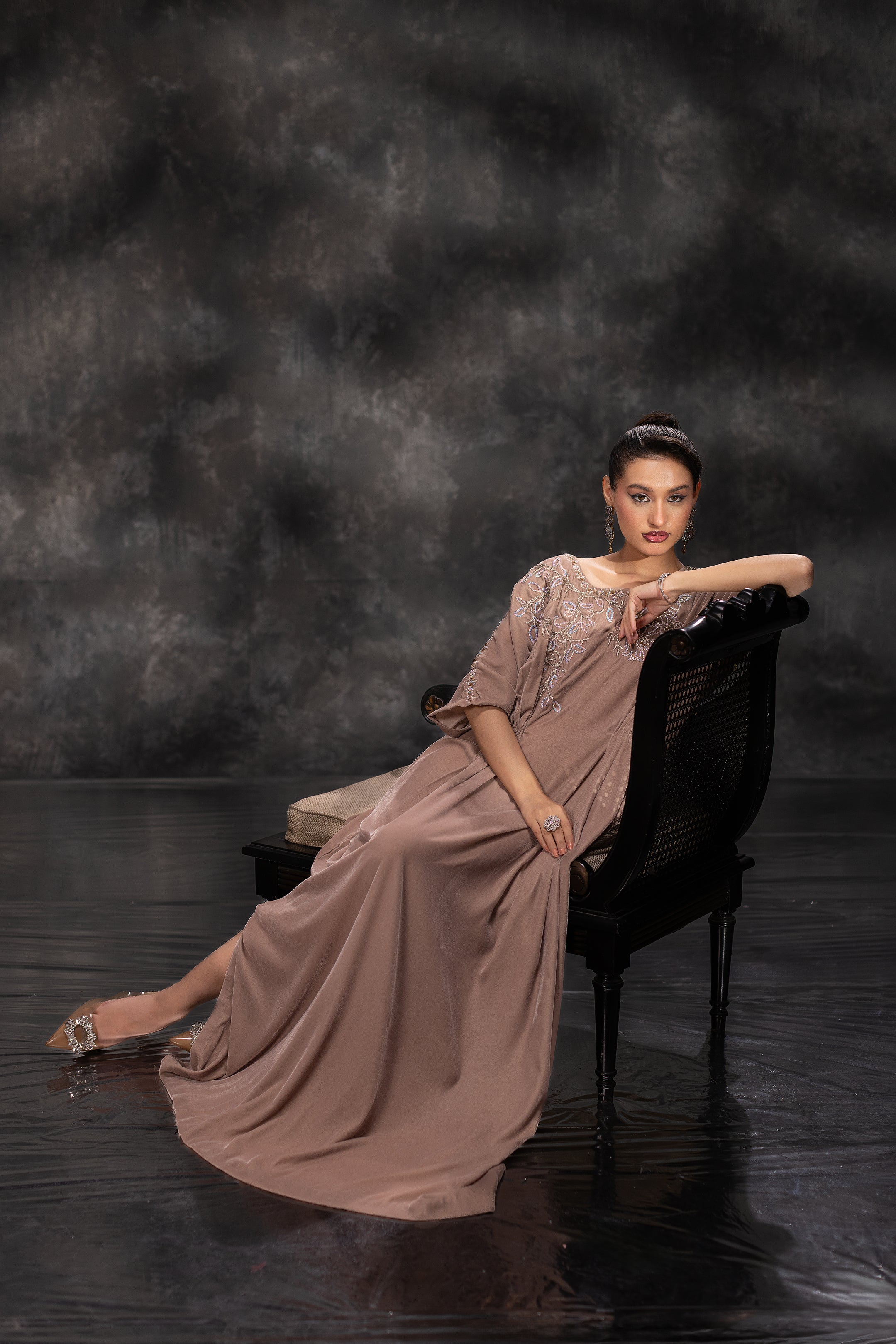 This ensemble embodies effortless couture and elegant design. Made from soft mocha-taupe velvet, the kaftan drapes gracefully, with gentle gathers and pleats that shape the body while keeping a relaxed, Grecian flow.