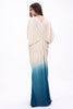Zaidan is a vision to behold, with a blend from ivory to teal creating a symphony with intricate and delicate embroidery on neckline and shoulder line of a flowy kaftan.