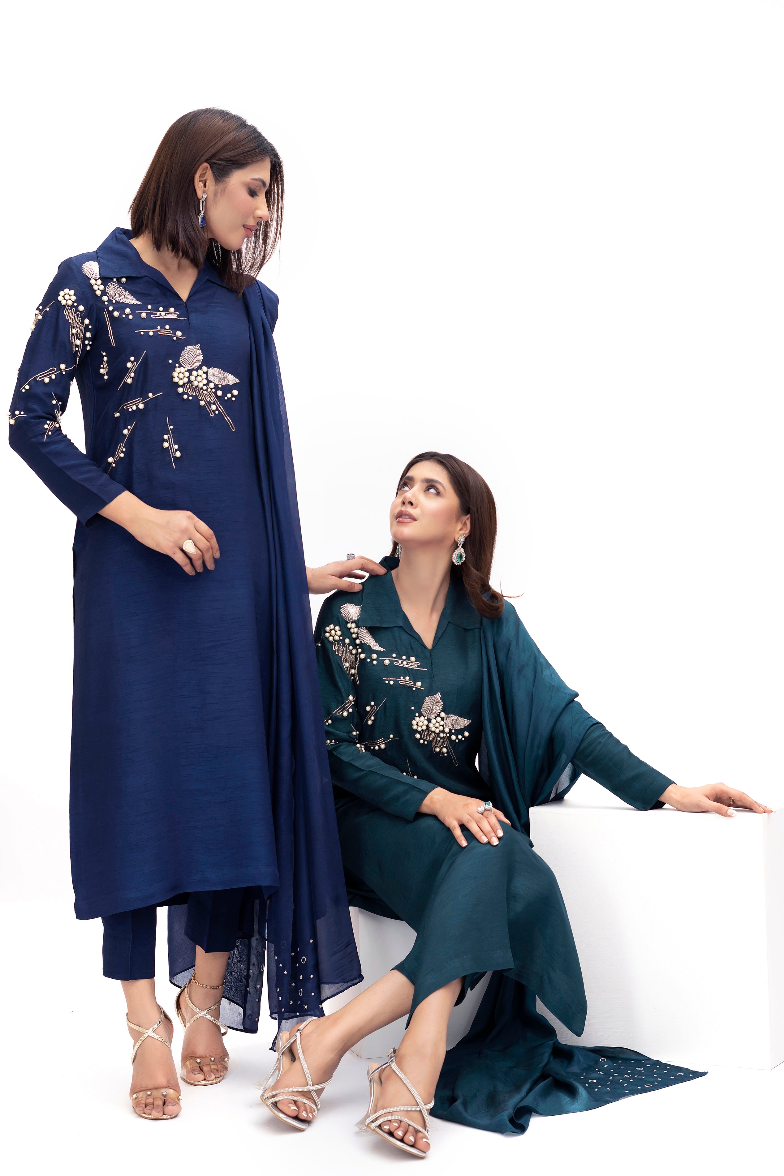 Discover the scintillating embroideries using beads, sequins and pearls rendered on a deep teal canvas, completed with an aesthetic silk duppata with corner embroidery (included). Trousers included.