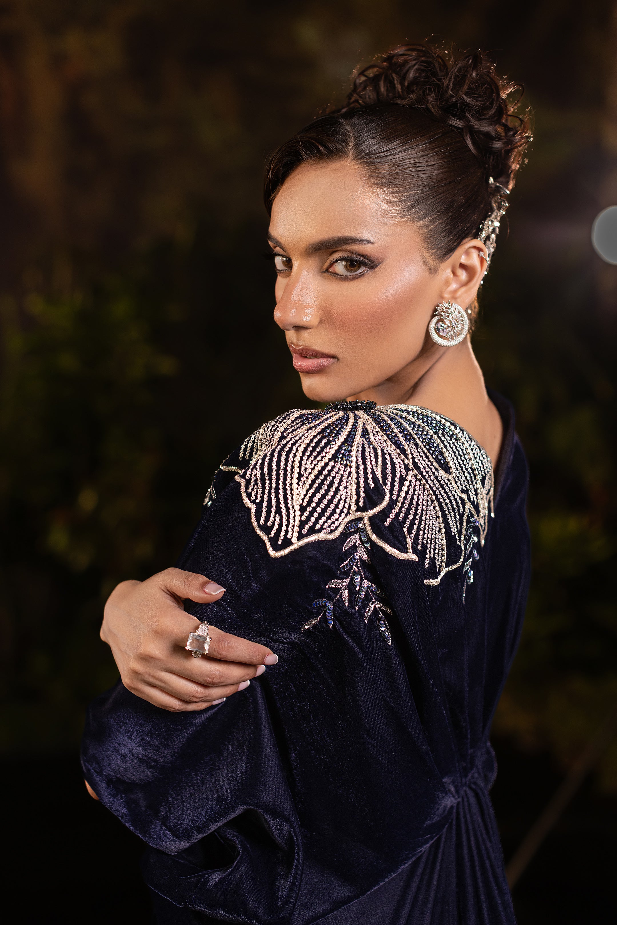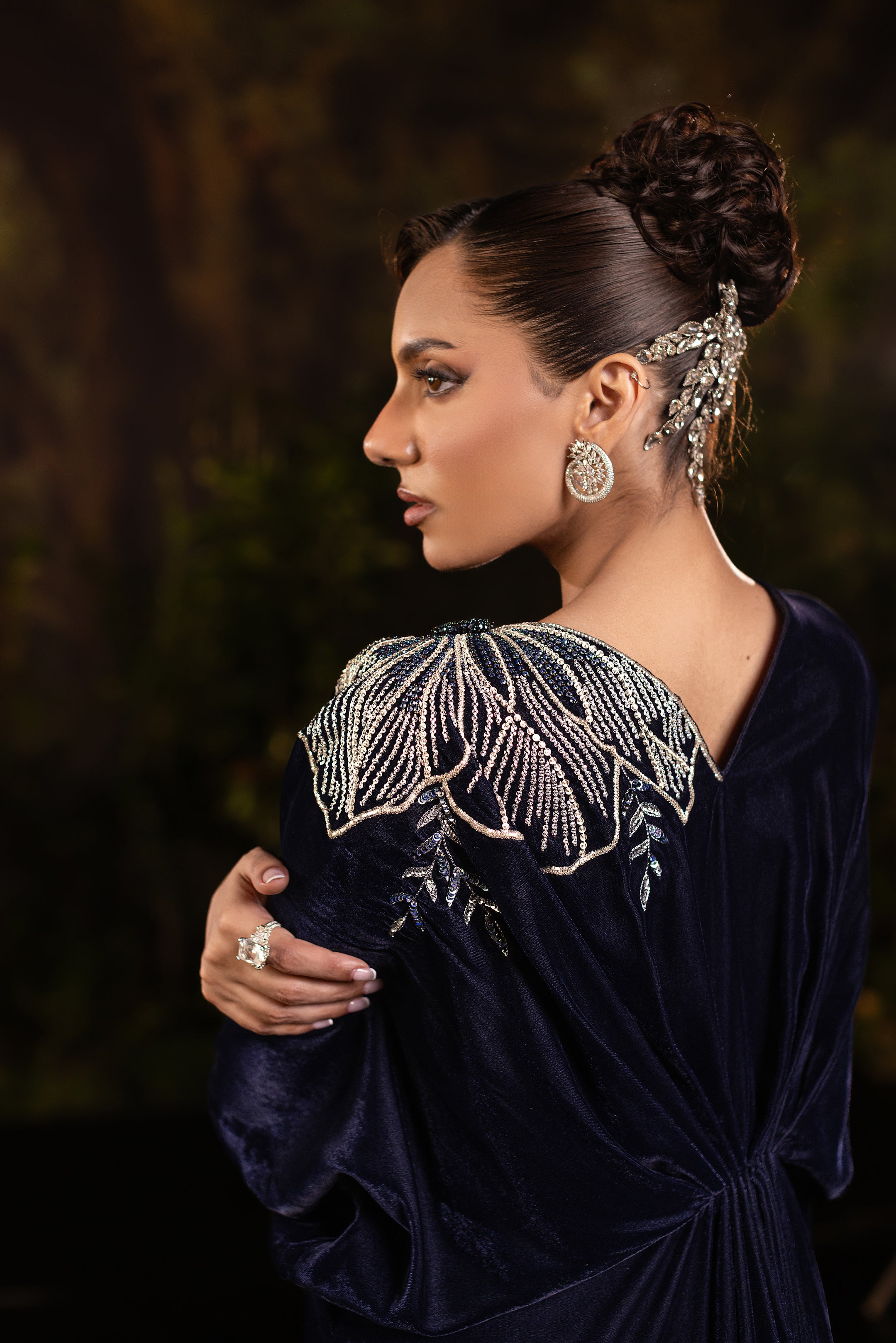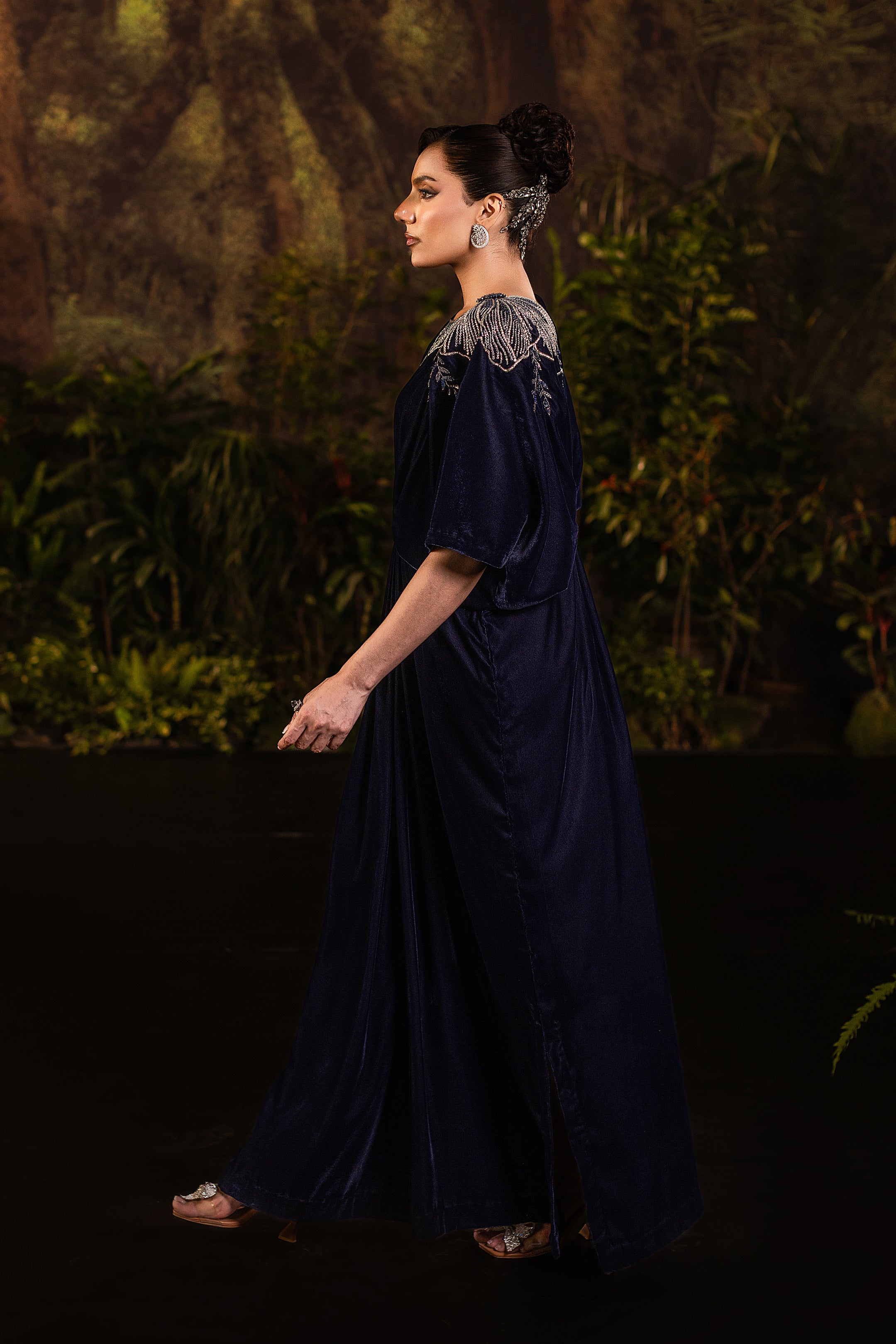 Drape yourself in timeless elegance with this navy velvet kaftan, designed to make a statement with its graceful flow and luxurious texture. The silhouette features a gathered drape at the waist, creating a flattering, elongated fall. A striking hand-embroidered motif of cascading silver beads and sequins adorned the shoulder, giving the outfit a contemporary yet regal edge. Minimal yet impactful, this kaftan is perfect for evening soirées, winter festivities, or as a modern alternative for formal occasions.