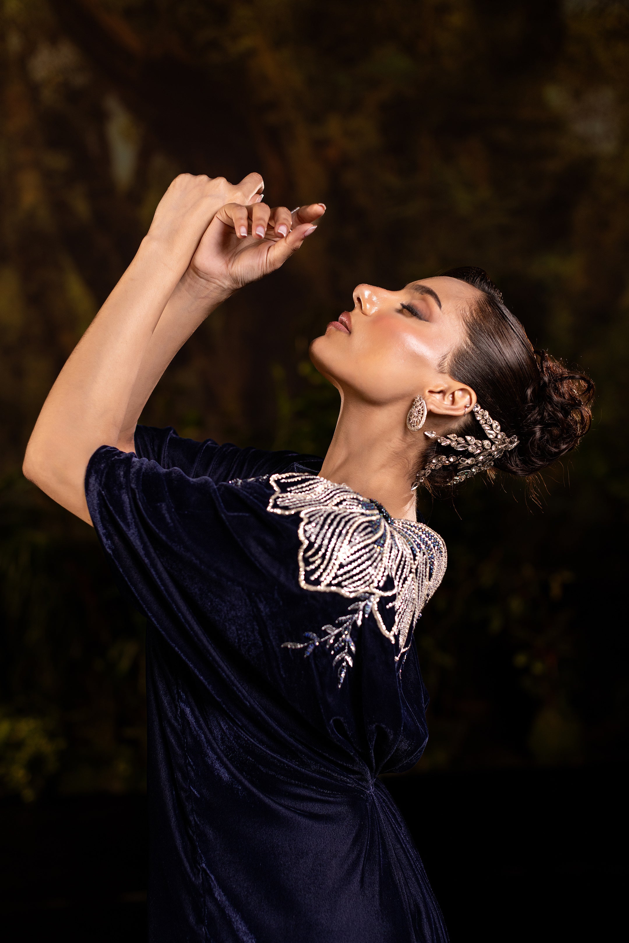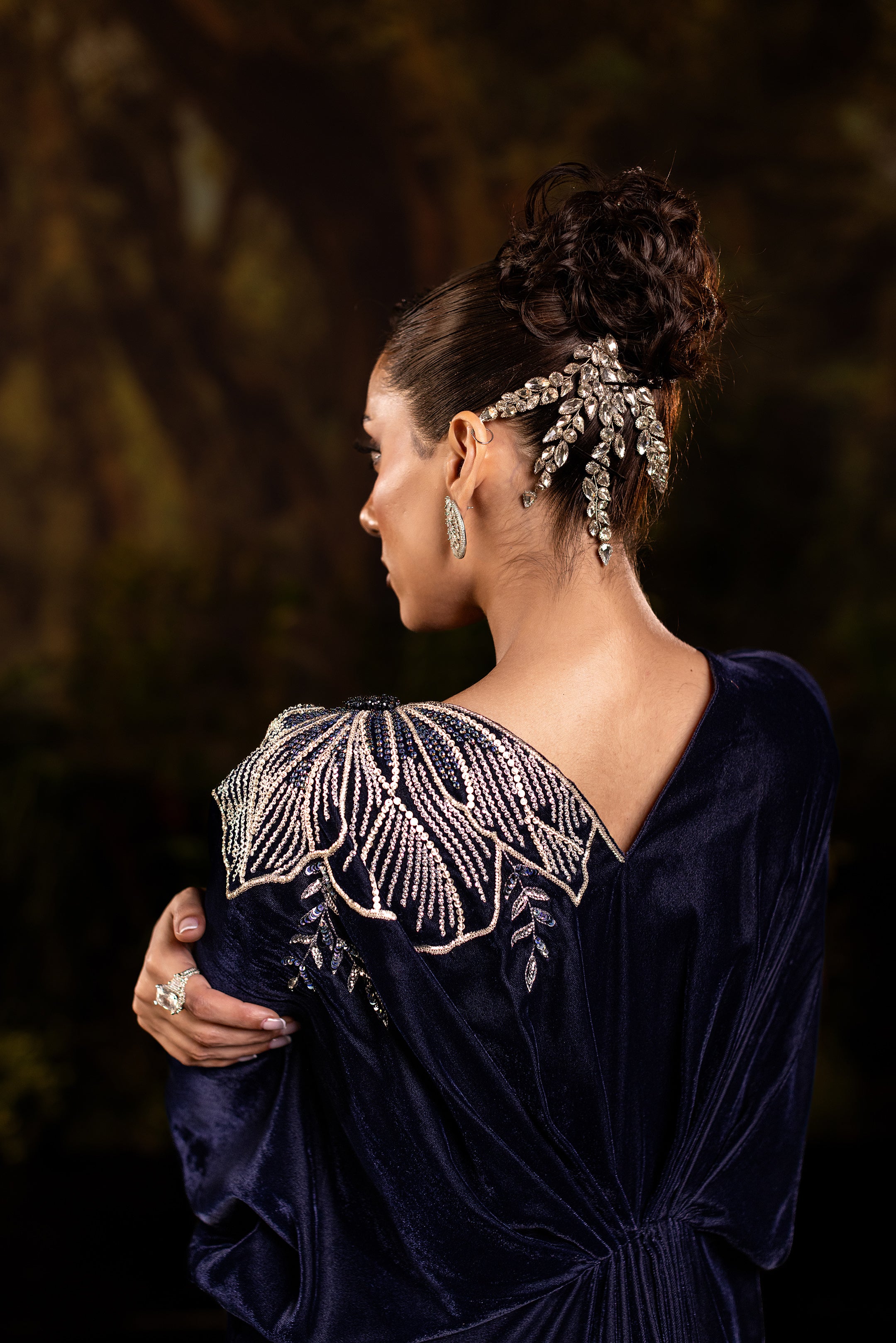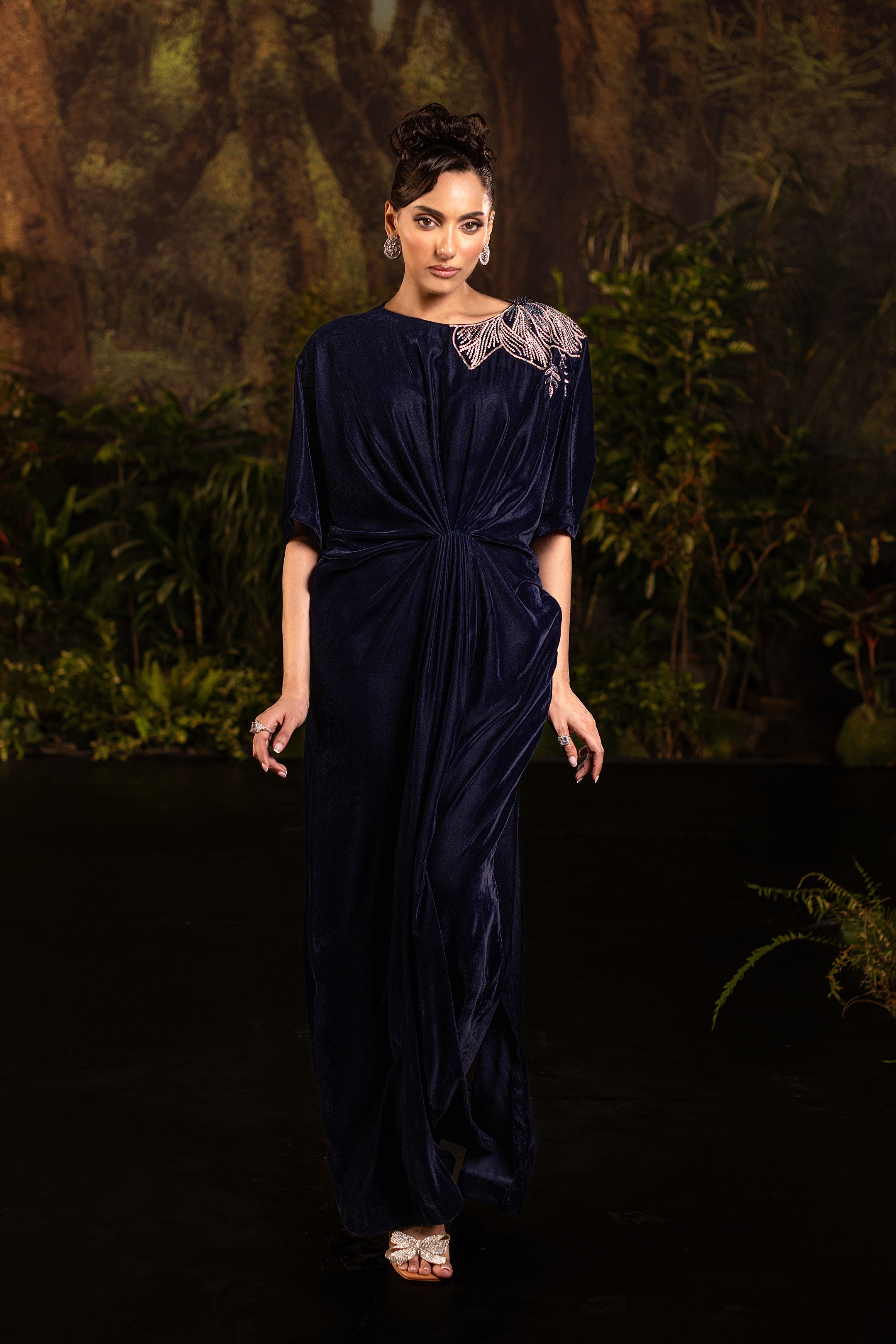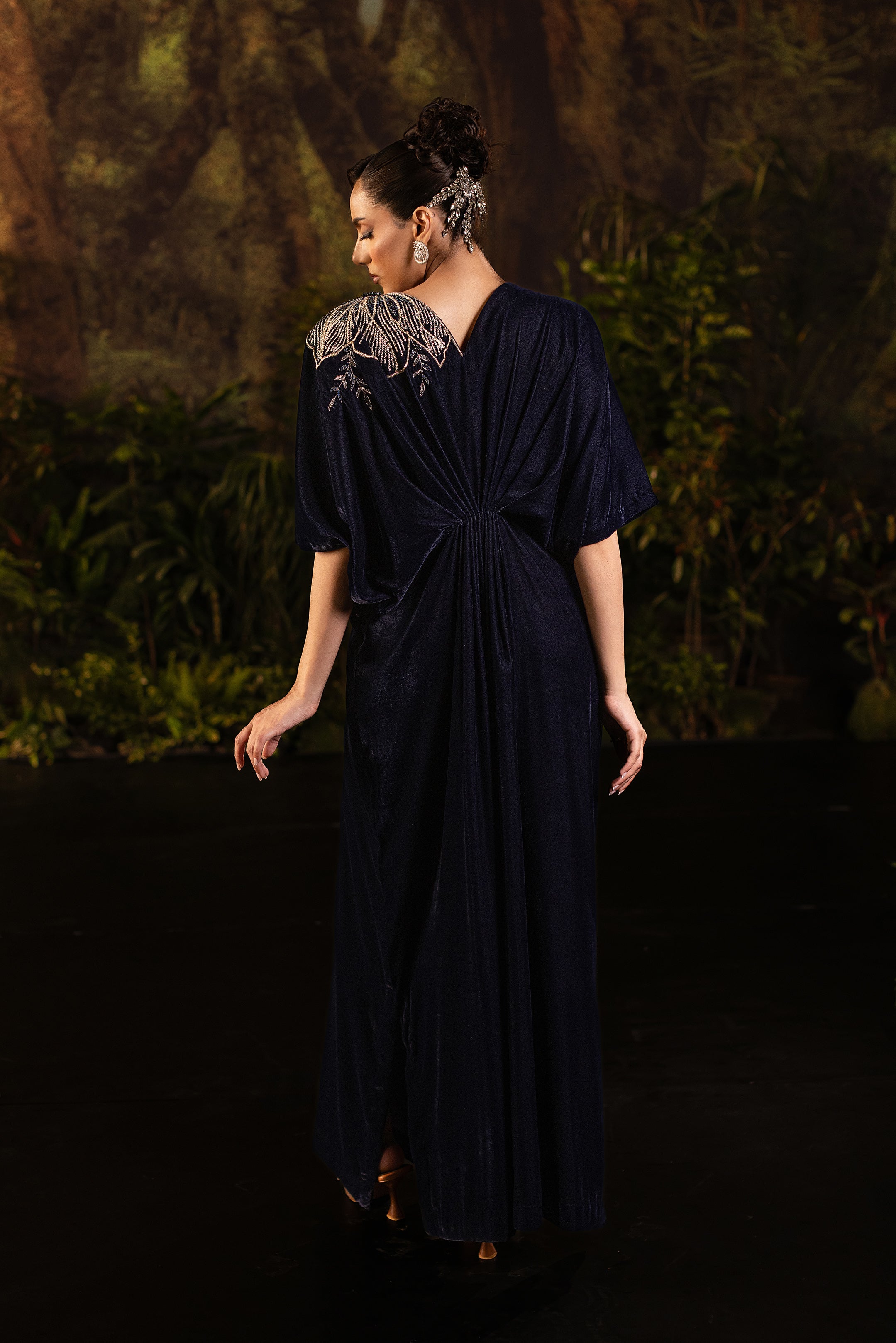 Drape yourself in timeless elegance with this navy velvet kaftan, designed to make a statement with its graceful flow and luxurious texture. The silhouette features a gathered drape at the waist, creating a flattering, elongated fall. A striking hand-embroidered motif of cascading silver beads and sequins adorned the shoulder, giving the outfit a contemporary yet regal edge. Minimal yet impactful, this kaftan is perfect for evening soirées, winter festivities, or as a modern alternative for formal occasions.