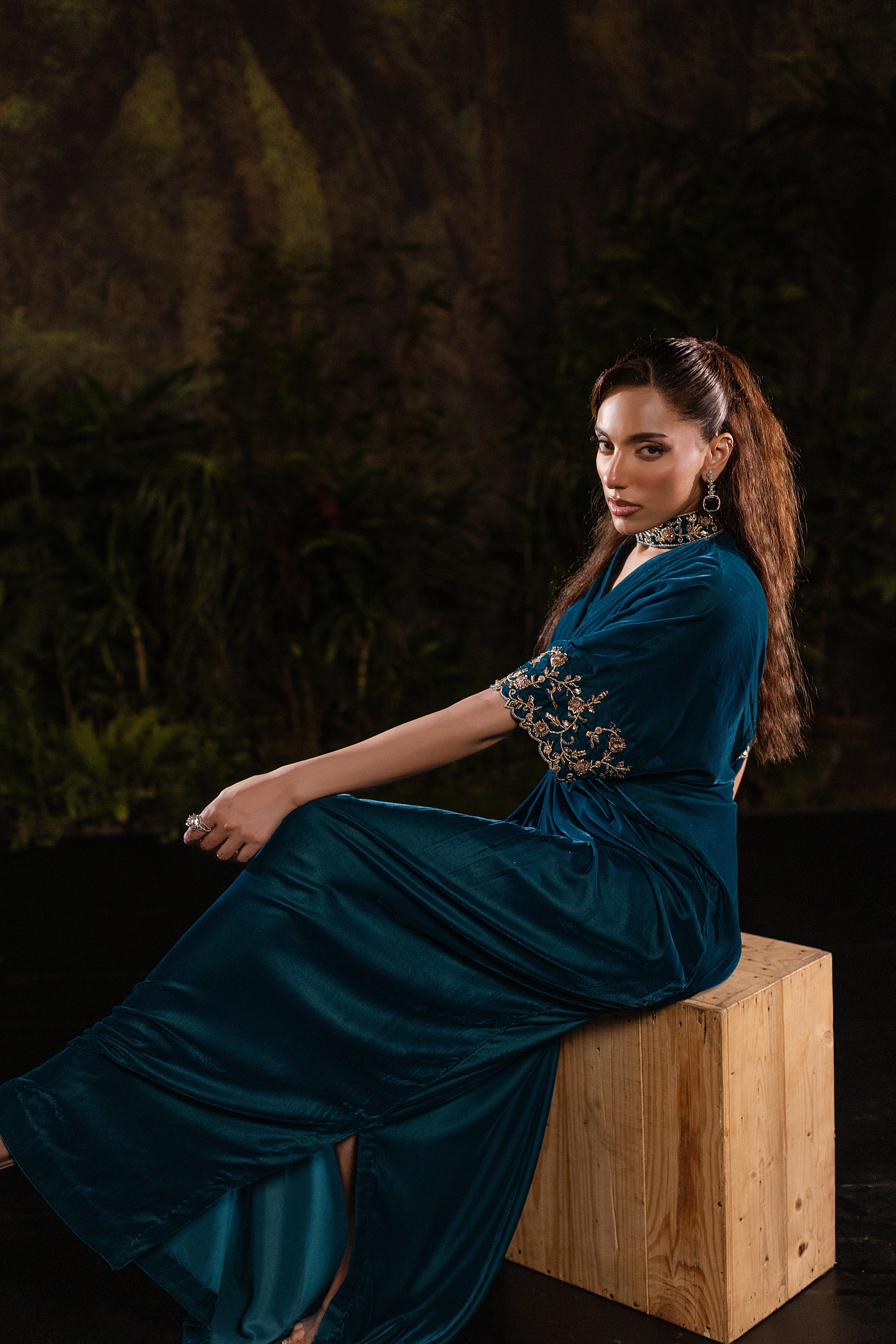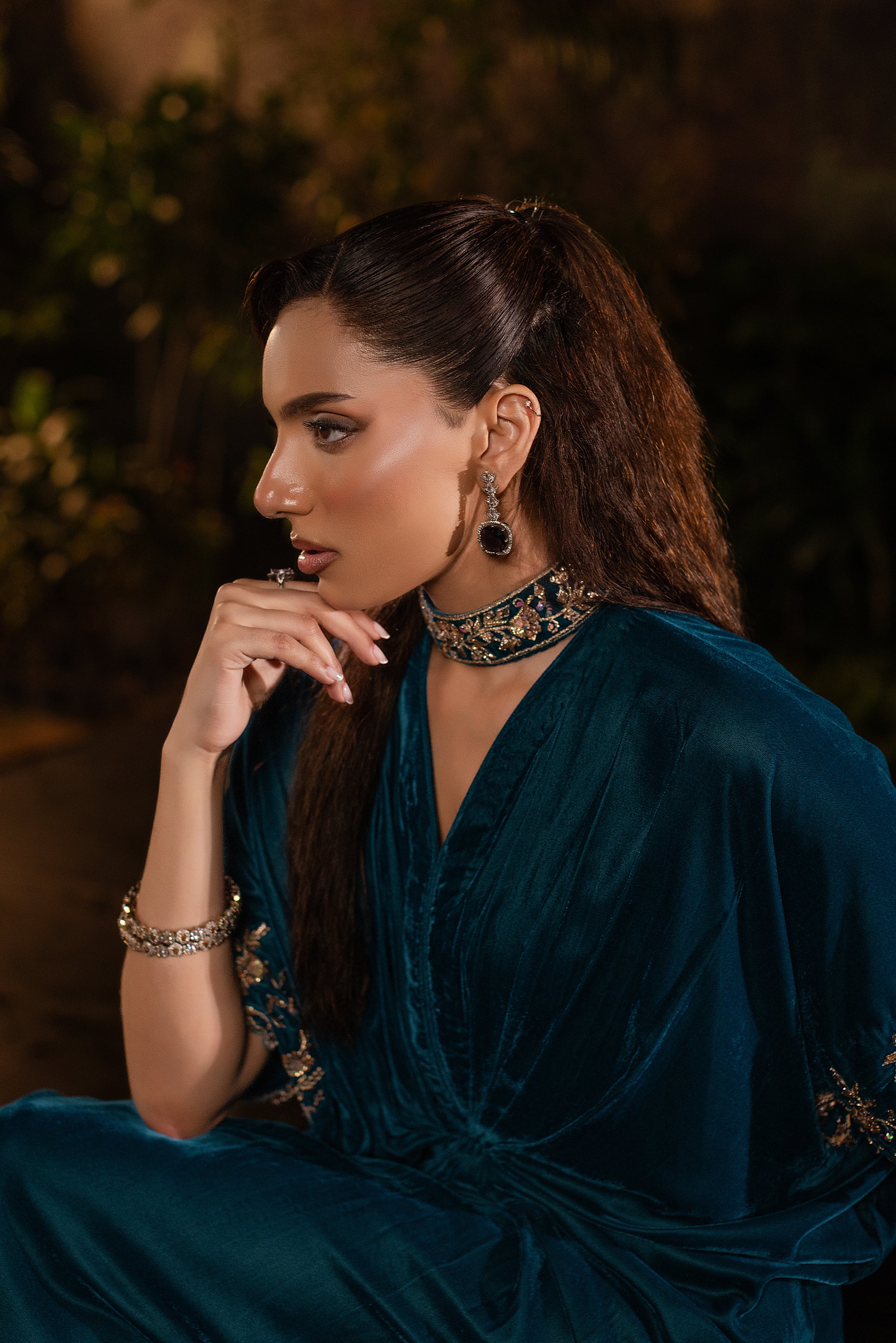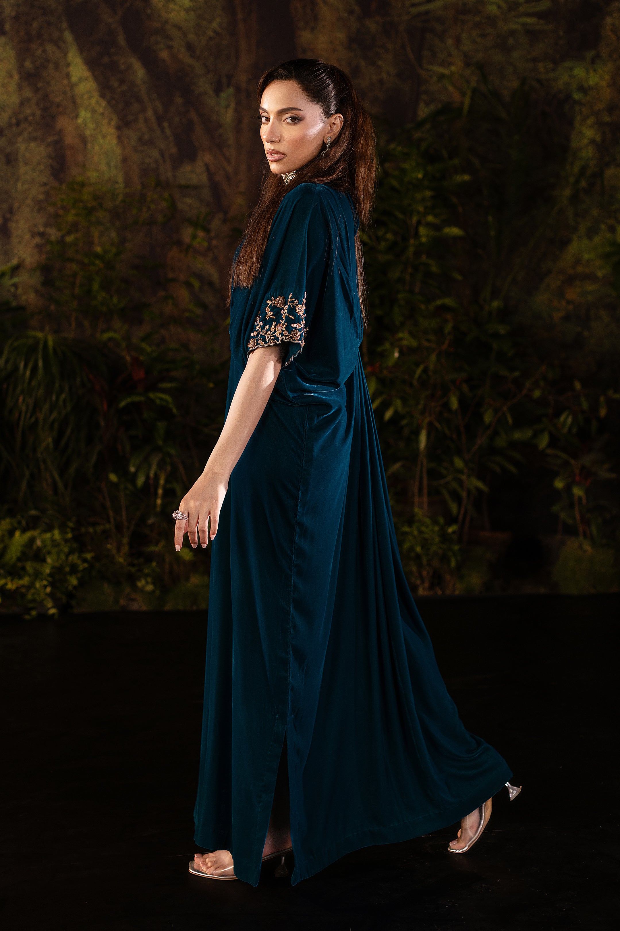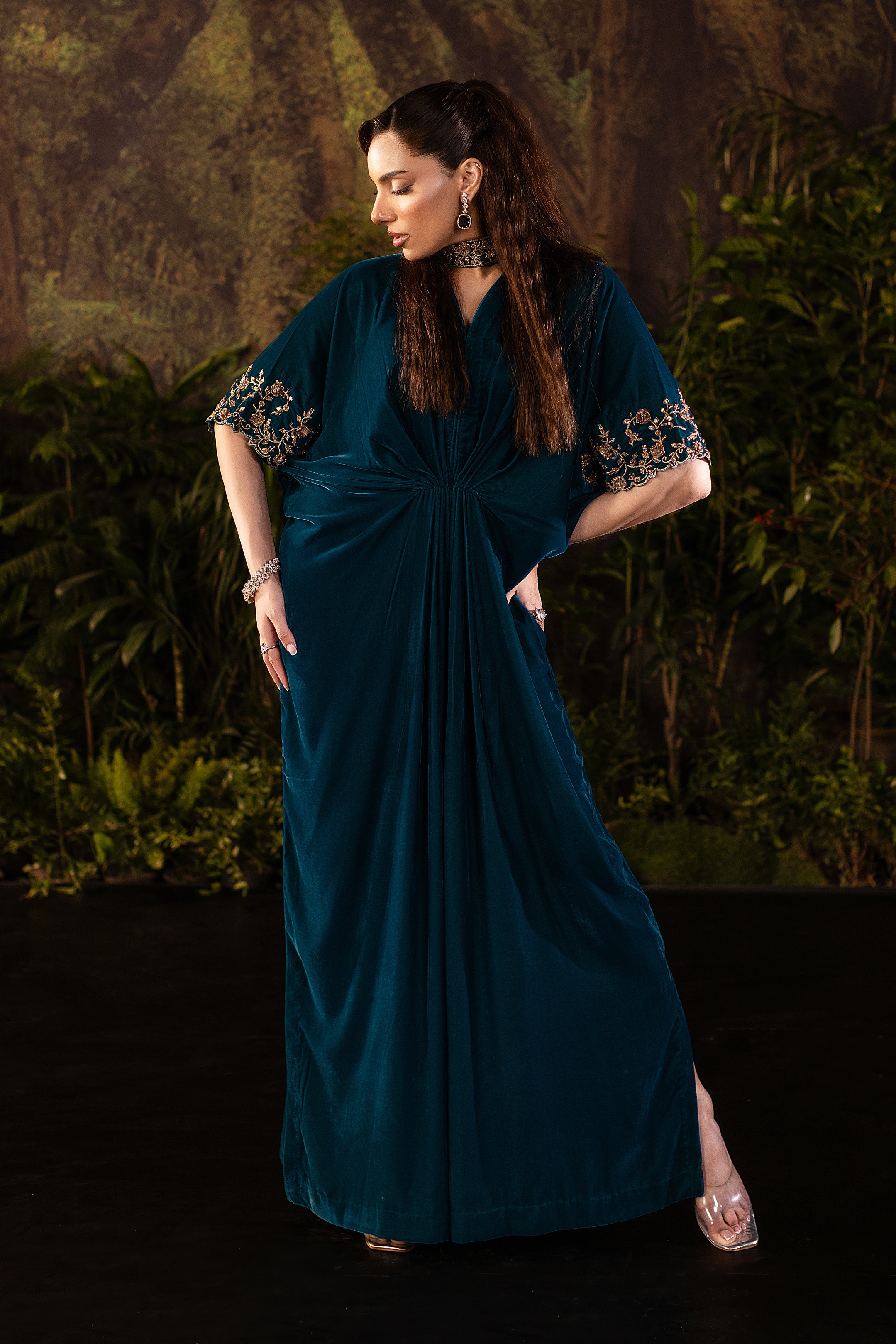 A cascade of velvet in deep sea-green, this kaftan is a vision of quiet opulence. The fabric drapes fluidly from the gathered waistline, creating movement that feels both regal and effortless. Embroidery flourishes on the neck choker and sleeves shimmer like delicate constellations, lending a touch of luminous artistry to the silhouette. With its flowing form and intricate detailing, the piece is designed for evenings when elegance must speak in whispers yet leave a lasting impression.