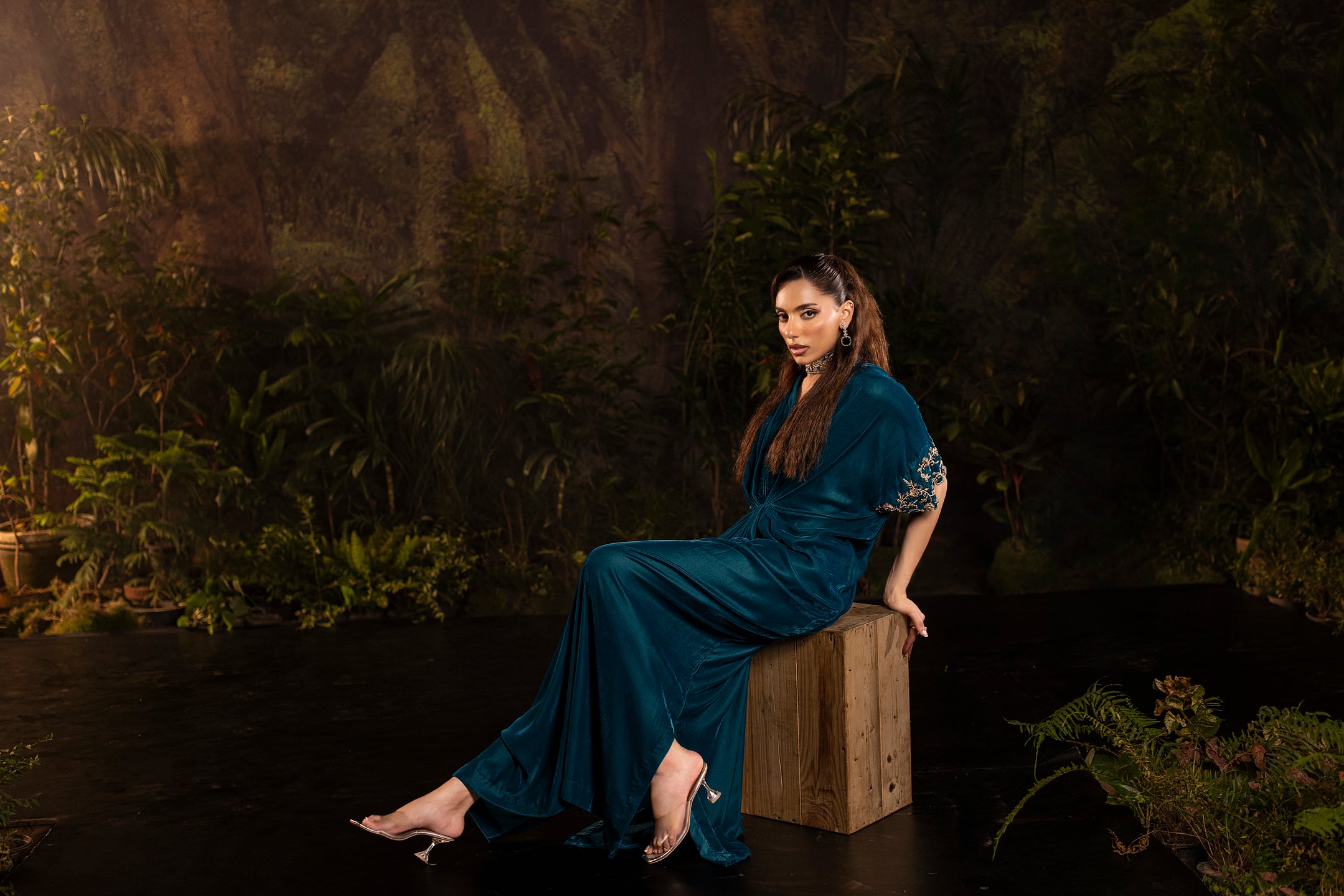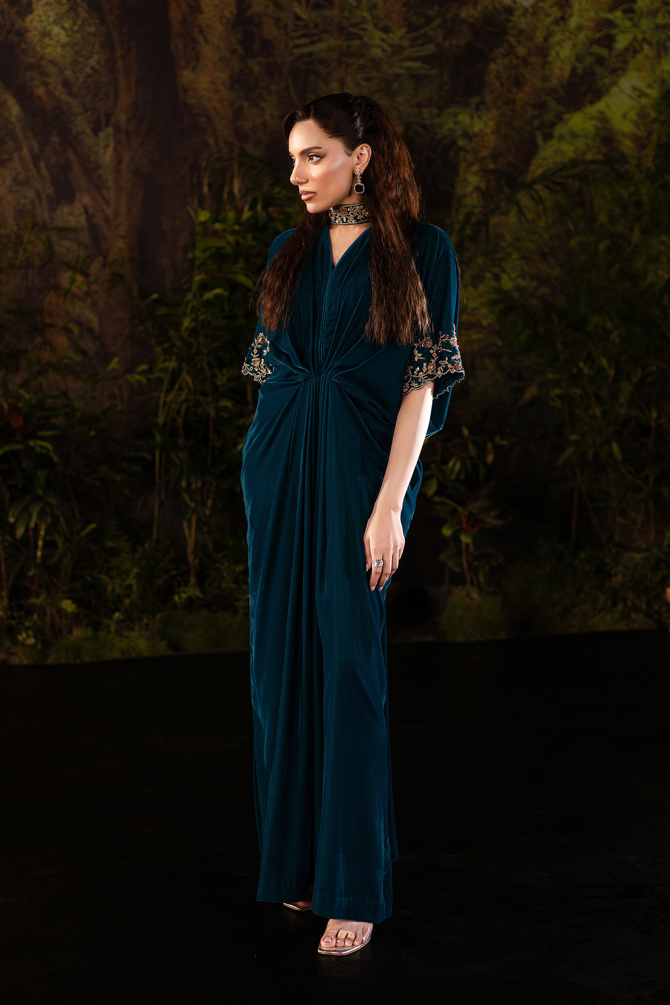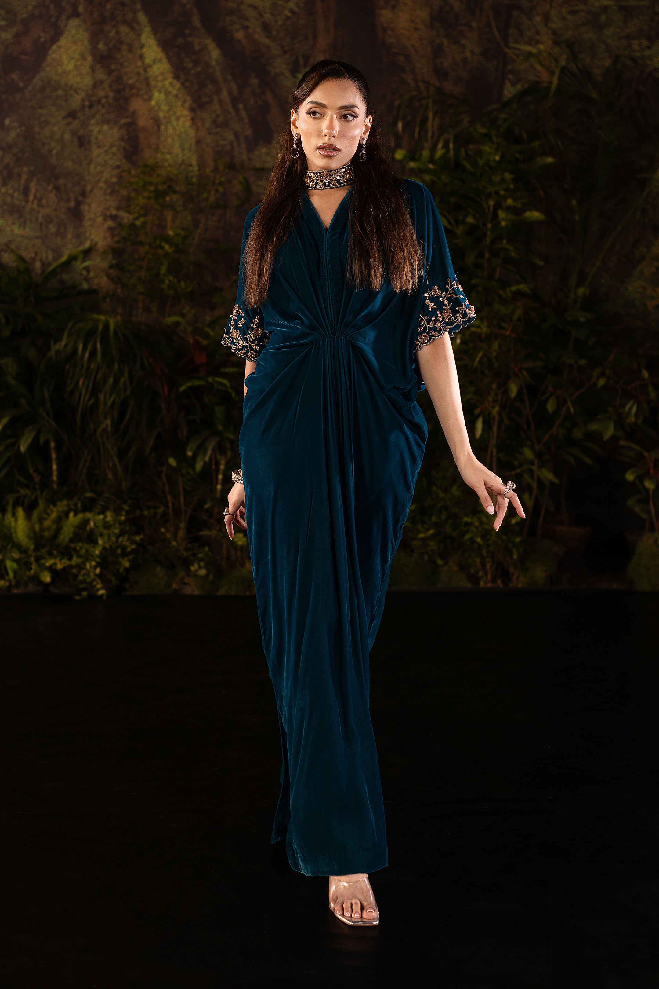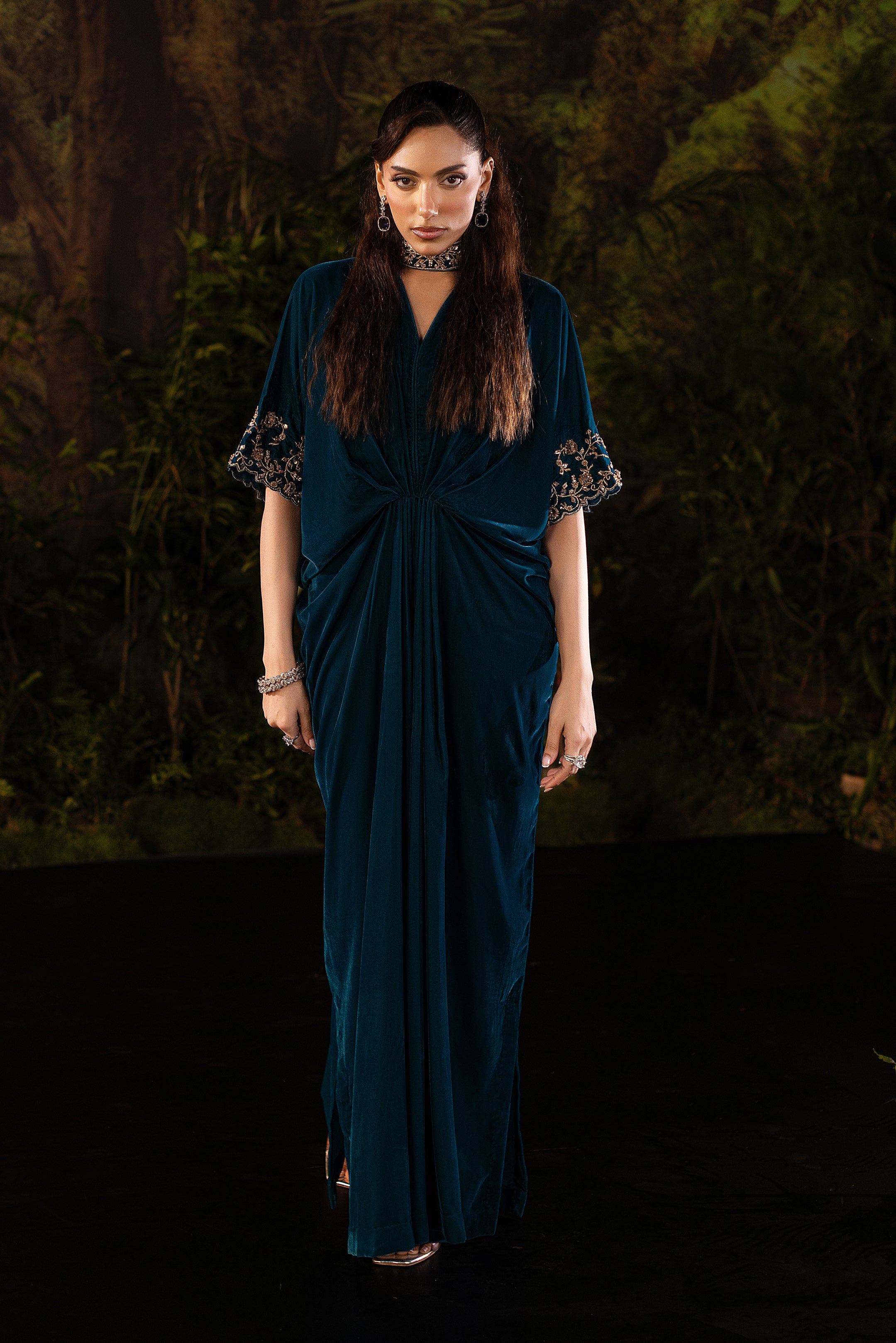 A cascade of velvet in deep sea-green, this kaftan is a vision of quiet opulence. The fabric drapes fluidly from the gathered waistline, creating movement that feels both regal and effortless. Embroidery flourishes on the neck choker and sleeves shimmer like delicate constellations, lending a touch of luminous artistry to the silhouette. With its flowing form and intricate detailing, the piece is designed for evenings when elegance must speak in whispers yet leave a lasting impression.